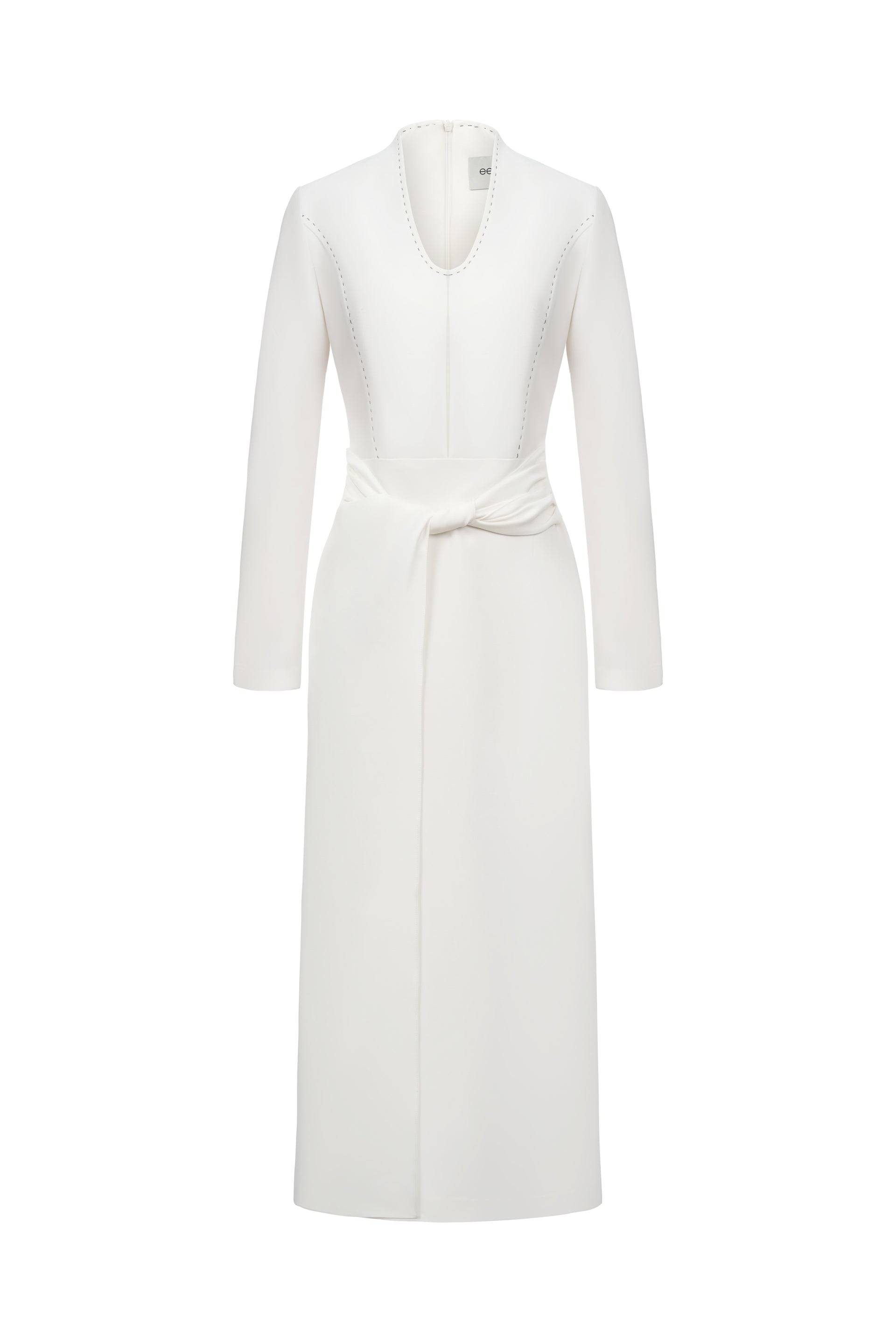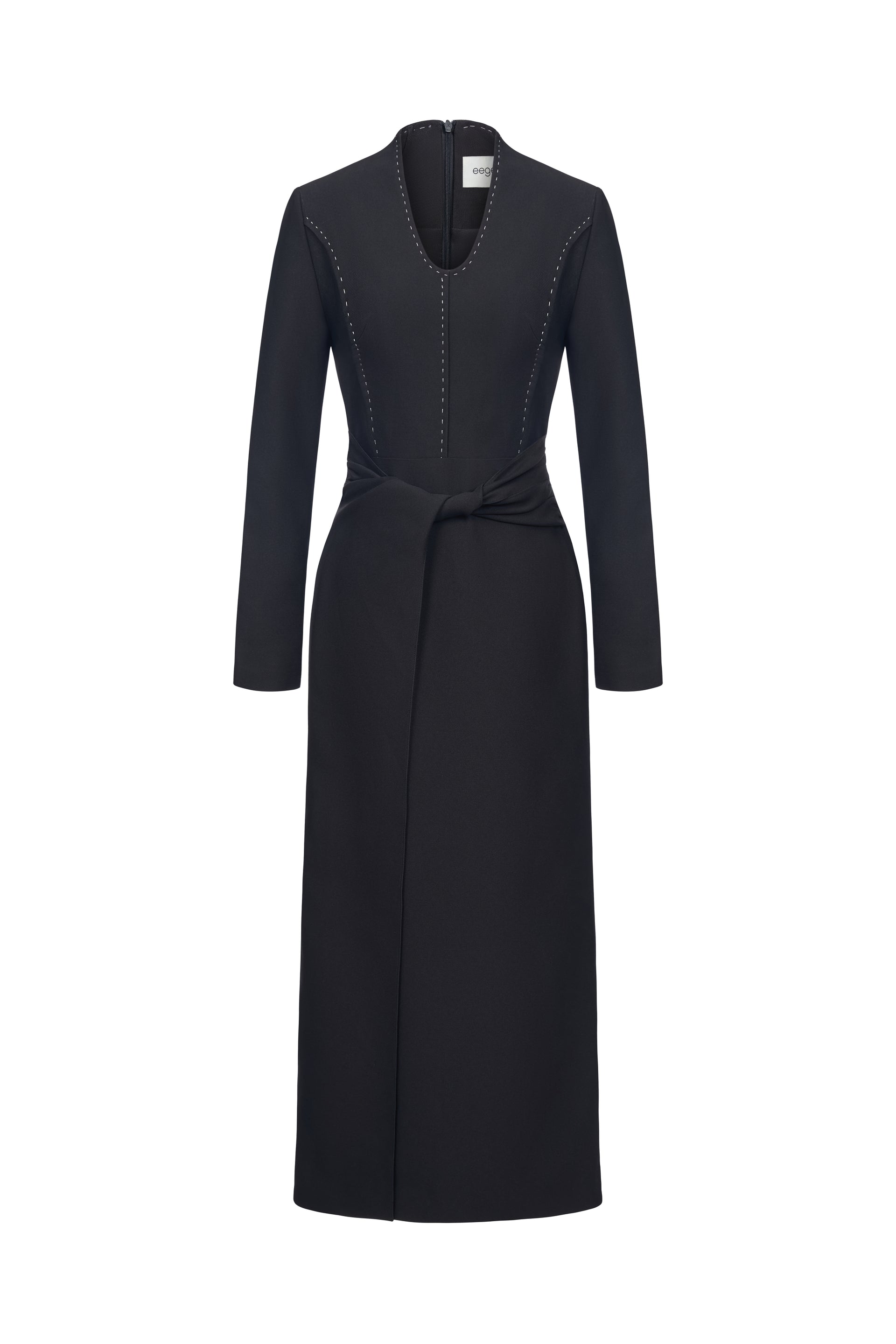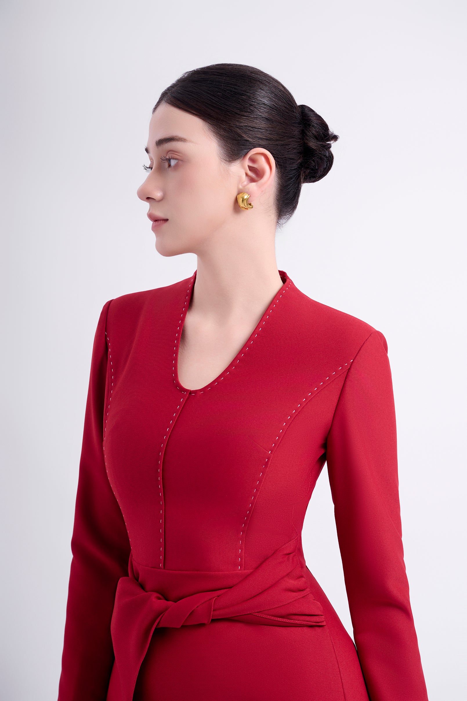 Long sleeve V-neck dress features a two-layer design with a back zip closure and a back slit. The bodice is decorated with contrasting stitching, while the lower half showcases a playful draped hem and twisted details that help to flatter the waistline.