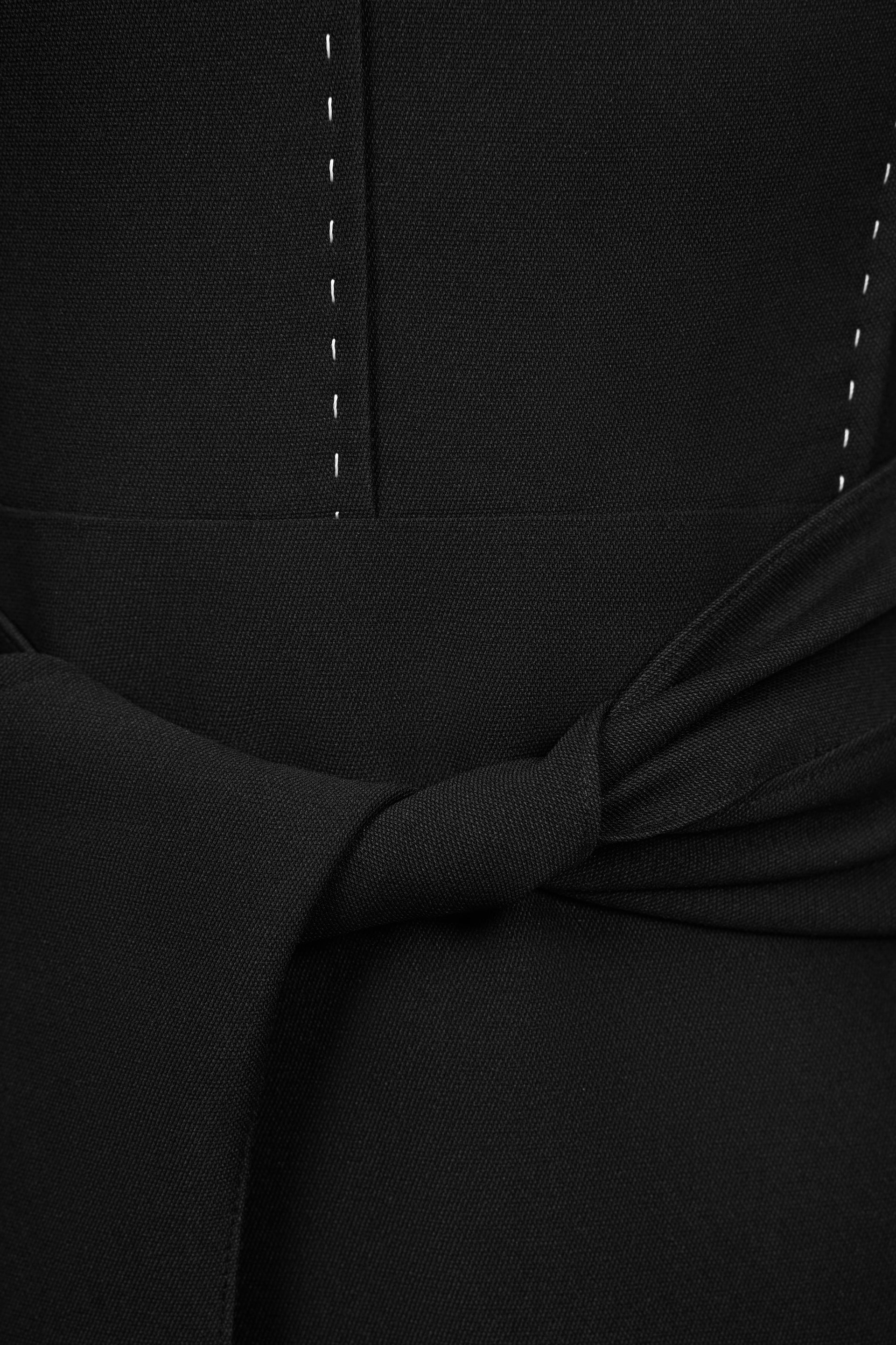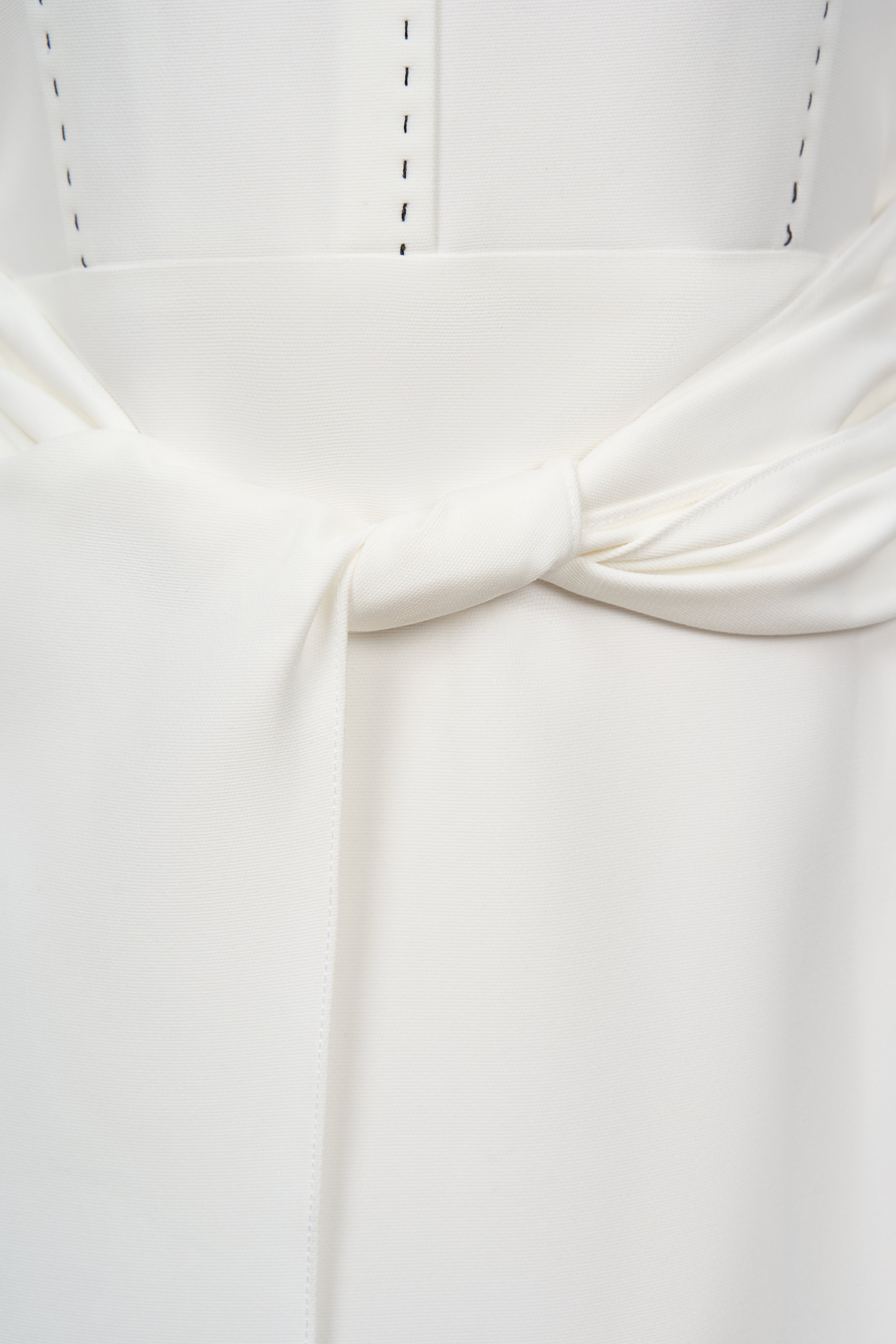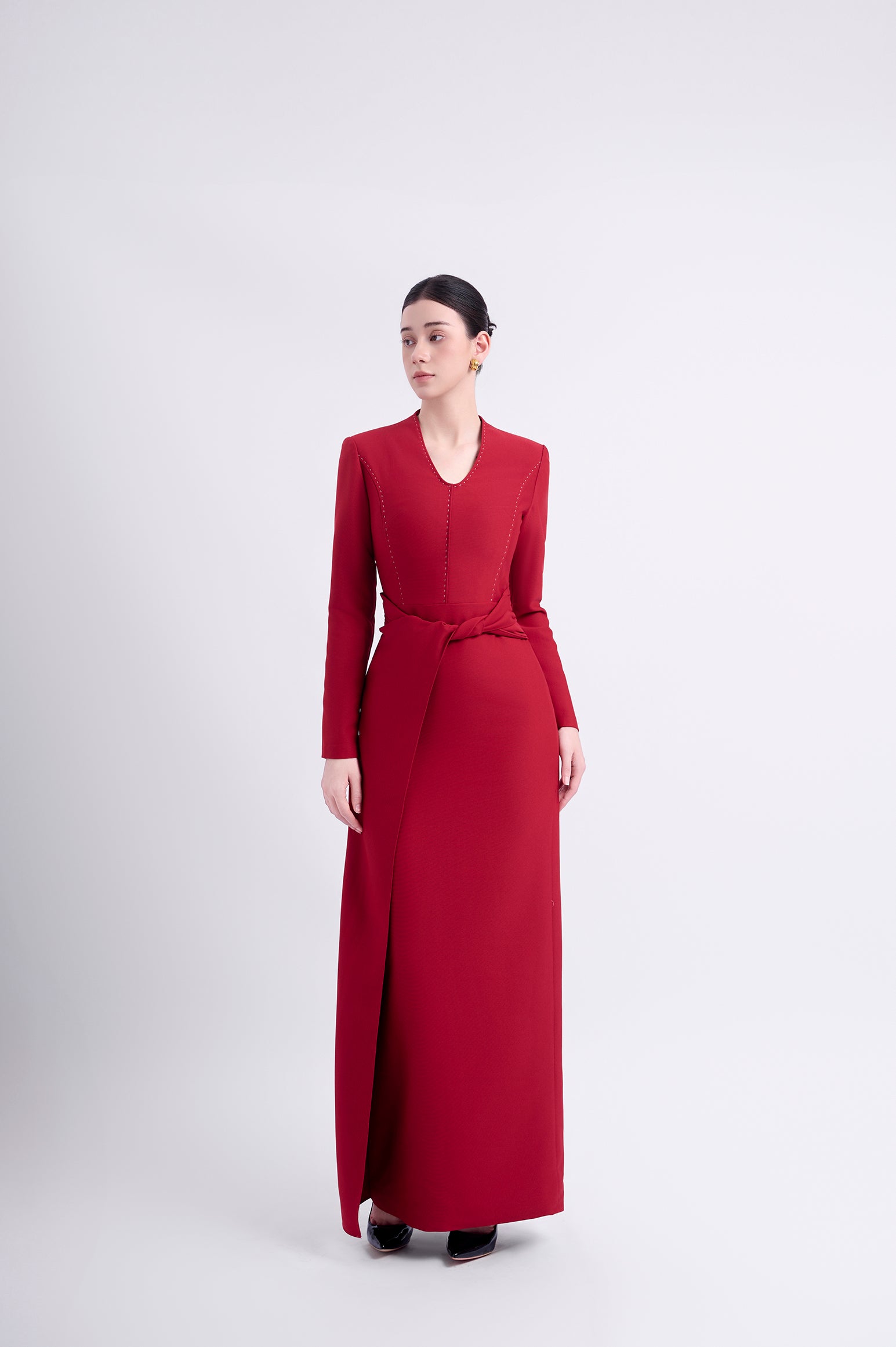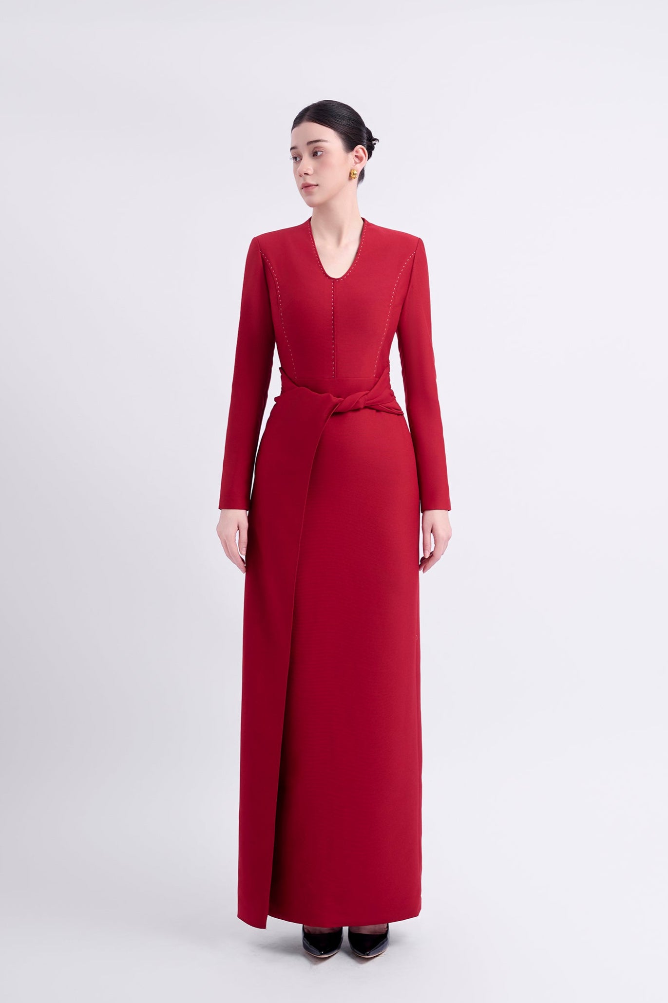 Long sleeve V-neck dress features a two-layer design with a back zip closure and a back slit. The bodice is decorated with contrasting stitching, while the lower half showcases a playful draped hem and twisted details that help to flatter the waistline.