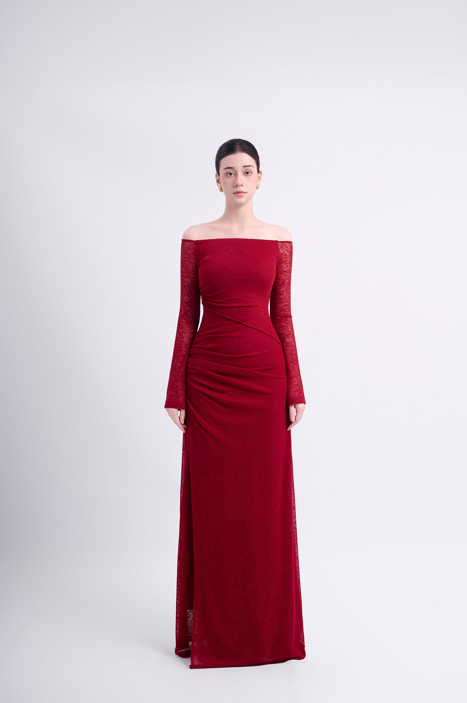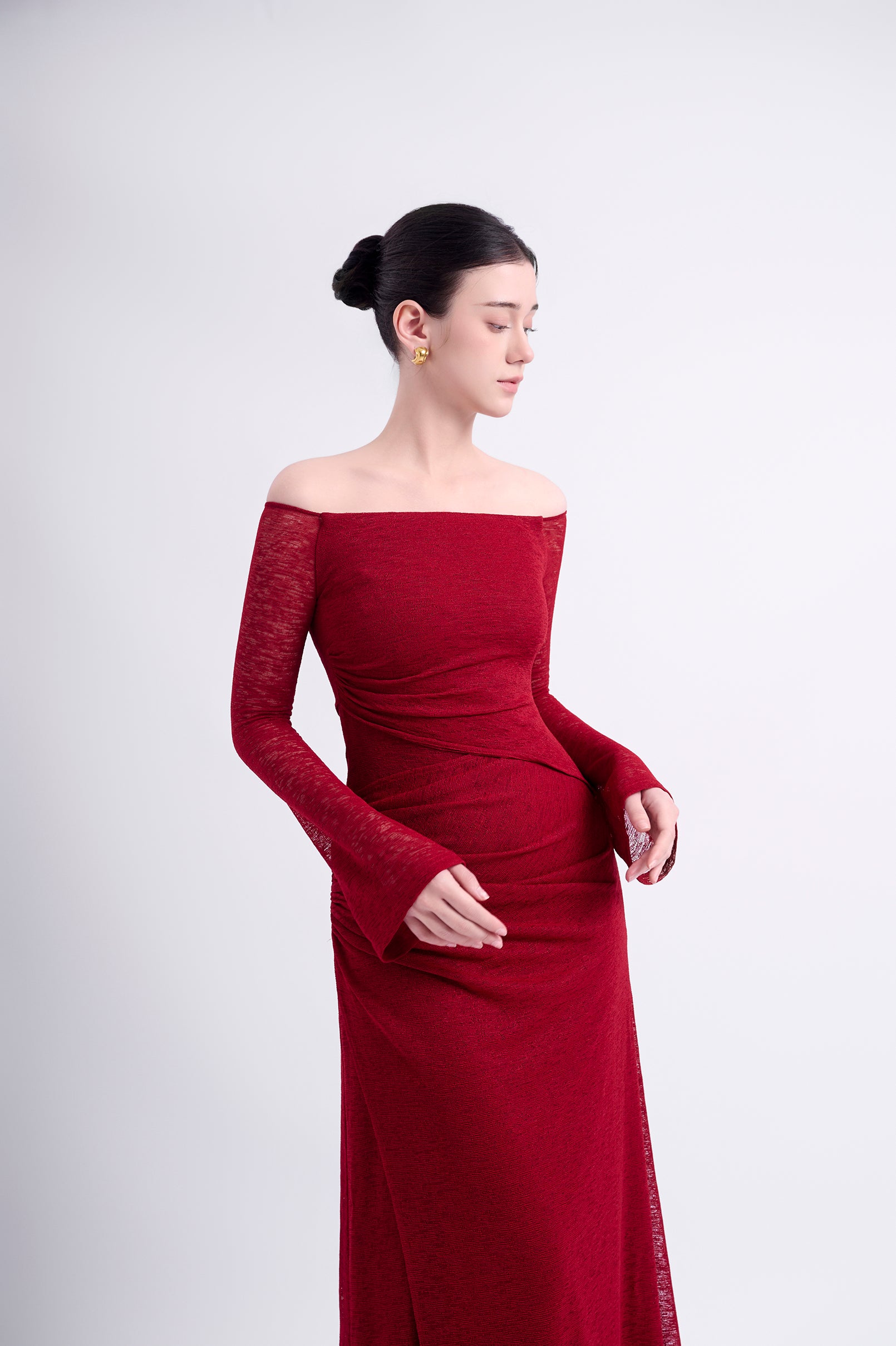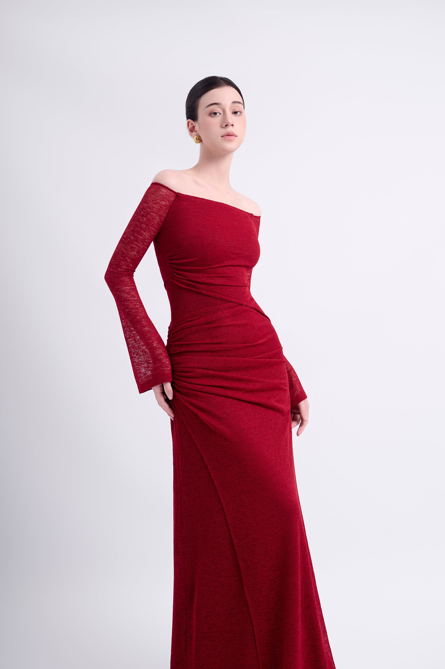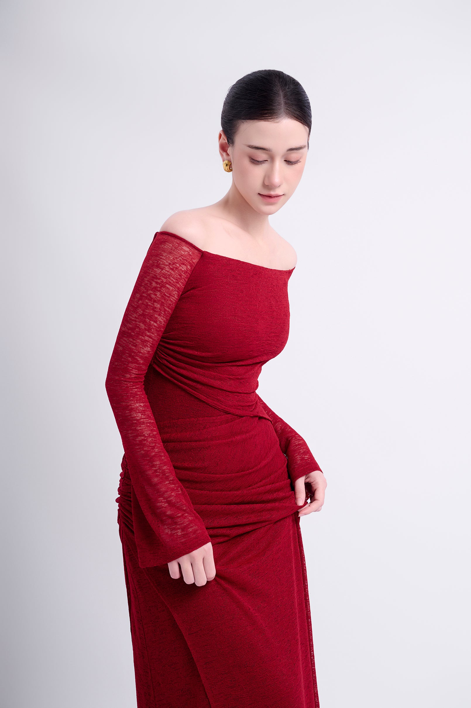 Off-shoulder long-sleeve dress with a straight silhouette. Double-layered, with an outer asymmetric overlapping panel and a high-low hemline for a youthful aesthetic. The shoulder drape can be styled to cover the shoulders or worn off-the-shoulder.