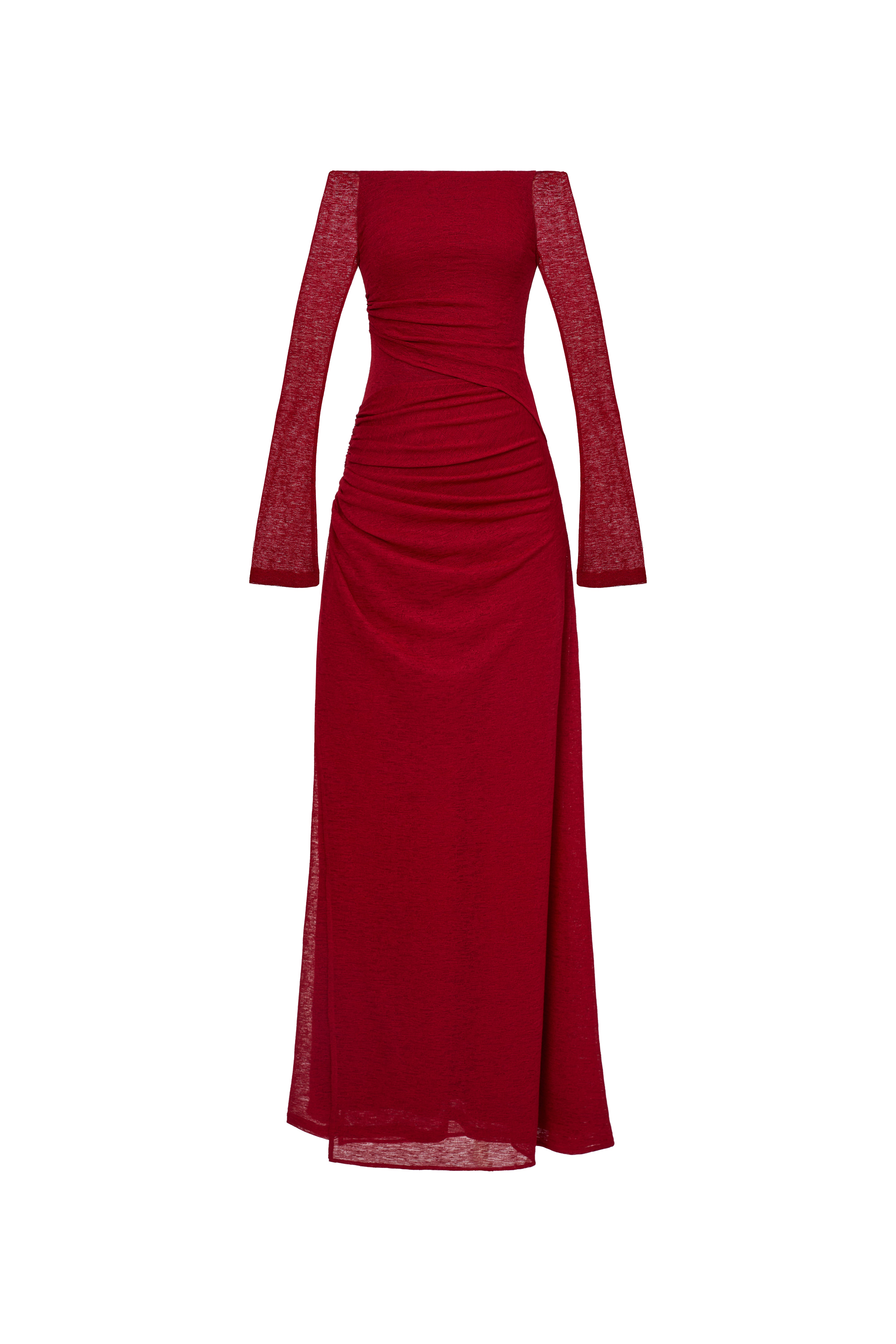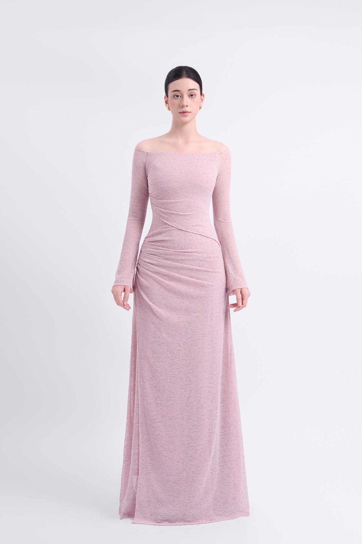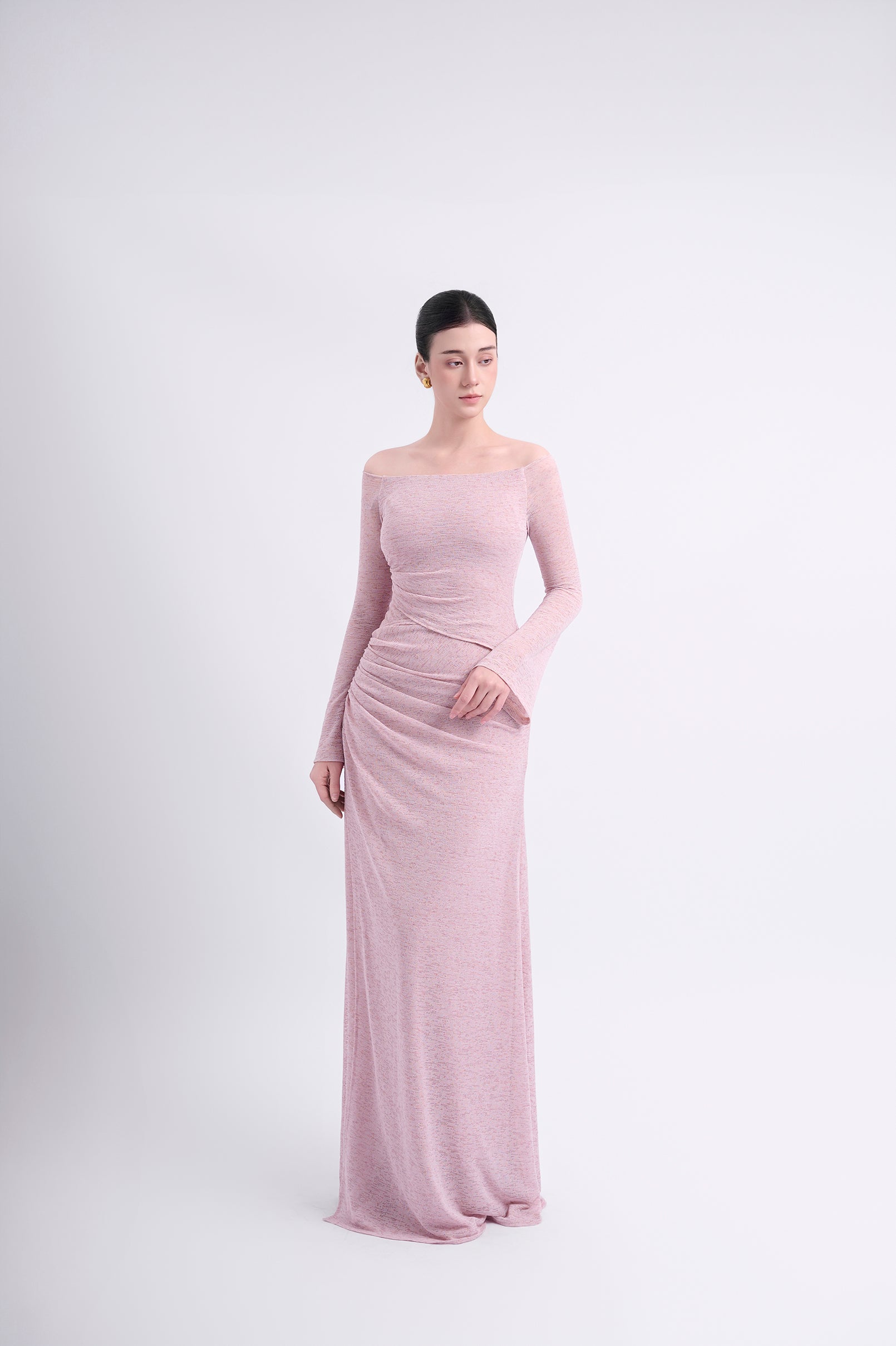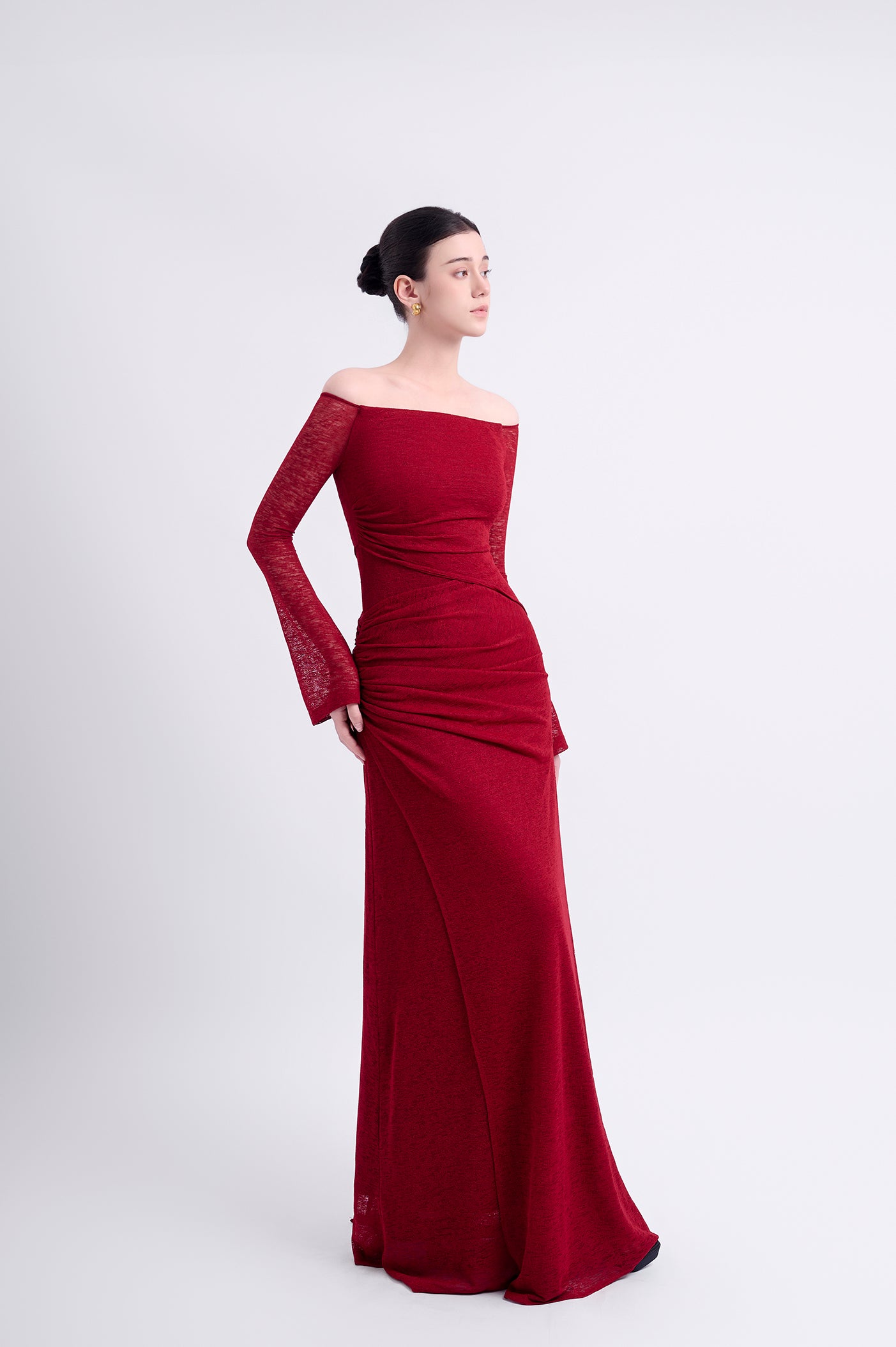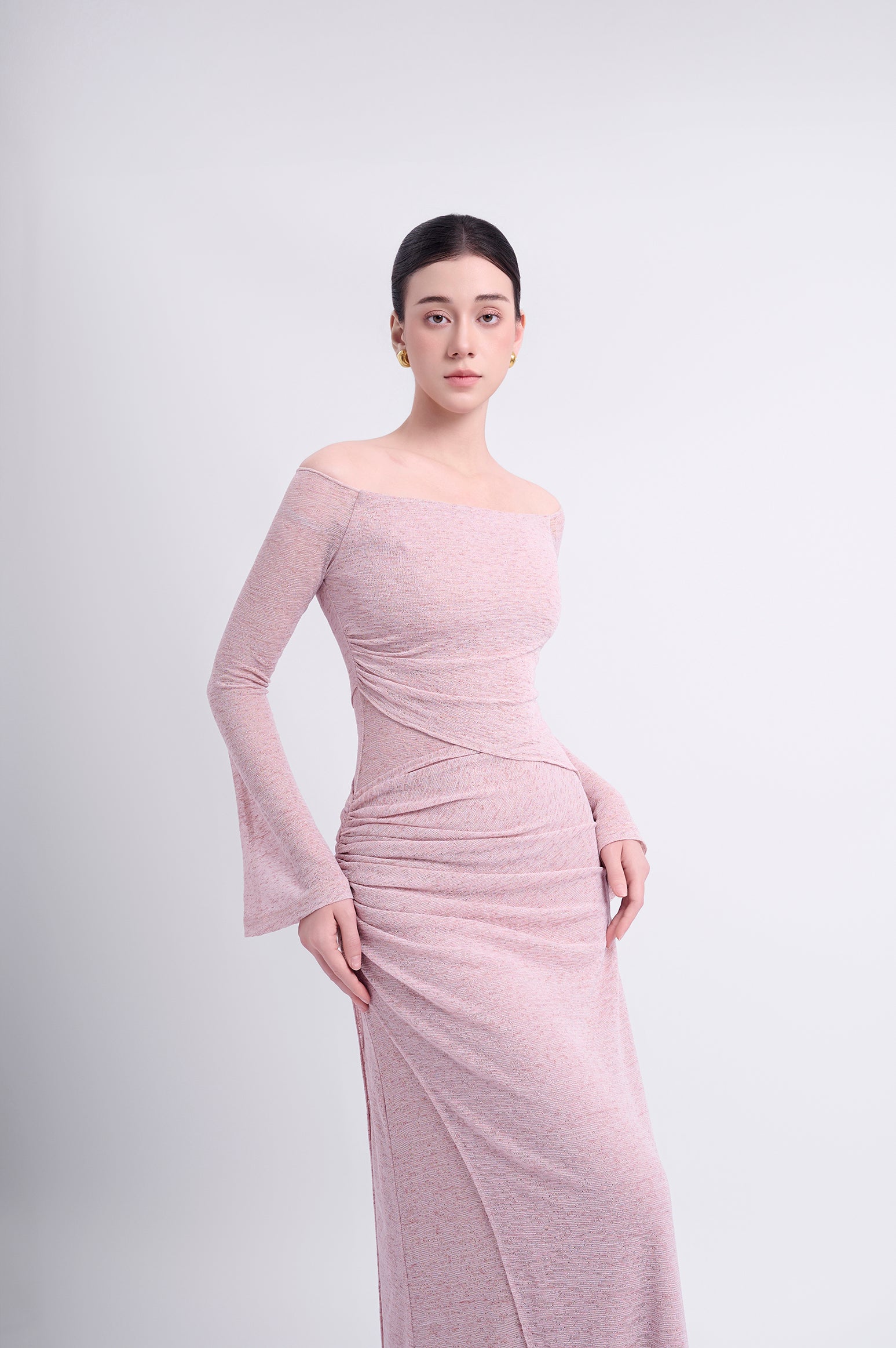 Off-shoulder long-sleeve dress with a straight silhouette. Double-layered, with an outer asymmetric overlapping panel and a high-low hemline for a youthful aesthetic. The shoulder drape can be styled to cover the shoulders or worn off-the-shoulder.