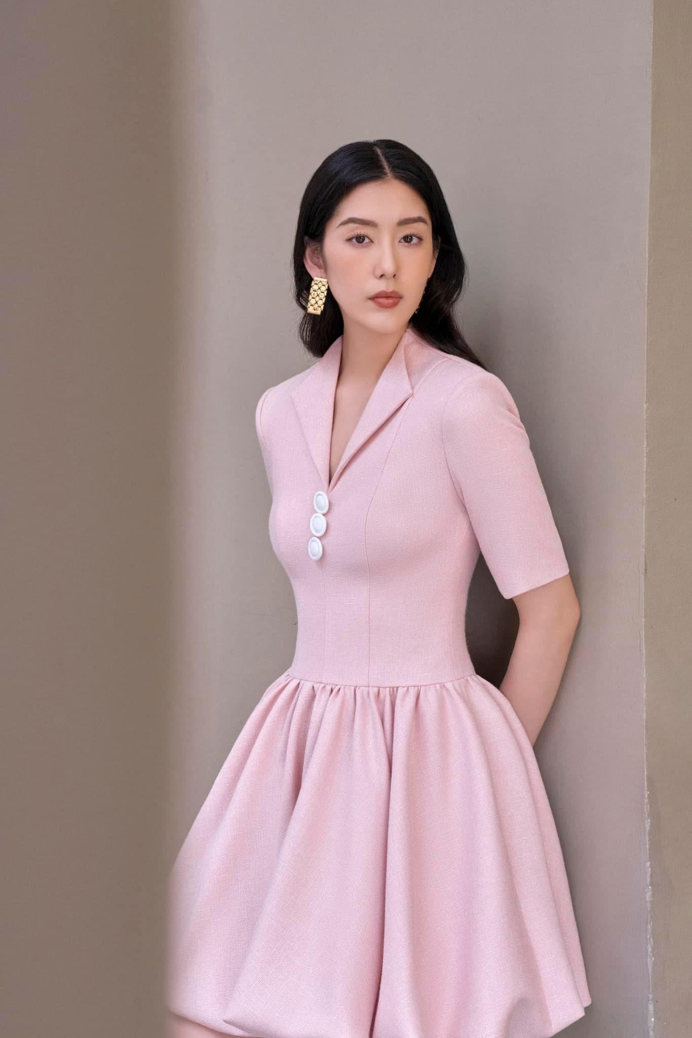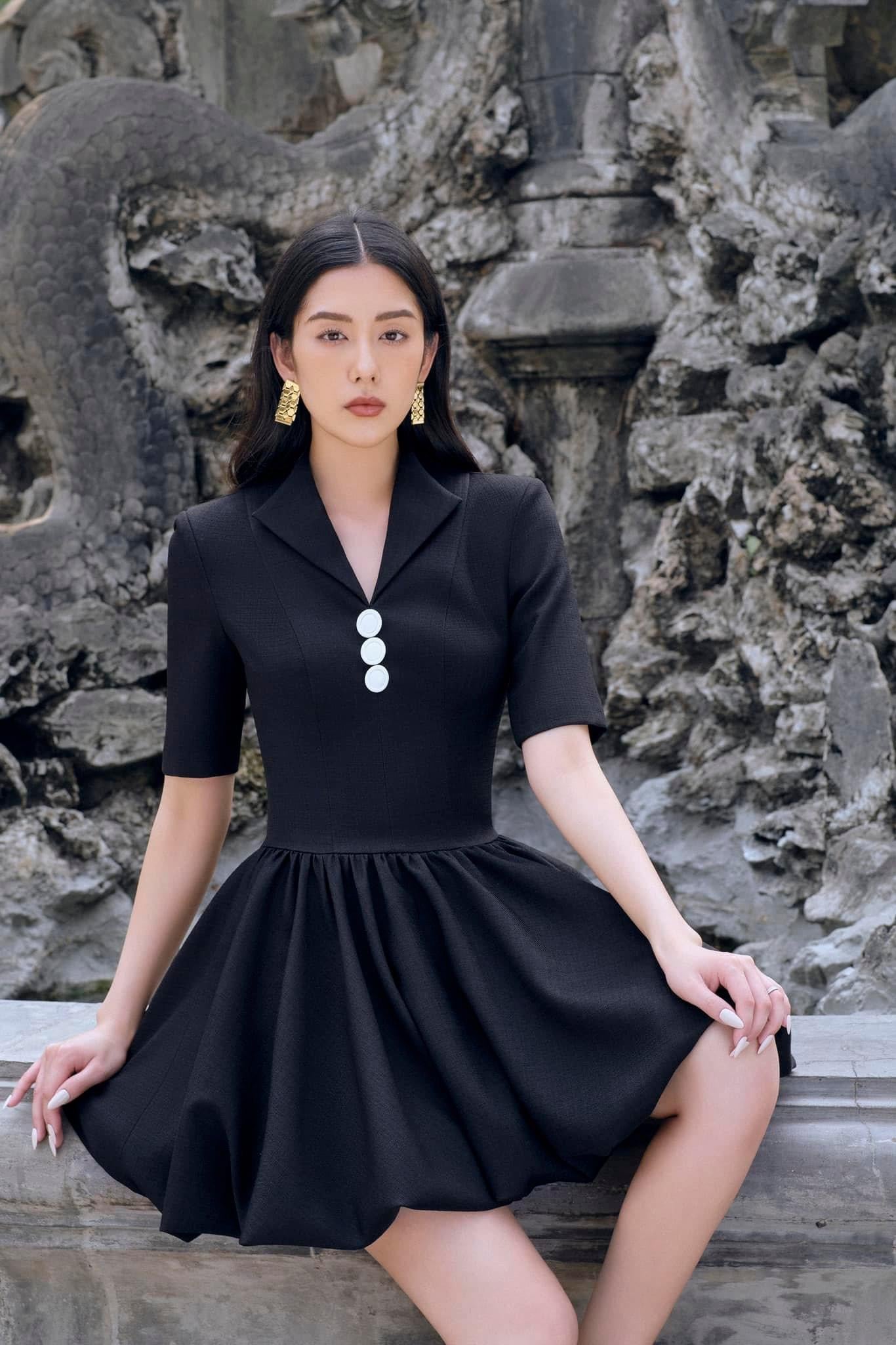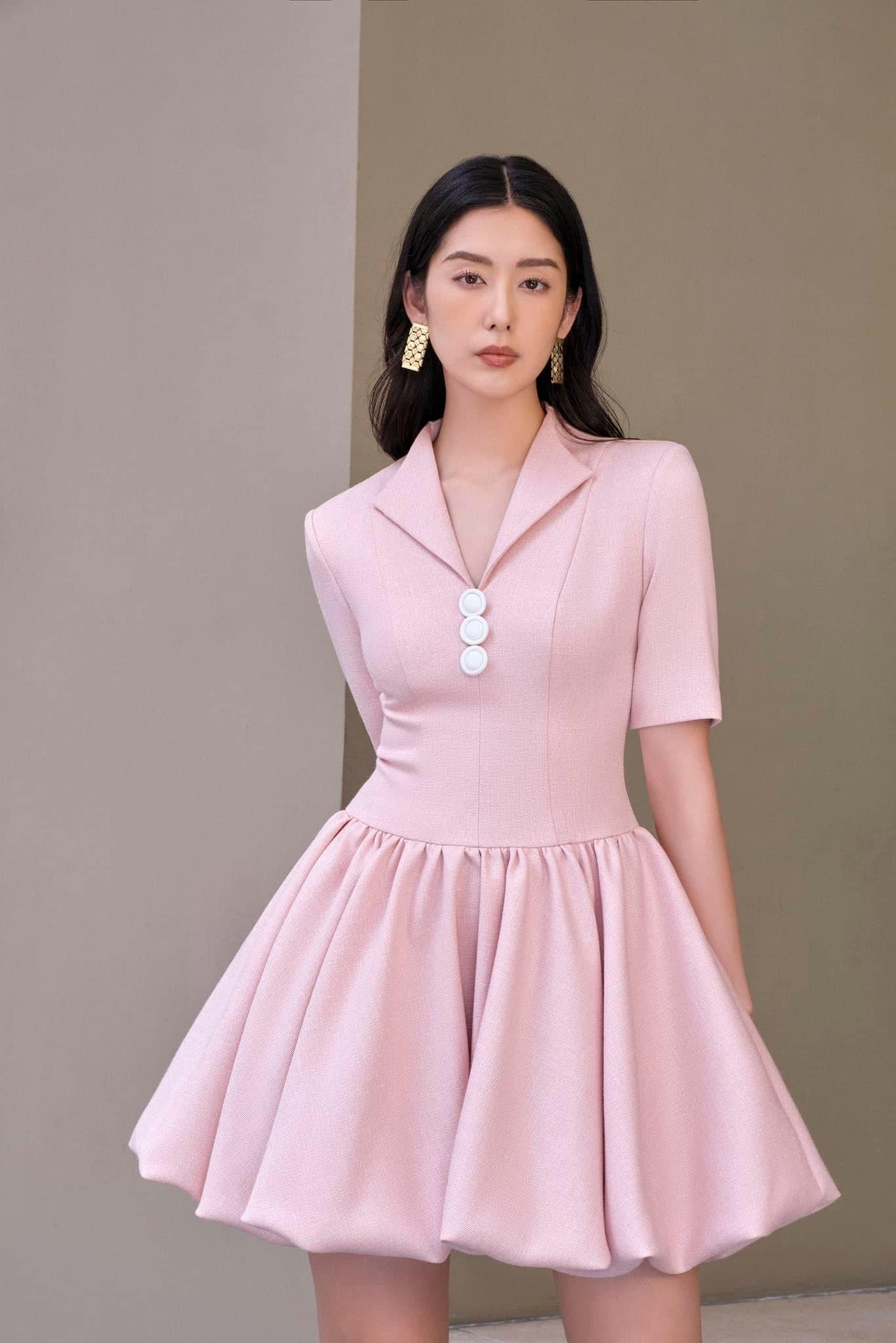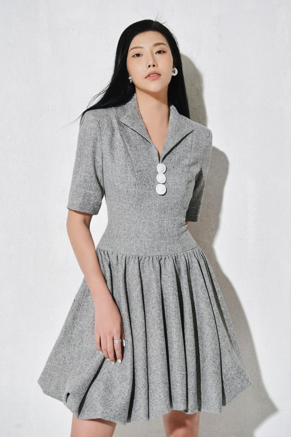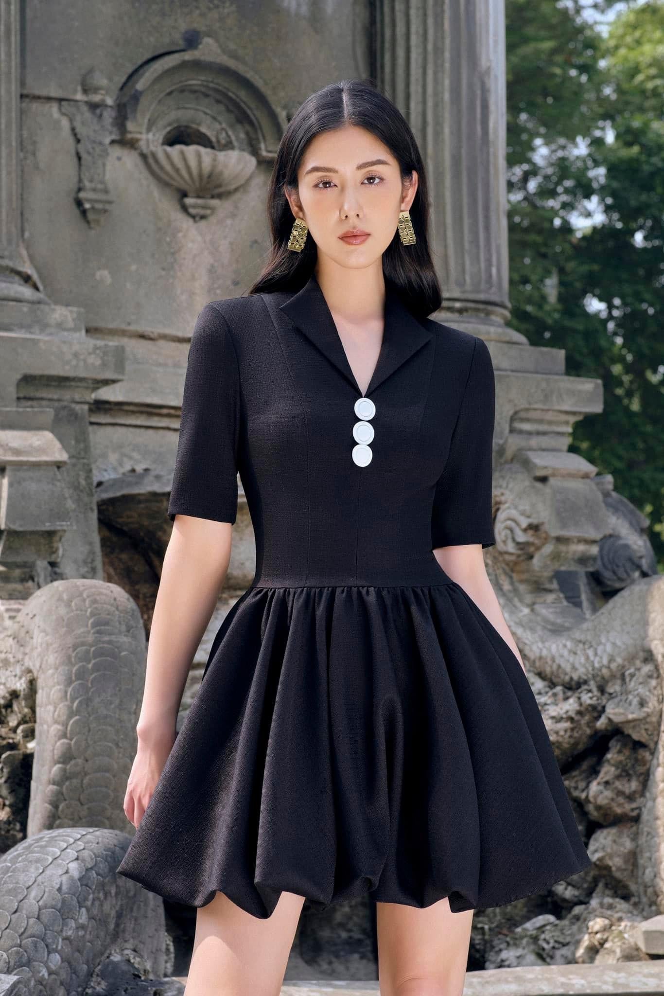Elevate your elegance in this short-hoop dress with V-neck and chic fabric buttons. Featuring sleeves, shoulder padding, lining, and a convenient back zipper for a stylish and comfortable ensemble. Β