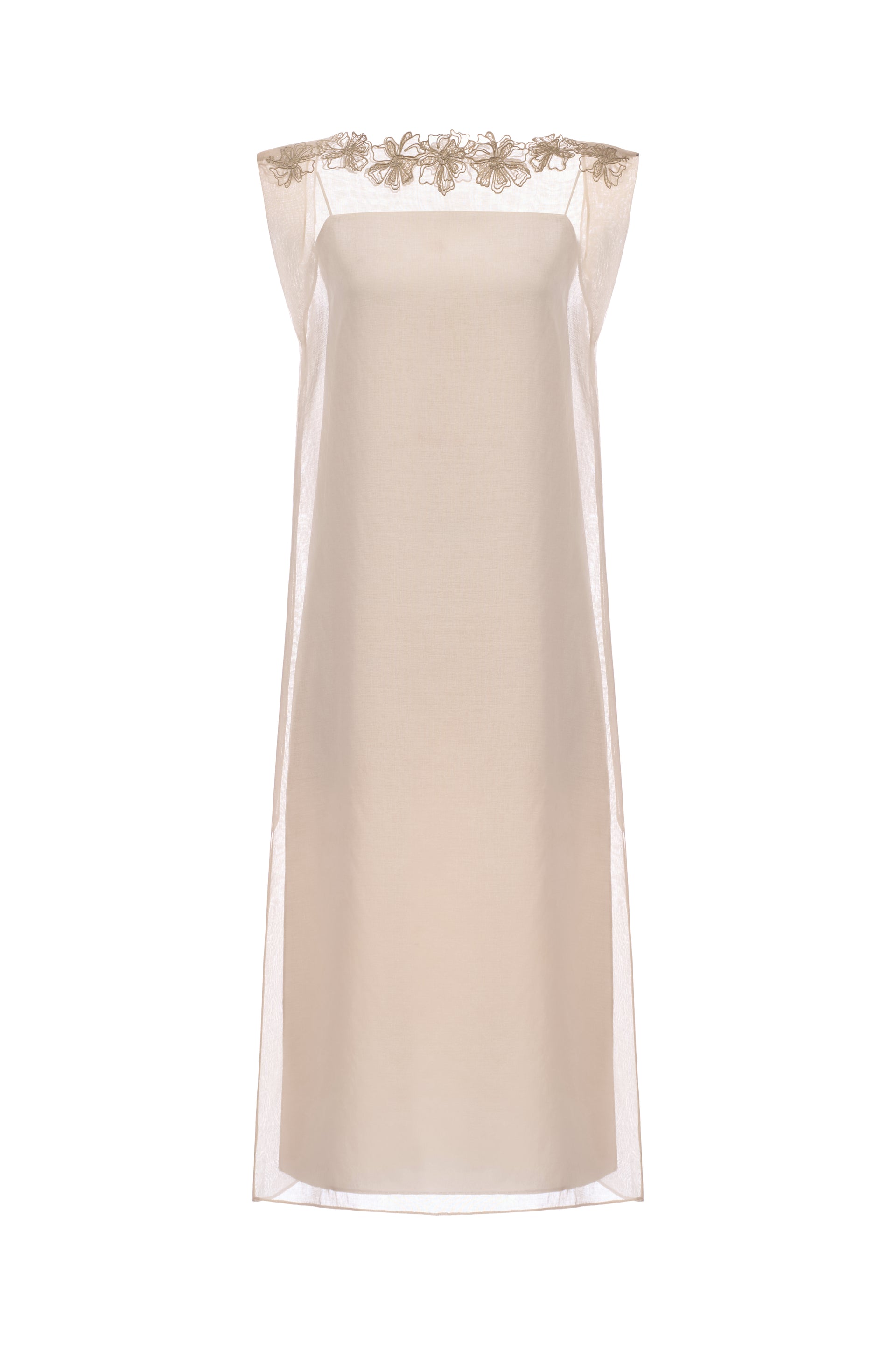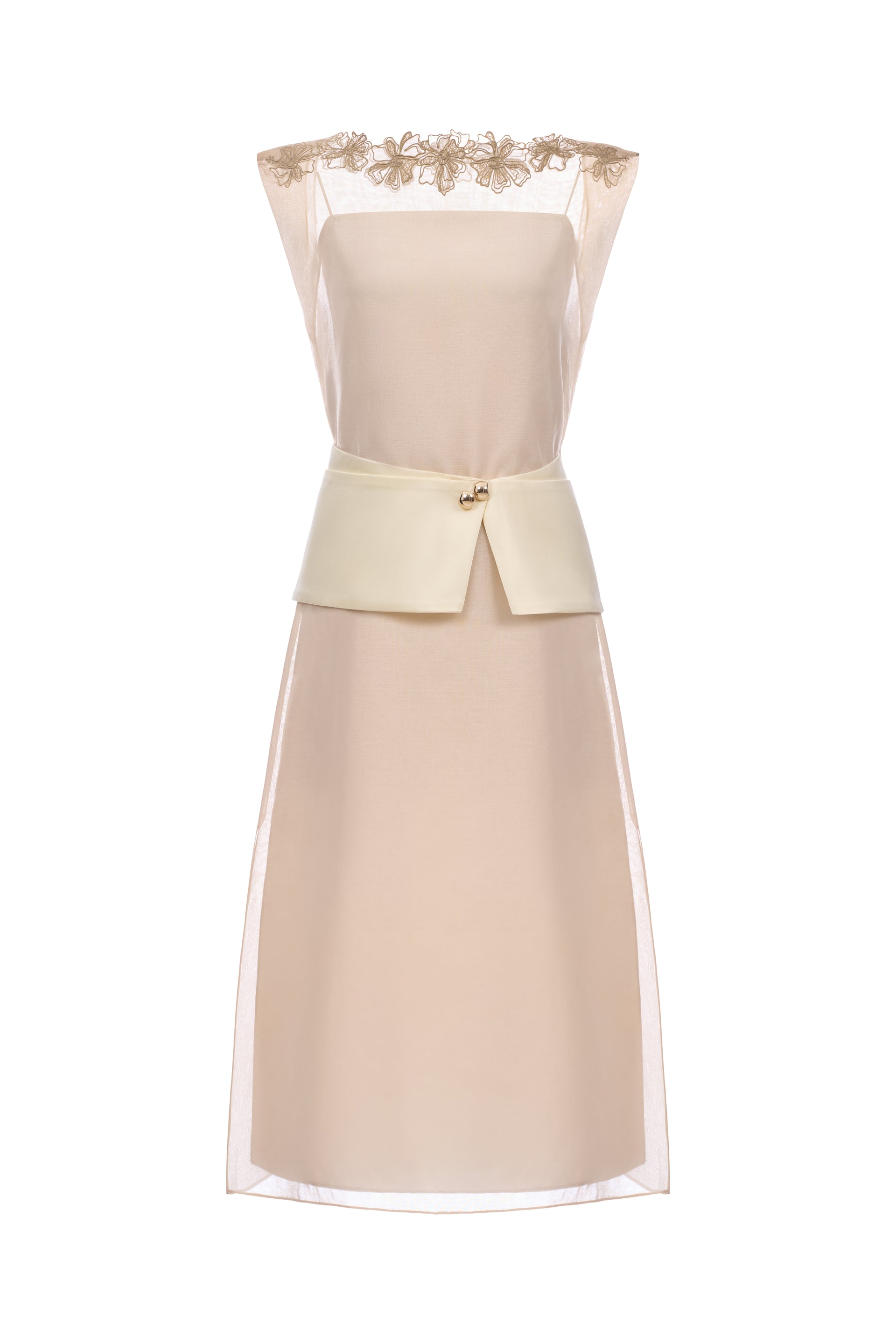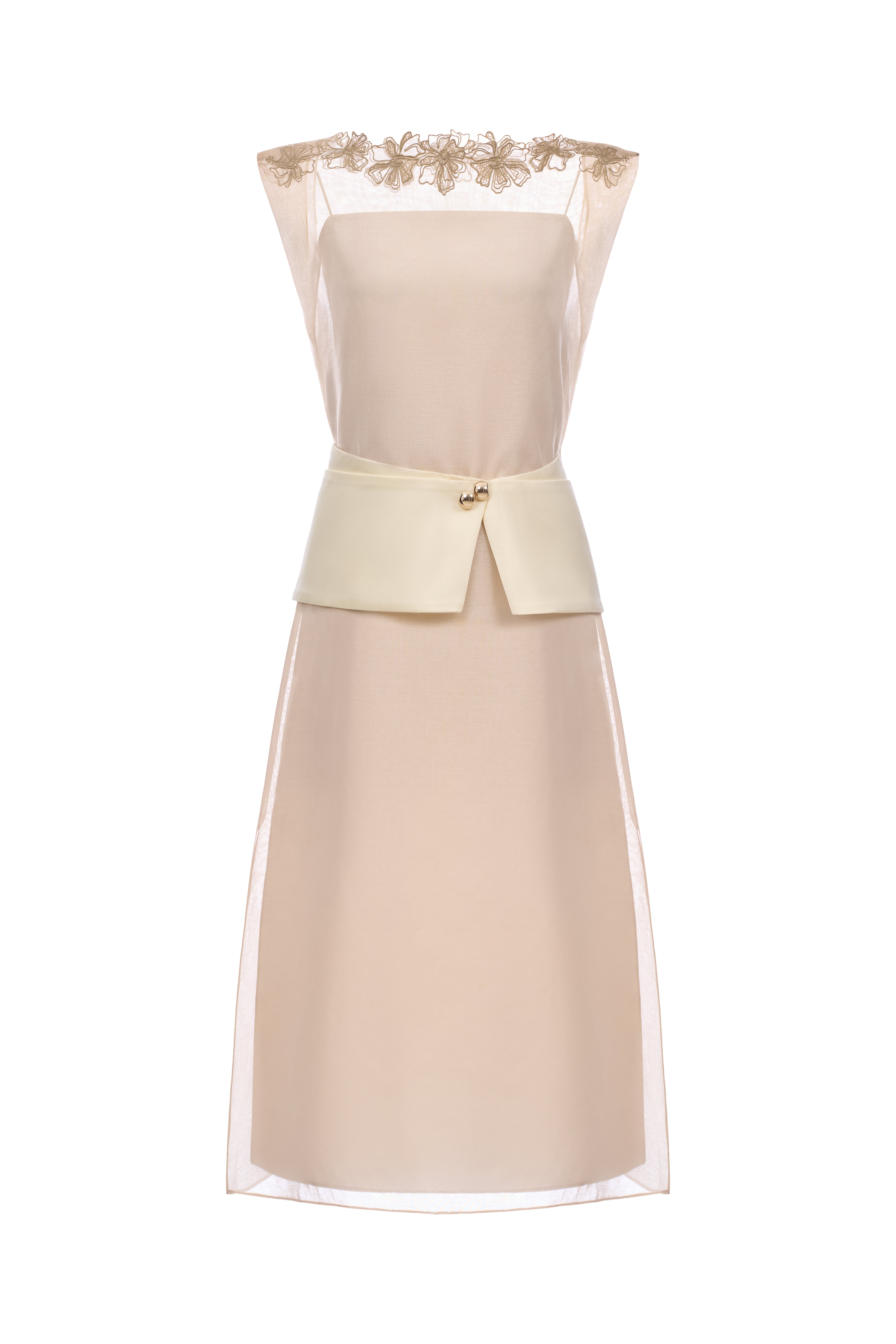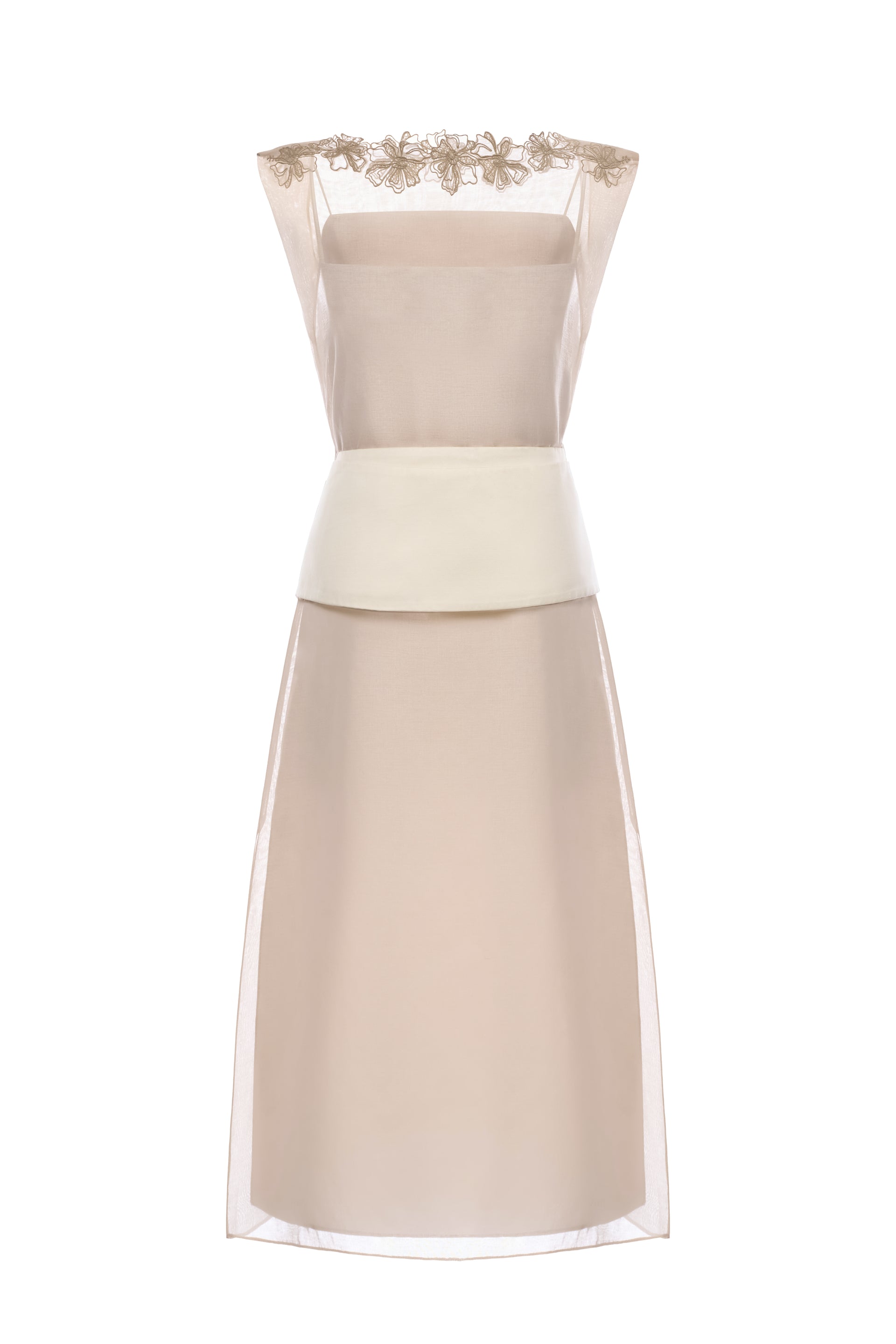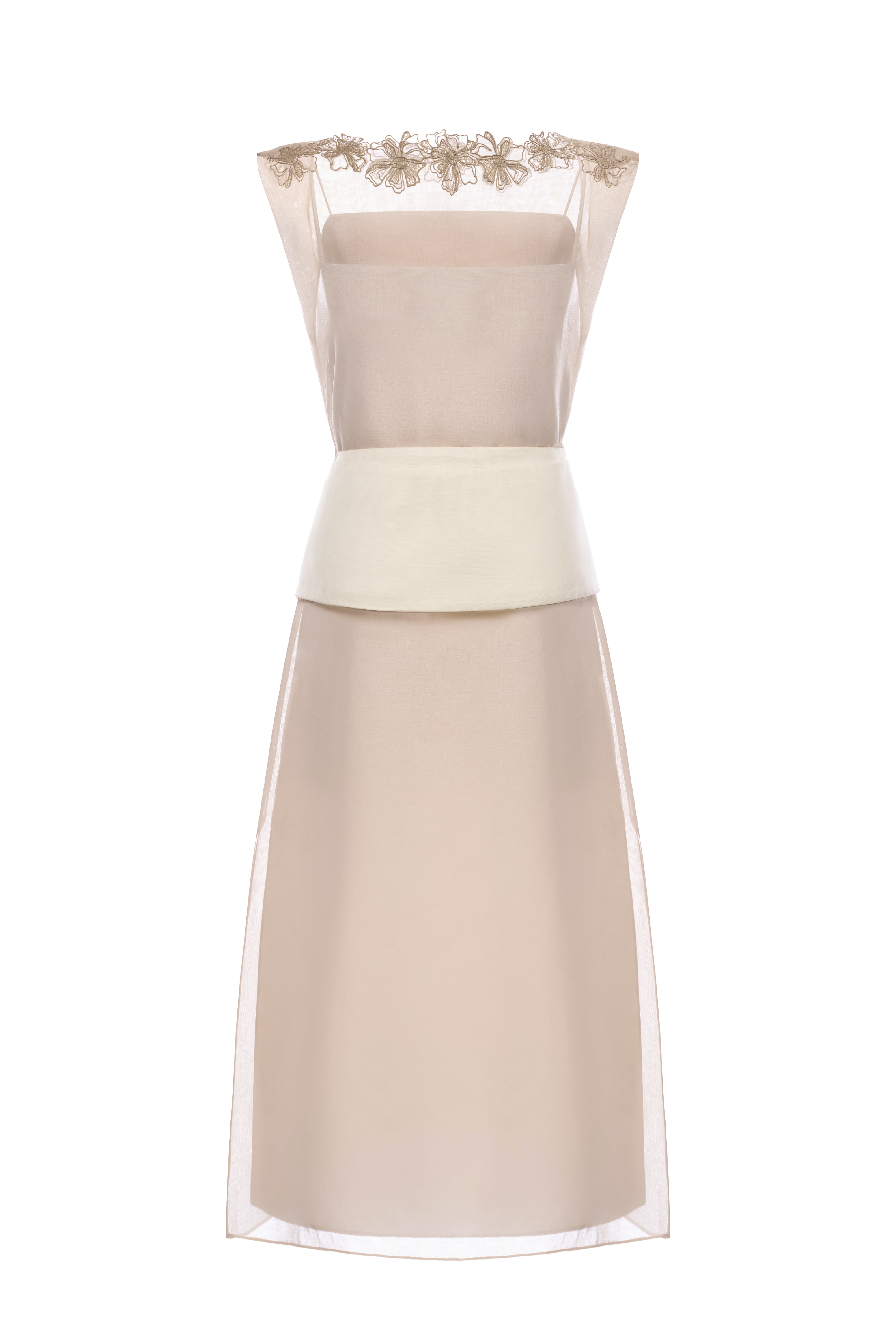 3-piece combo dress. Outer straight dress with square neckline and side slits, featuring exclusive embroidered flowers. Inner slip dress in silk. Wide waistband with metal button detail.