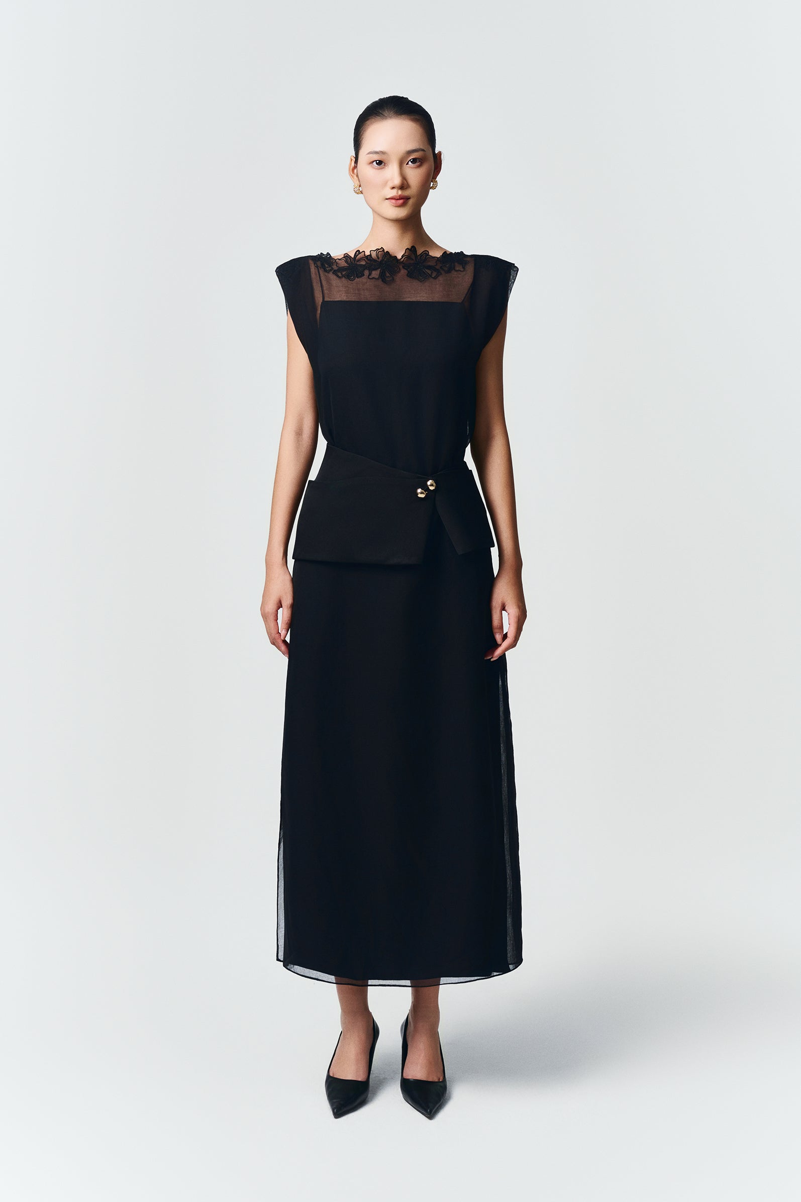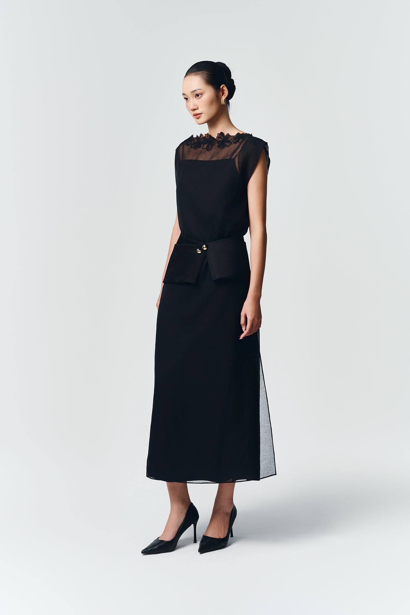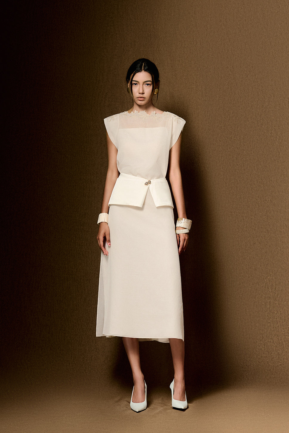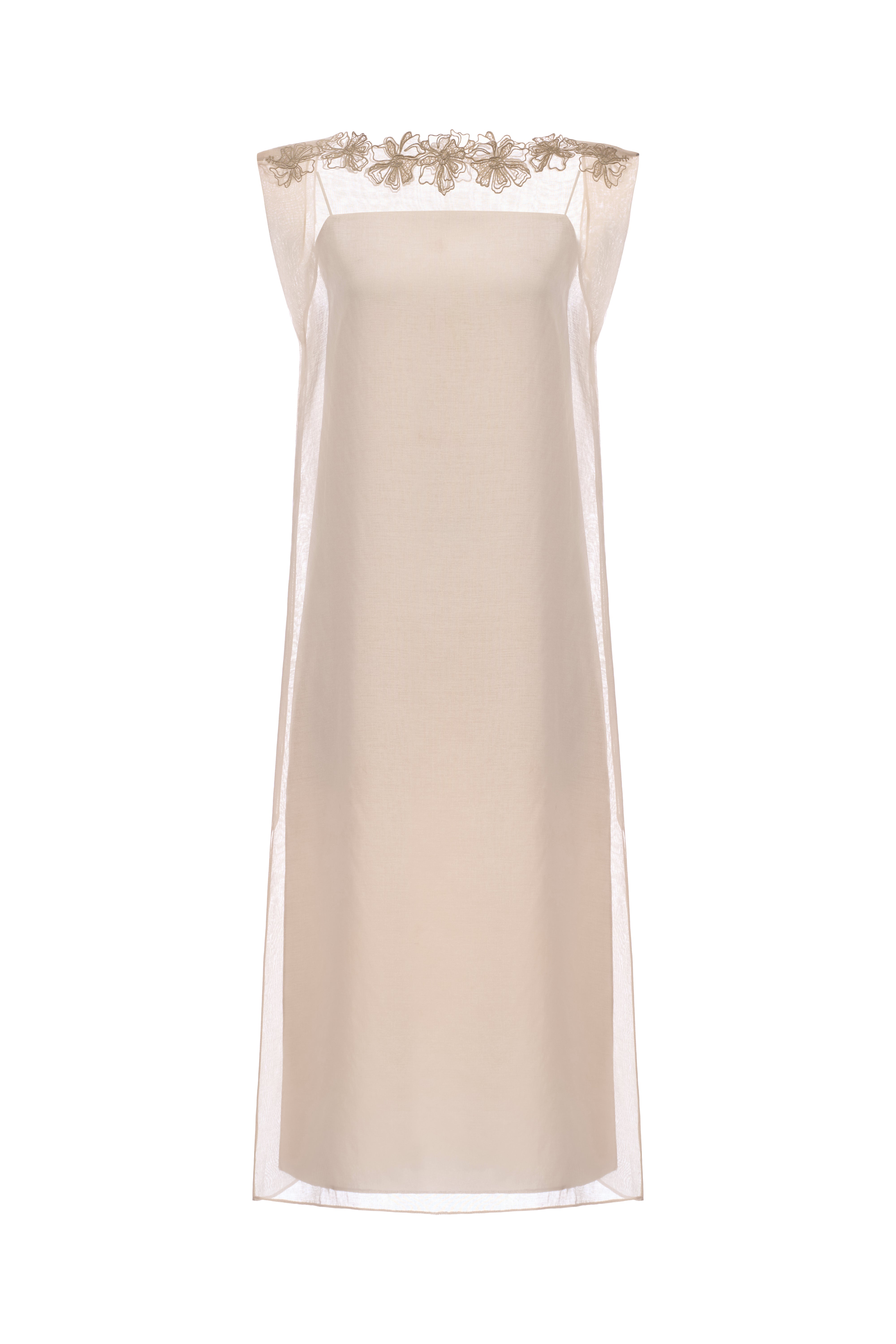 3-piece combo dress. Outer straight dress with square neckline and side slits, featuring exclusive embroidered flowers. Inner slip dress in silk. Wide waistband with metal button detail.