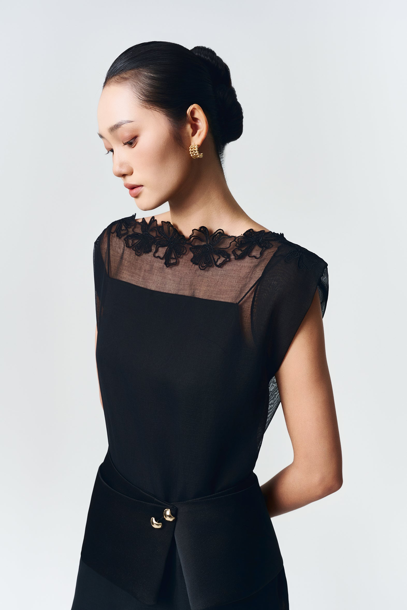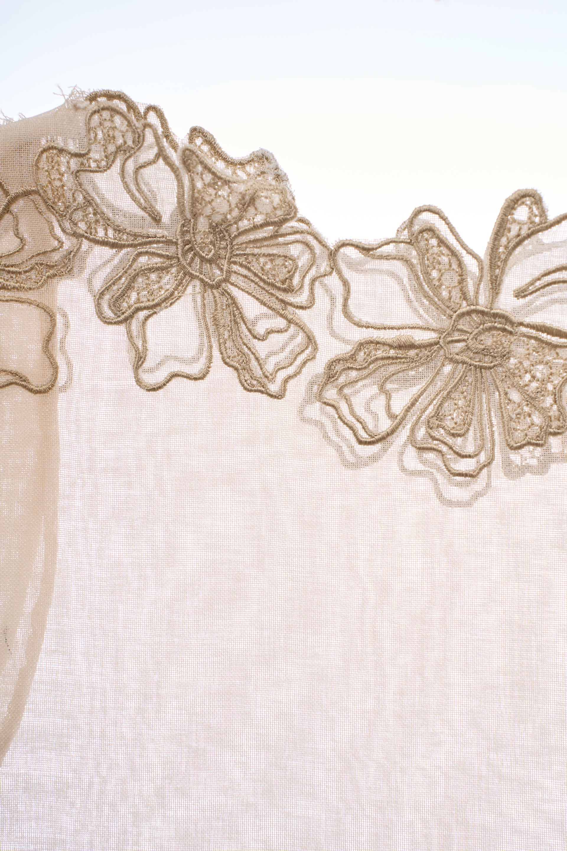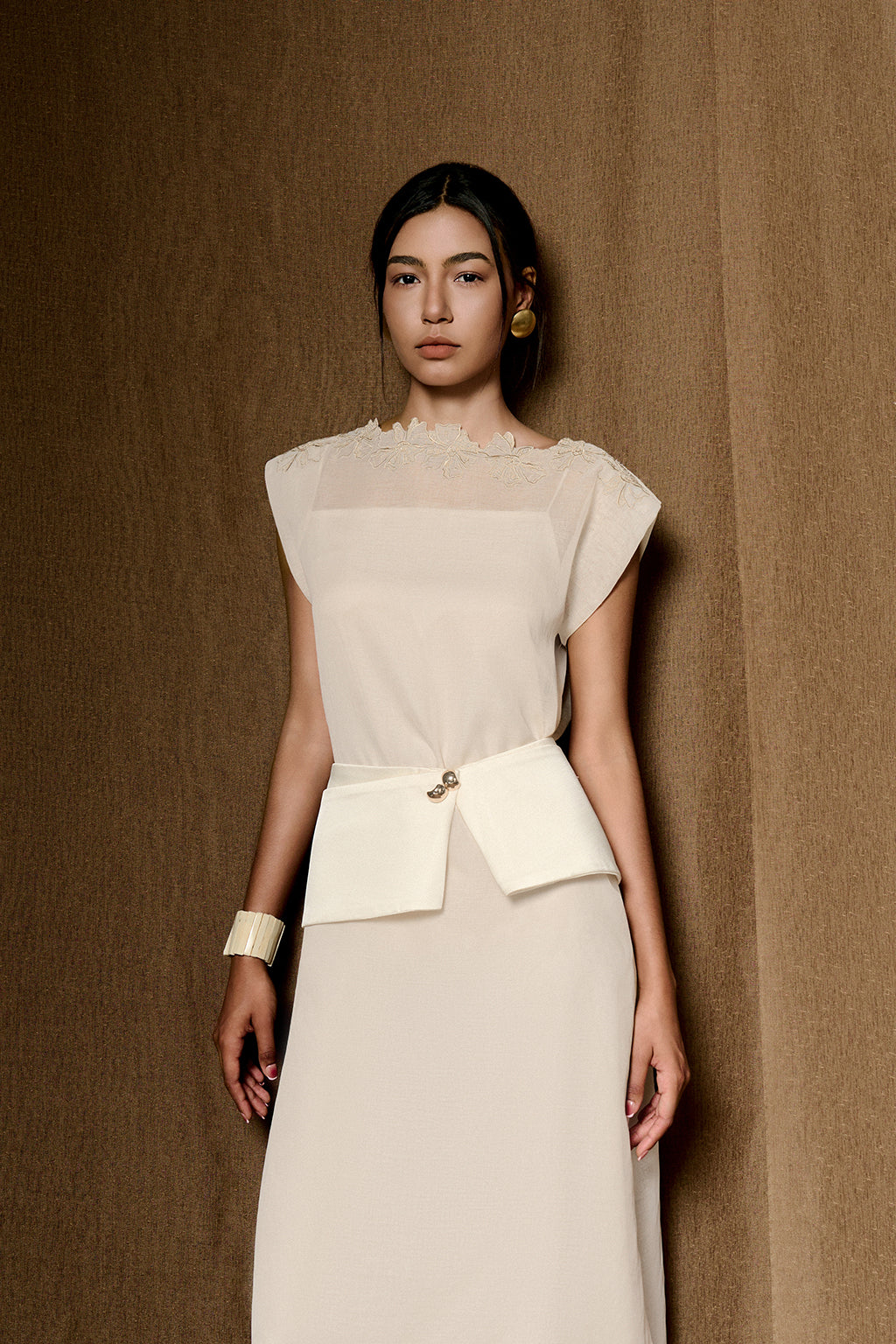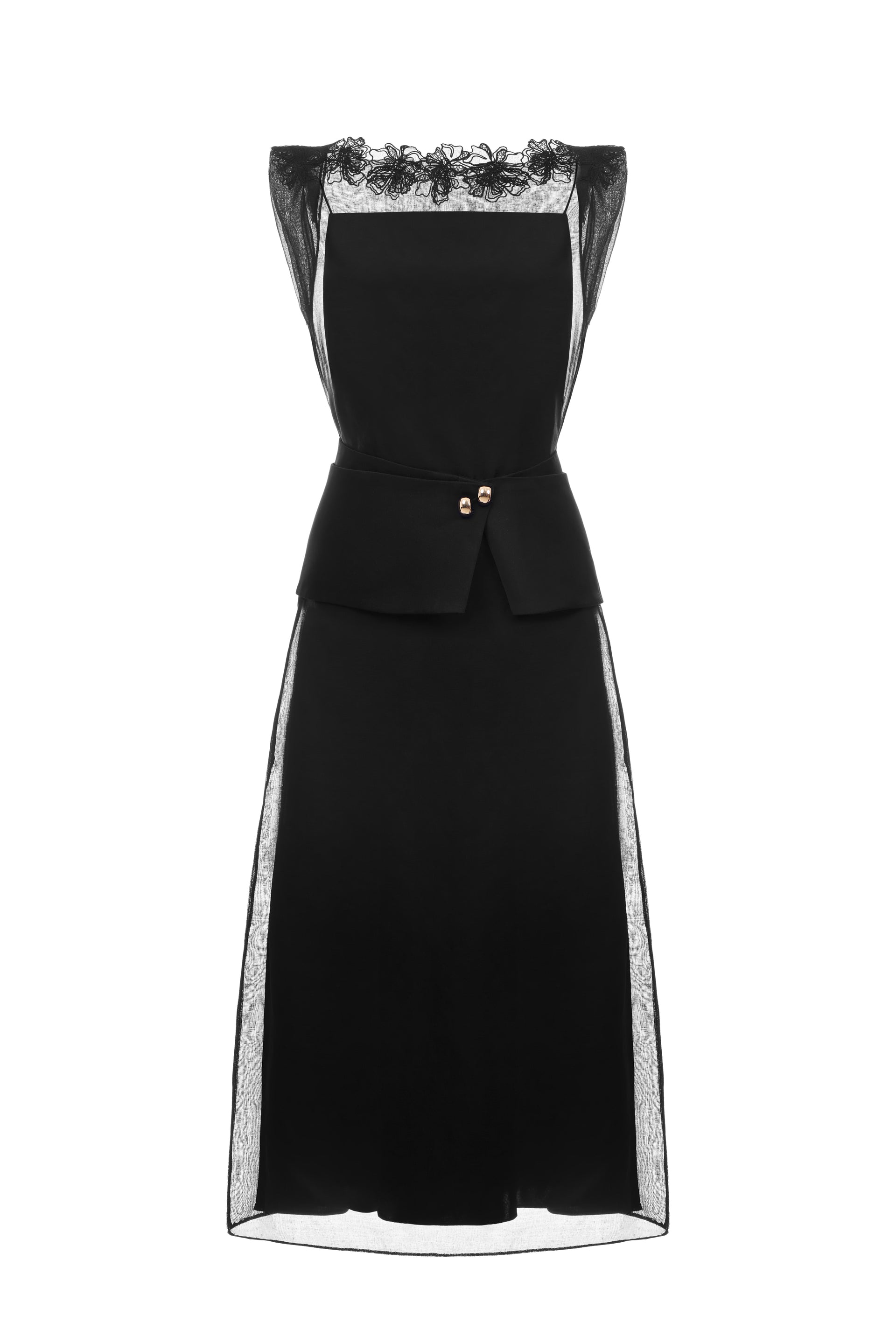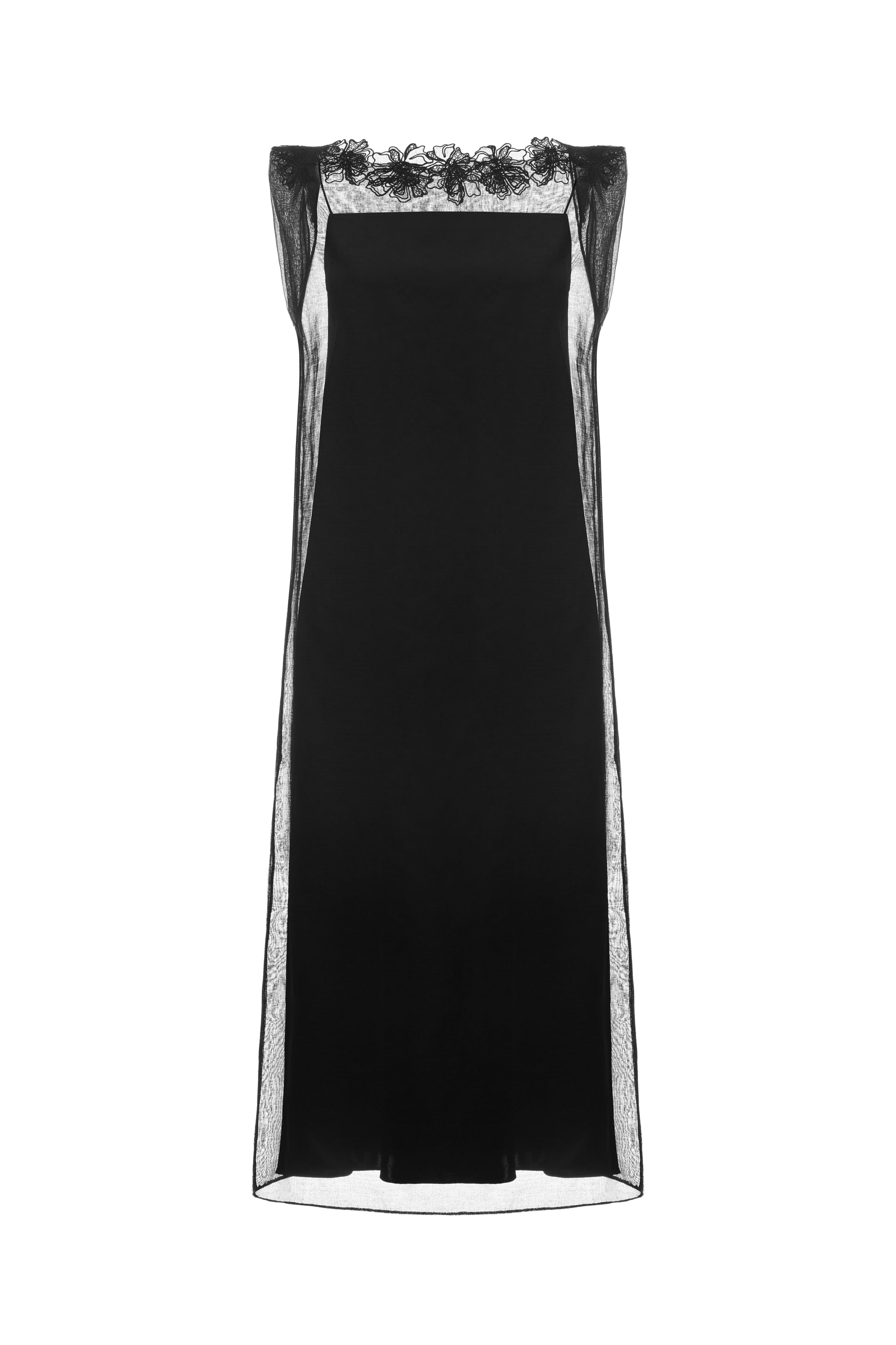 3-piece combo dress. Outer straight dress with square neckline and side slits, featuring exclusive embroidered flowers. Inner slip dress in silk. Wide waistband with metal button detail.