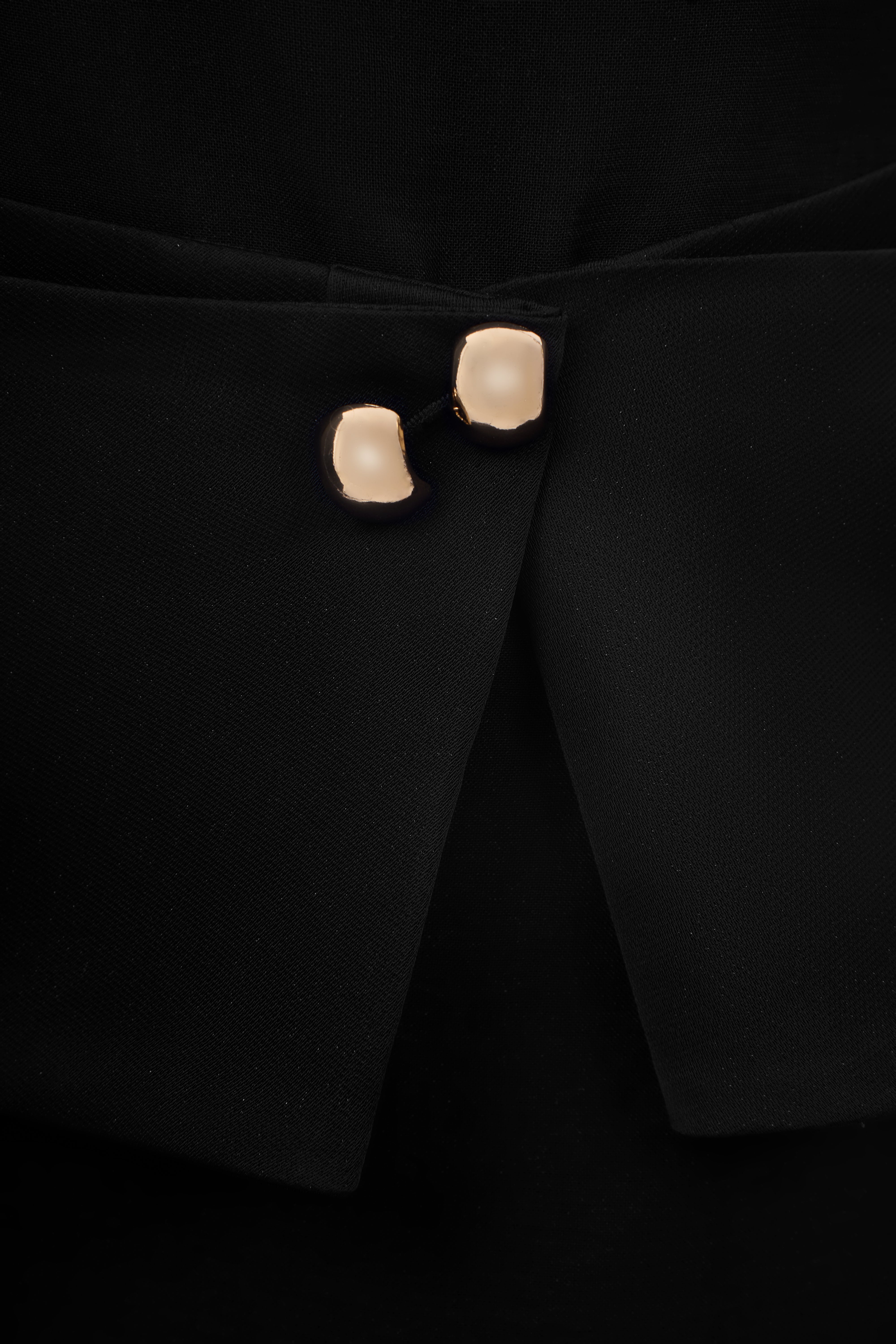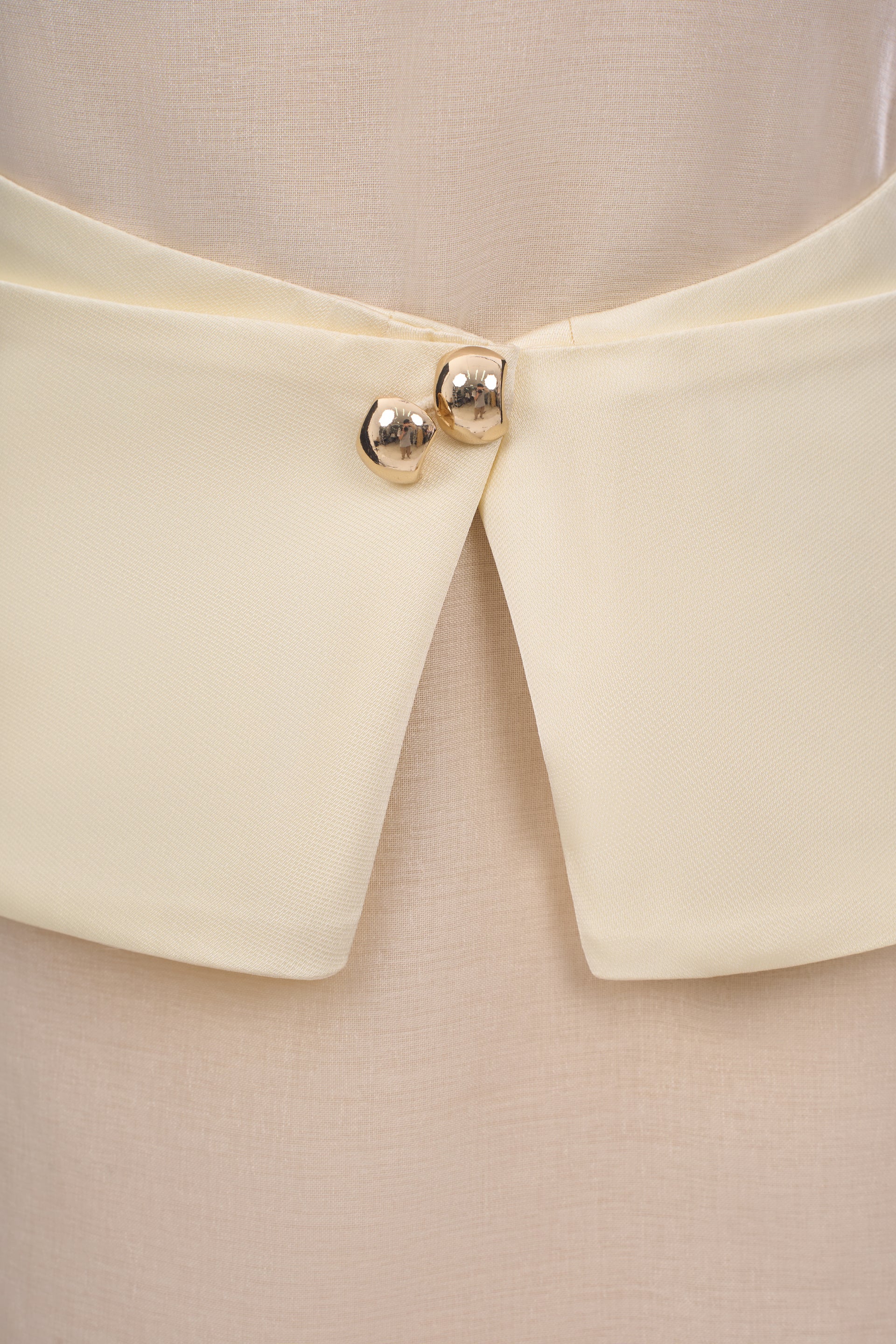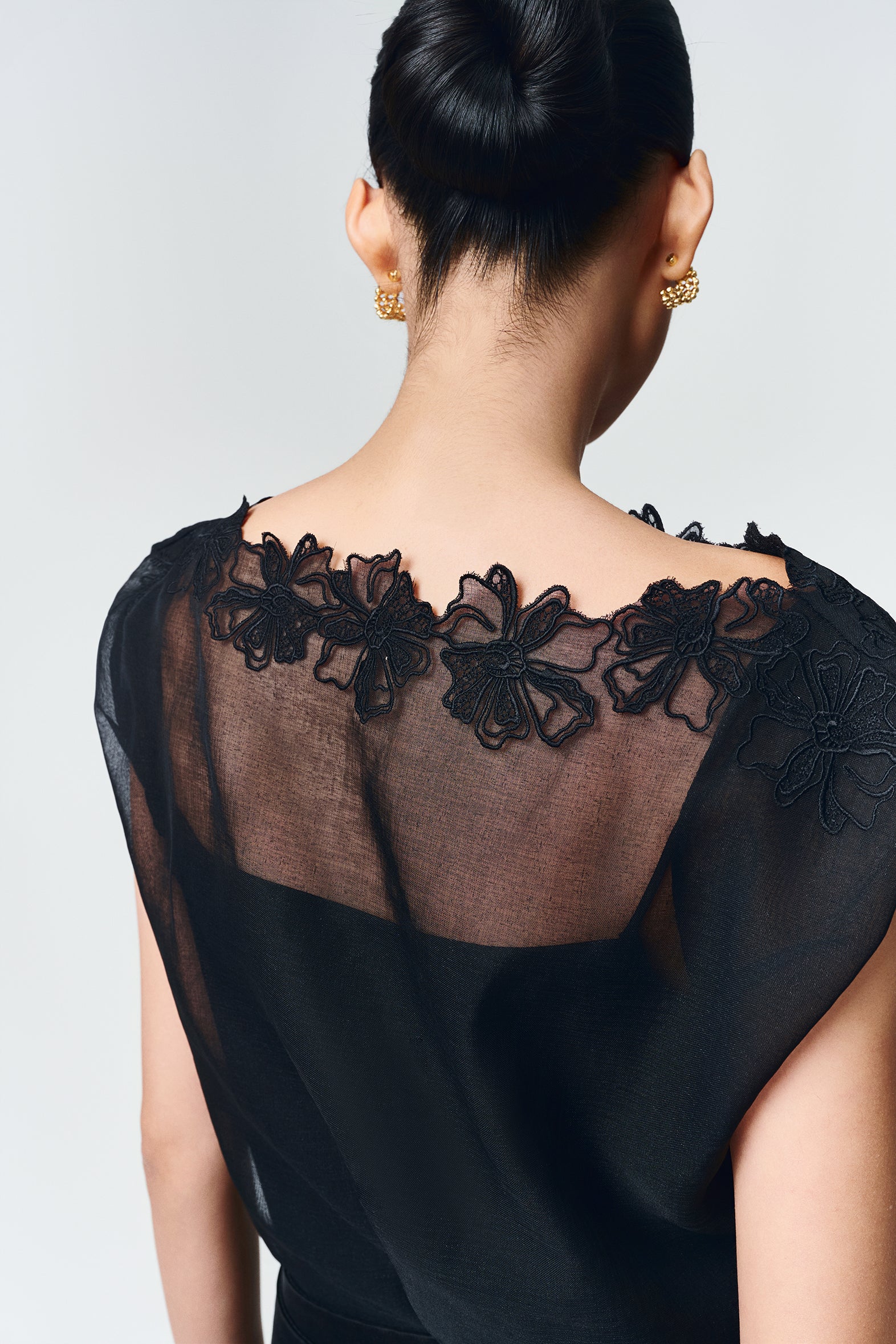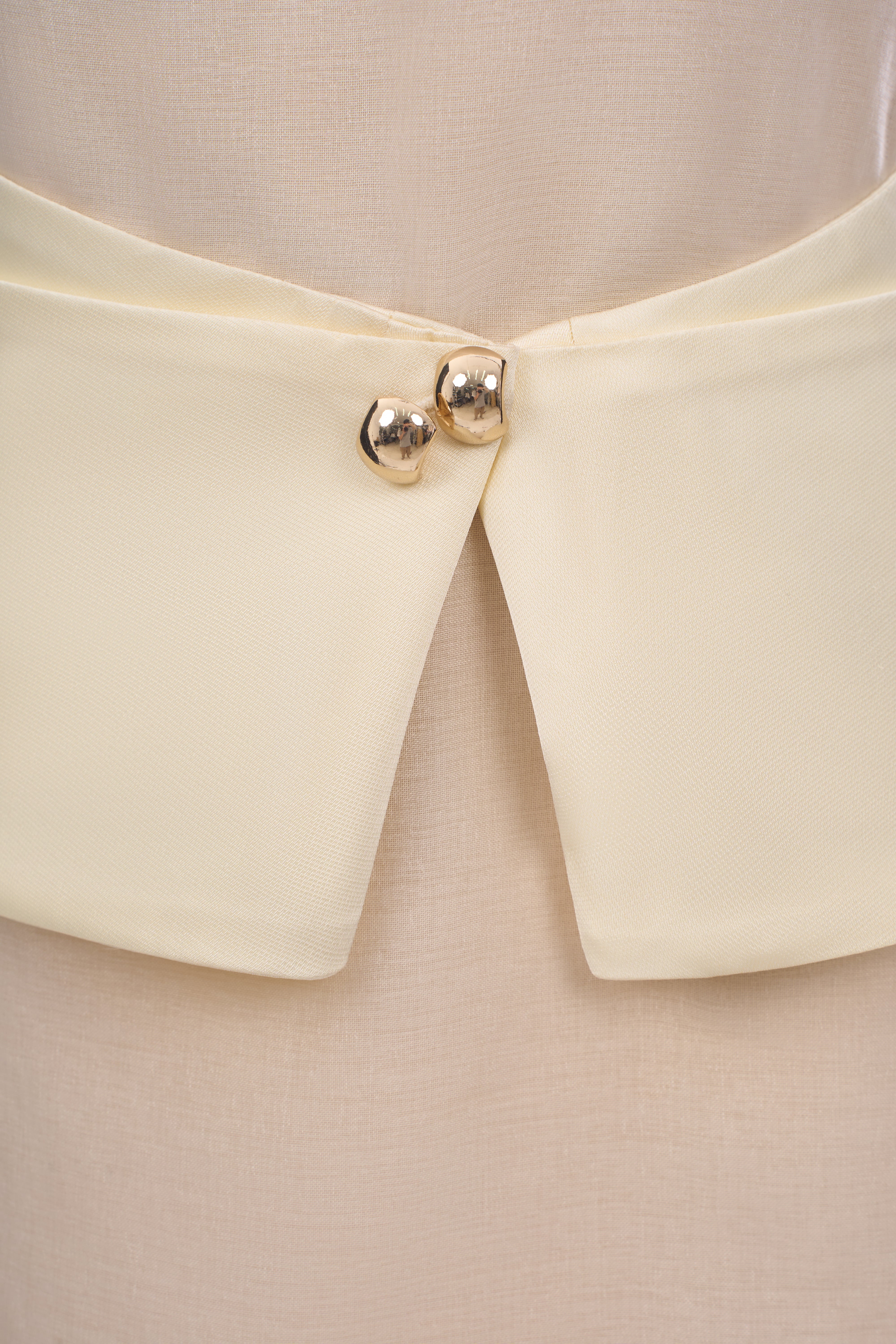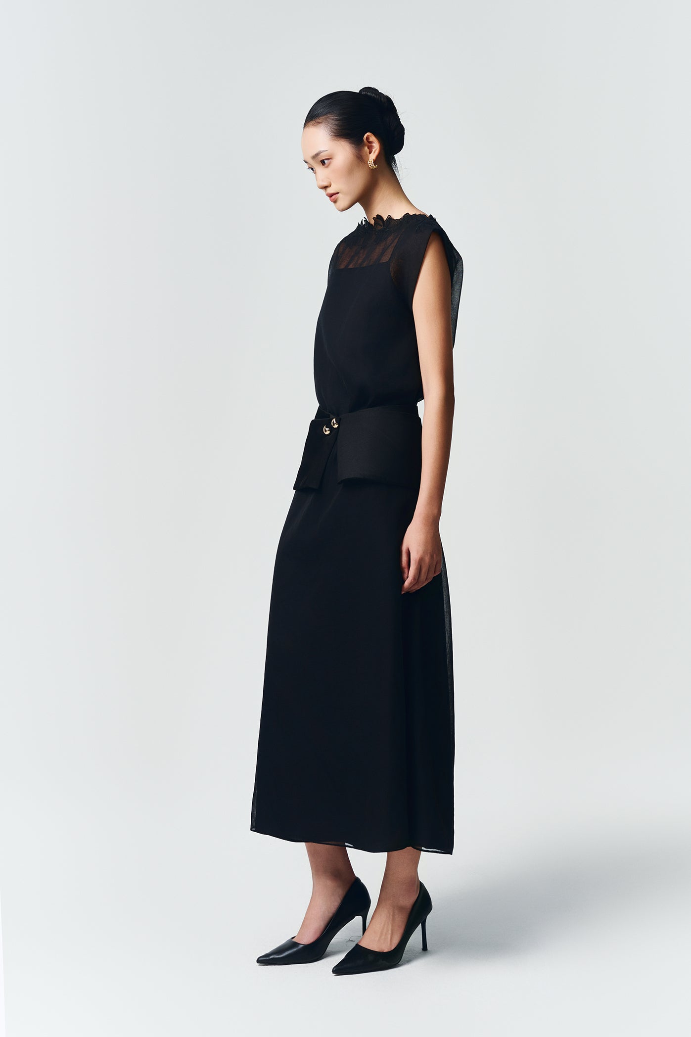 3-piece combo dress. Outer straight dress with square neckline and side slits, featuring exclusive embroidered flowers. Inner slip dress in silk. Wide waistband with metal button detail.
