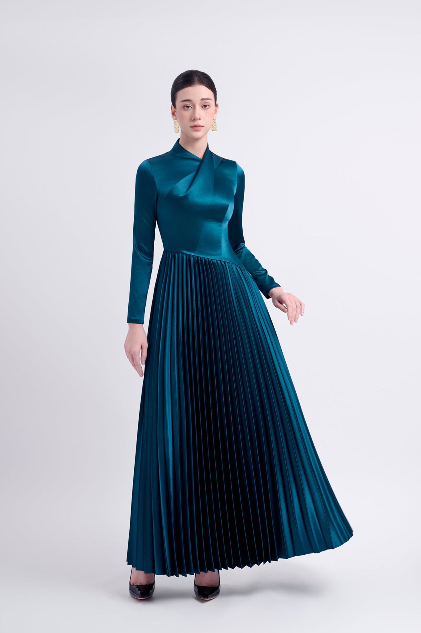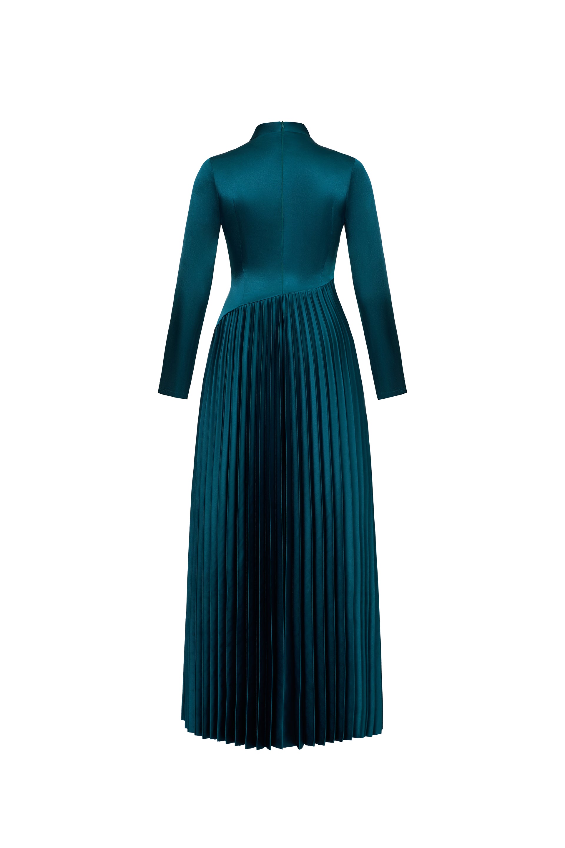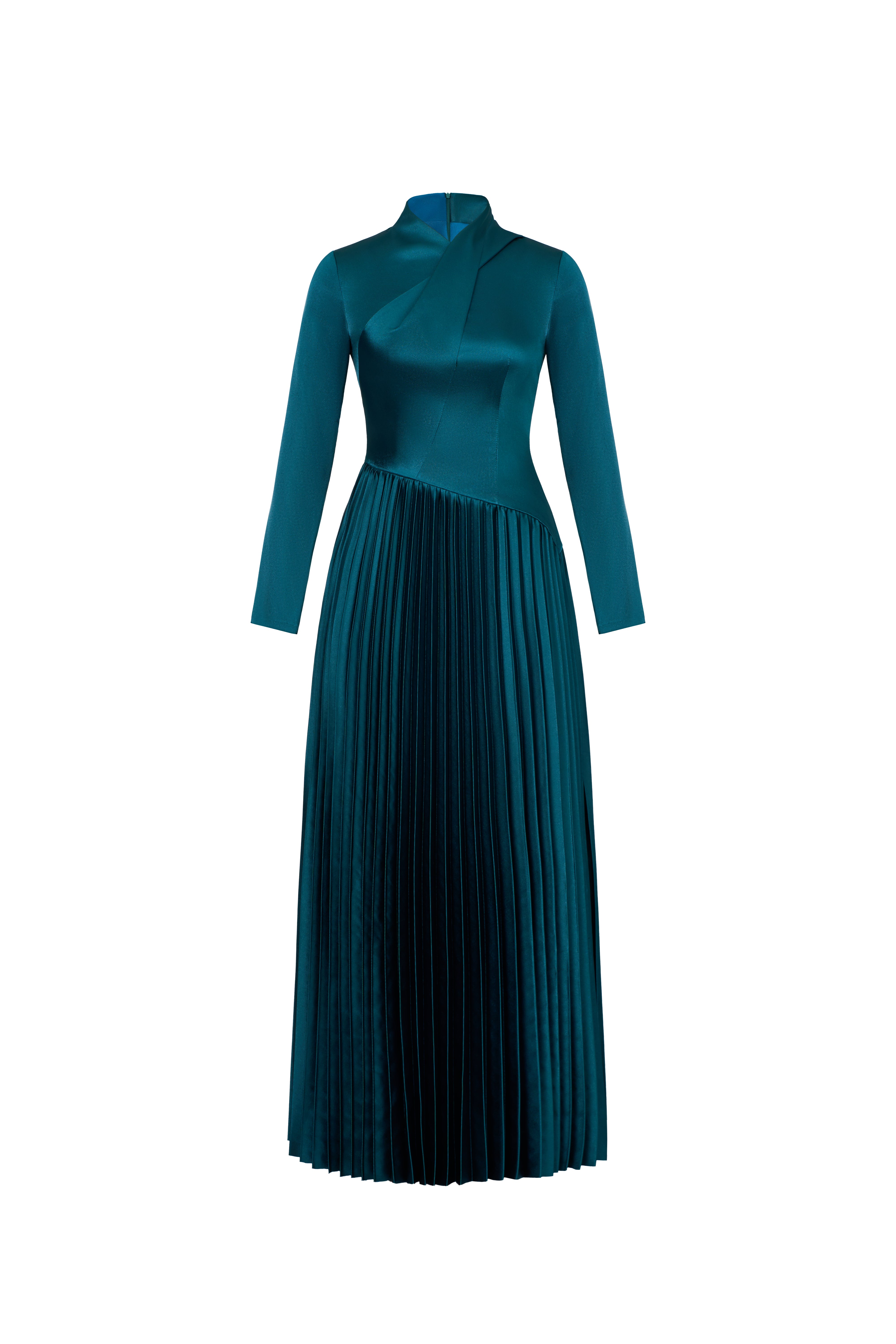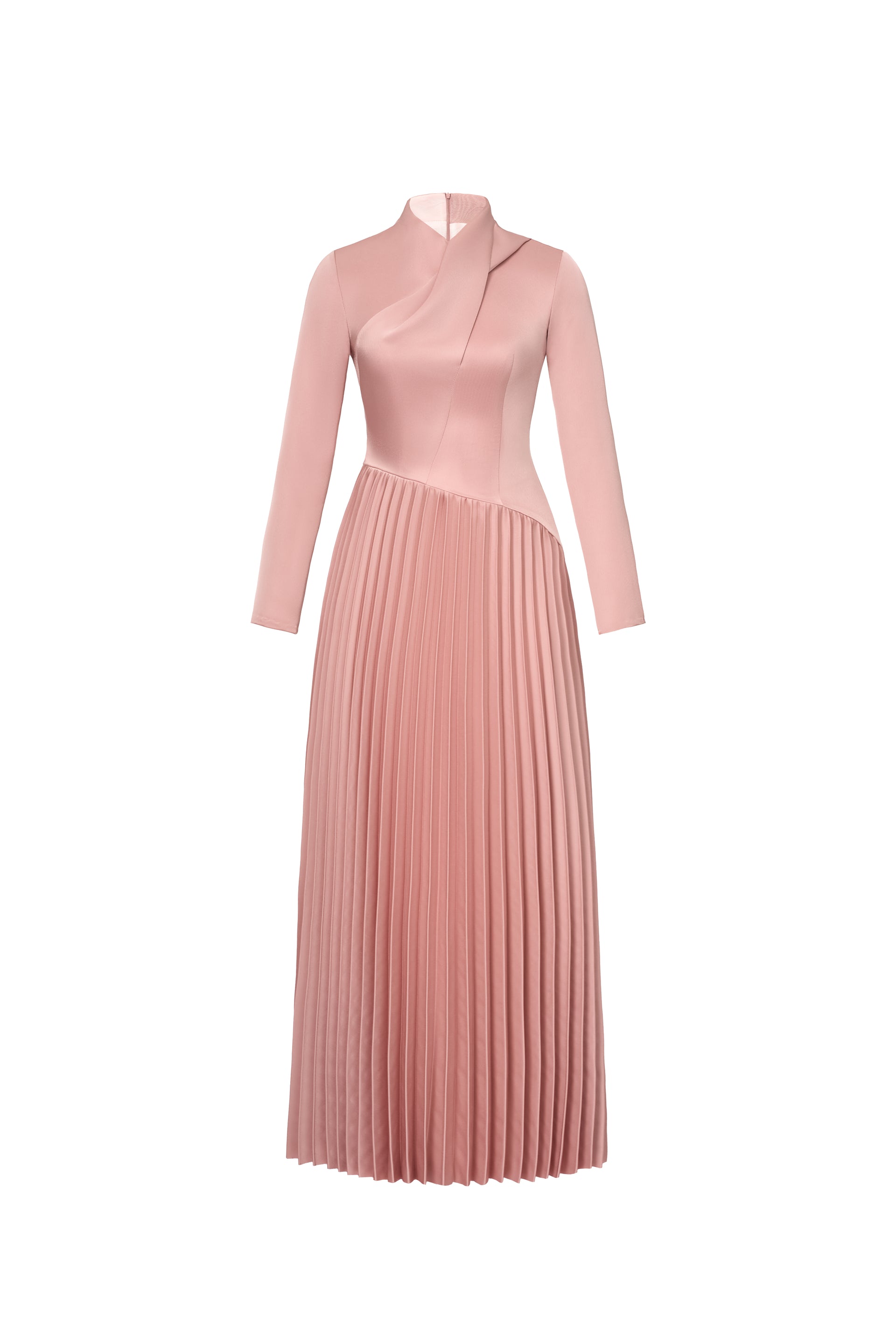 Elegant long-sleeved Japanese silk dress with gingko pleats at the bottom and a unique folded flap above the front body. The dress is fully lined and features a back zipper for easy wear.
