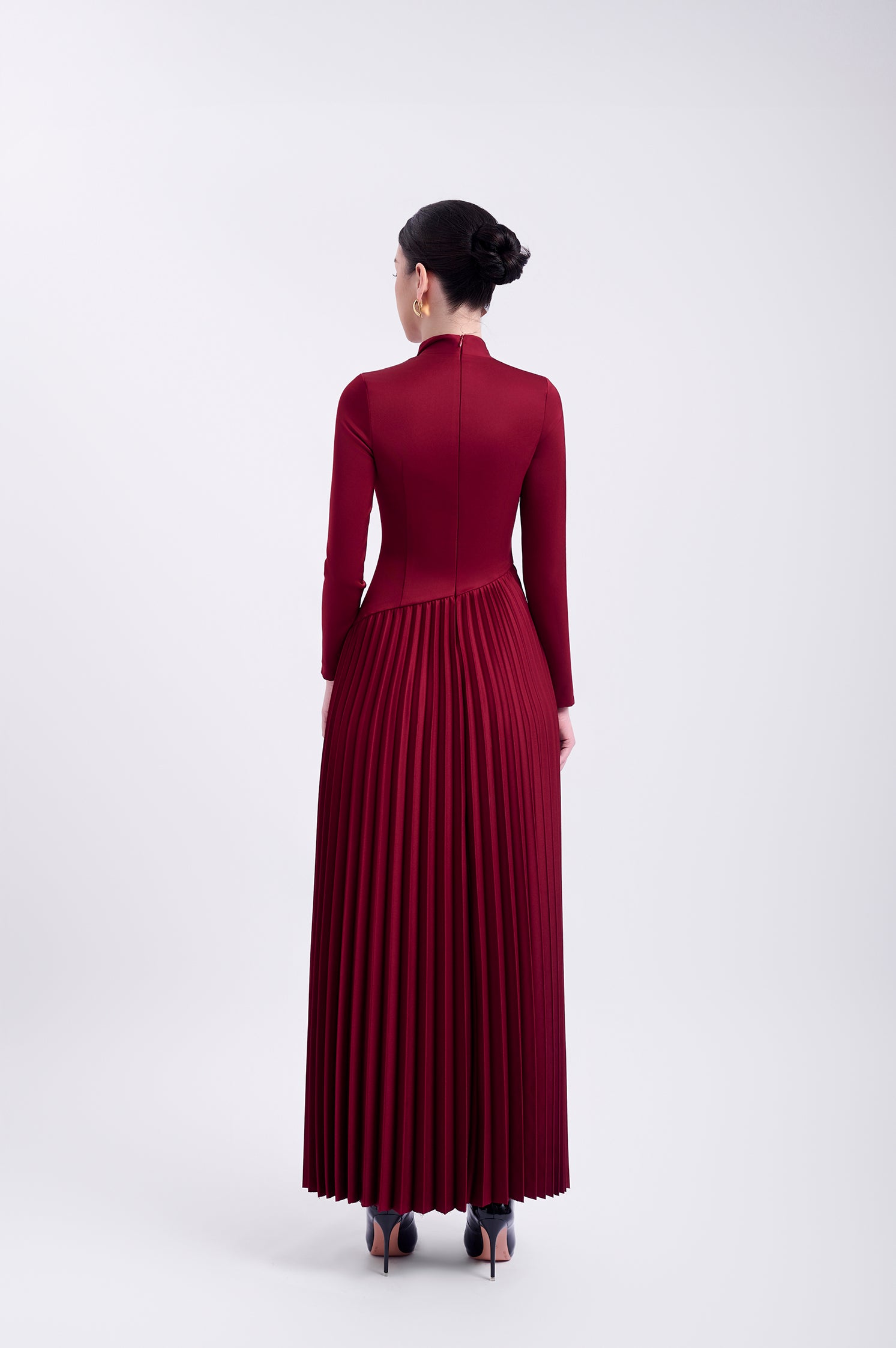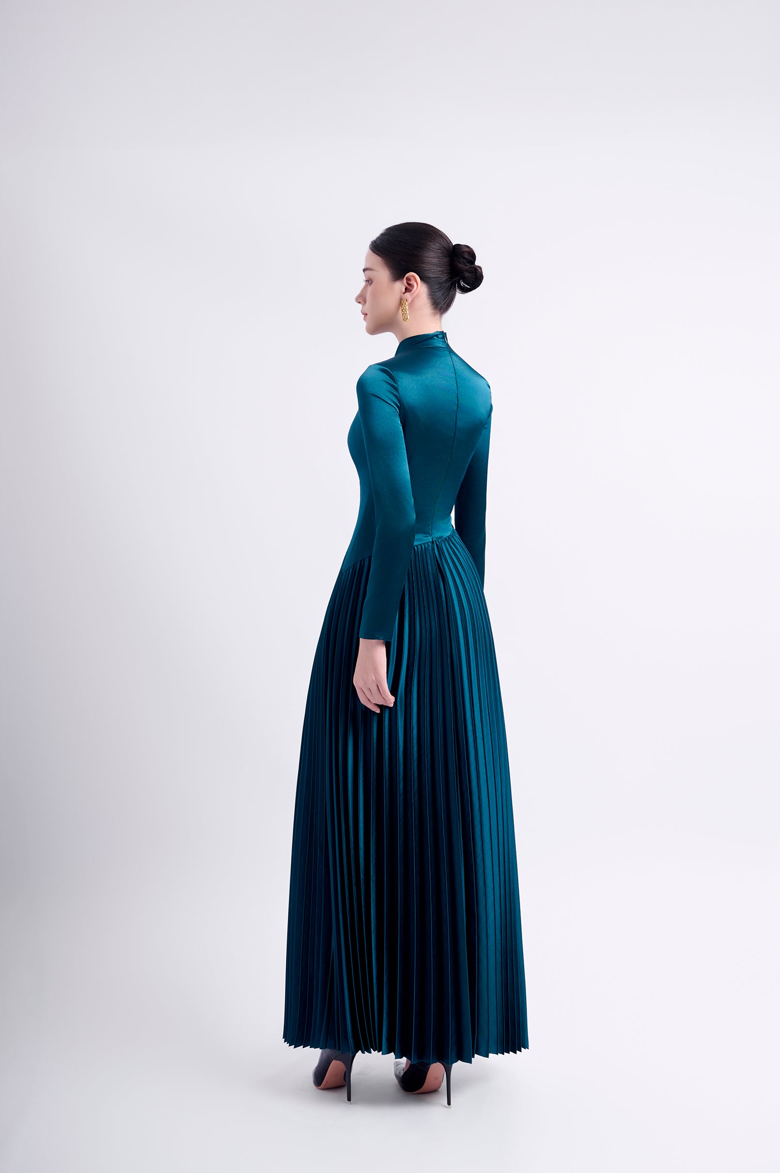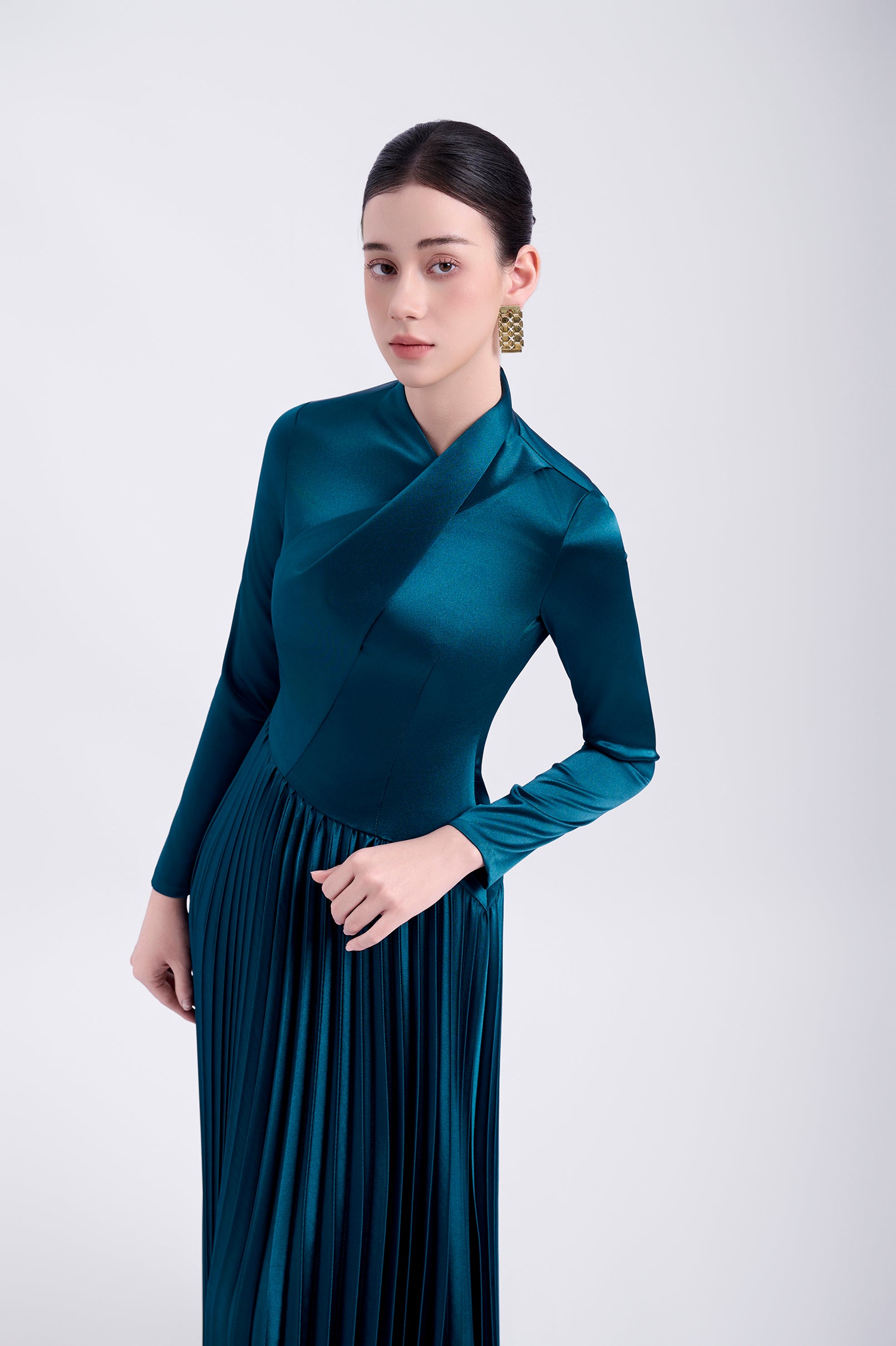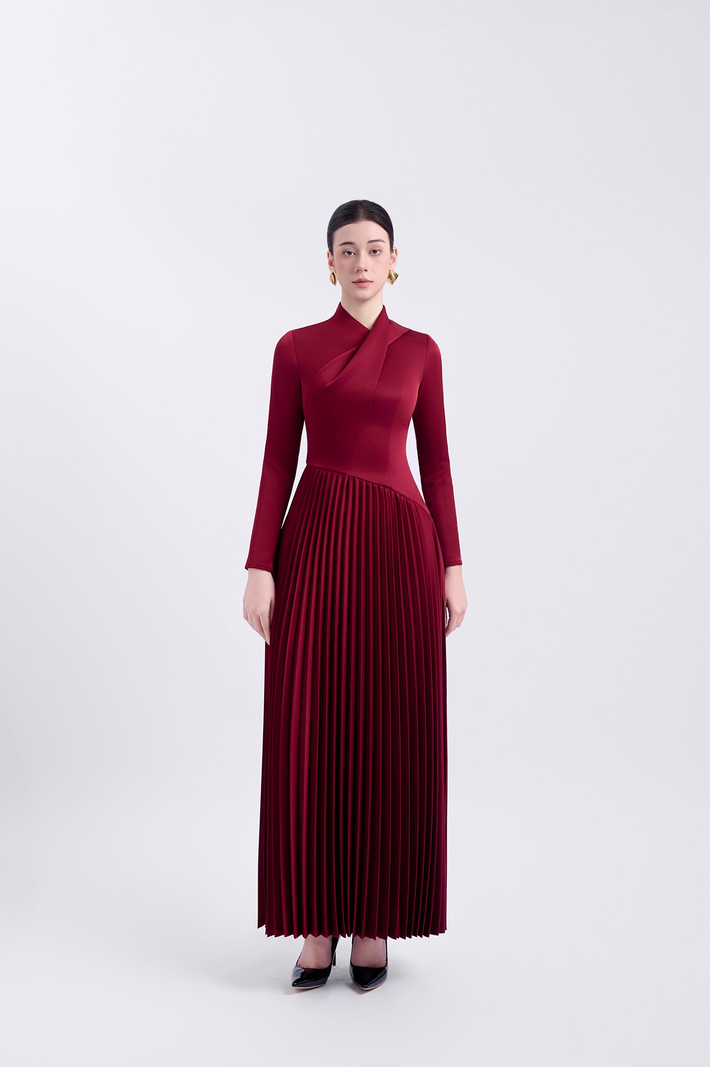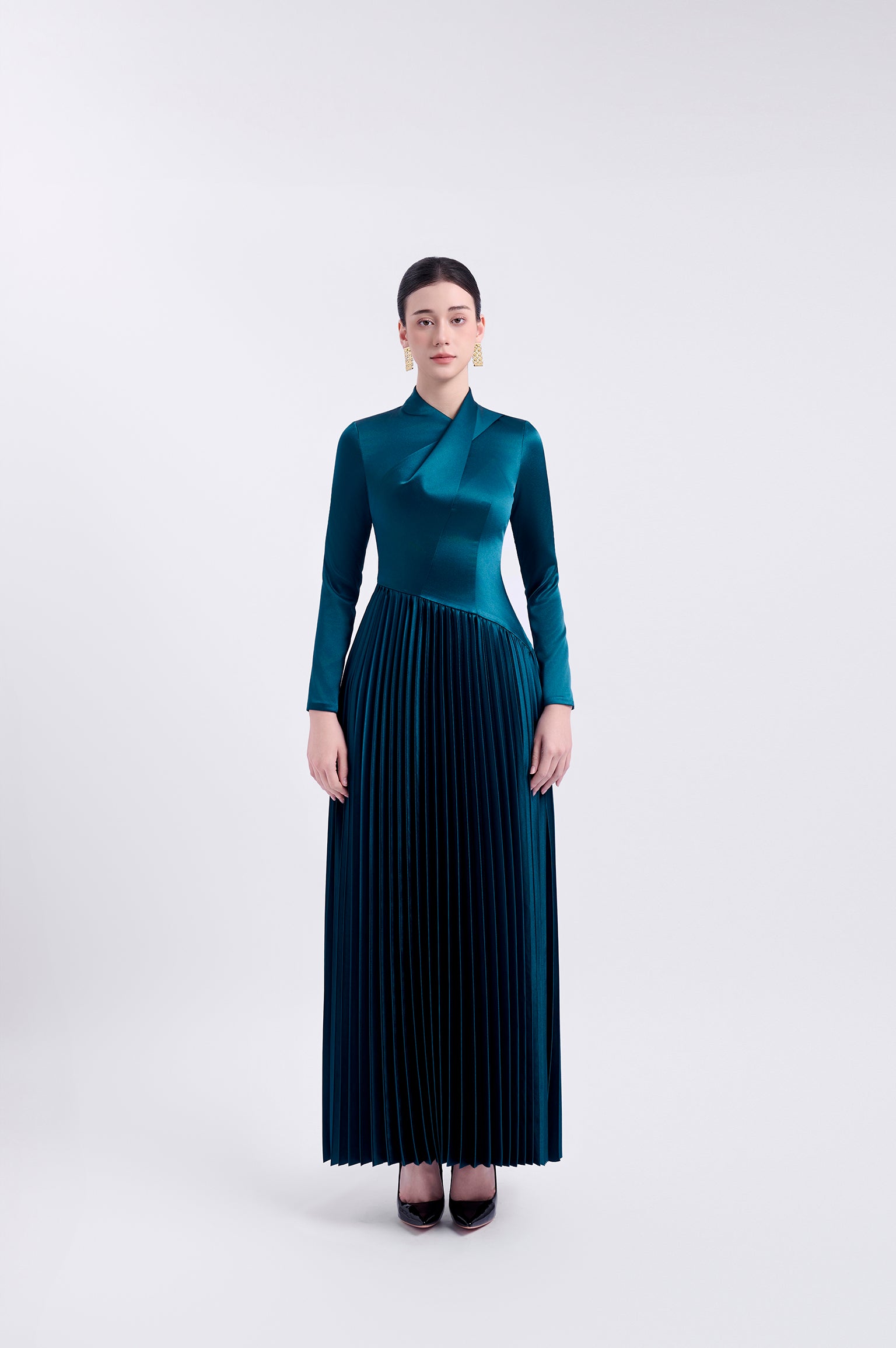 Elegant long-sleeved Japanese silk dress with gingko pleats at the bottom and a unique folded flap above the front body. The dress is fully lined and features a back zipper for easy wear.