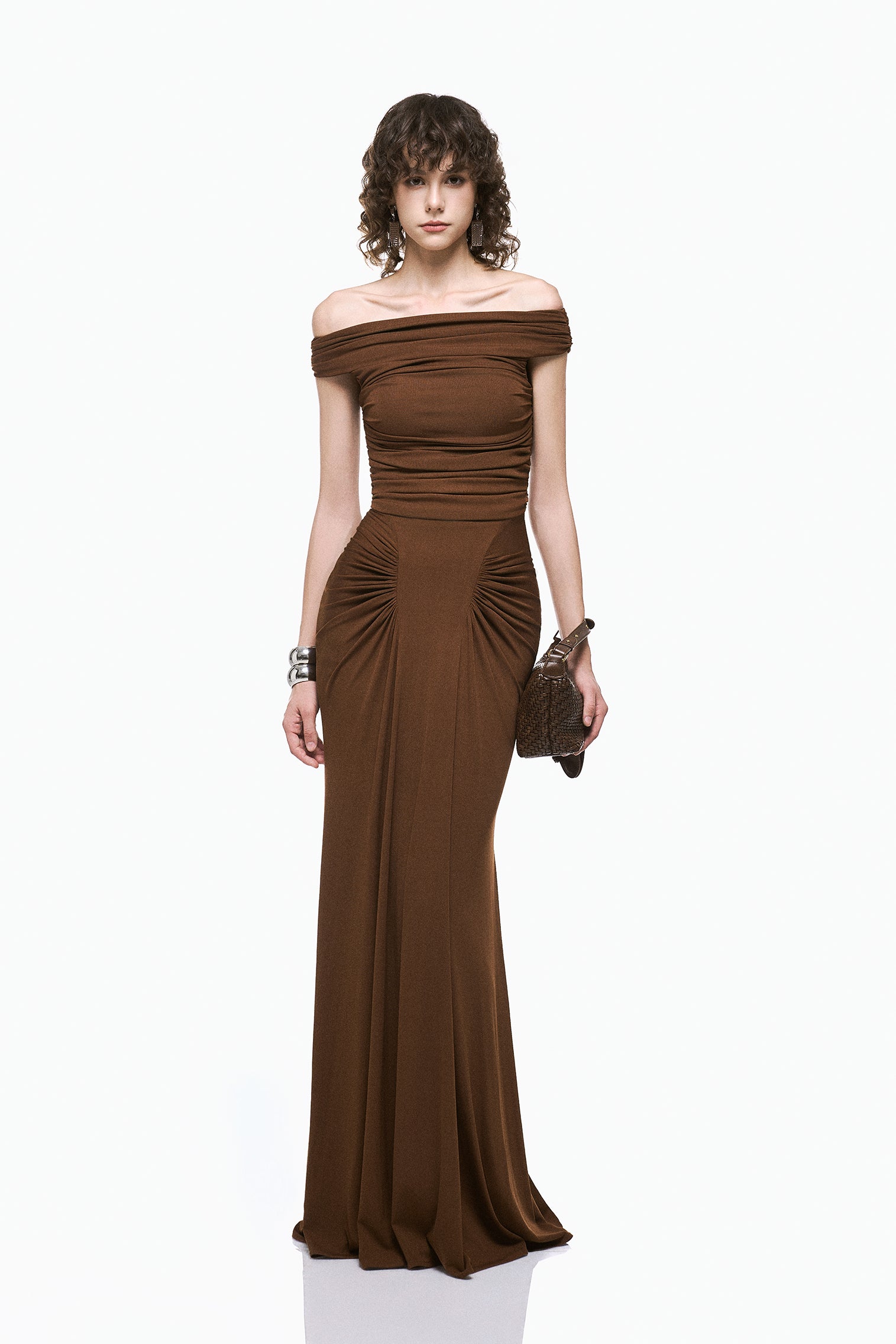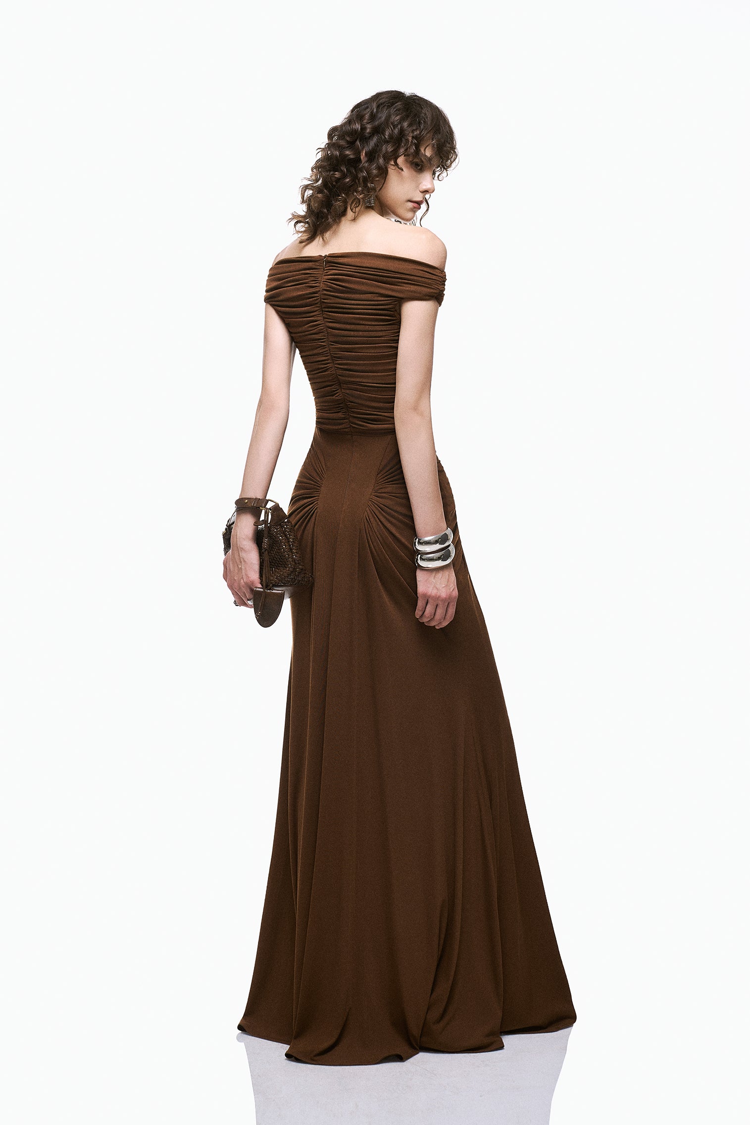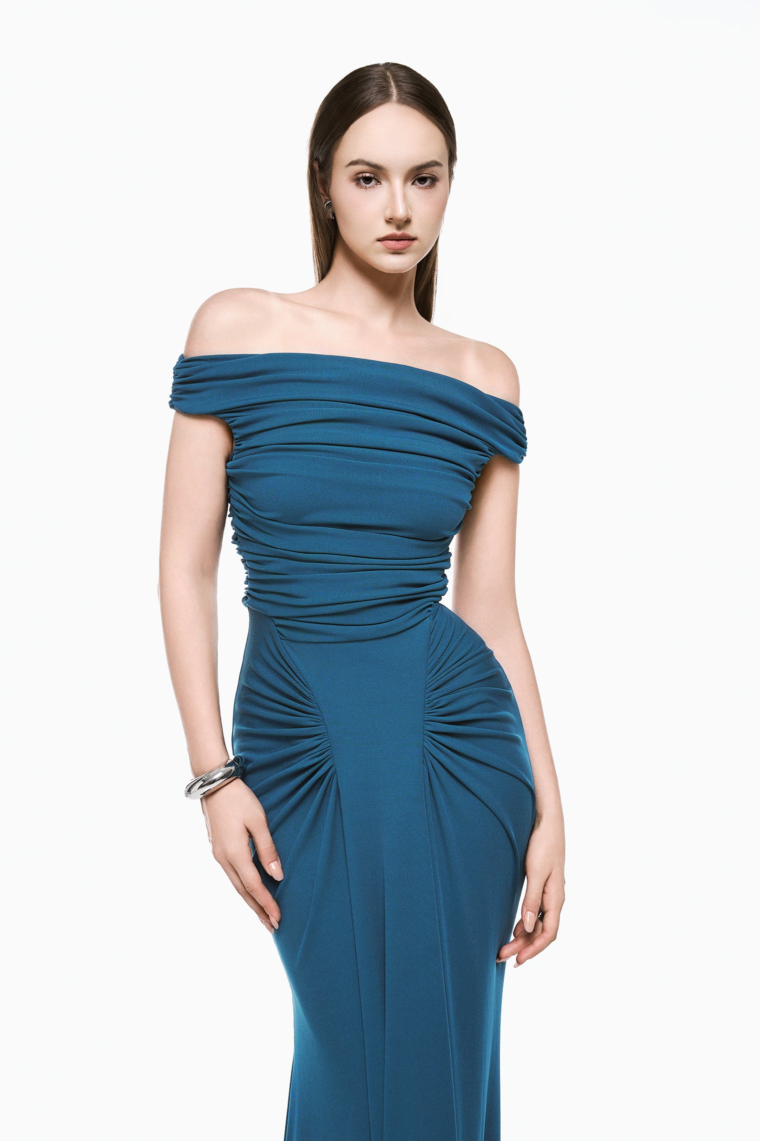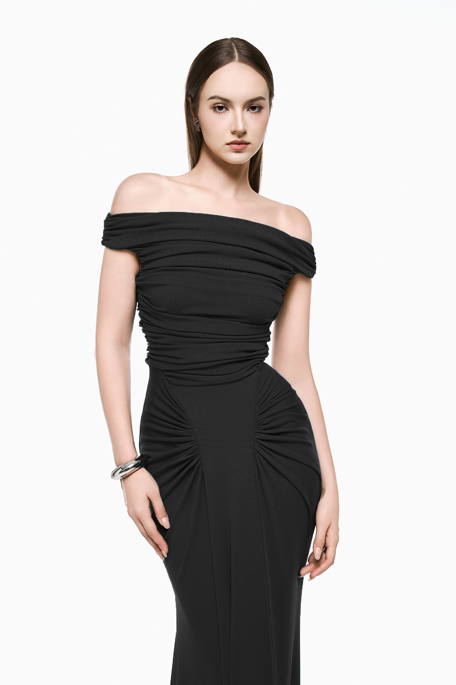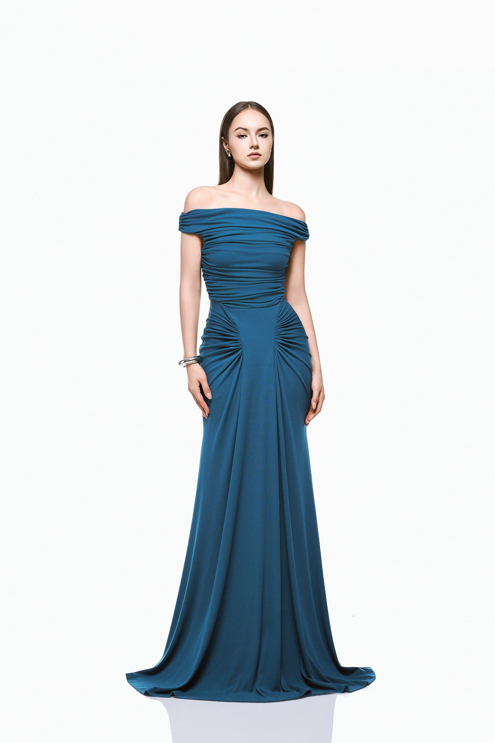 The Lani Dress features an off shoulder neckline with horizontal gathered detailing that contours the bodice and defines the waist. Radial ruching at the hips transitions into a floor length skirt, creating a lean, sculpted silhouette with composed movement.
