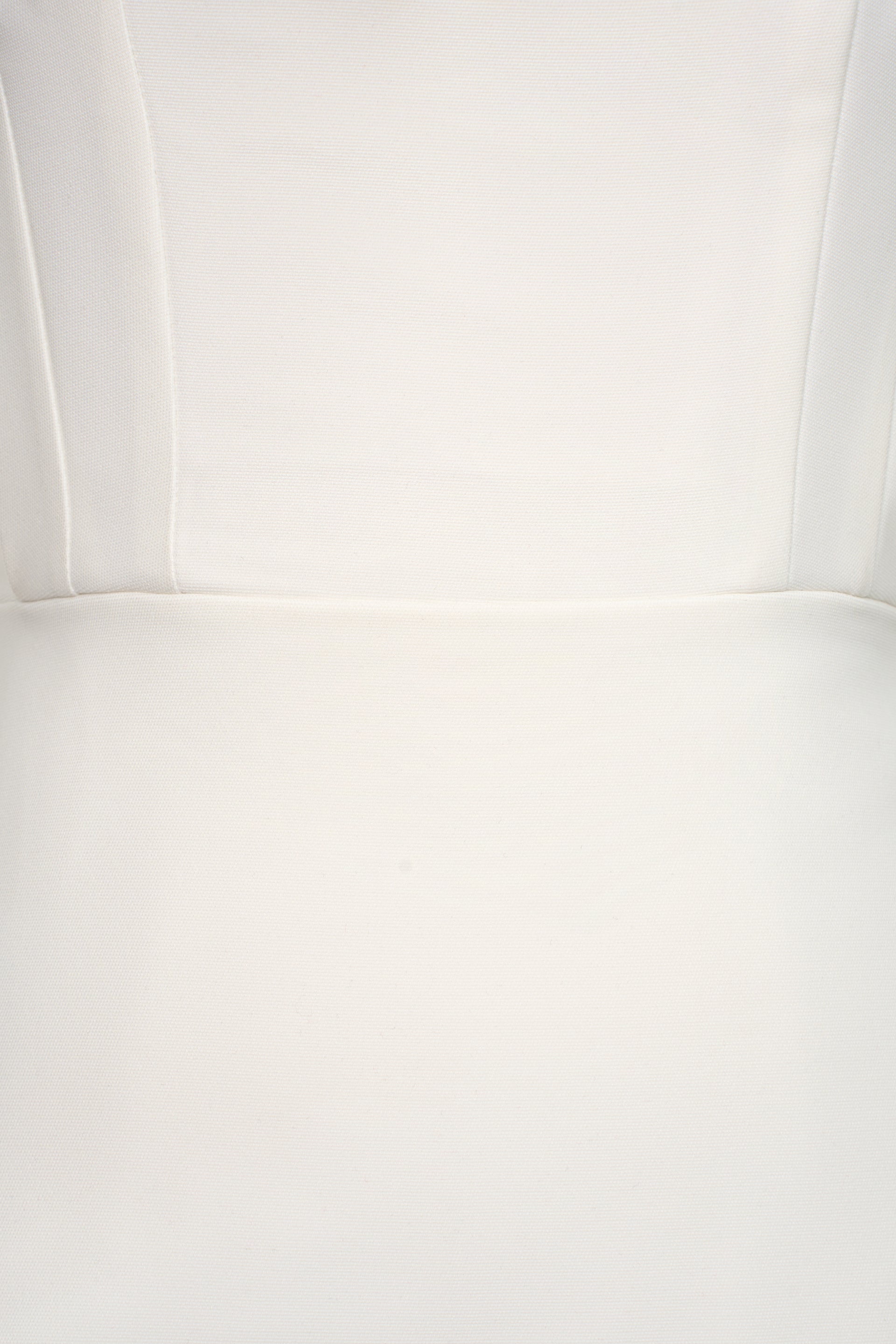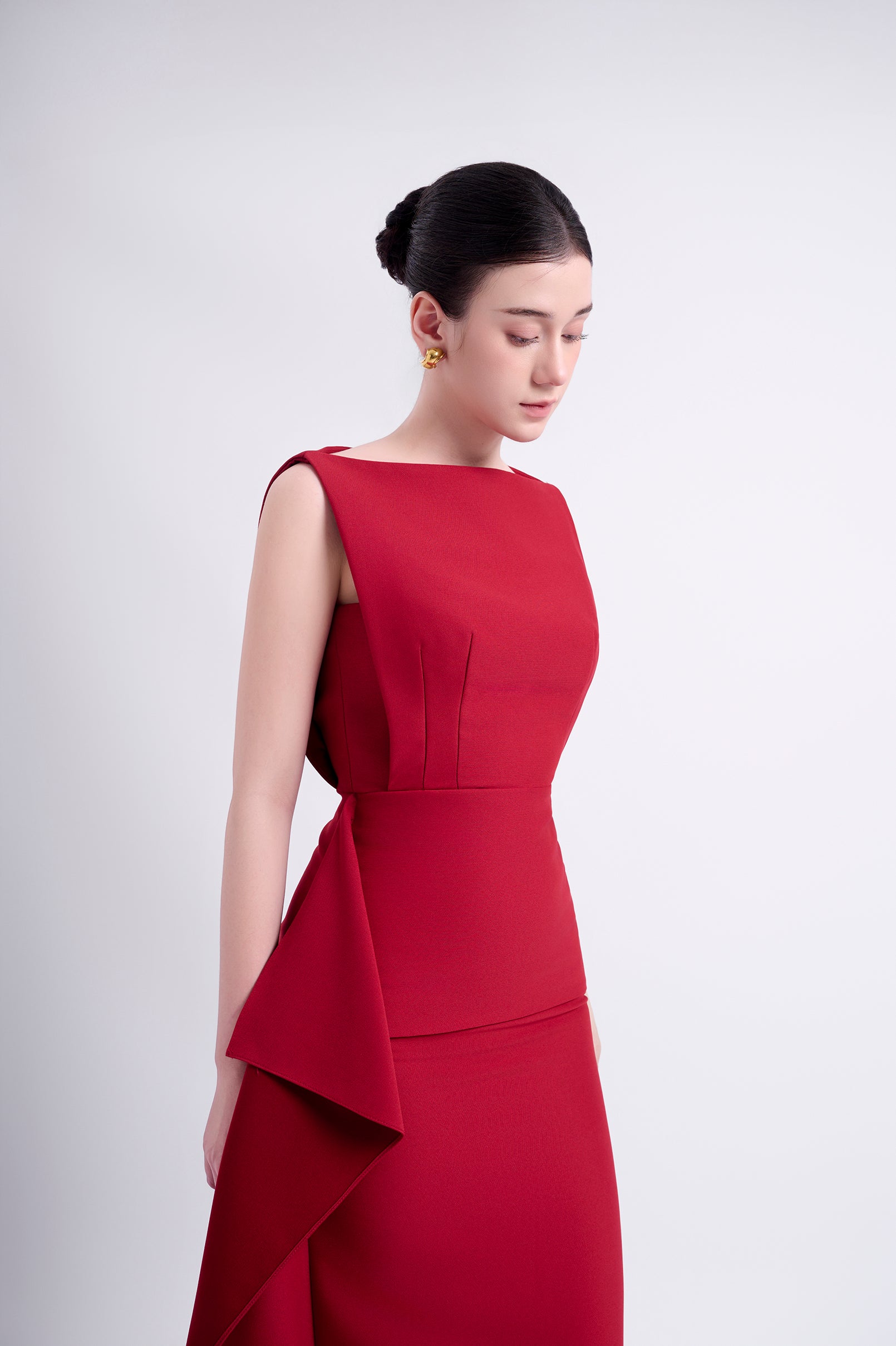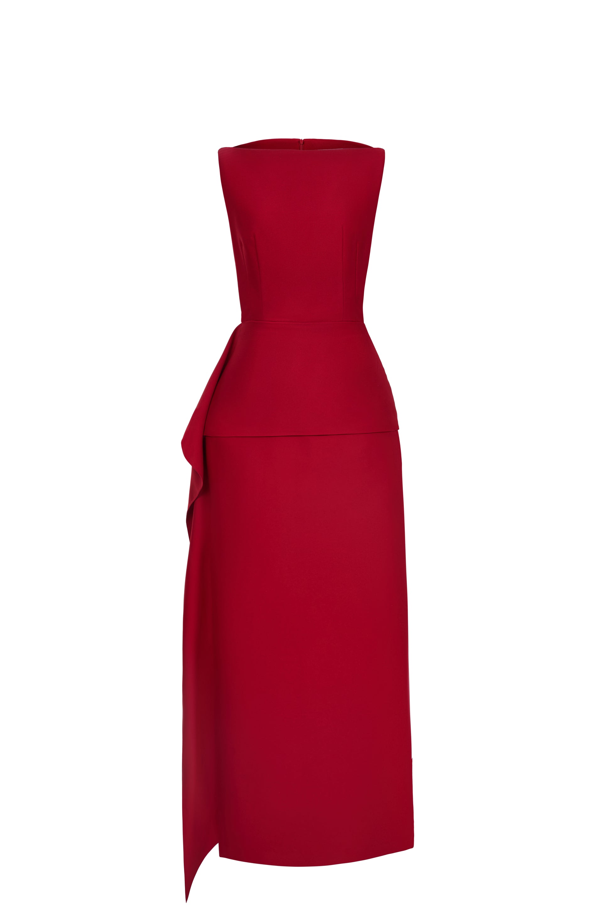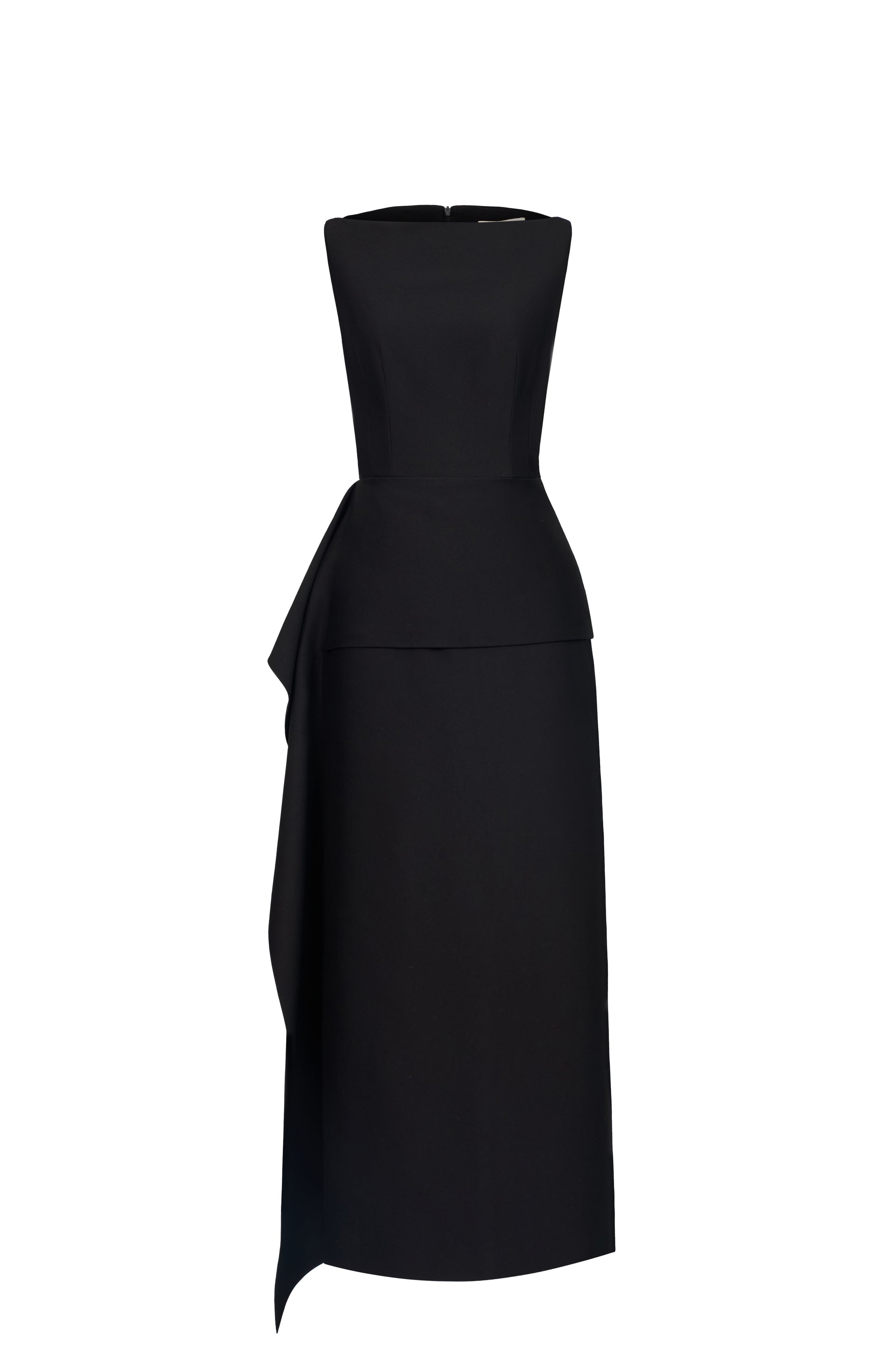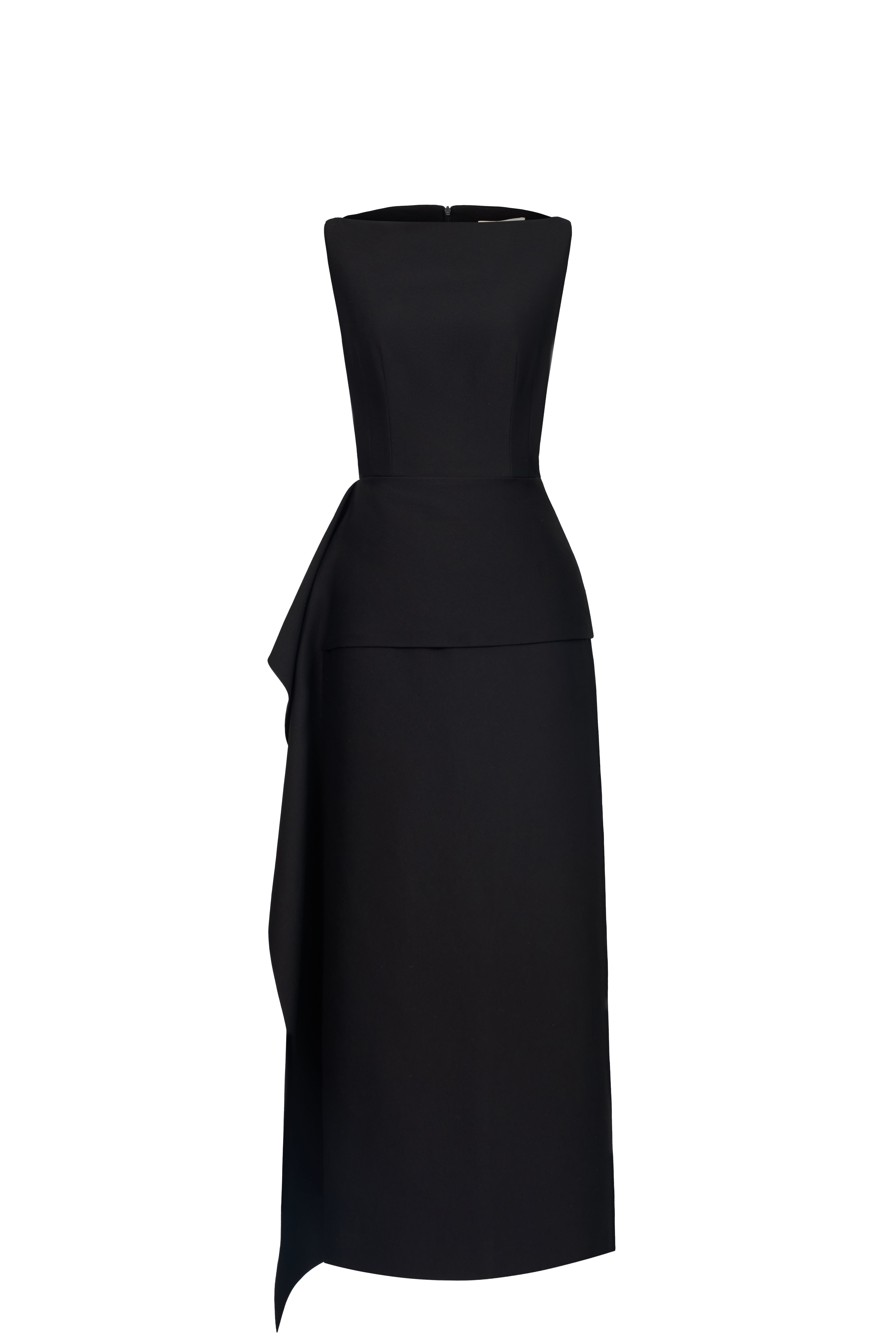 Halter-neck dress with a fitted waist and straight-cut skirt. Sleeveless, fully lined, and secured with a back zipper. A delicate overlay drapes around the waist, adding a flowing touch that subtly conceals the midsection.