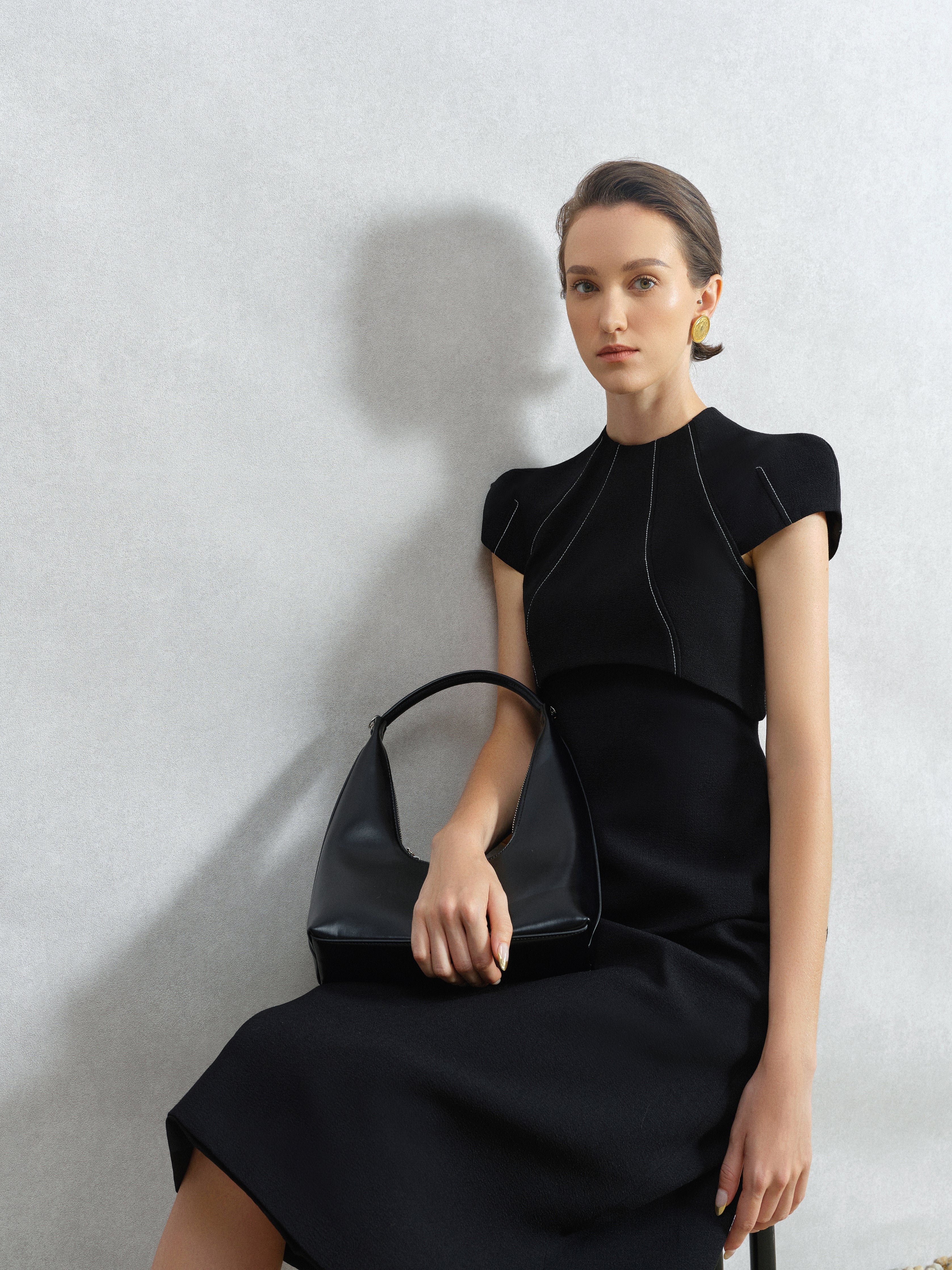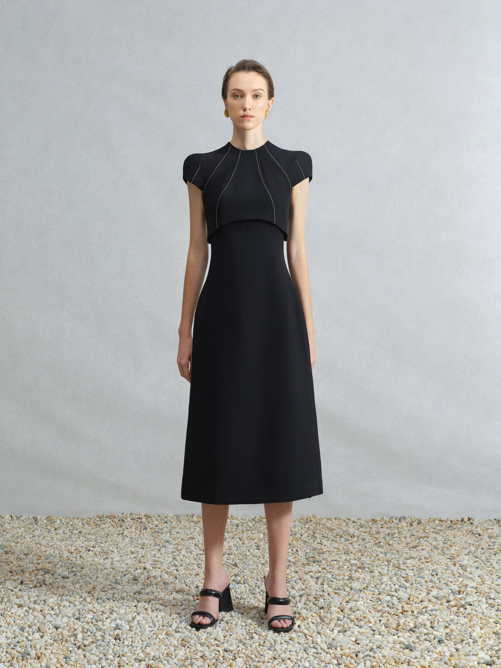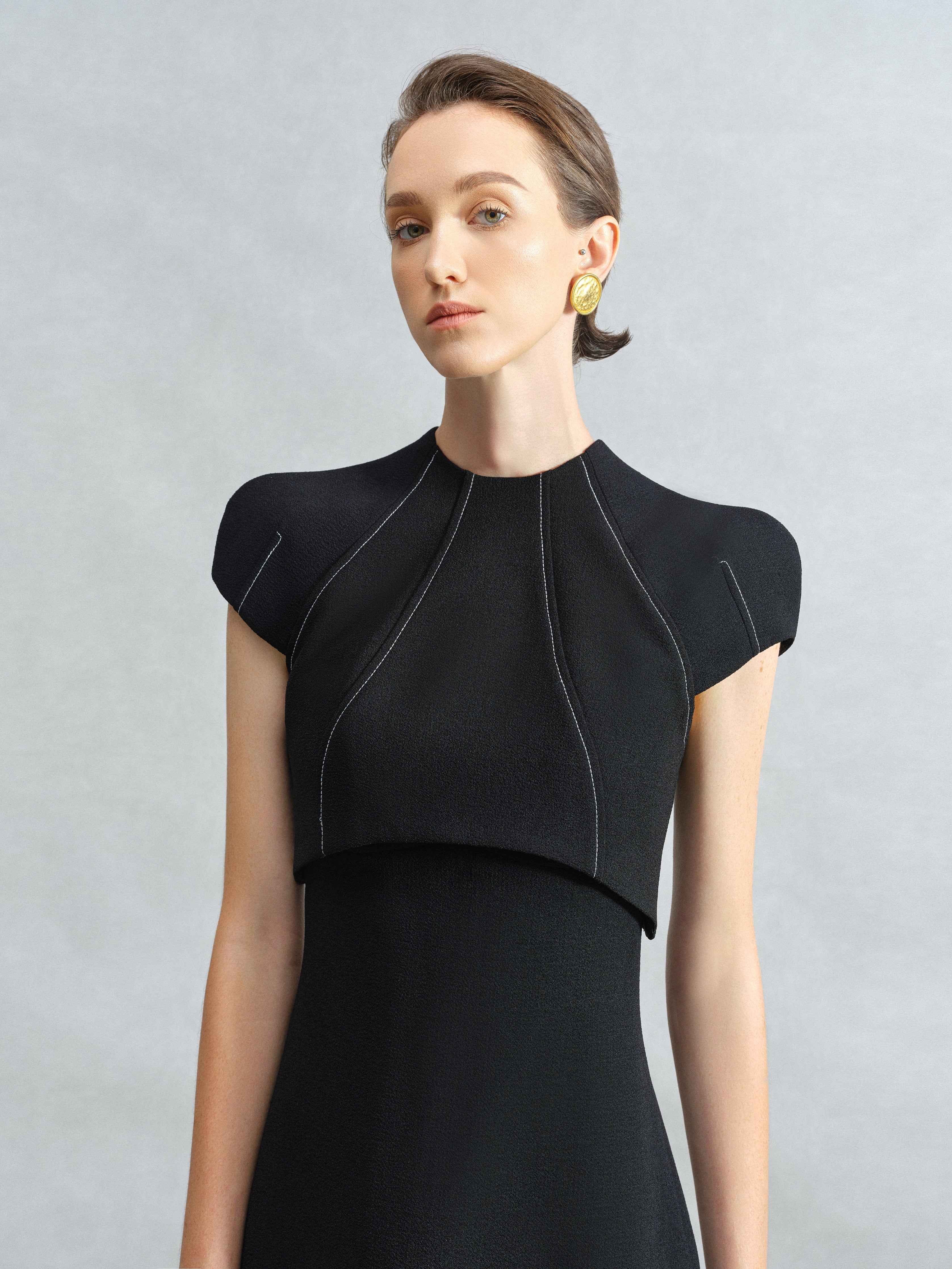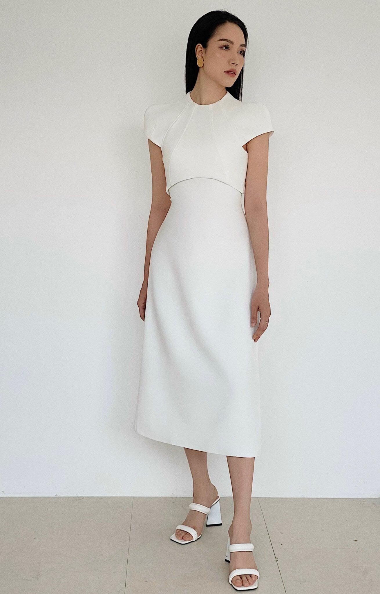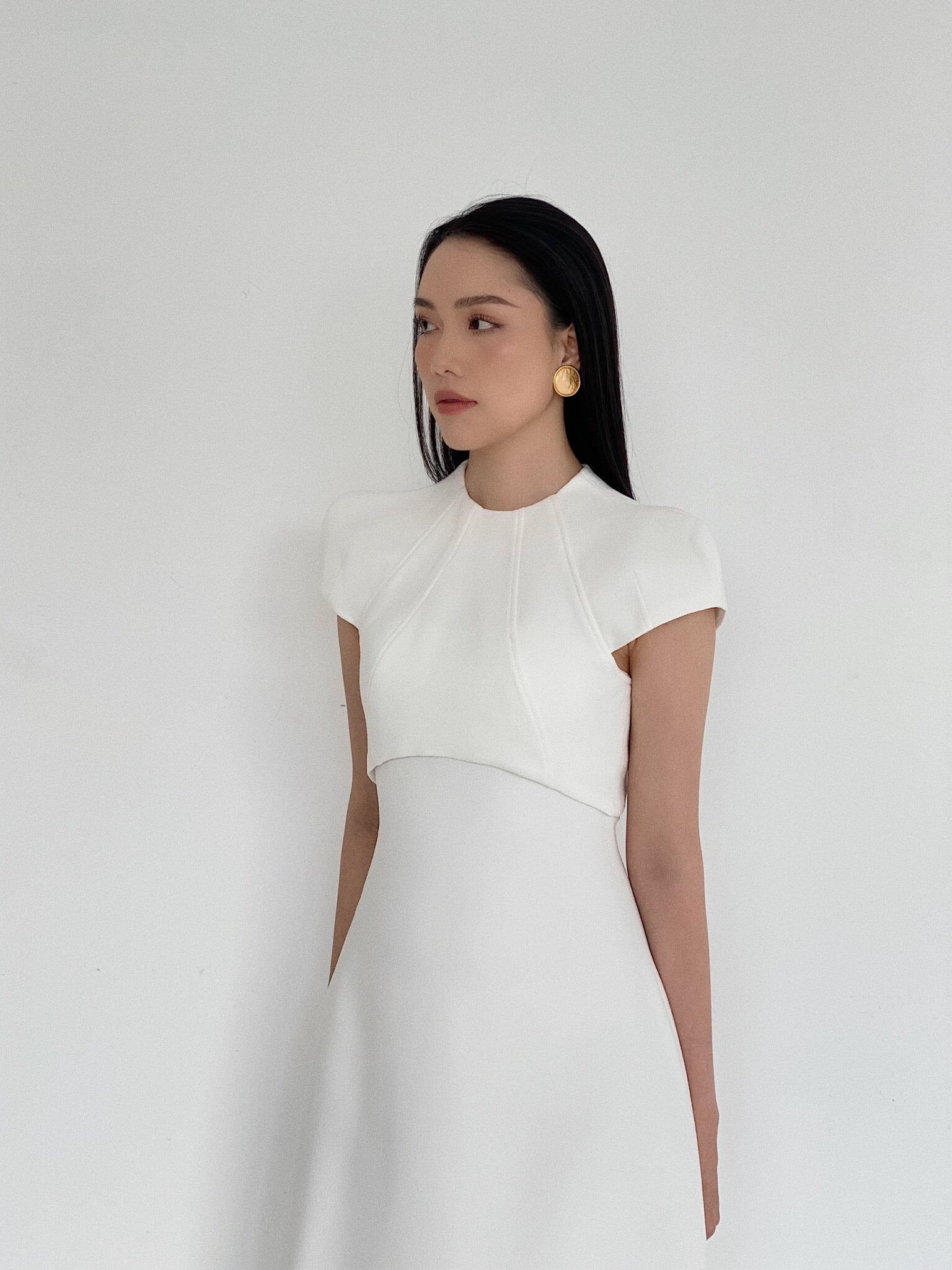 Straight lower body dress with bow-shaped puff shoulder crop top. White thread lines on the upper body of the top. Straight 2-string dress below. Dress with lining and back zipper. Β  Β