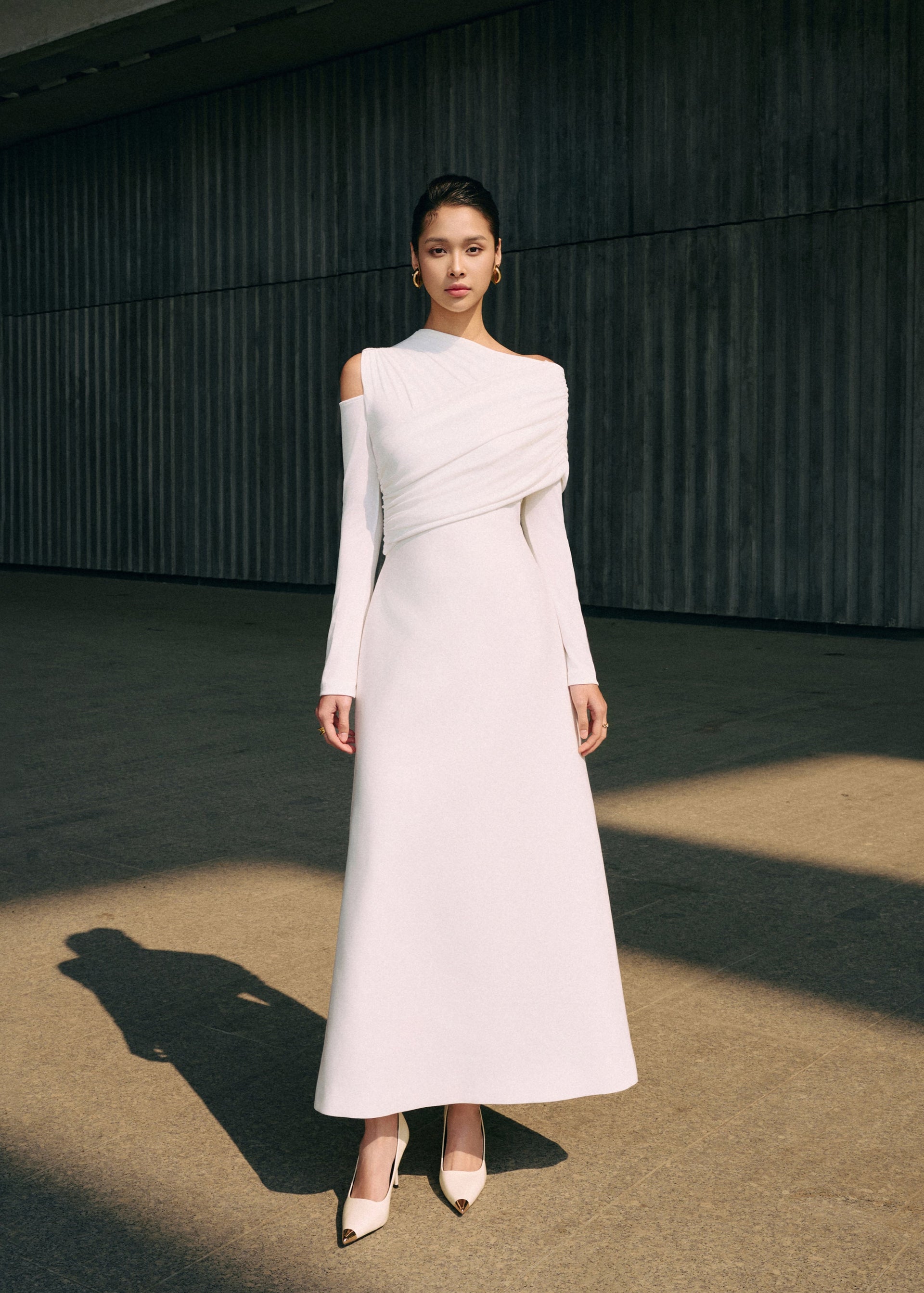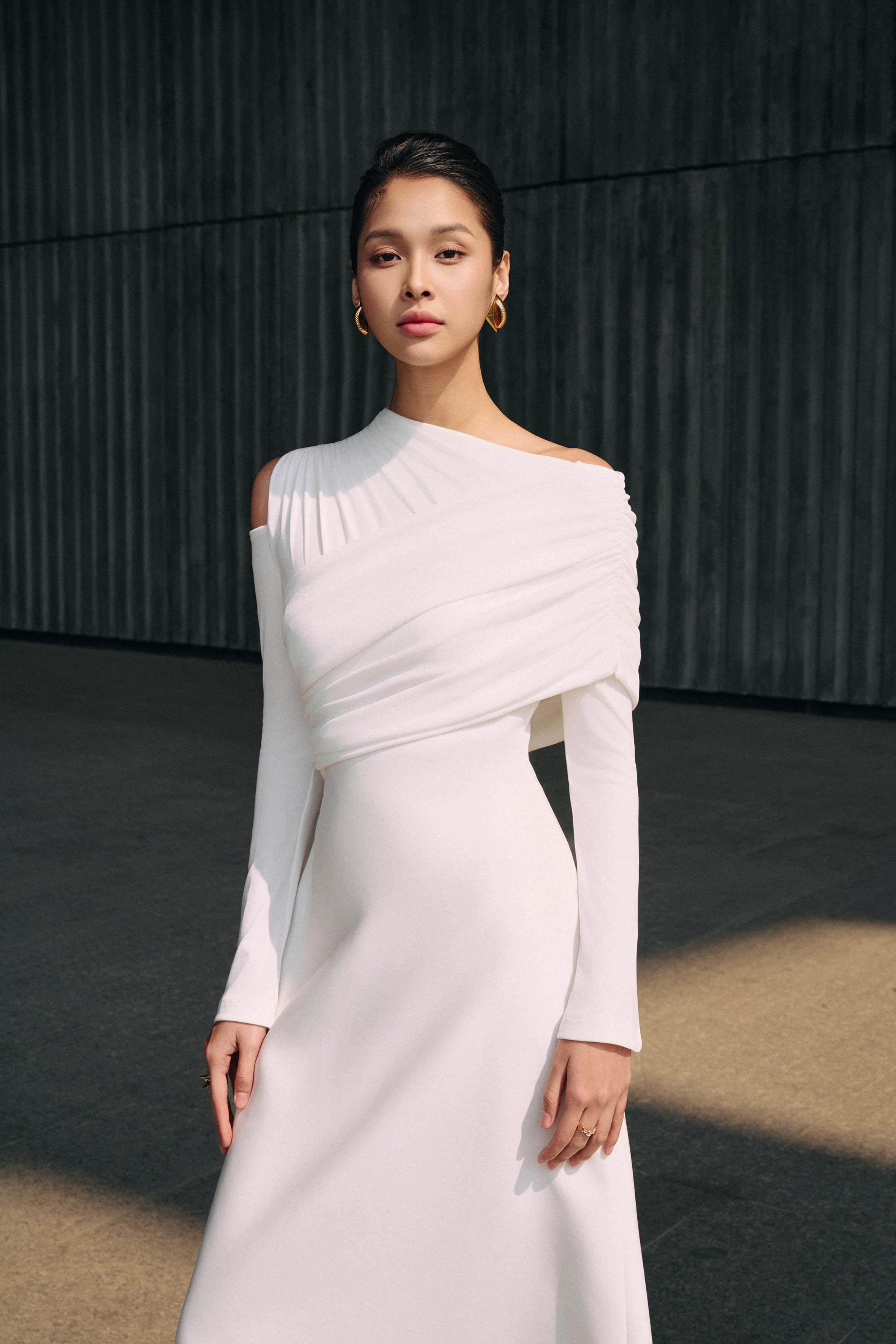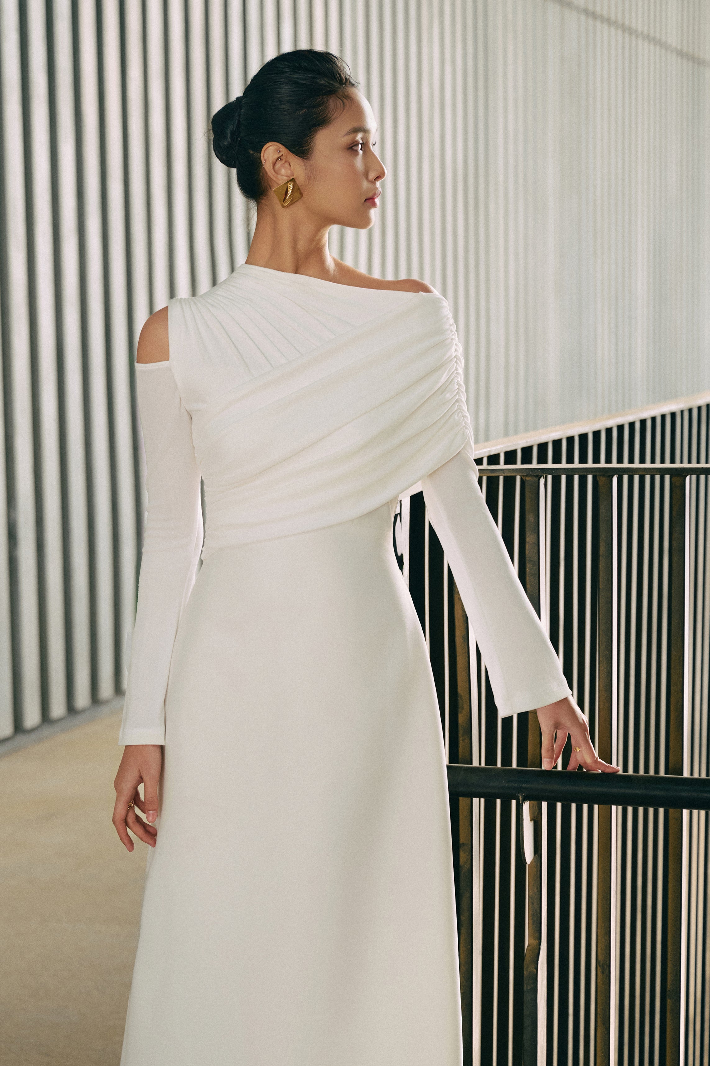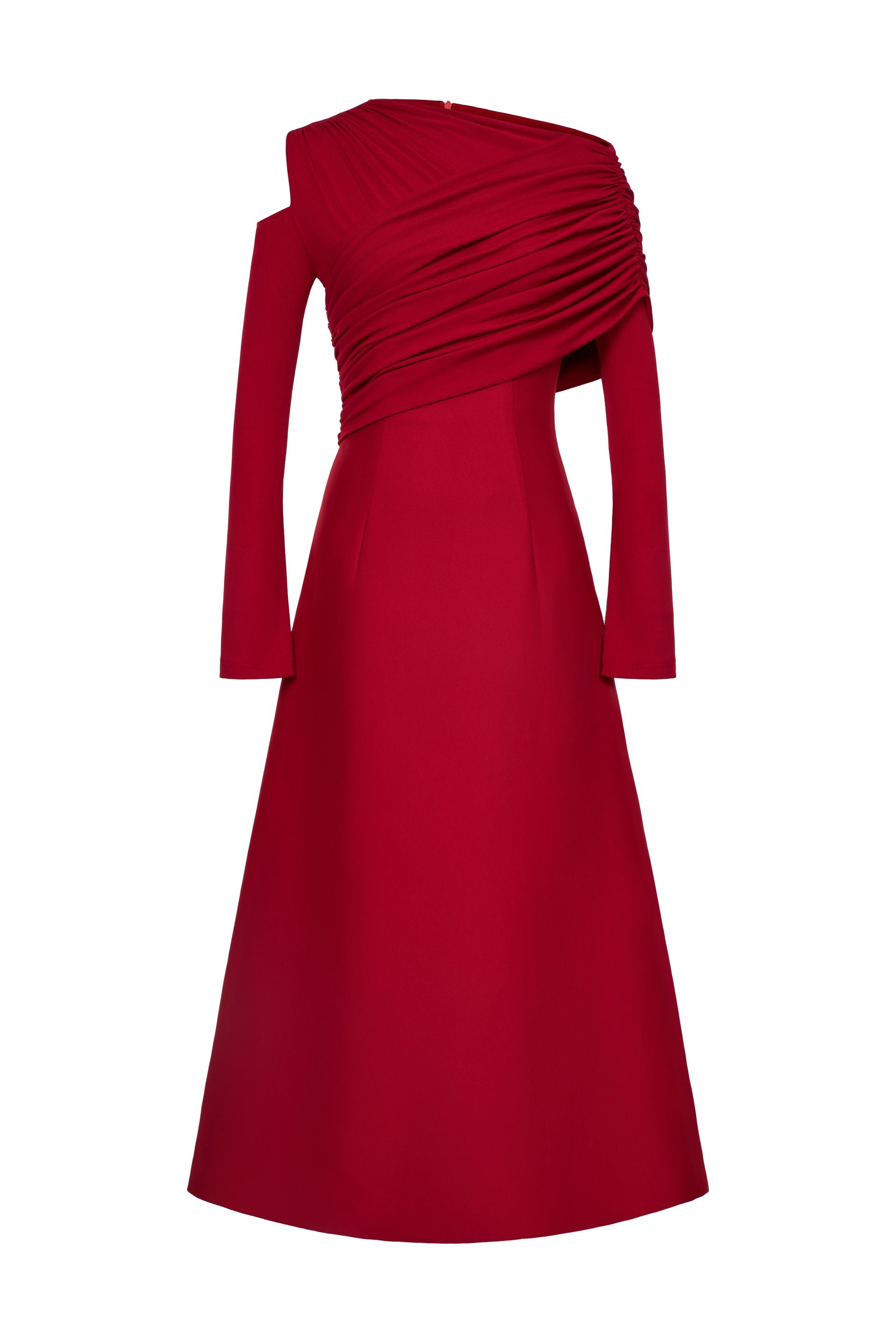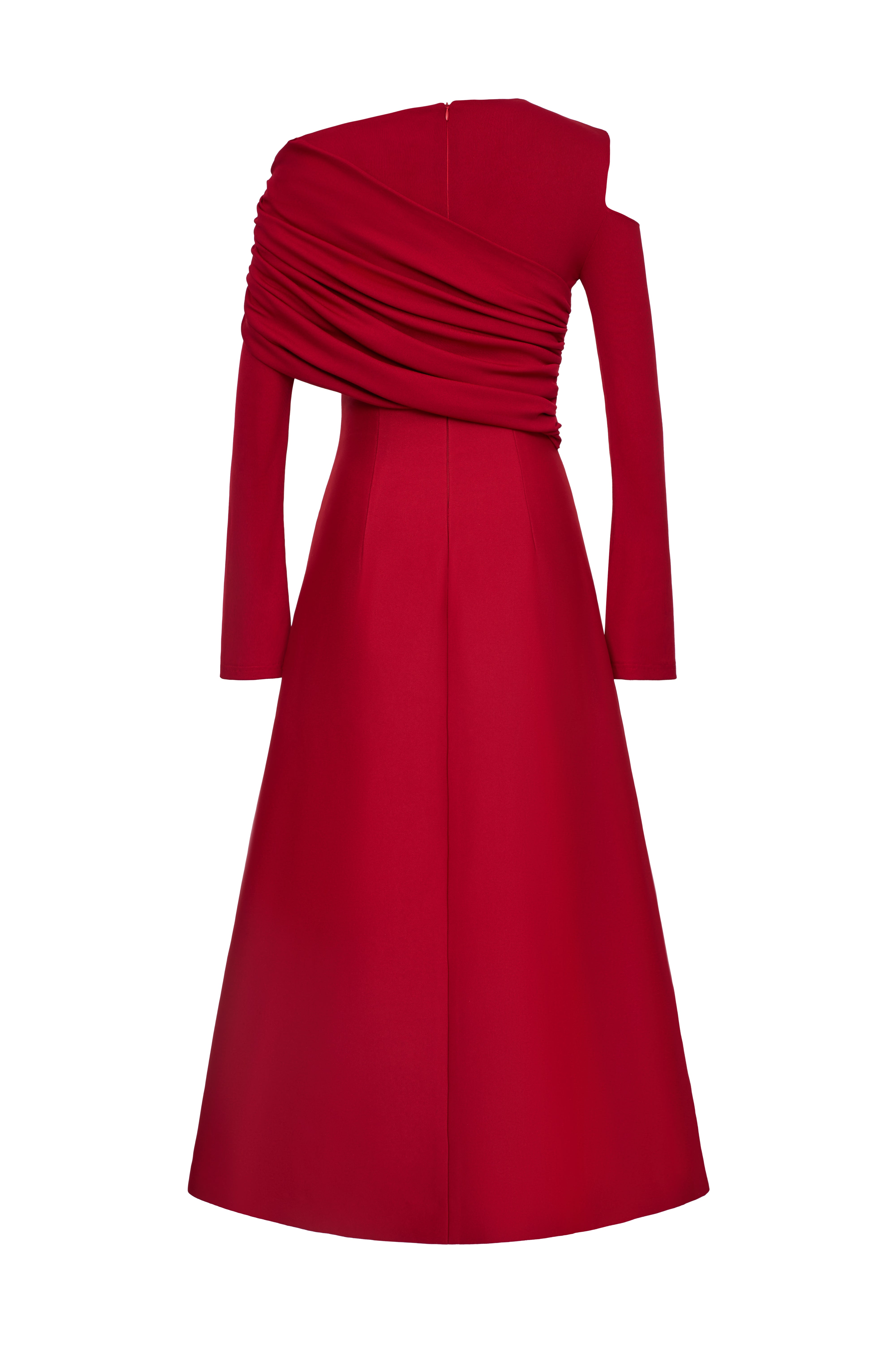 Long-sleeve midi dress with a fitted waist and flared A-line skirt. Double-layered with a back zipper. The upper part is crafted from stretch fabric, featuring an asymmetrical sleeve with soft ruching for a draped effect.