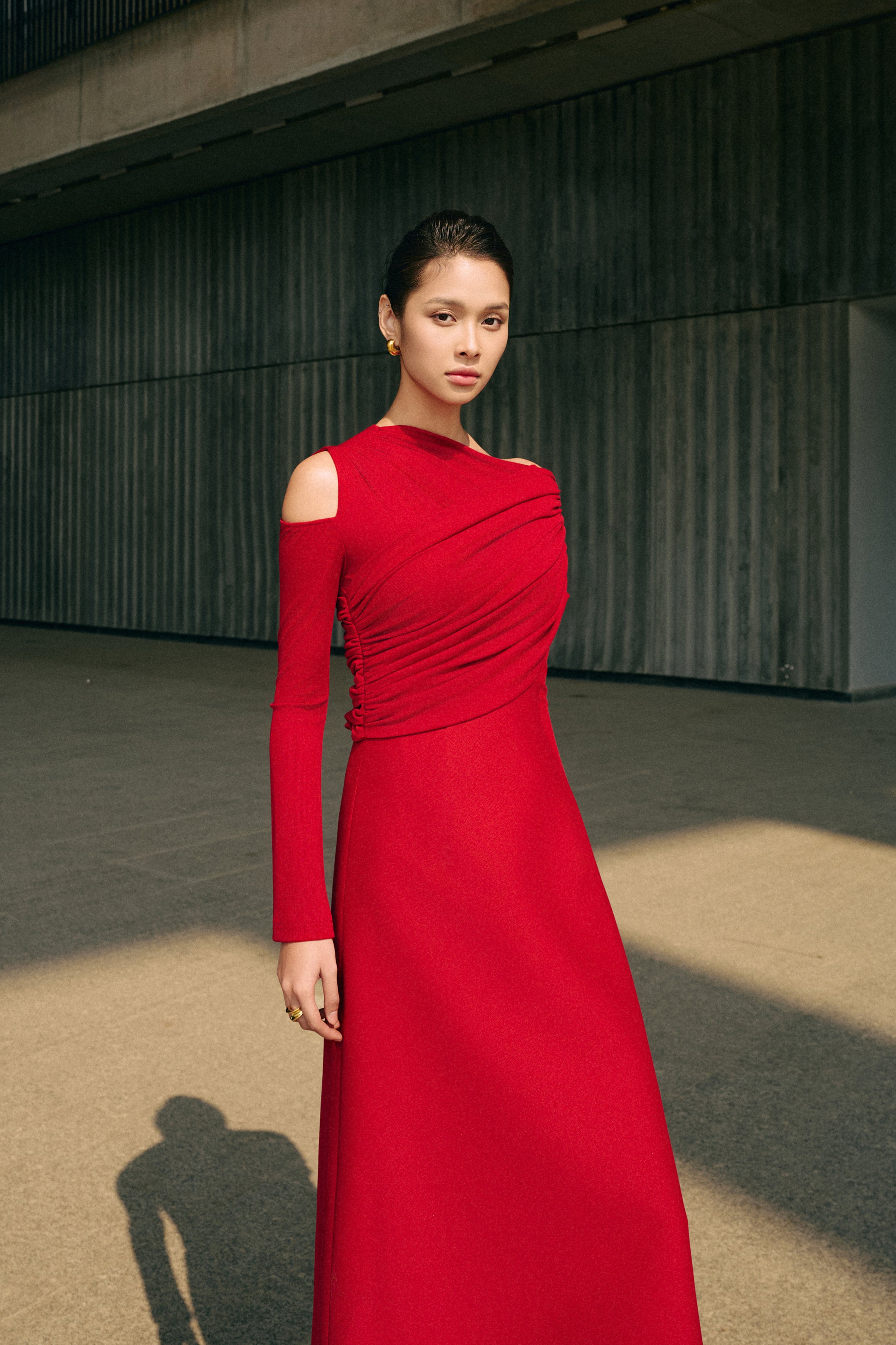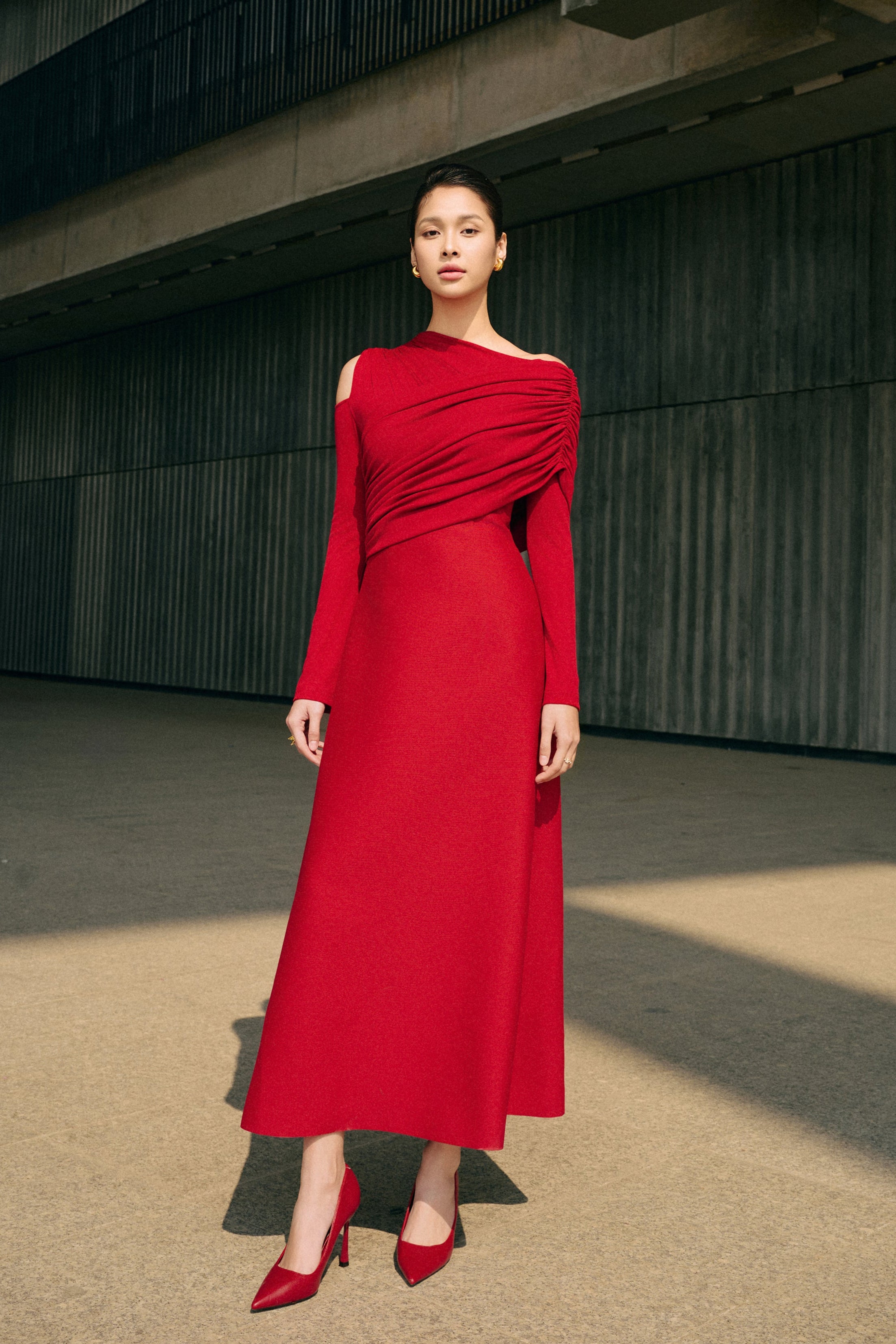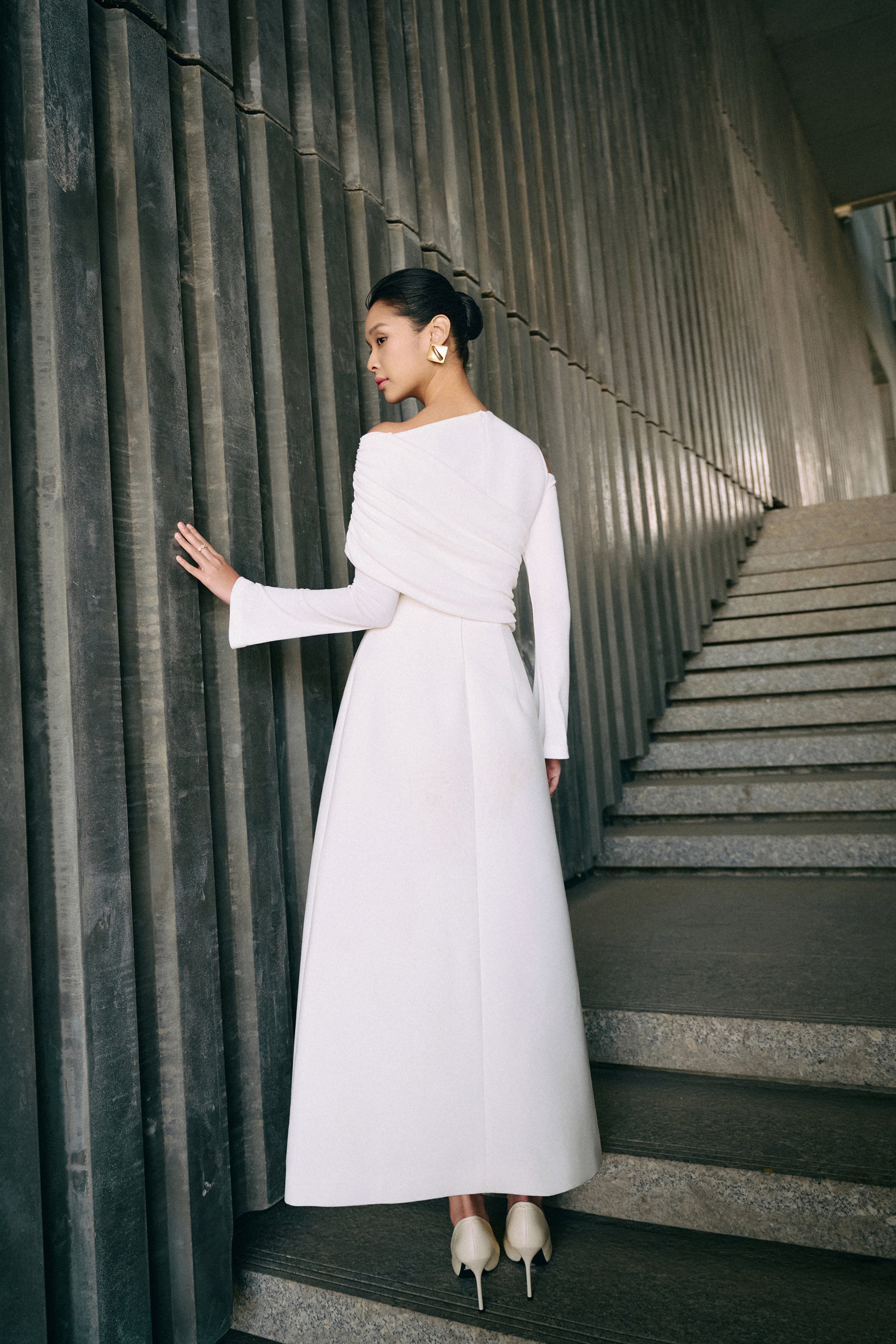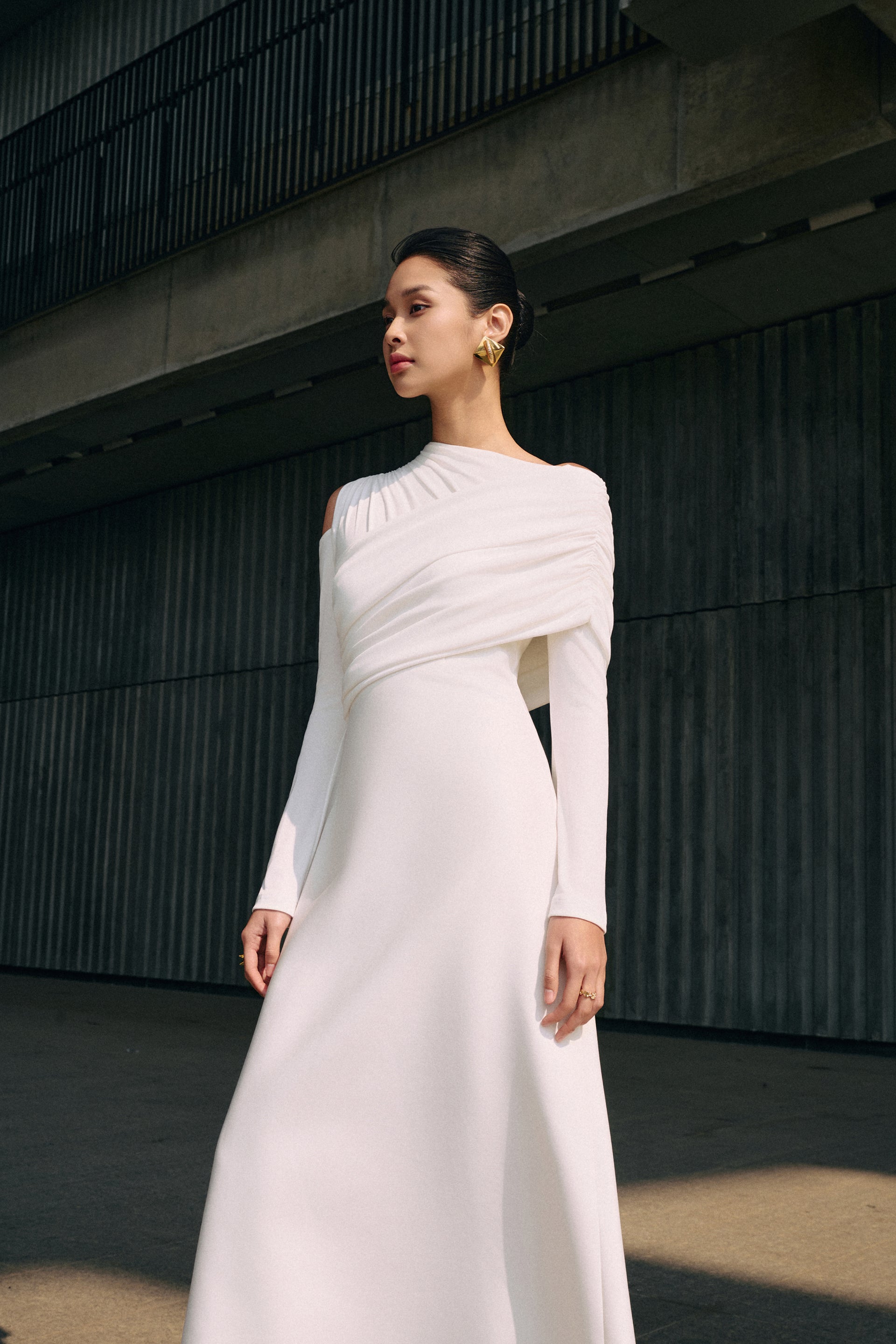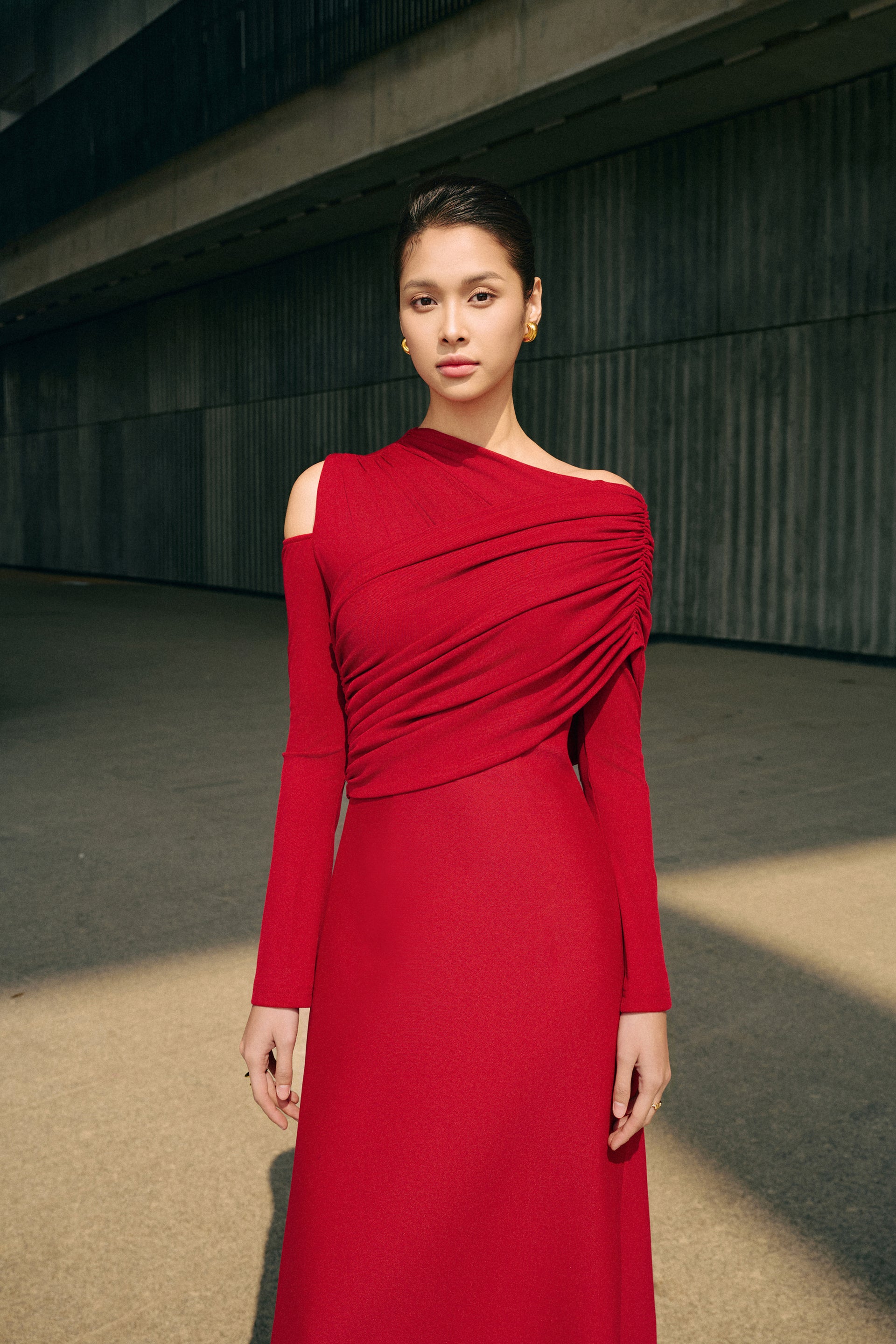 Long-sleeve midi dress with a fitted waist and flared A-line skirt. Double-layered with a back zipper. The upper part is crafted from stretch fabric, featuring an asymmetrical sleeve with soft ruching for a draped effect.