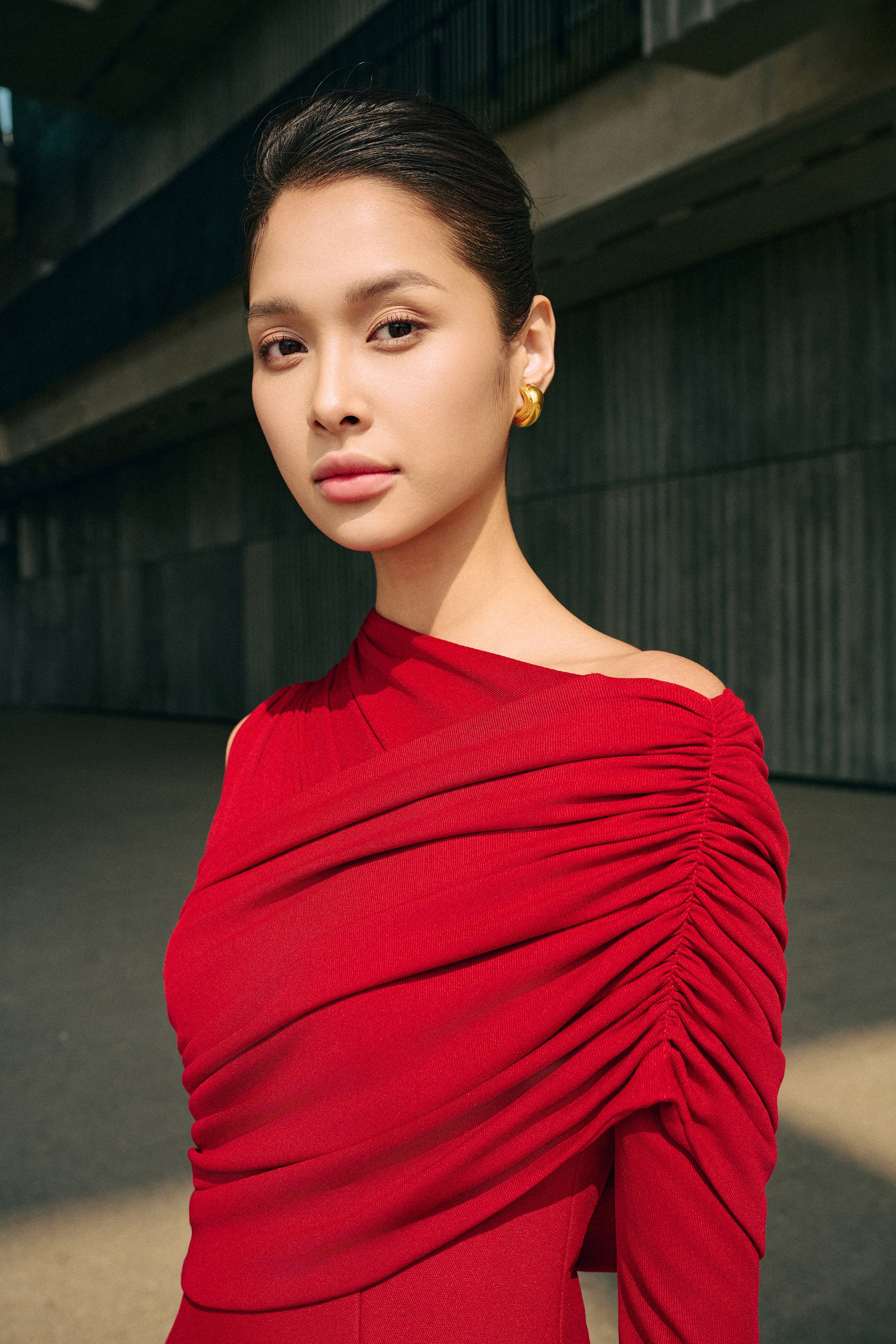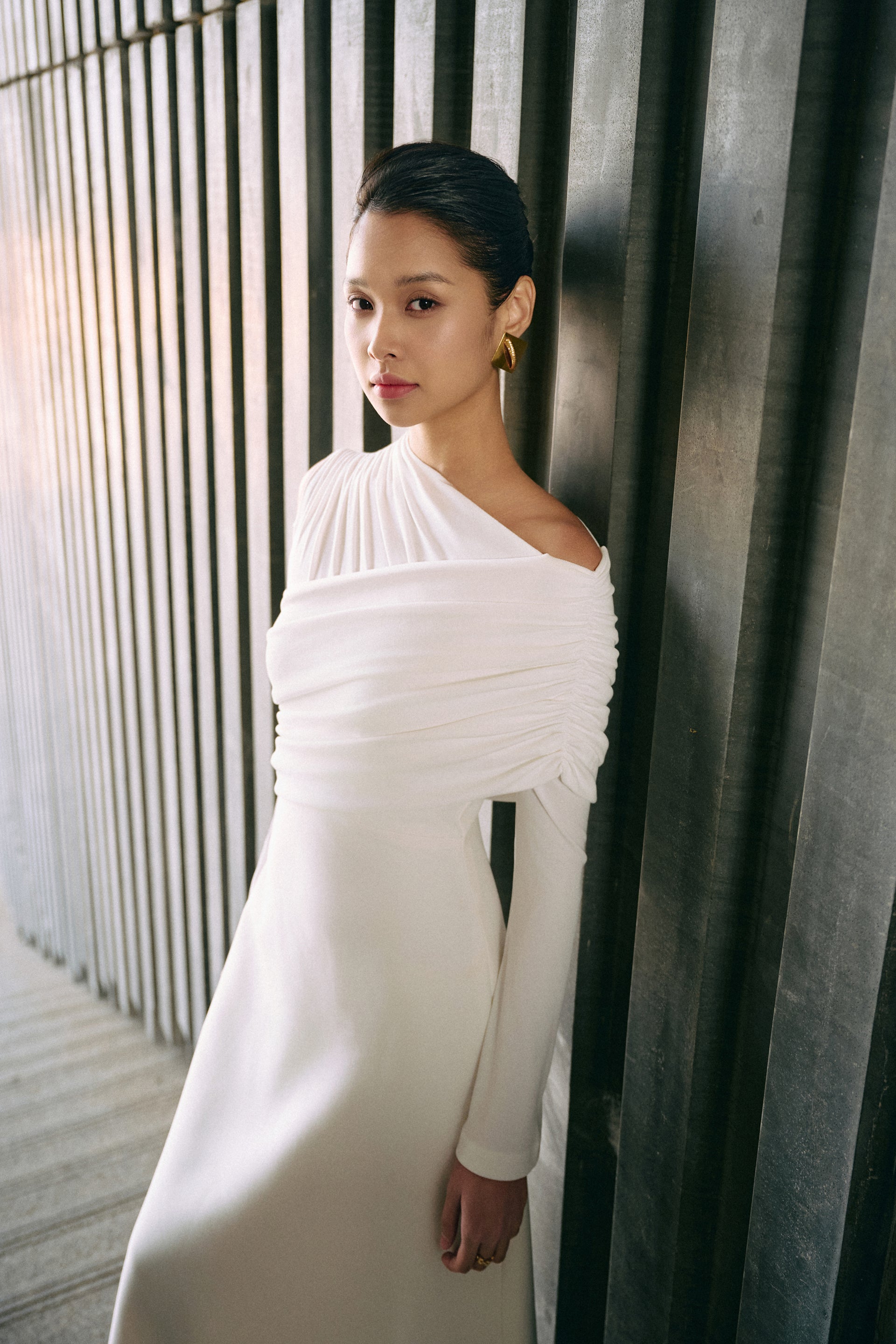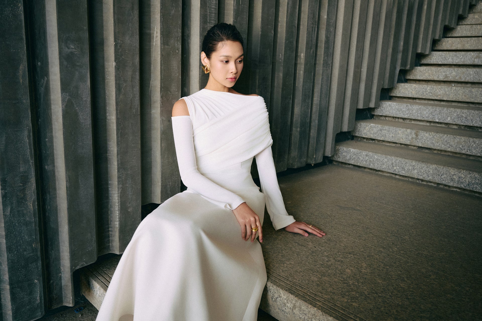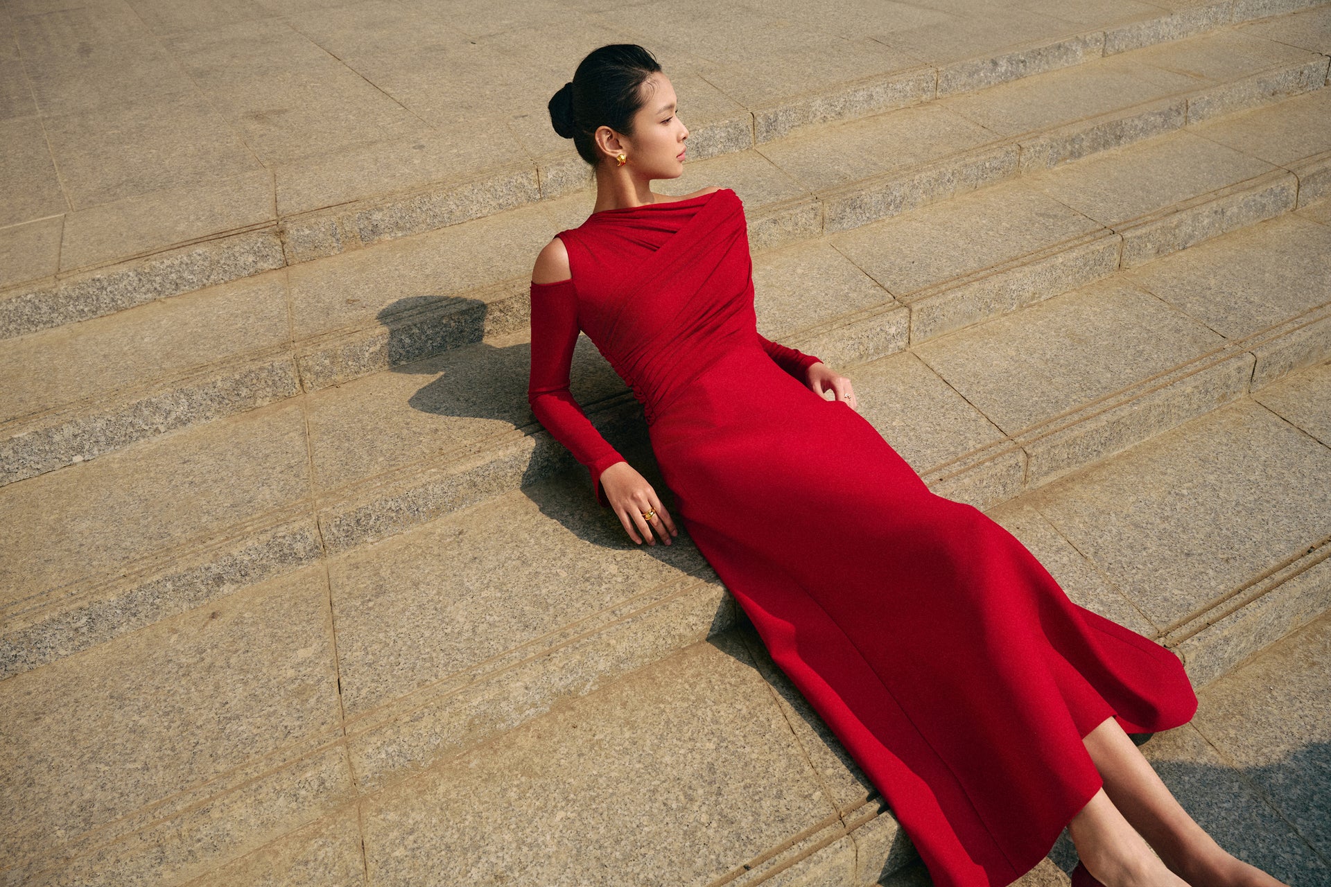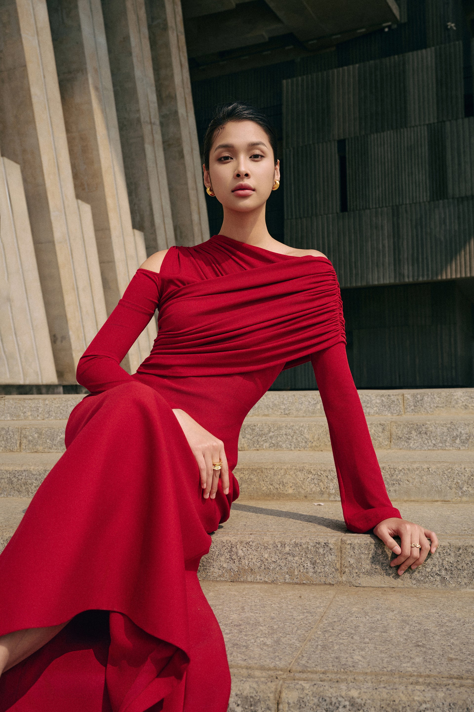 Long-sleeve midi dress with a fitted waist and flared A-line skirt. Double-layered with a back zipper. The upper part is crafted from stretch fabric, featuring an asymmetrical sleeve with soft ruching for a draped effect.