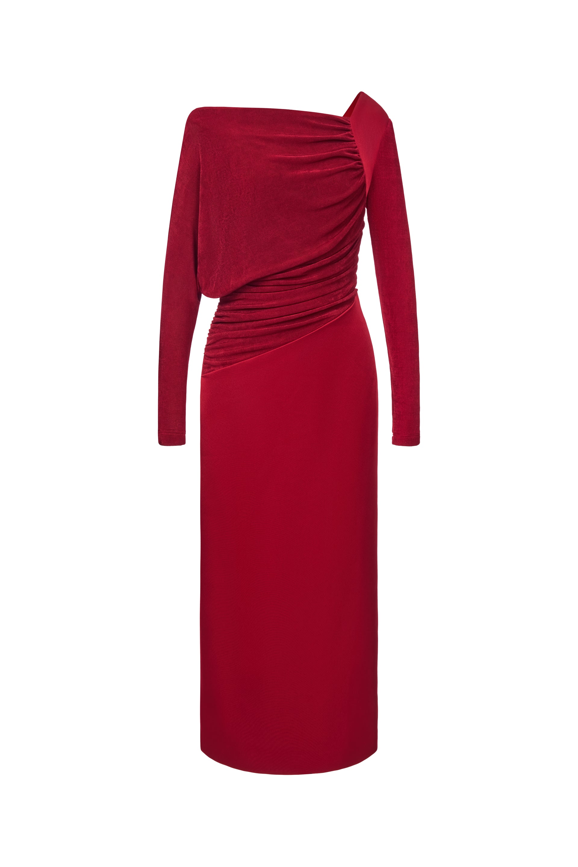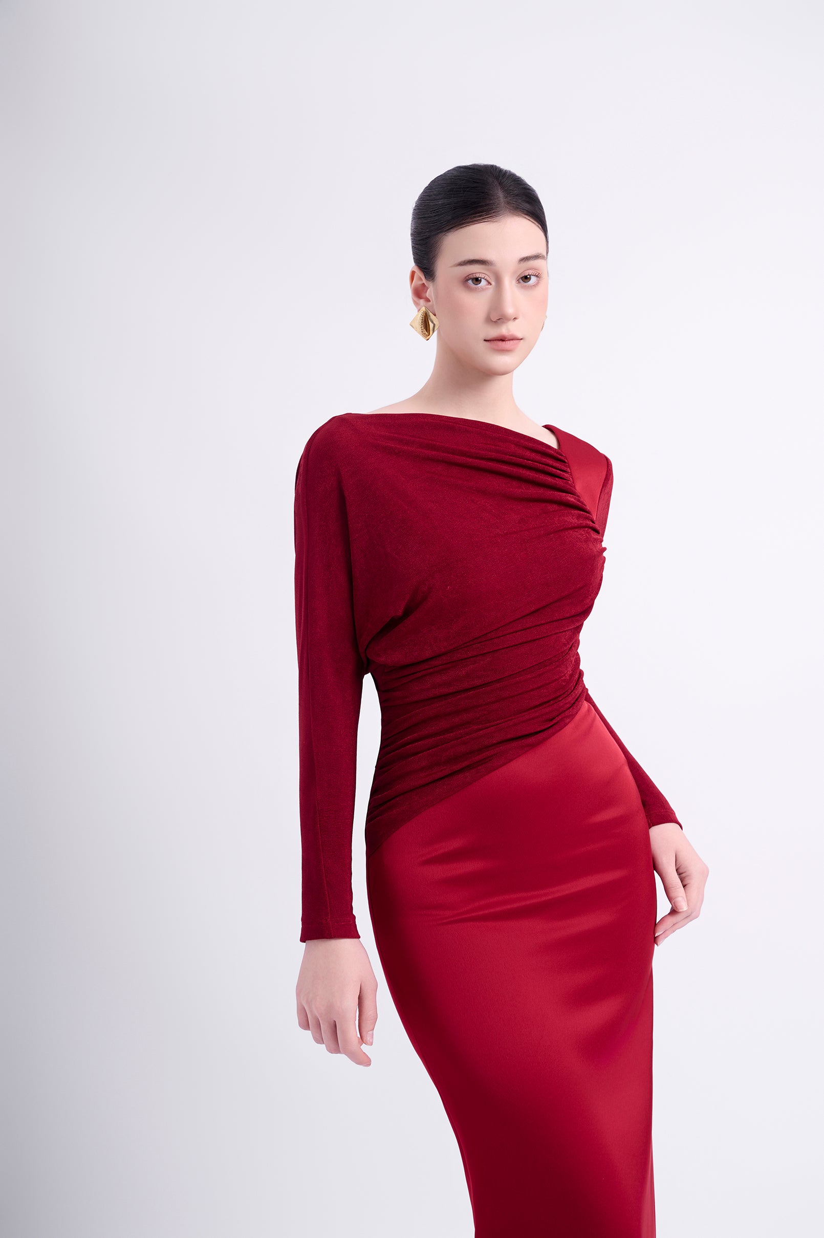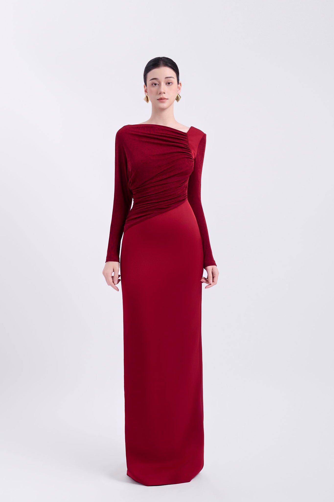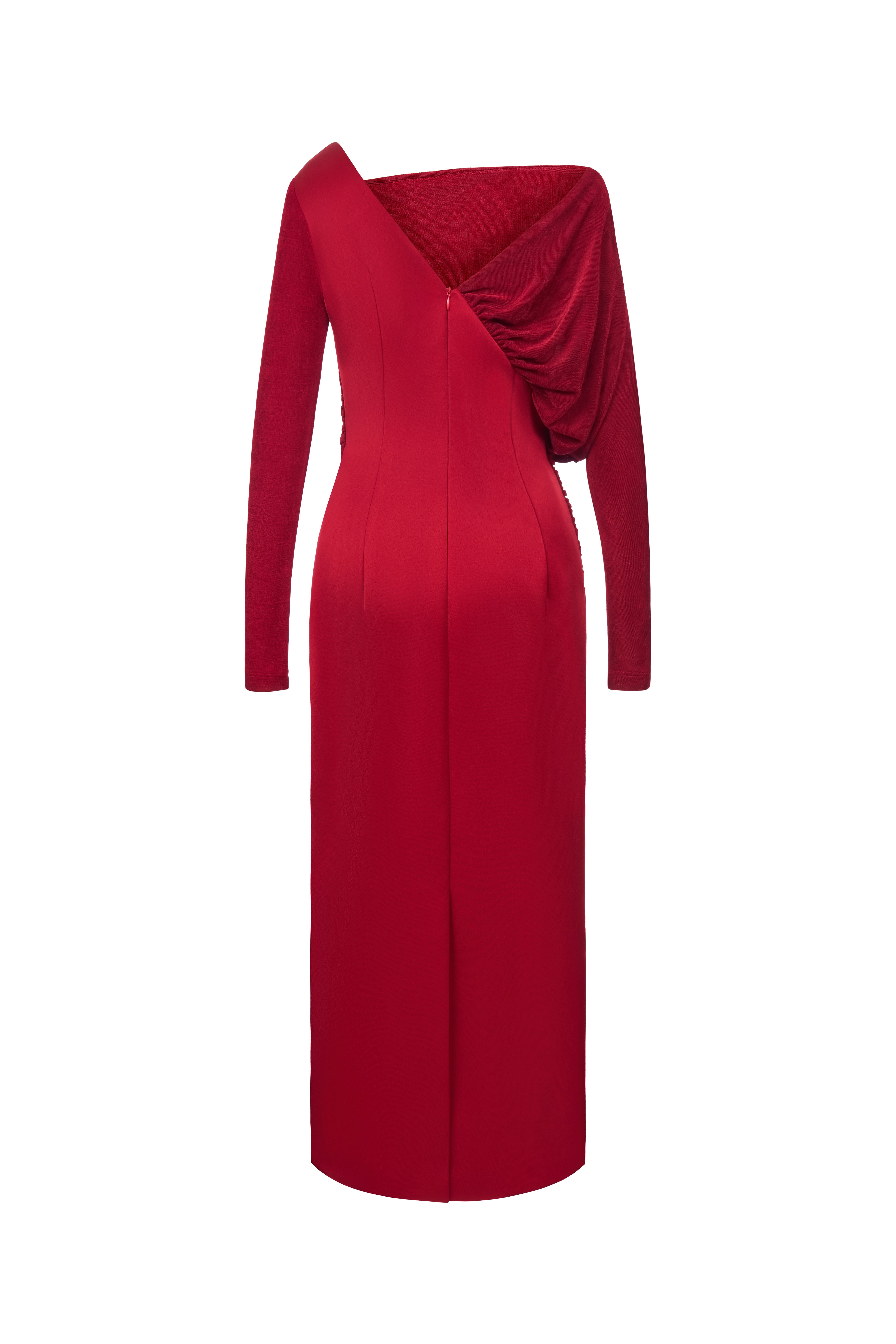 Long sleeve dress features a two-layer design with a back zip closure. The stretchy bodice has an asymmetrical sleeve adorned with delicate ruching for a natural drape. The straight-cut skirt hugs the waist for a flattering silhouette, while the back includes a stylish slit.