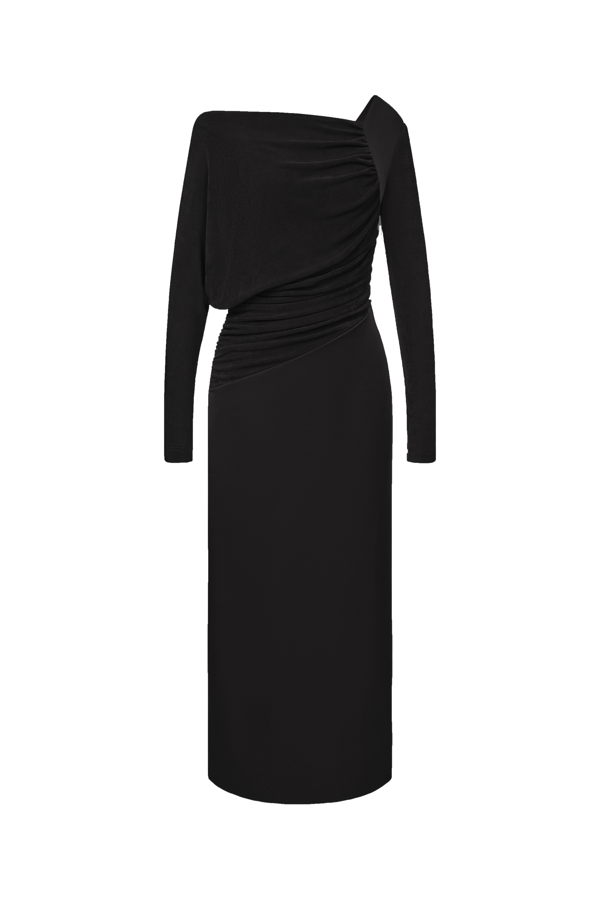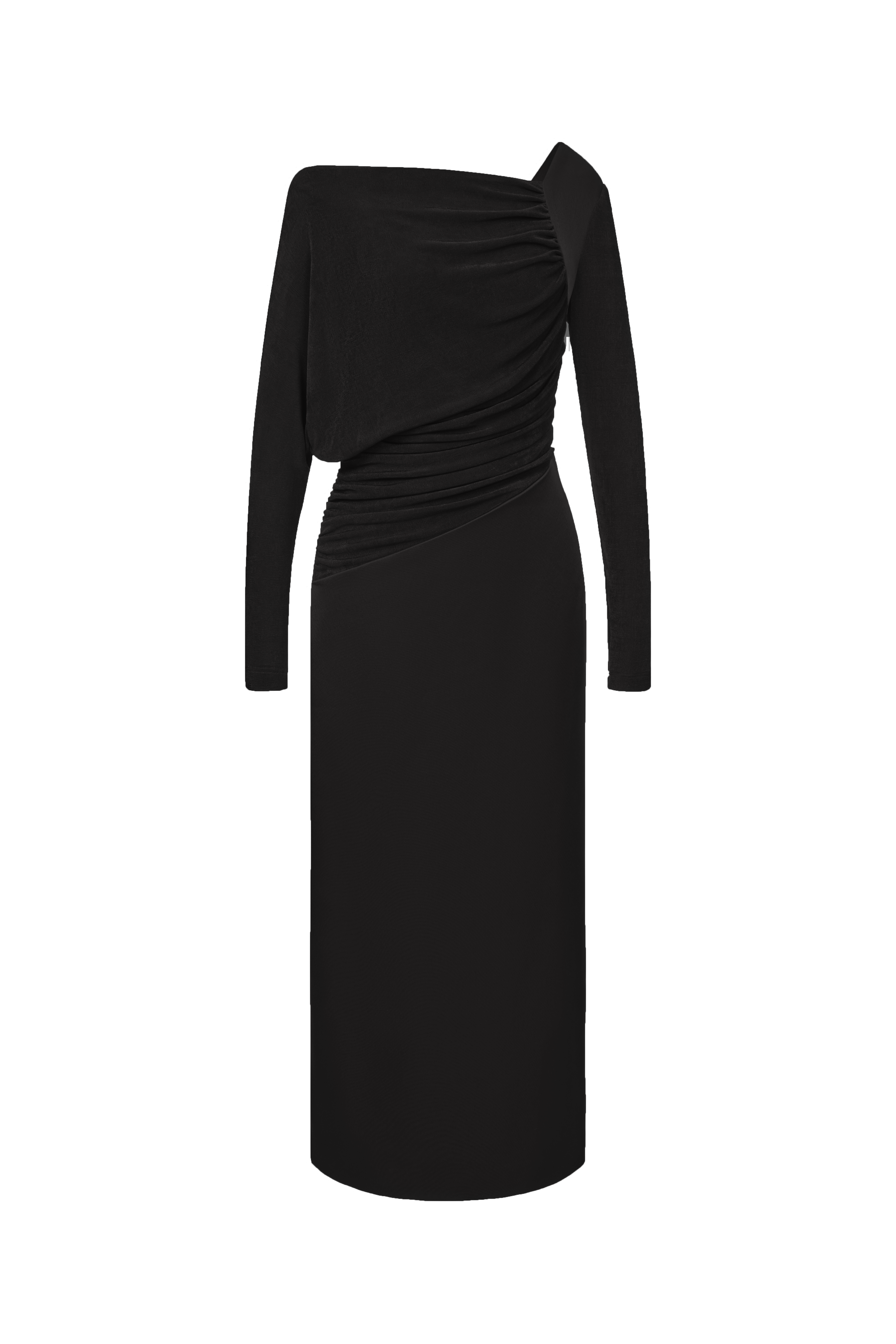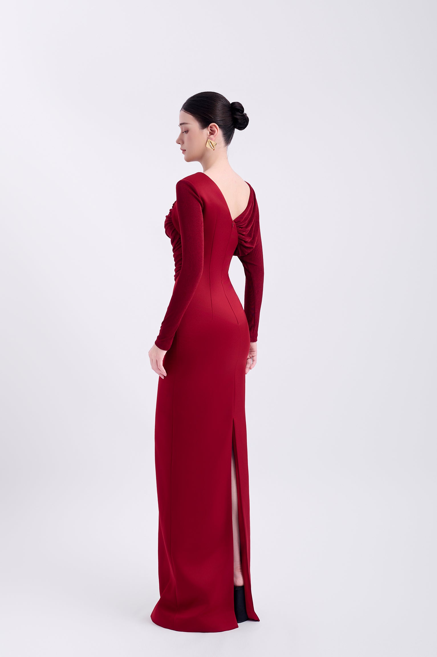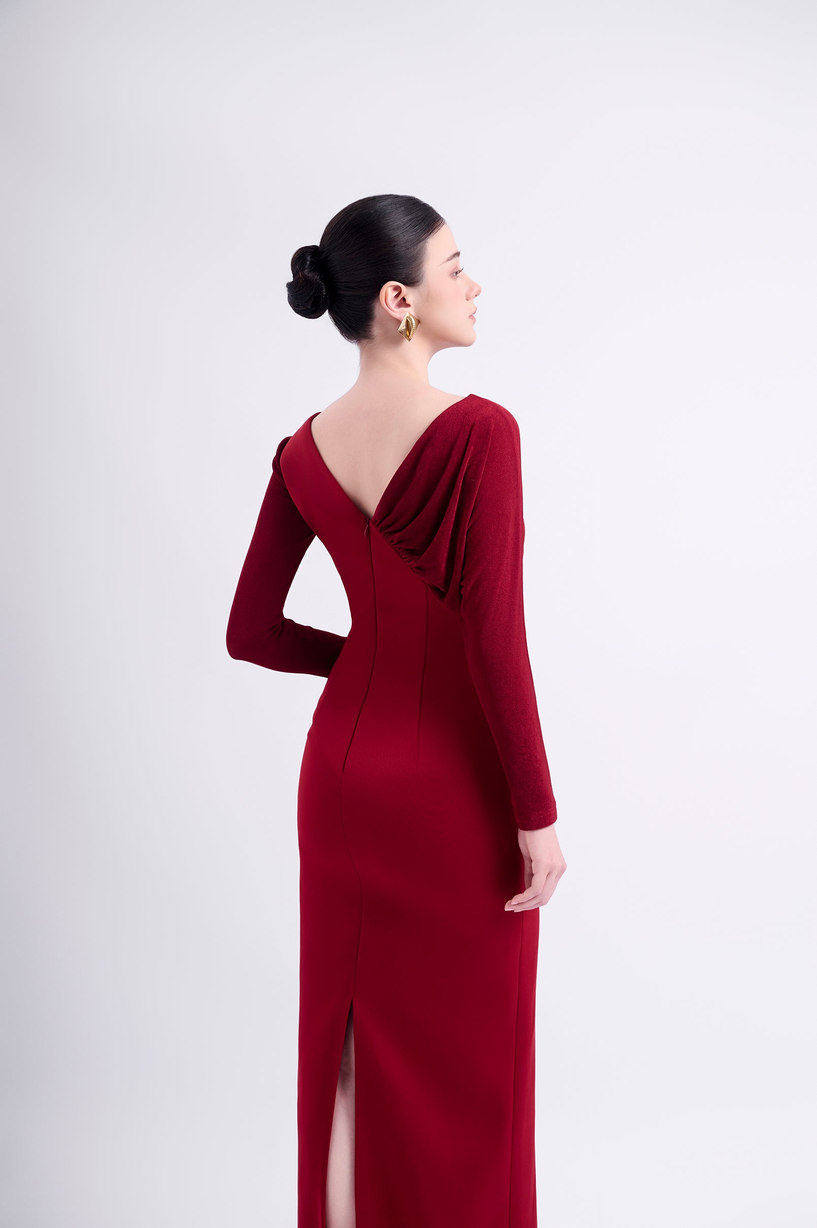 Long sleeve dress features a two-layer design with a back zip closure. The stretchy bodice has an asymmetrical sleeve adorned with delicate ruching for a natural drape. The straight-cut skirt hugs the waist for a flattering silhouette, while the back includes a stylish slit.