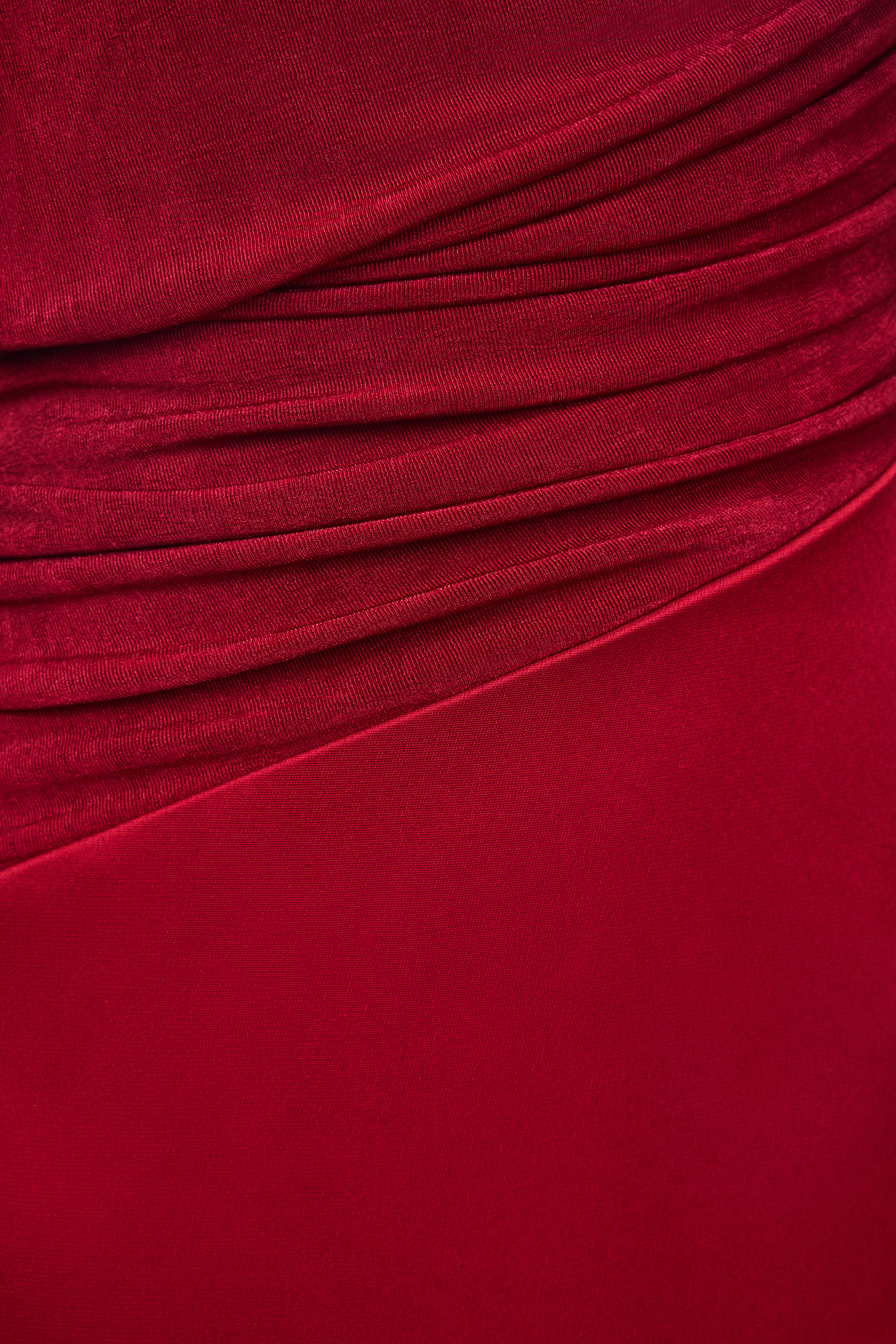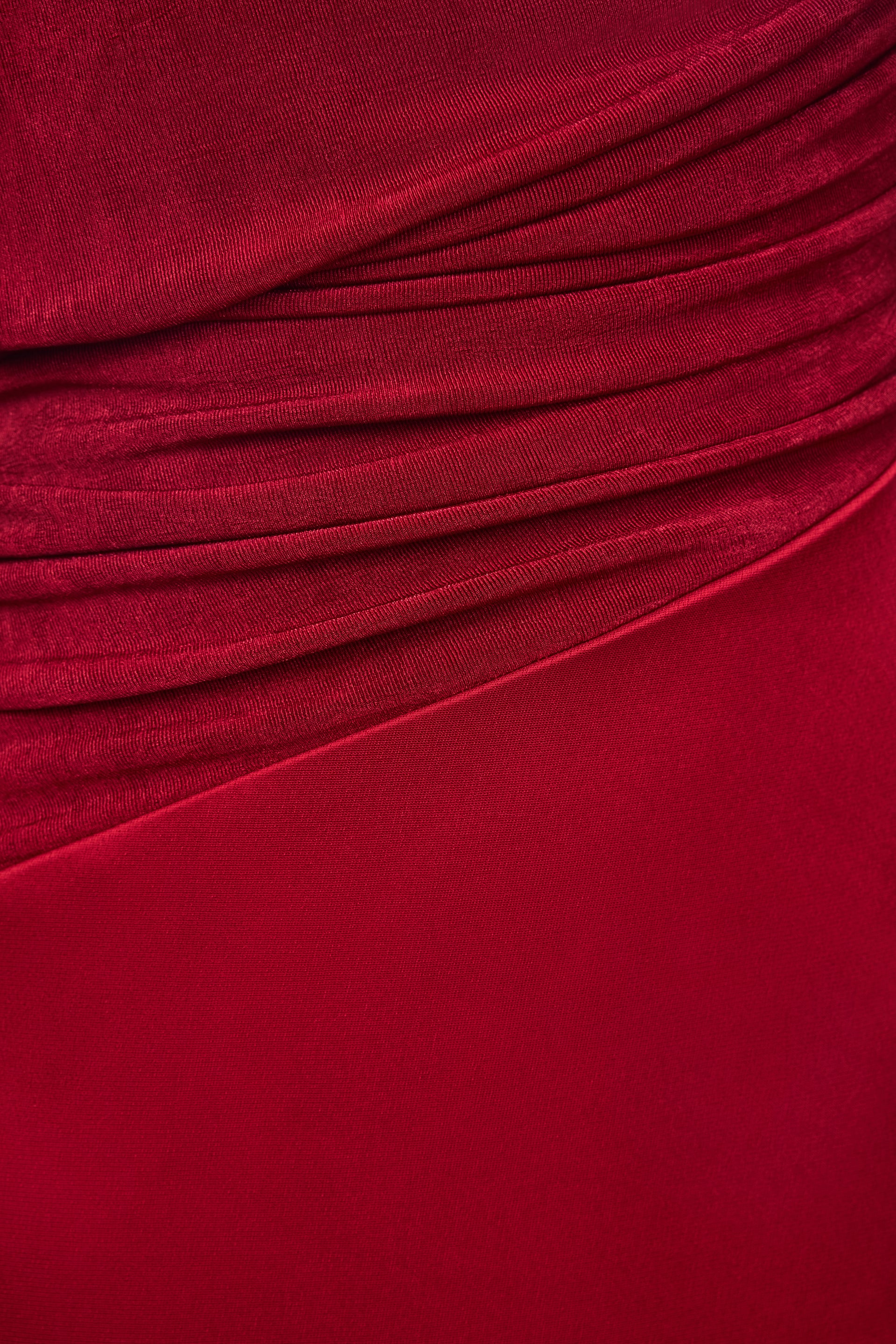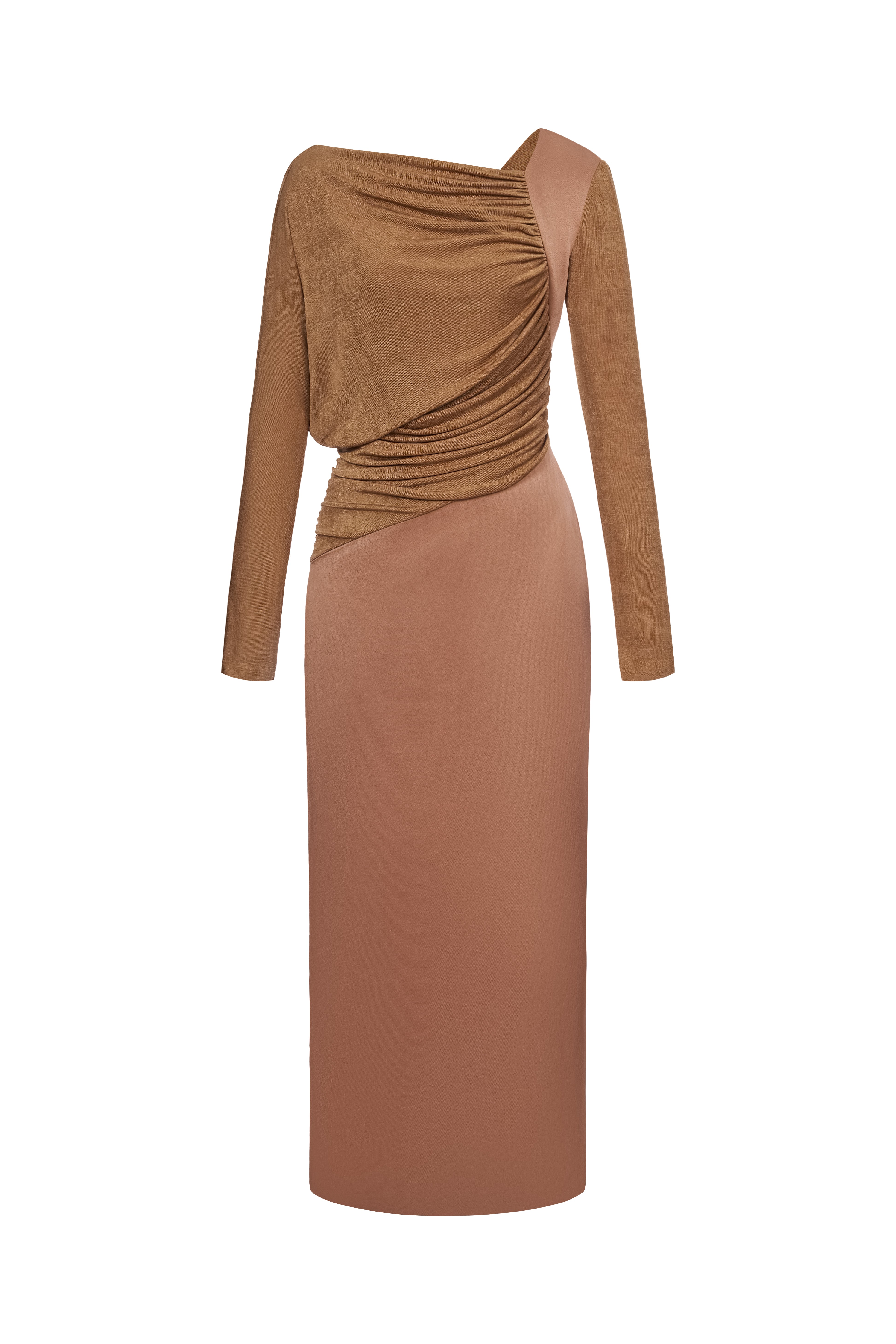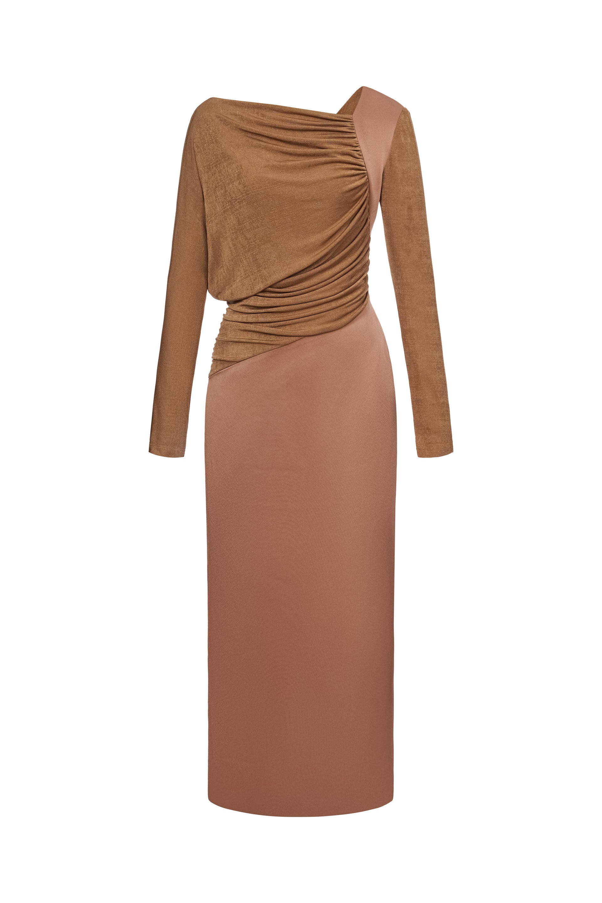 Long sleeve dress features a two-layer design with a back zip closure. The stretchy bodice has an asymmetrical sleeve adorned with delicate ruching for a natural drape. The straight-cut skirt hugs the waist for a flattering silhouette, while the back includes a stylish slit.