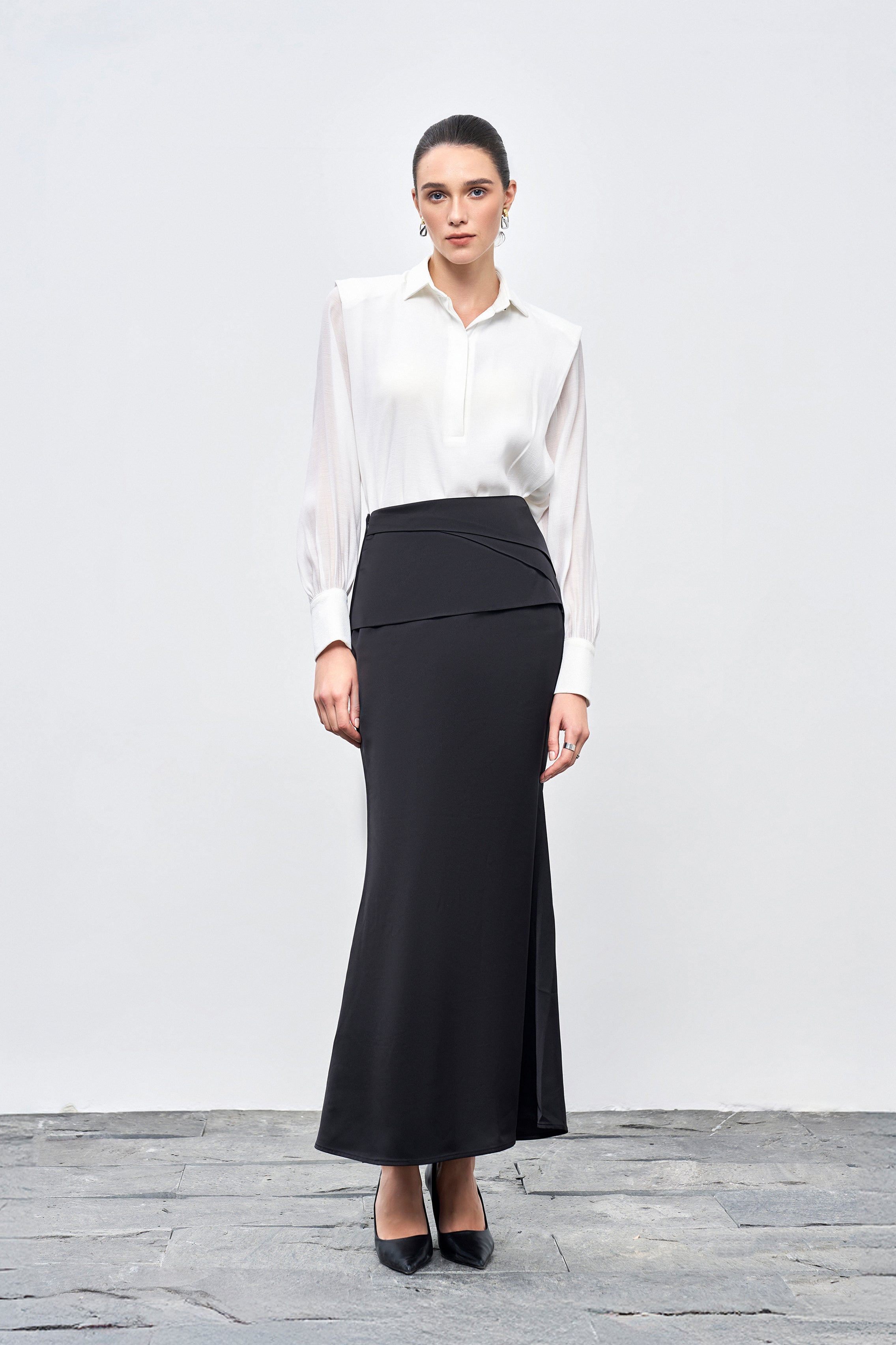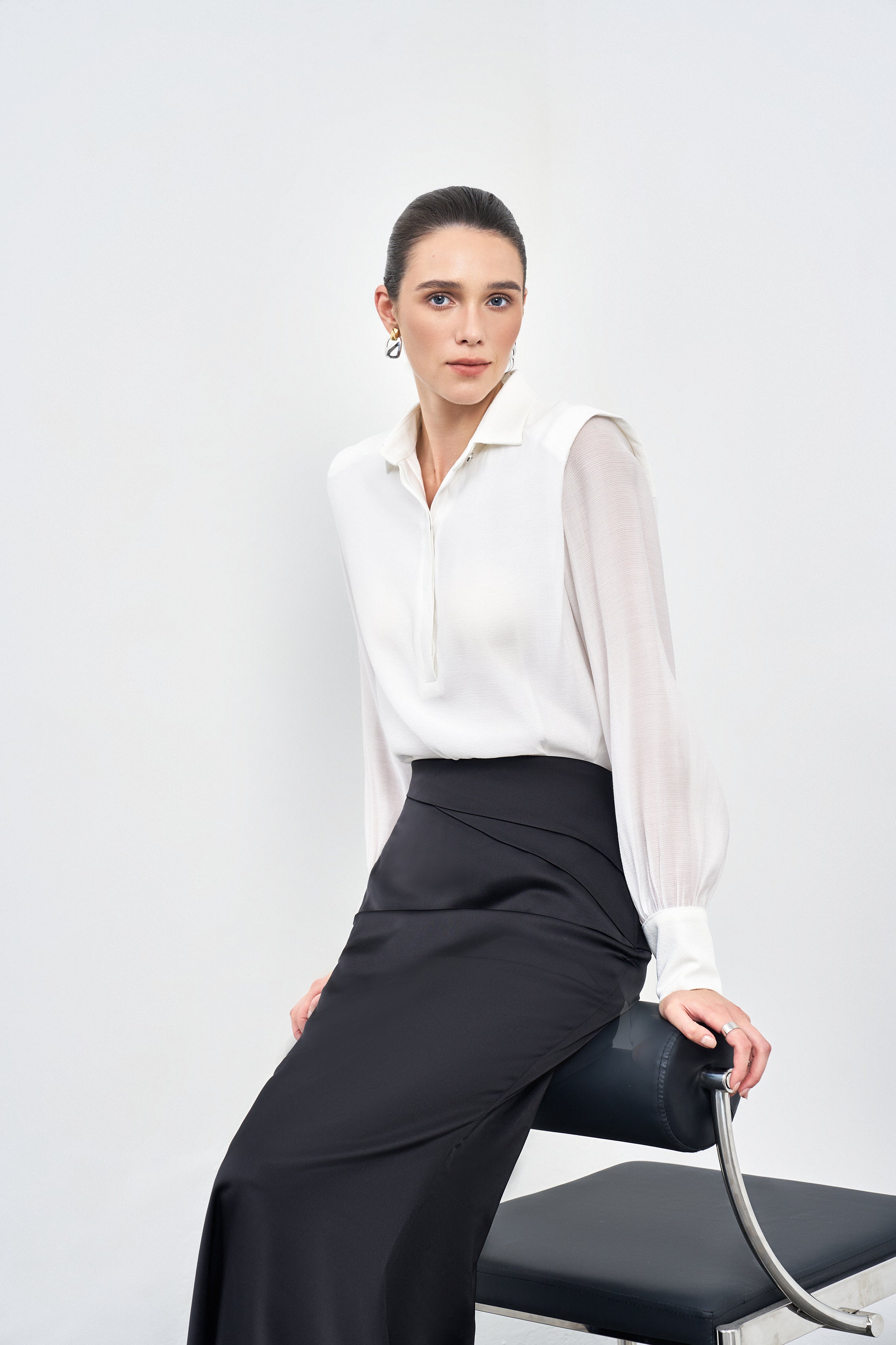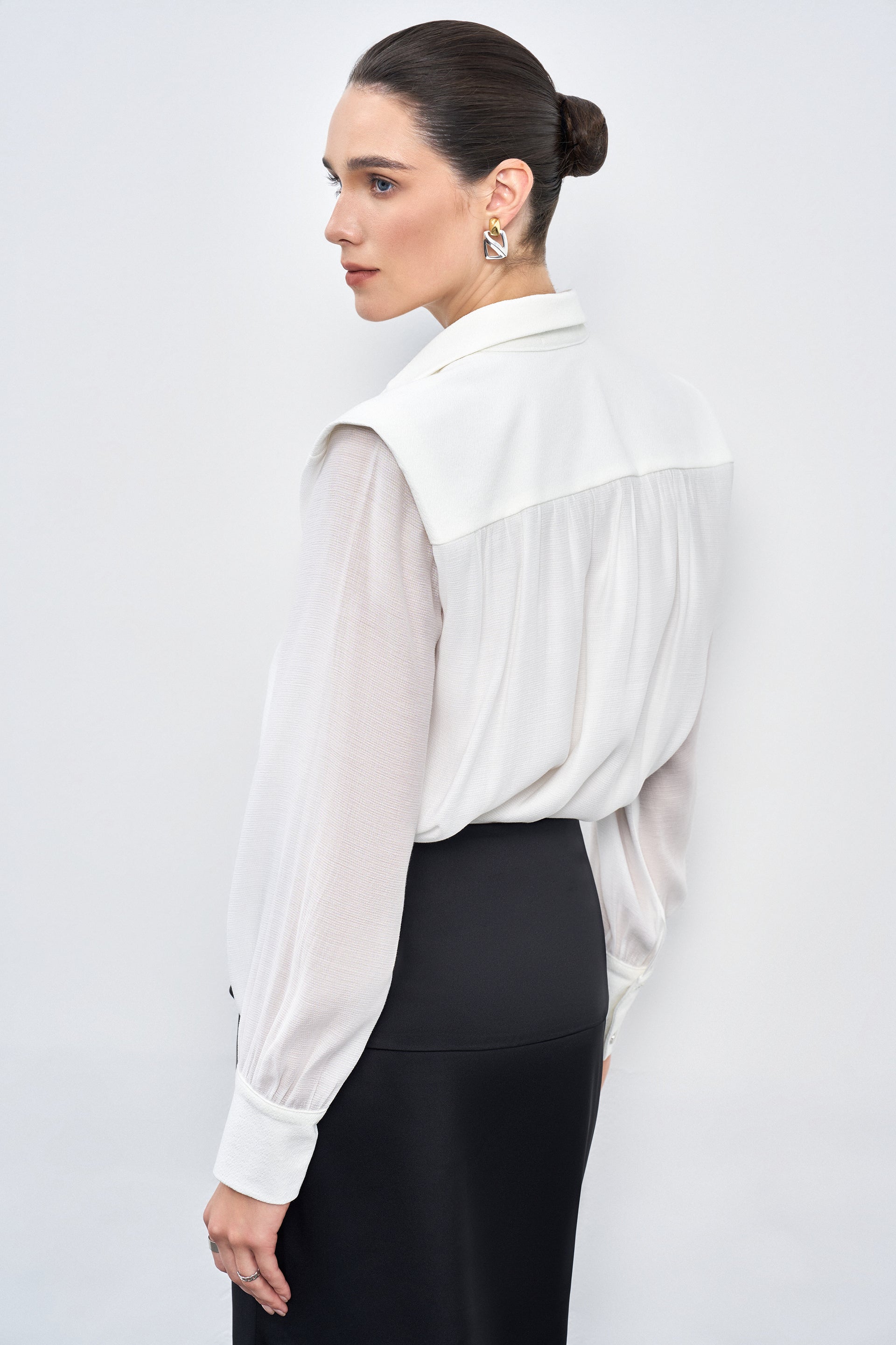 Oversized long sleeve blouse features a classic collar and a luxurious pearl silk lining. It can be styled for work with long skirts or trousers, or casually worn over shorts or a mini skirt with a small belt for a chic day out.