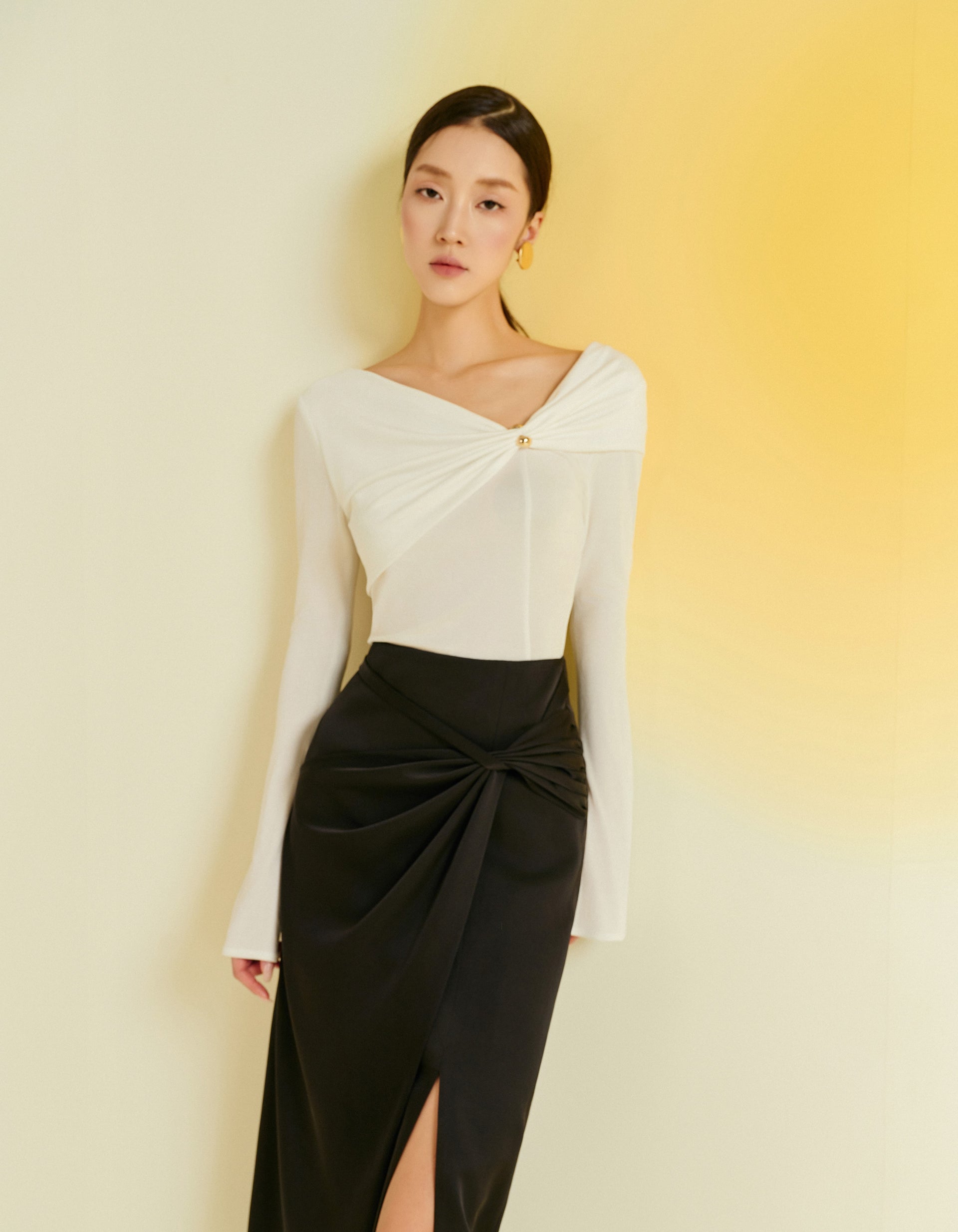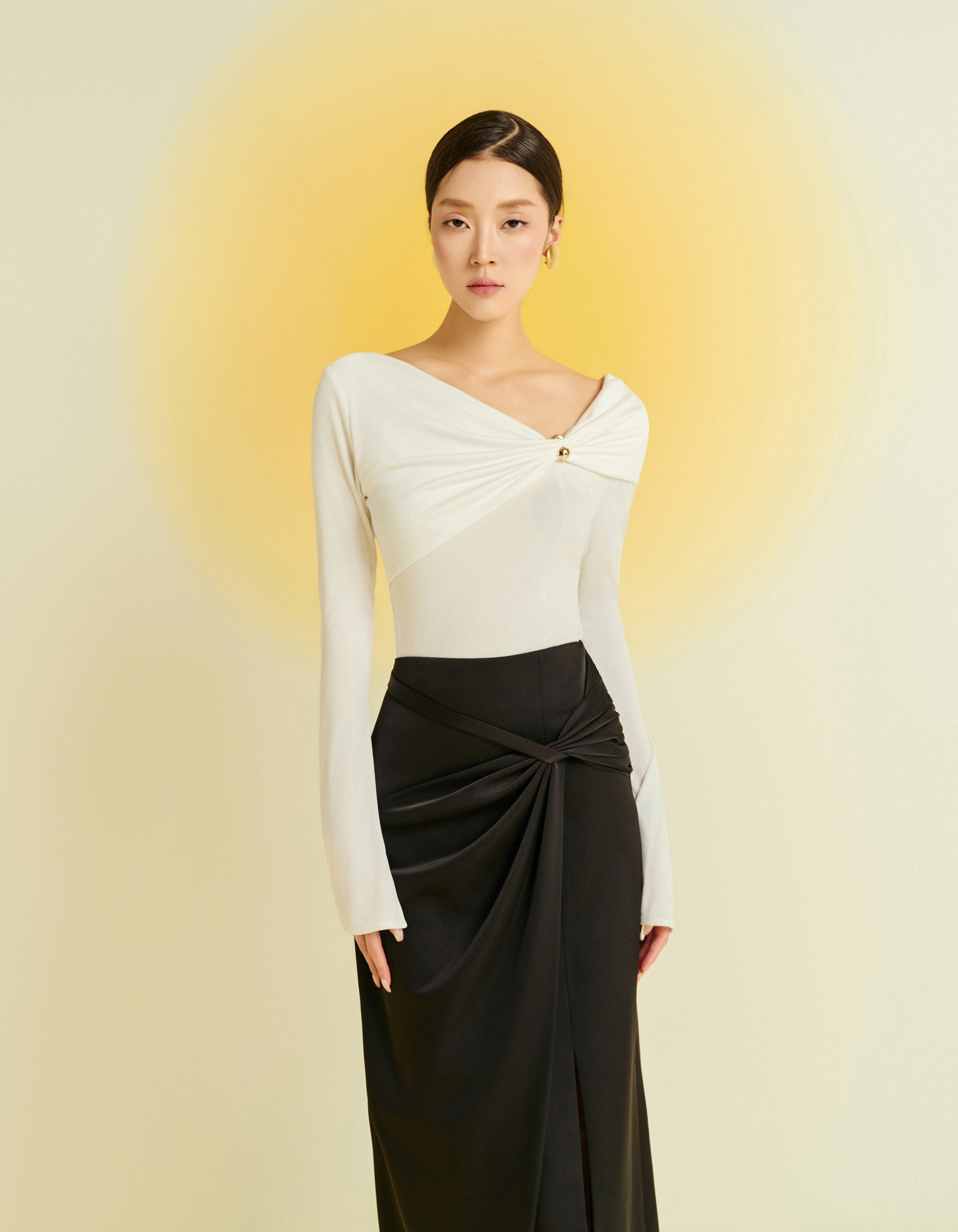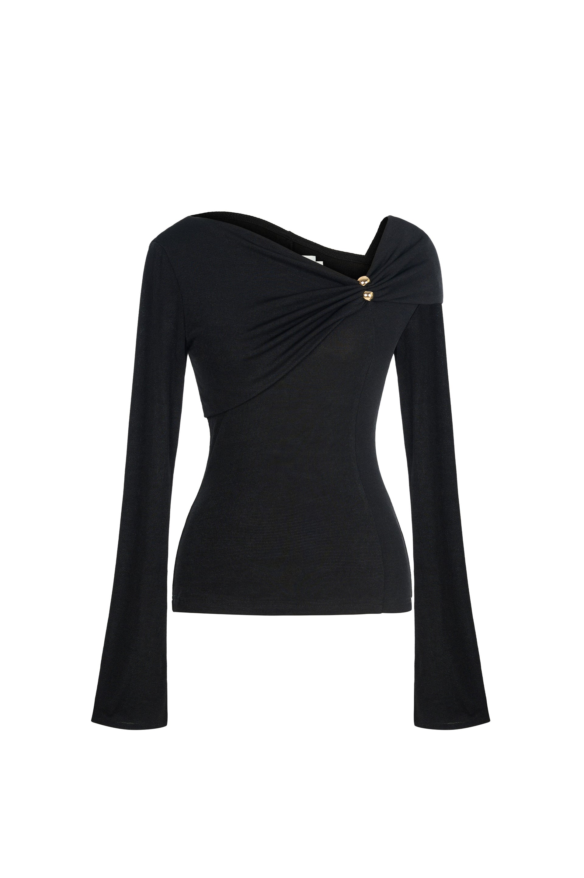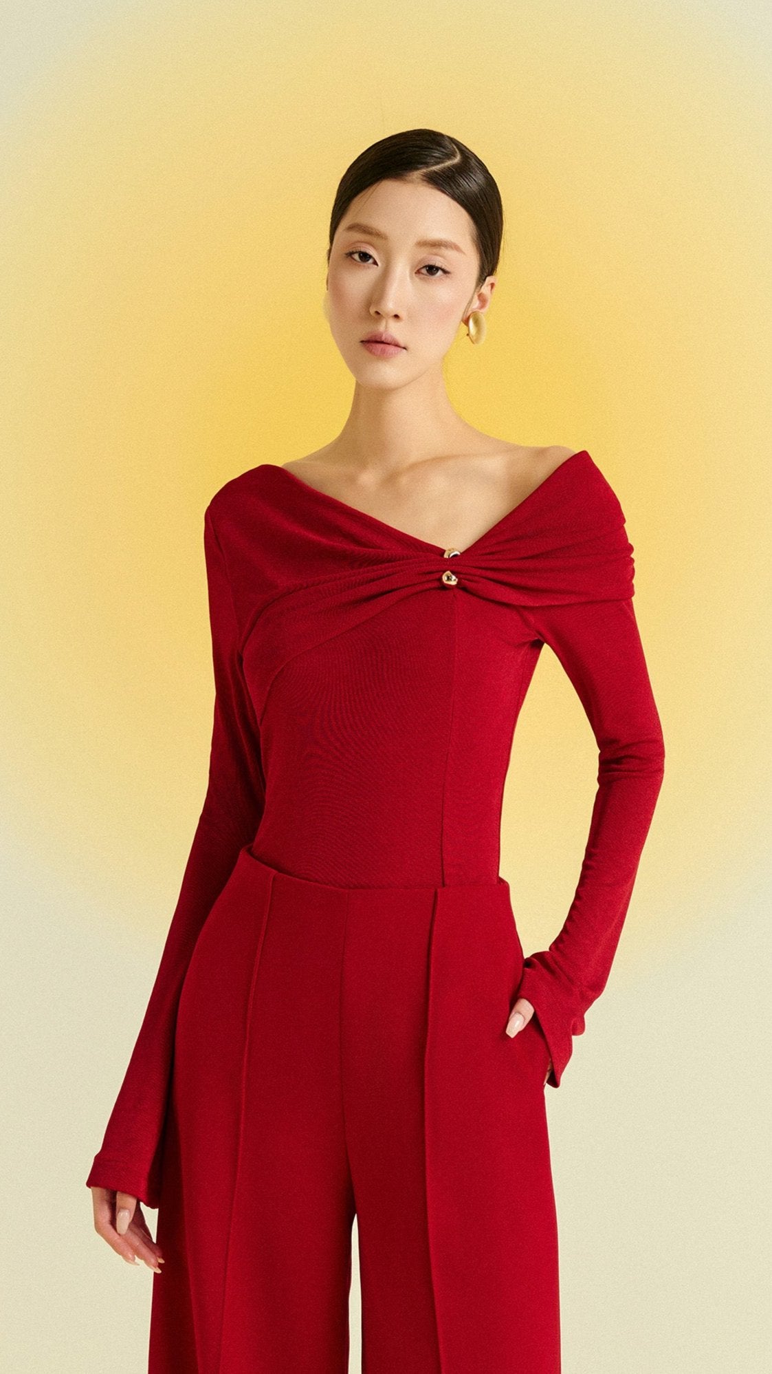 This off-shoulder top features an asymmetrical design with gold buttons as an eye-catching detail. The long sleeves and shimmering beaded jersey fabric make it perfect for the cooler seasons. Available in red, white, and black, this versatile top pairs beautifully with both pants and skirts. Whether for work, casual outings, or special events, it exudes sophistication and femininity for a chic look.