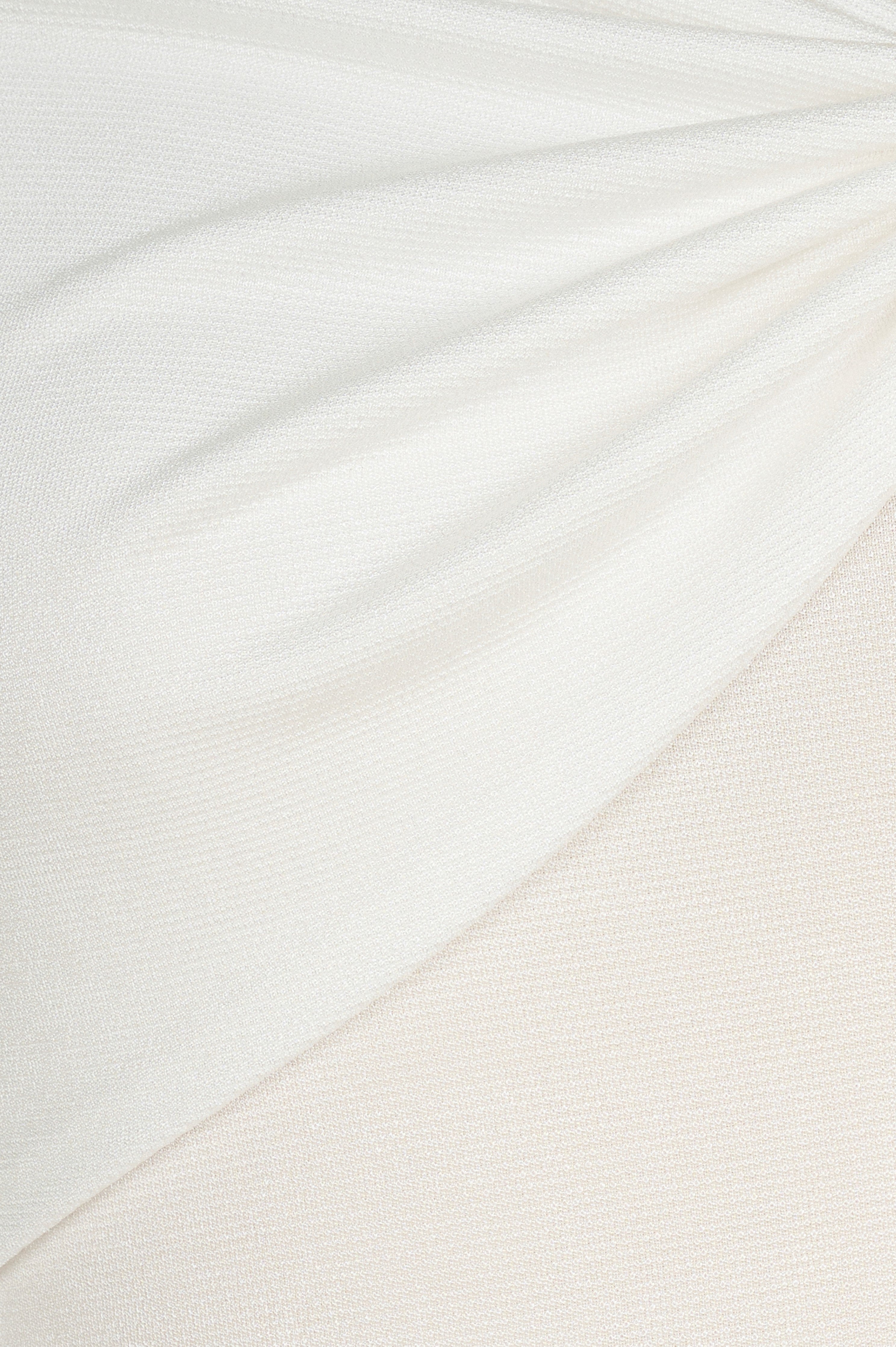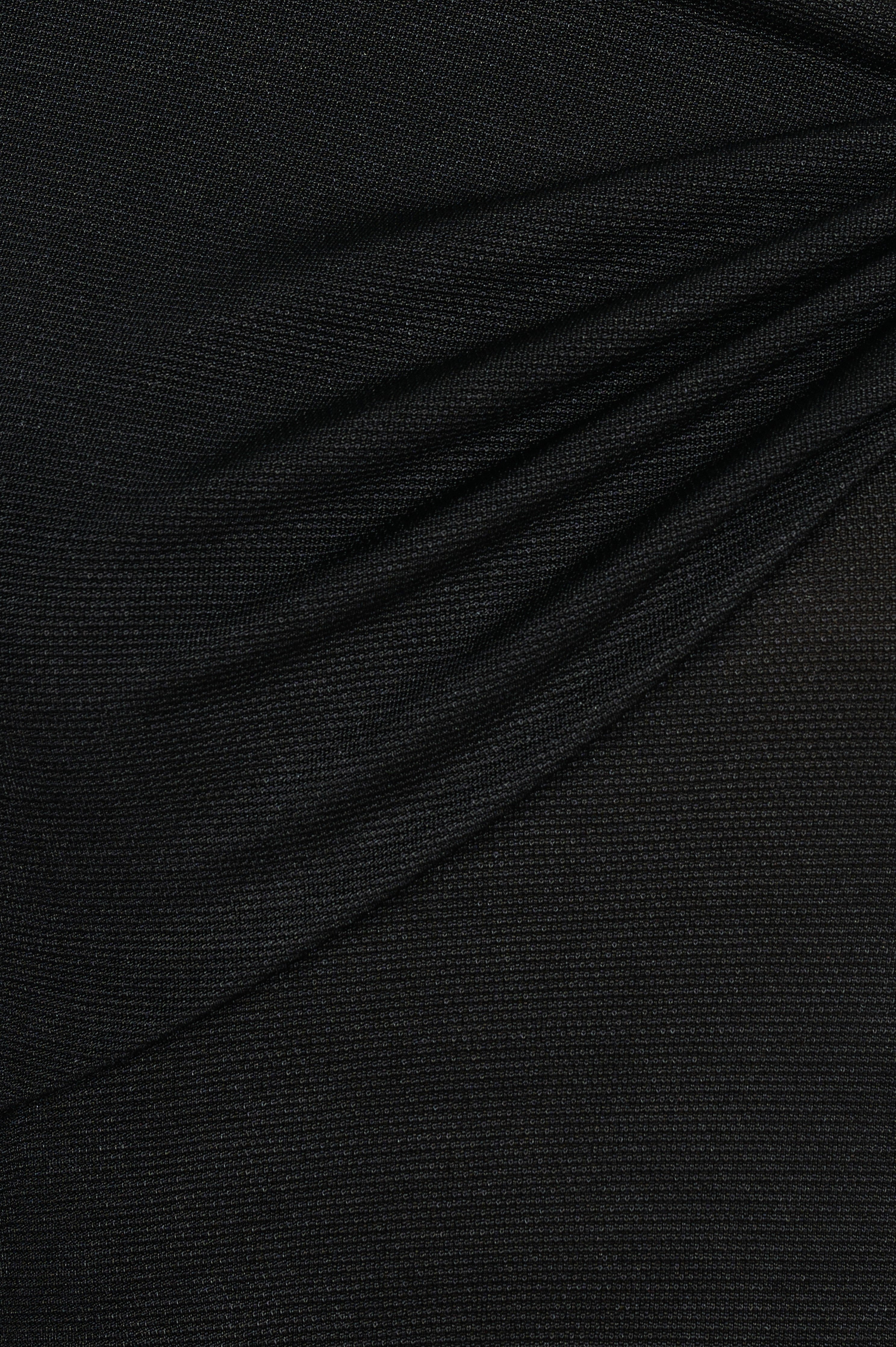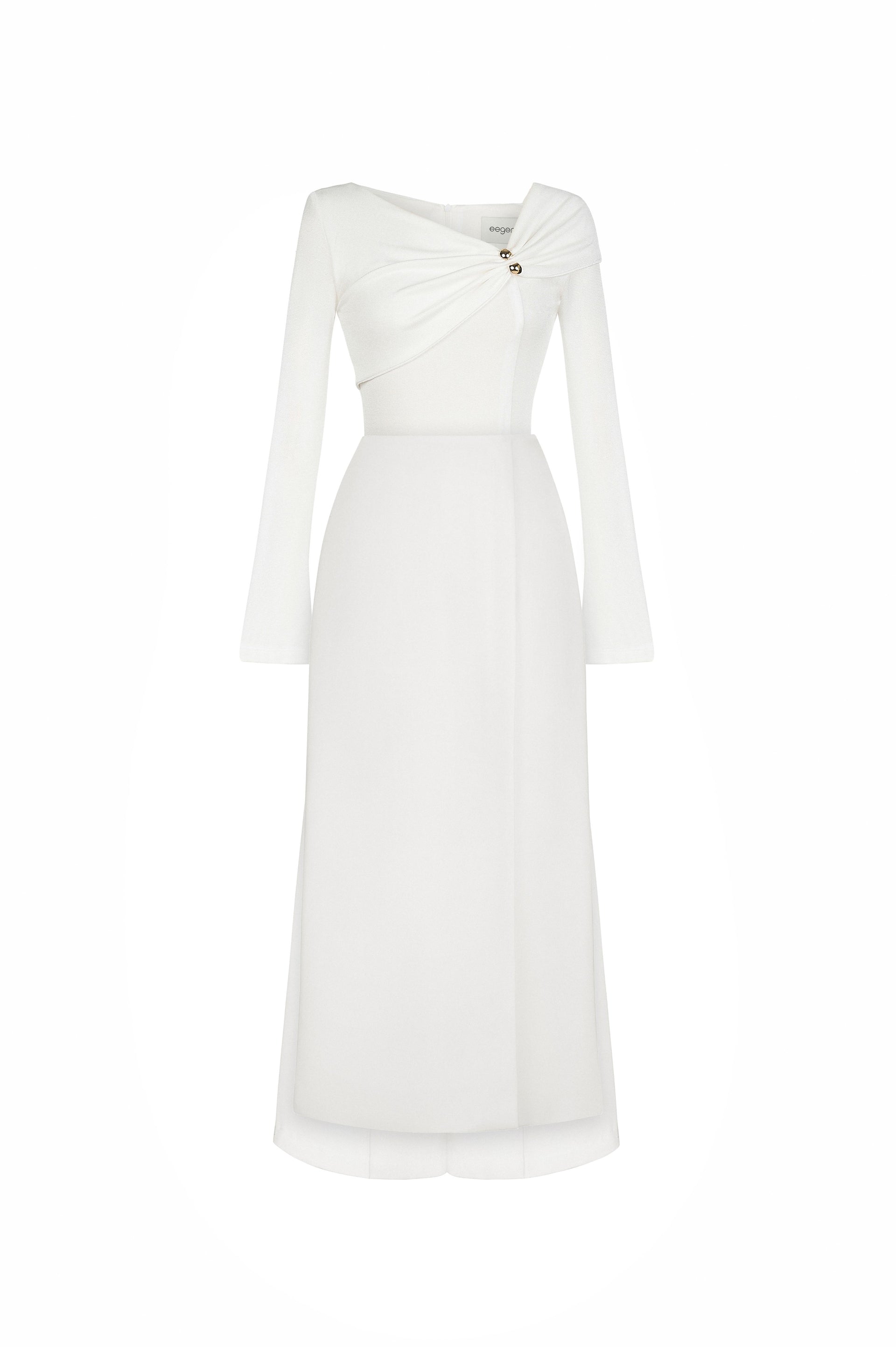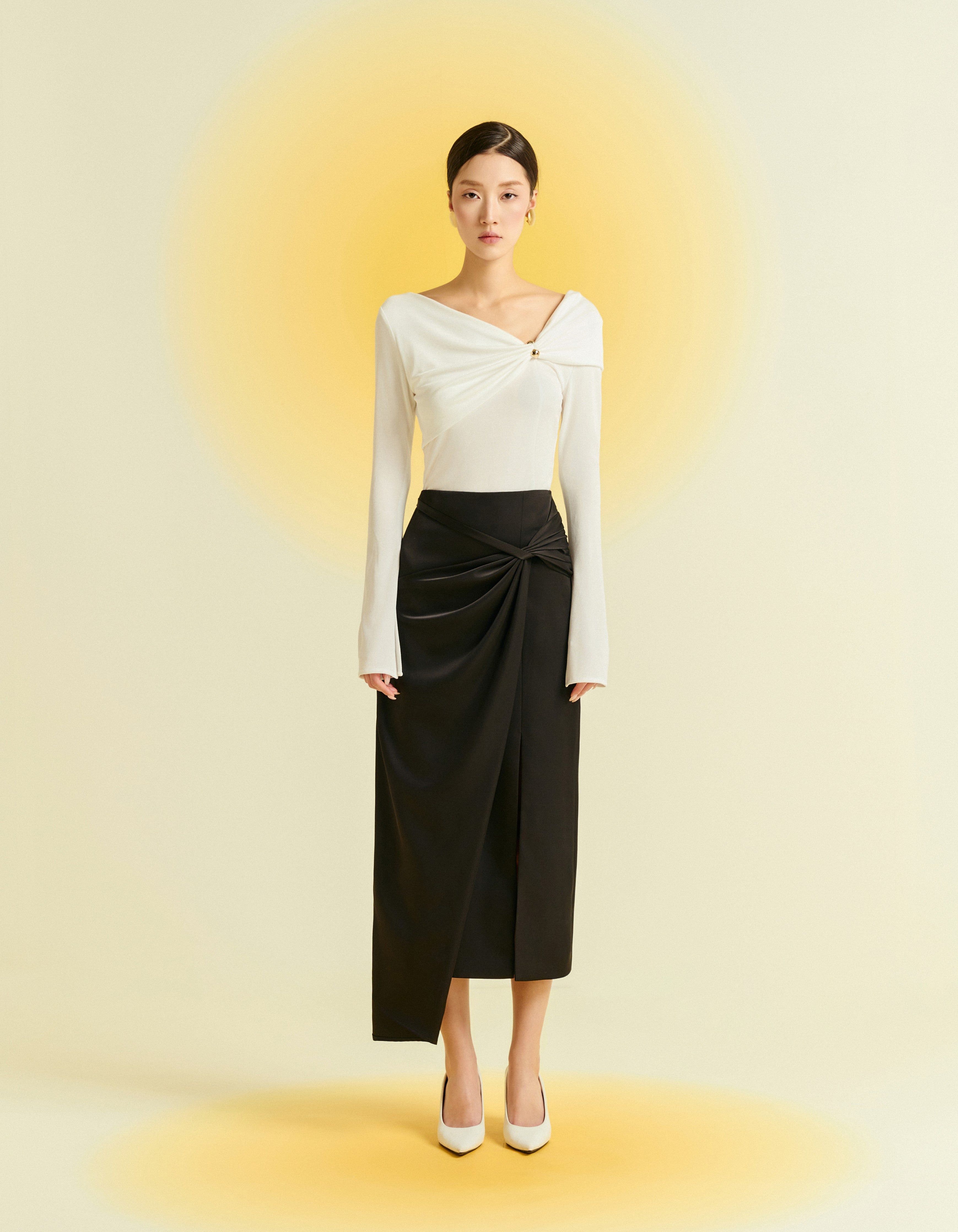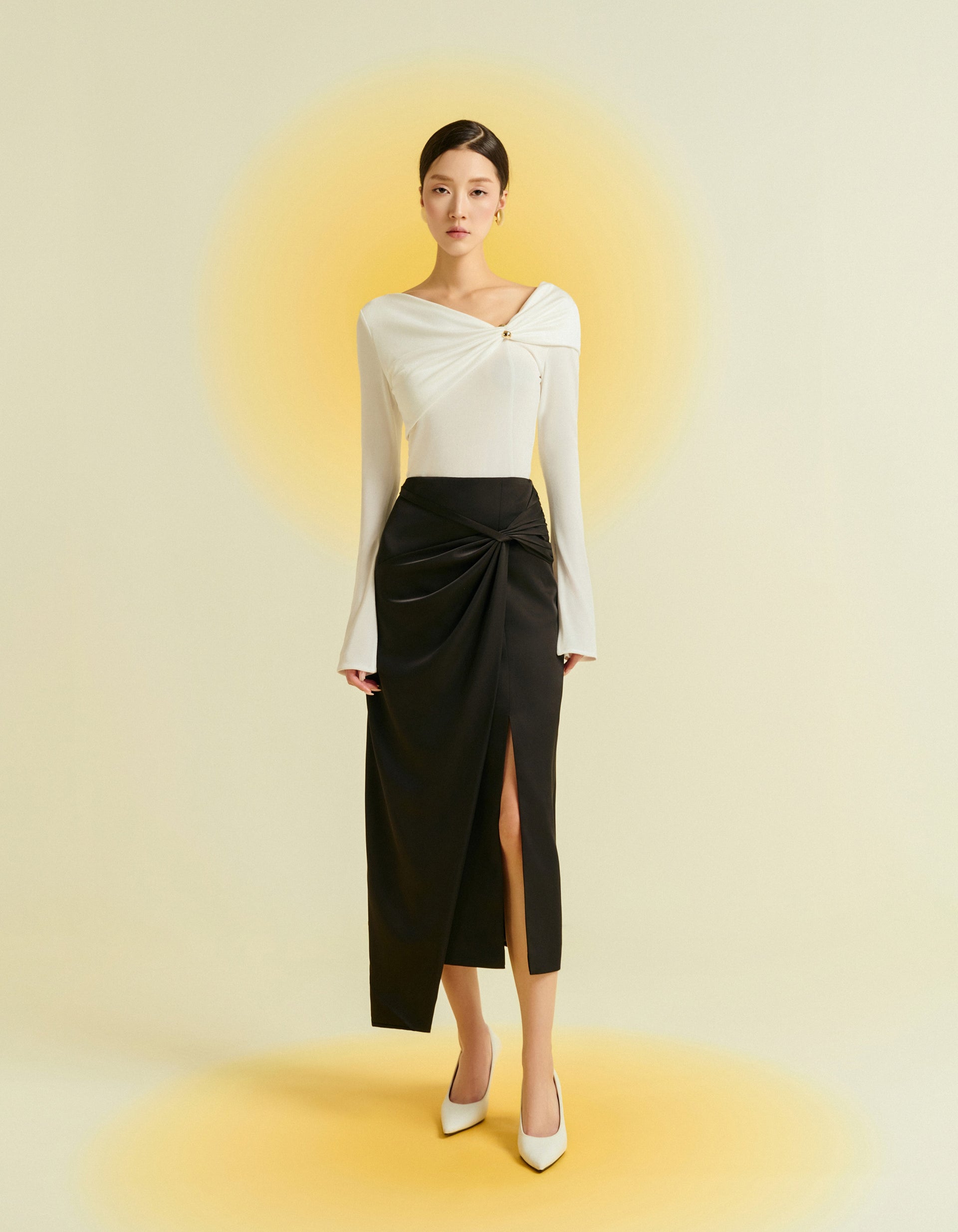 This off-shoulder top features an asymmetrical design with gold buttons as an eye-catching detail. The long sleeves and shimmering beaded jersey fabric make it perfect for the cooler seasons. Available in red, white, and black, this versatile top pairs beautifully with both pants and skirts. Whether for work, casual outings, or special events, it exudes sophistication and femininity for a chic look.