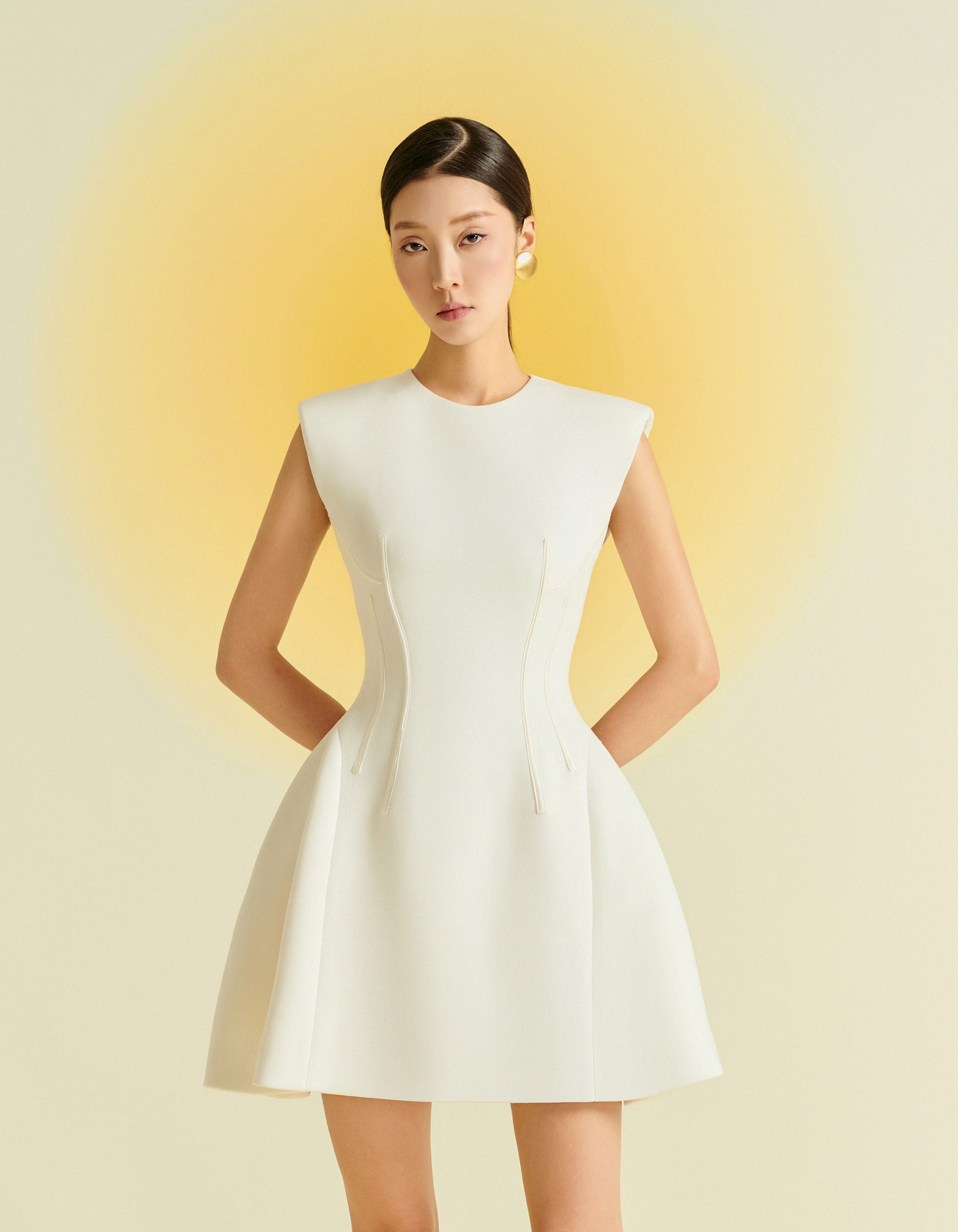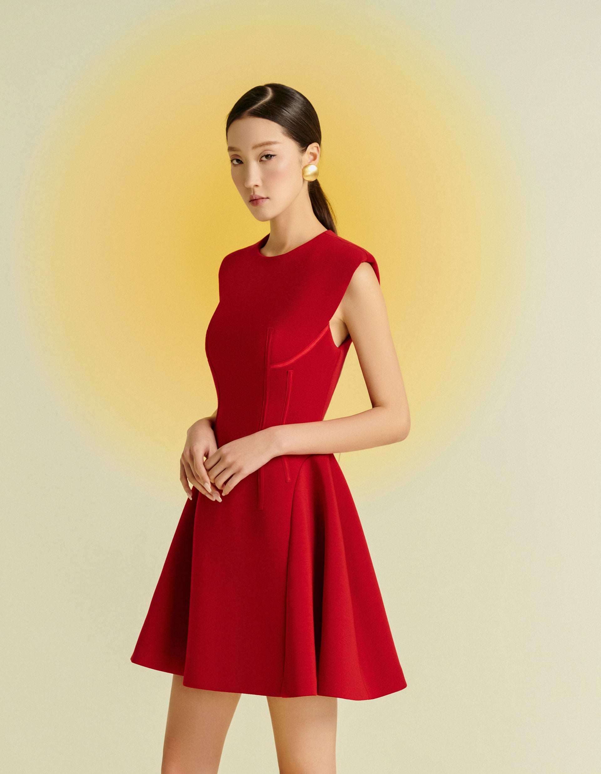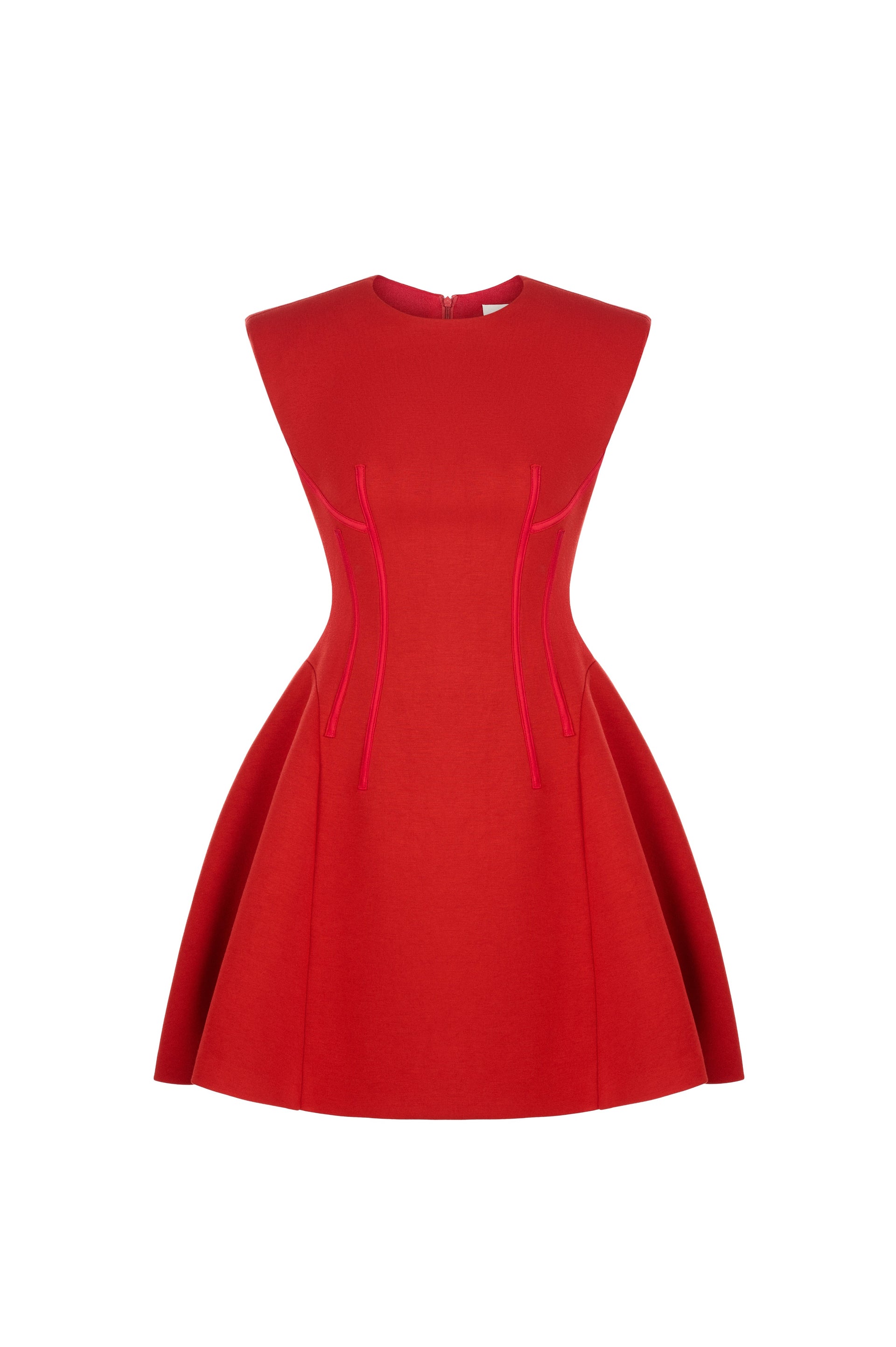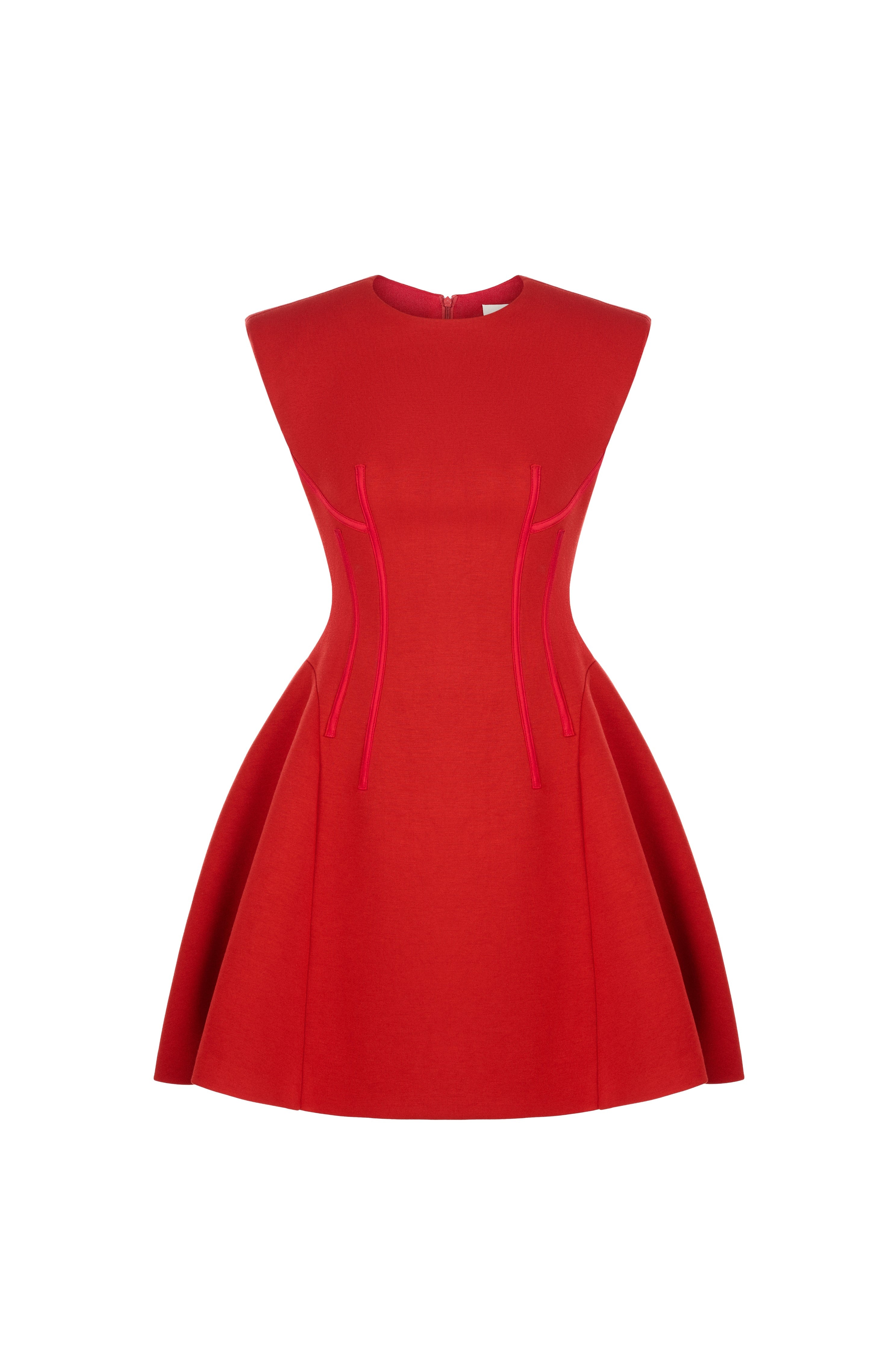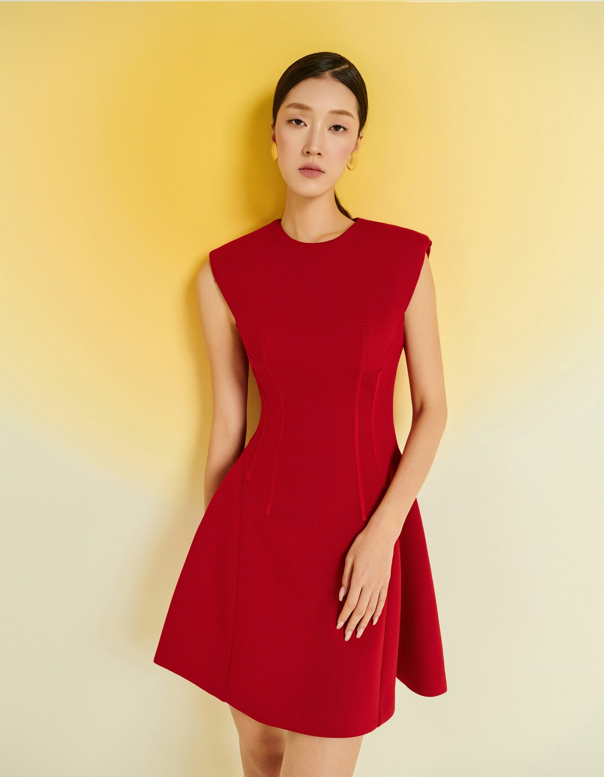 This sleeveless dress features a round neckline and a short, slightly flared hem for a youthful and feminine look. Crafted from premium stretch Umi fabric, it offers both comfort and style. Available in three colors: red, white, and black, this dress is perfect for modern, stylish women