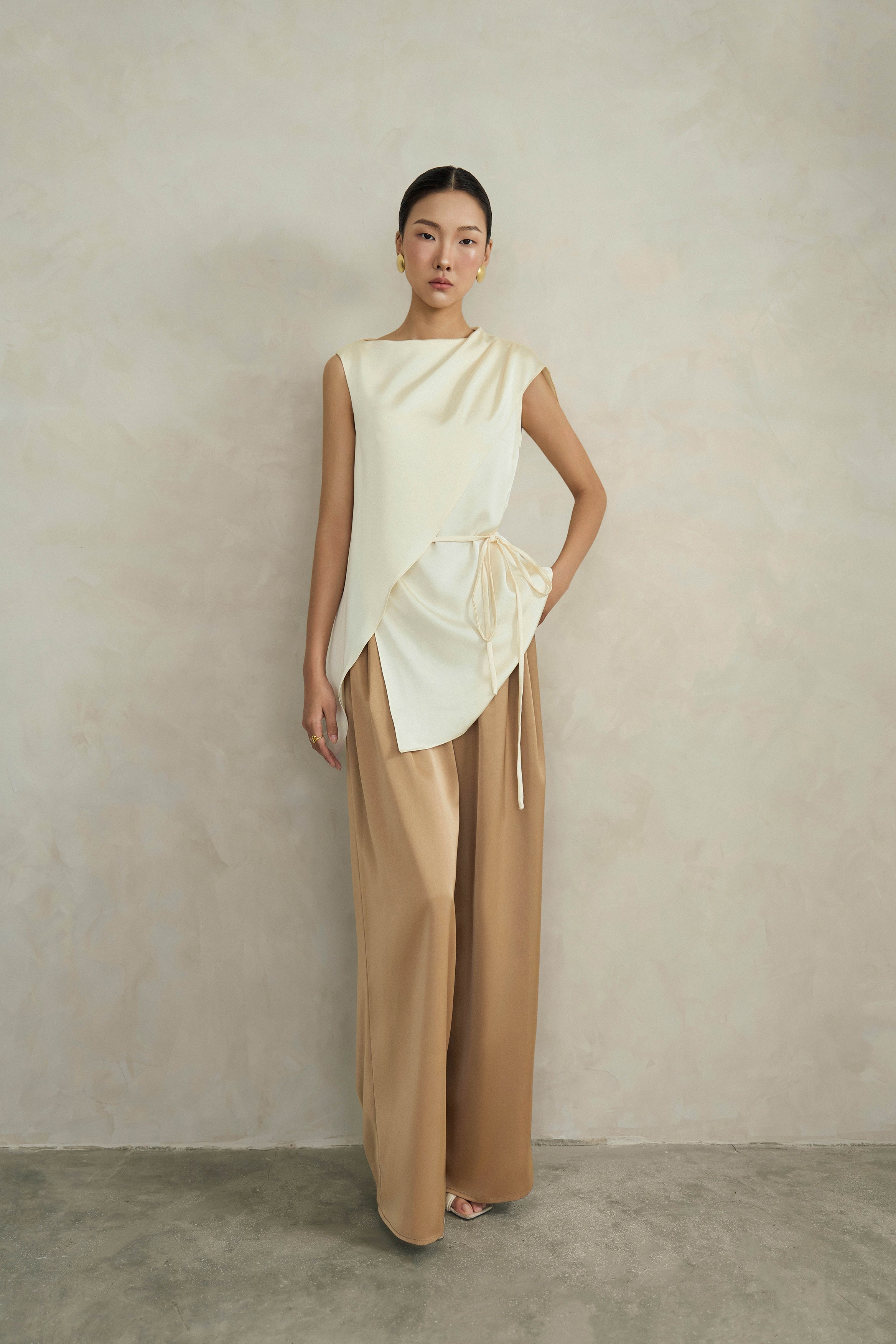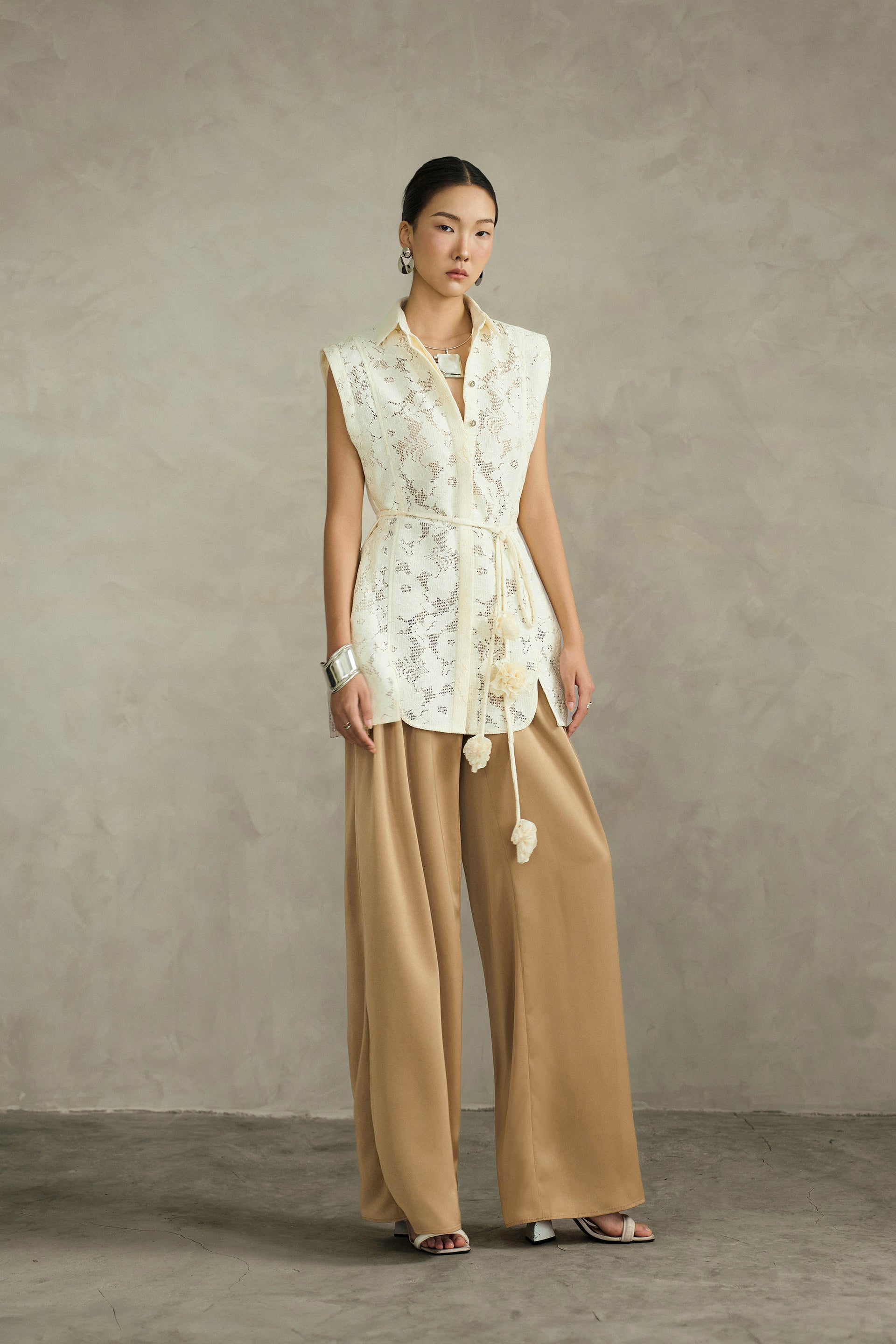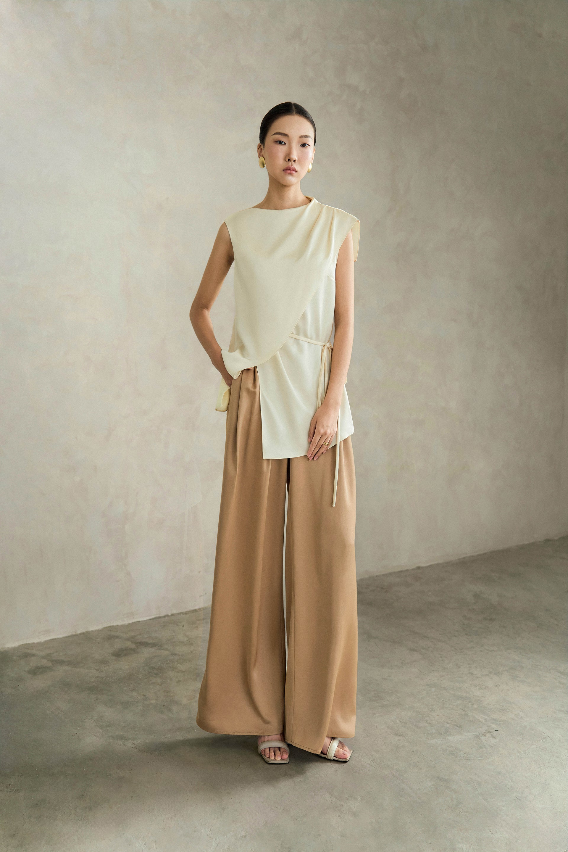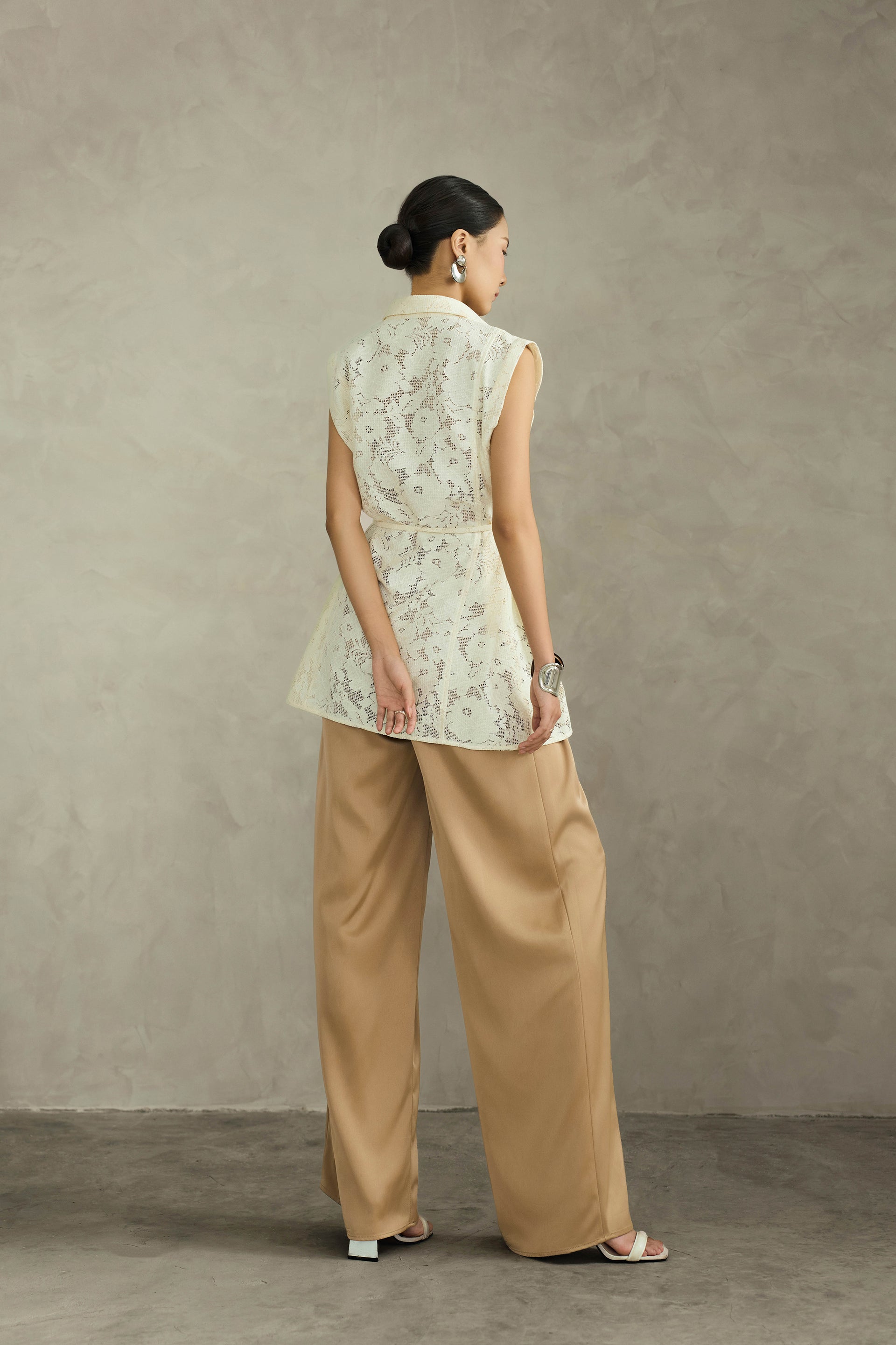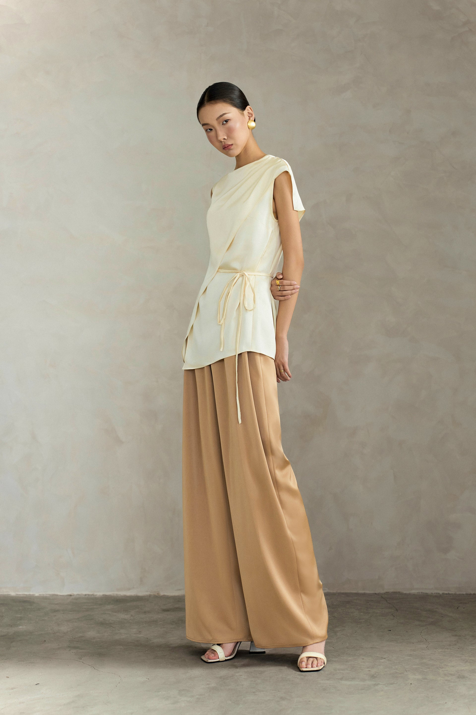 Wide-leg trousers made from soft, lightweight, and breathable silk fabric.