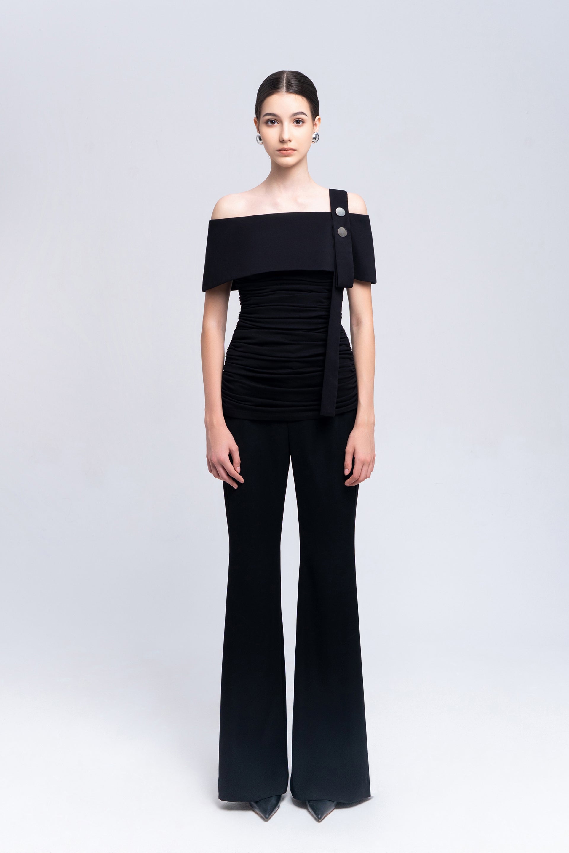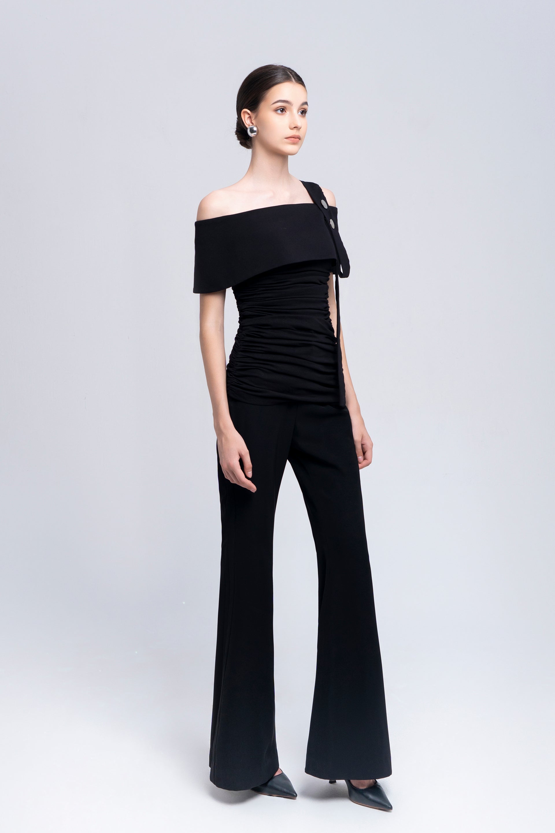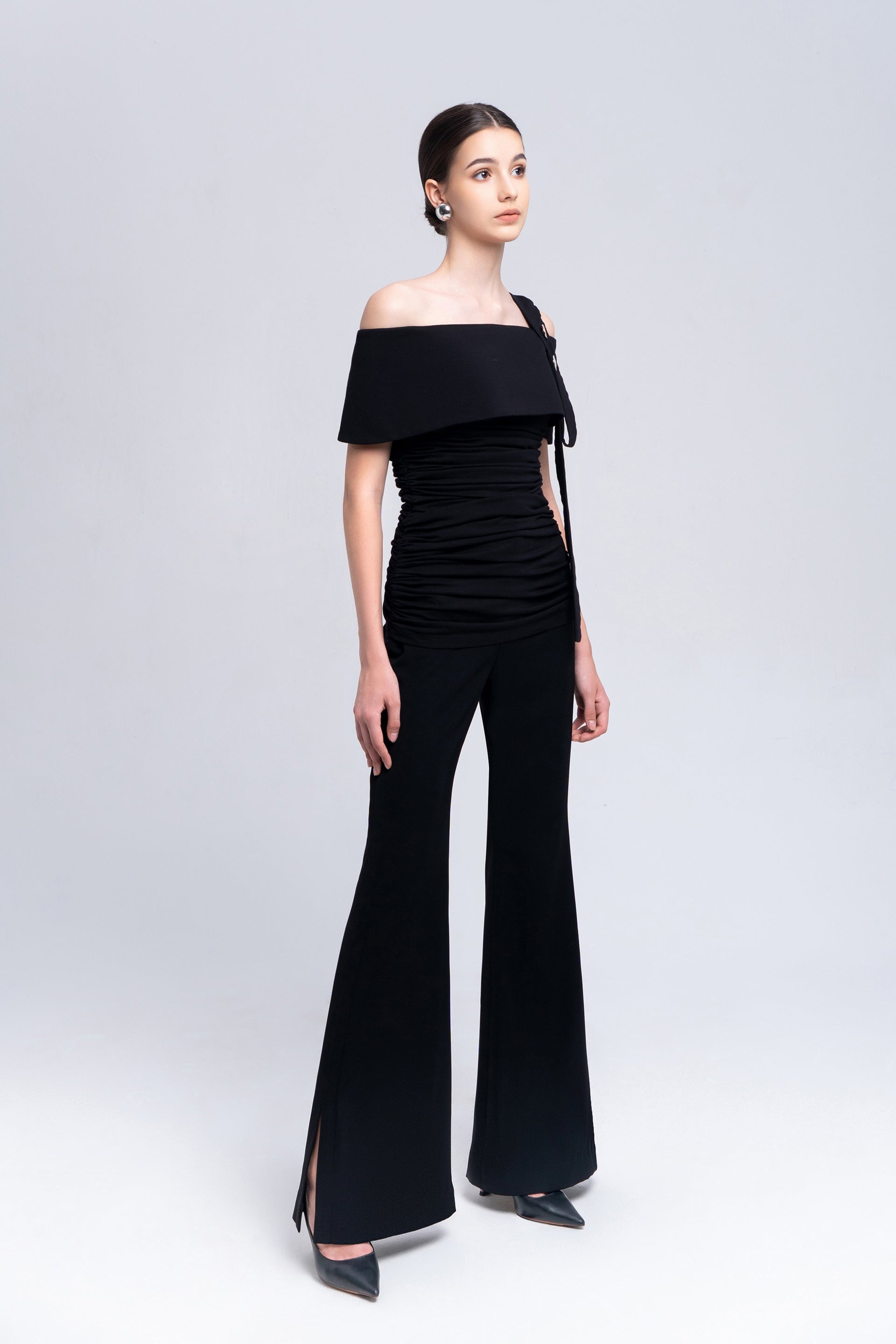 Step into sophistication with our high-waisted flare pants. Featuring a stylish splint and split hem on the waist sides, the dual leech detail adds versatility to your belt placement, creating a chic and modern look