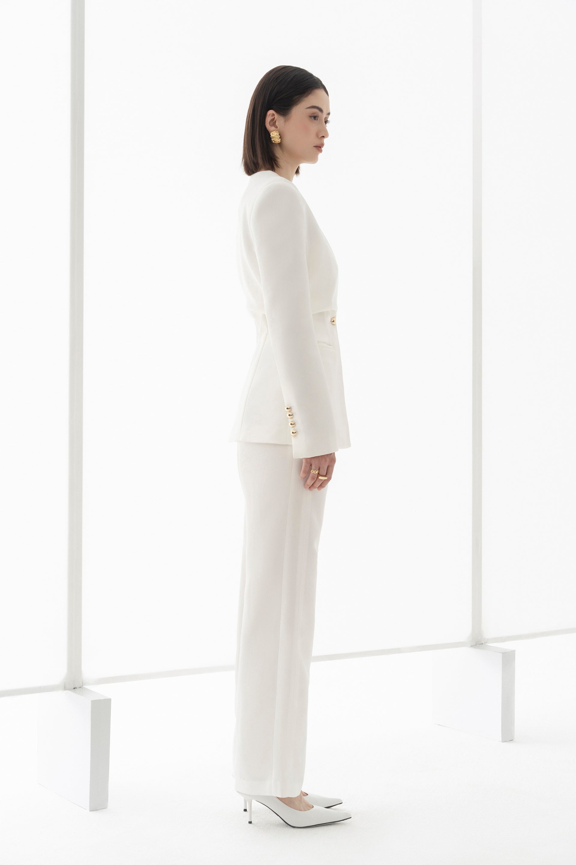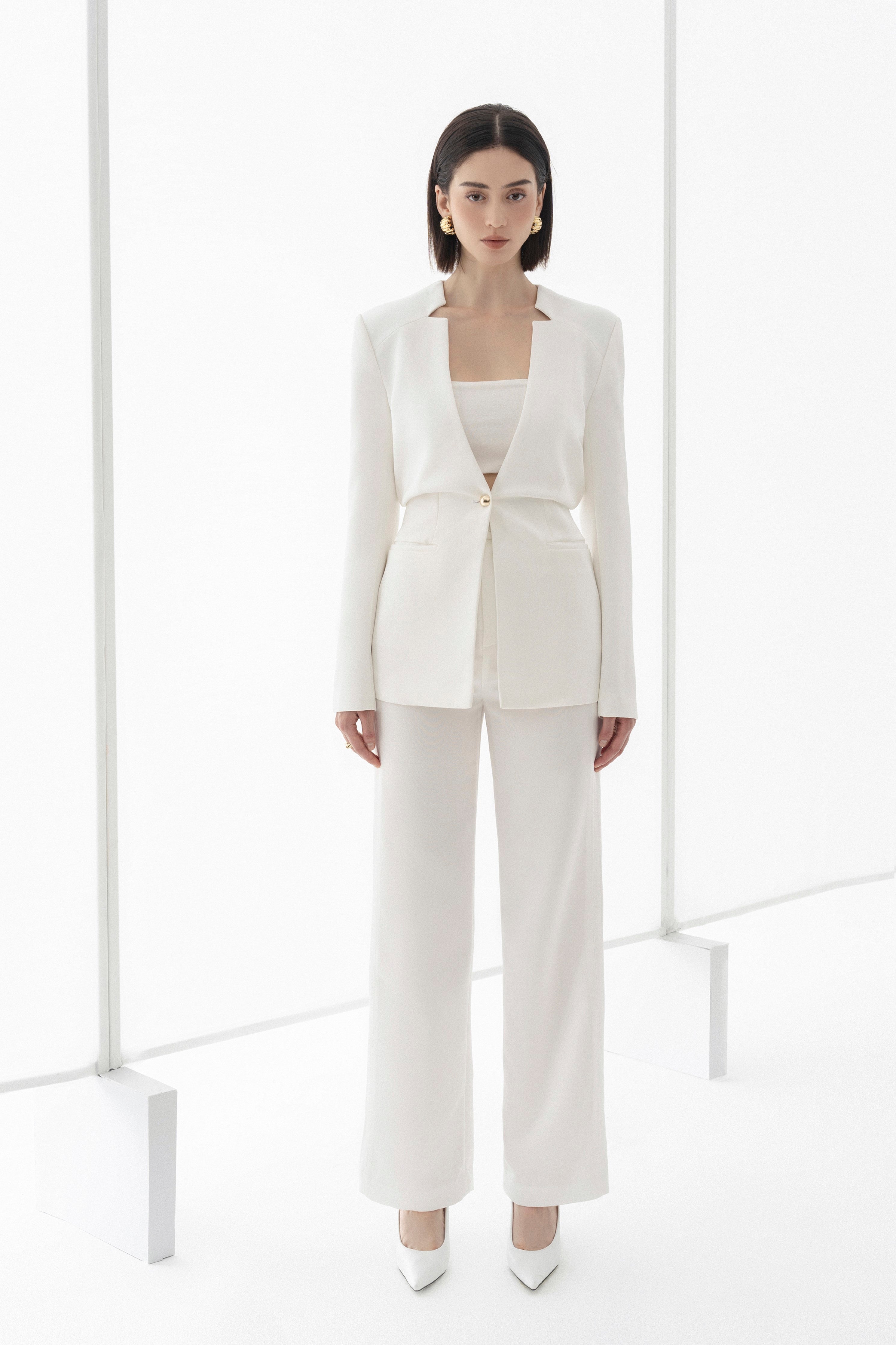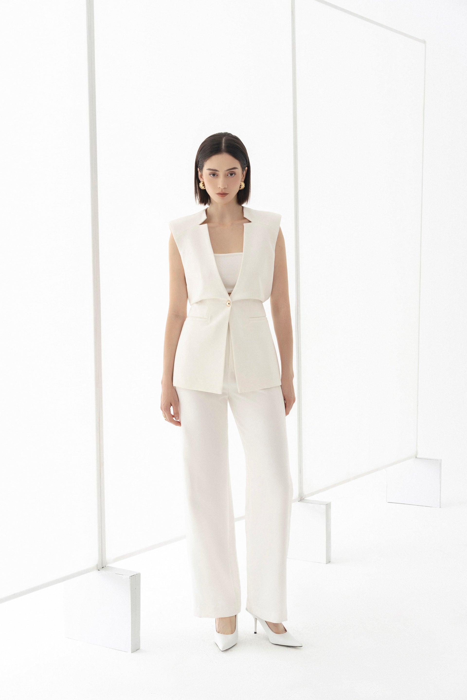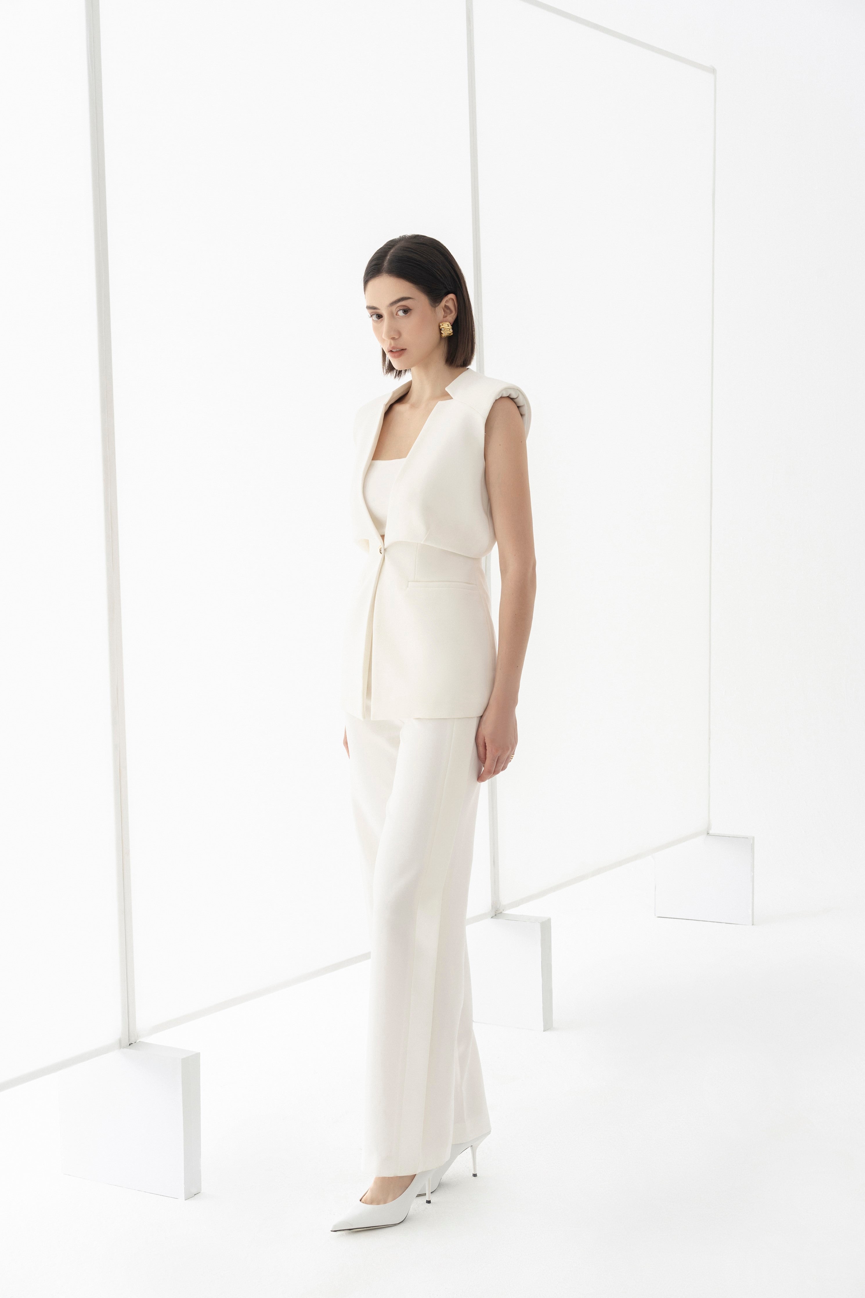 The Morela Pants feature a timeless, high-waisted wide-leg design with white topstitching for a polished look. With a button and zipper at the front and pockets on both sides, these trousers provide a lasting comfort and style. Material:Β Mango taffeta