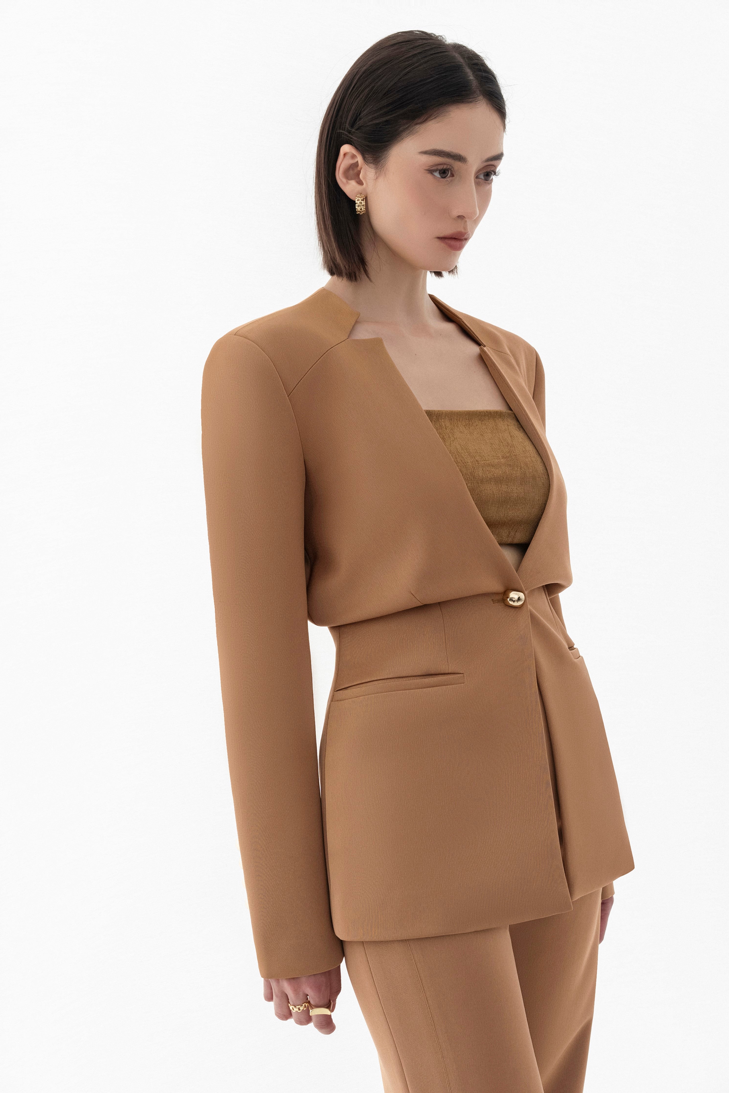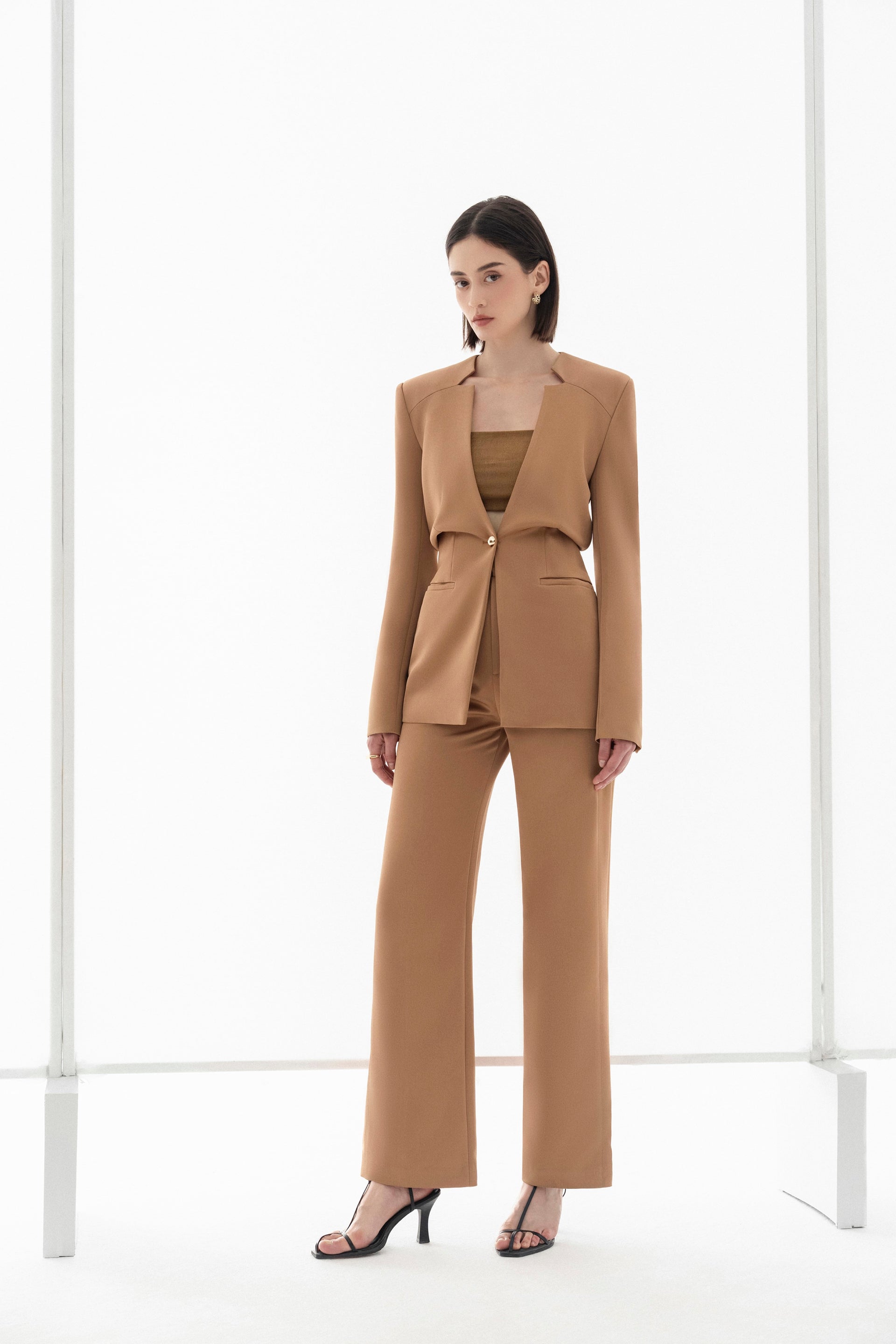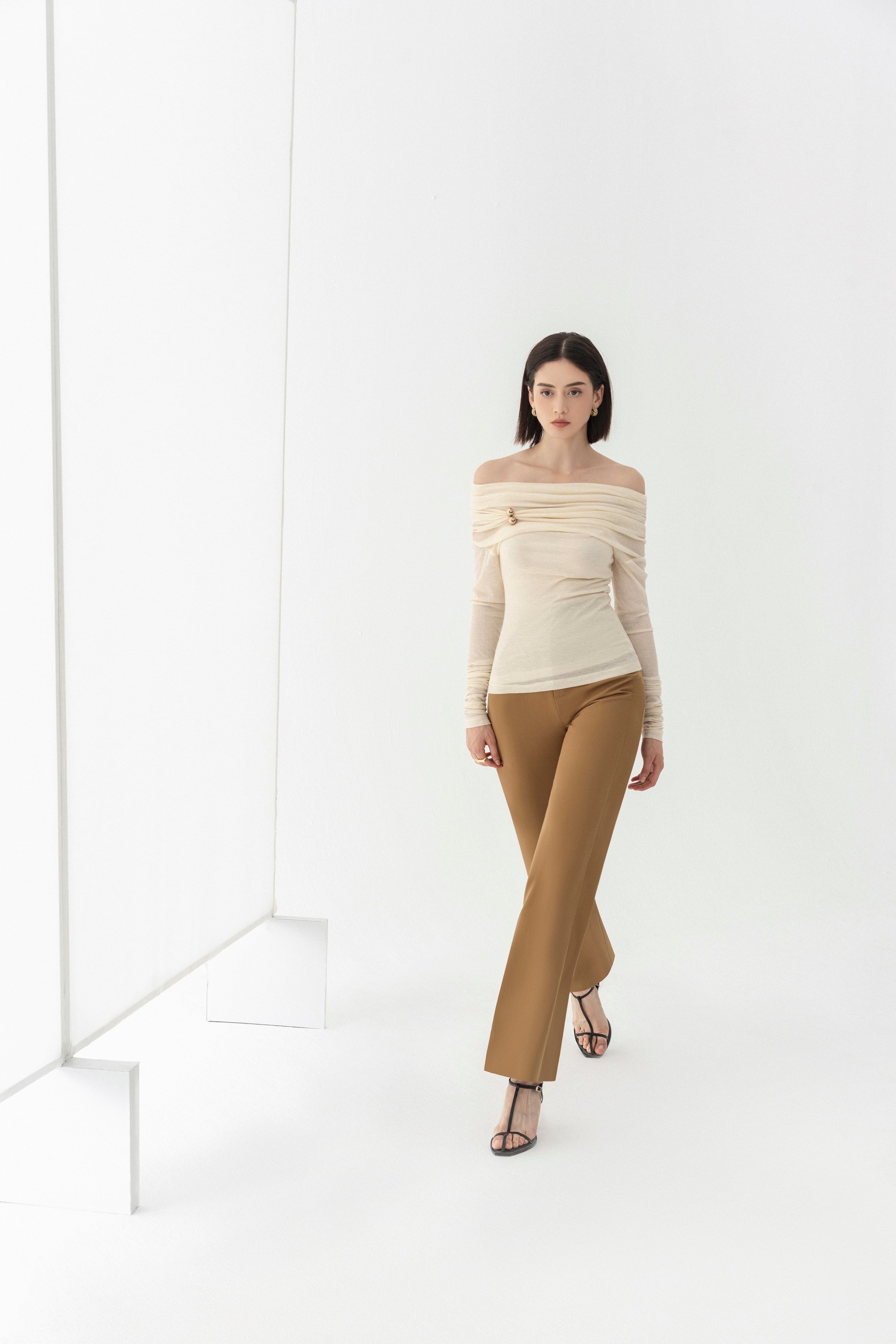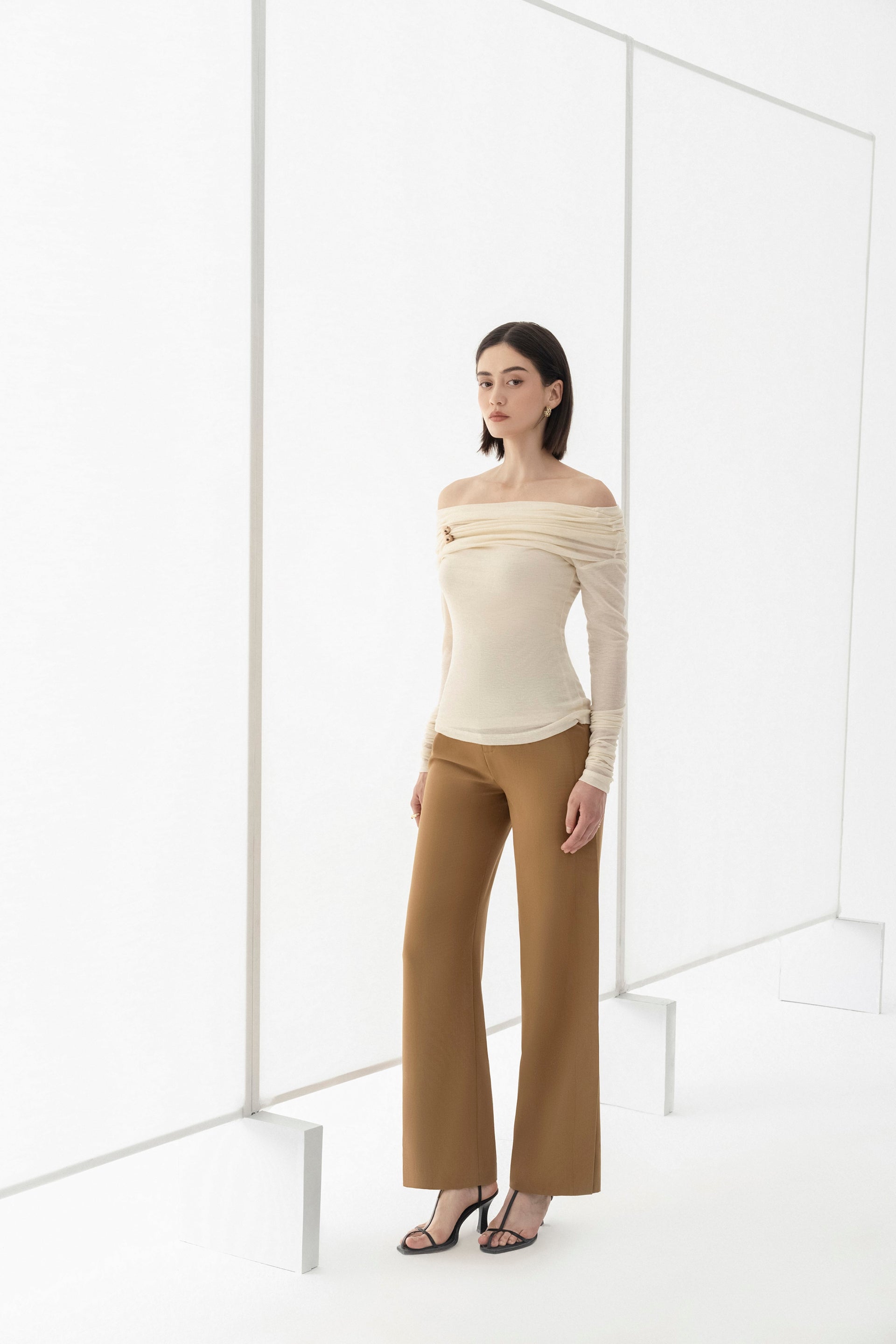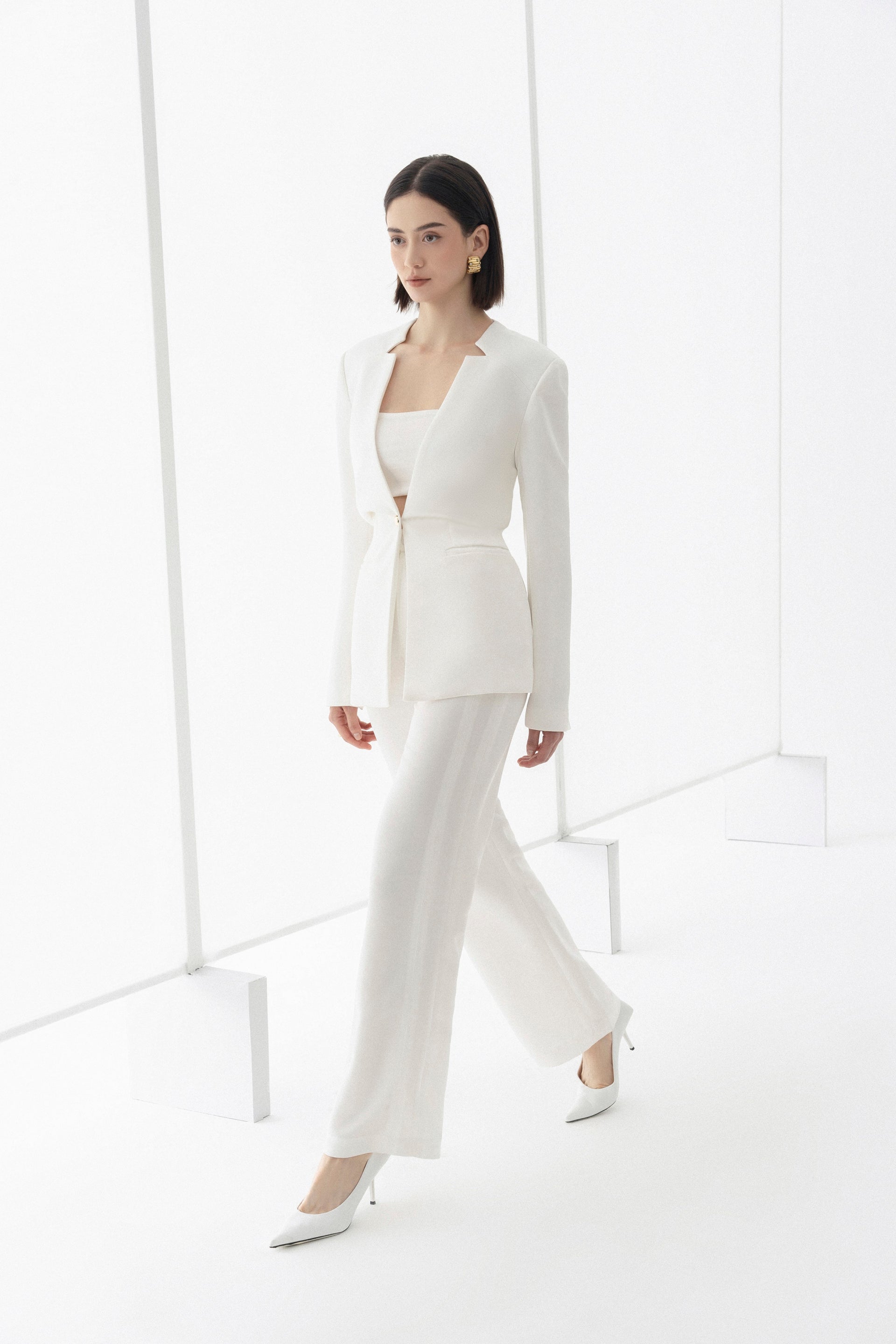 The Morela Pants feature a timeless, high-waisted wide-leg design with white topstitching for a polished look. With a button and zipper at the front and pockets on both sides, these trousers provide a lasting comfort and style. Material:Β Mango taffeta