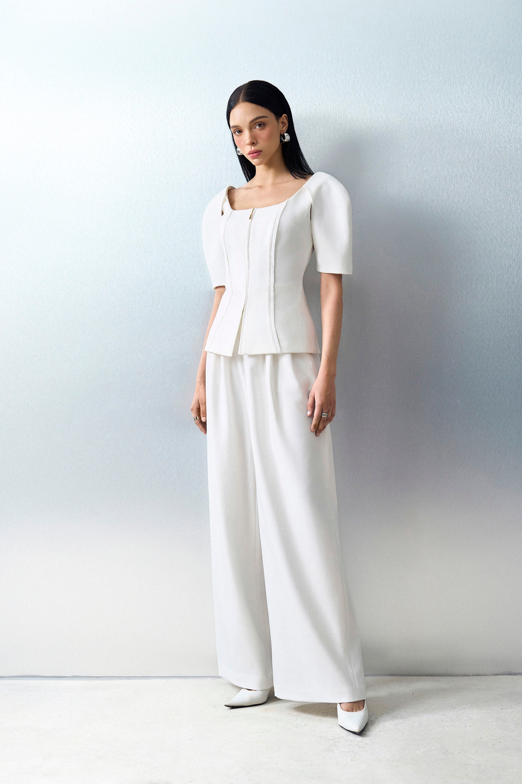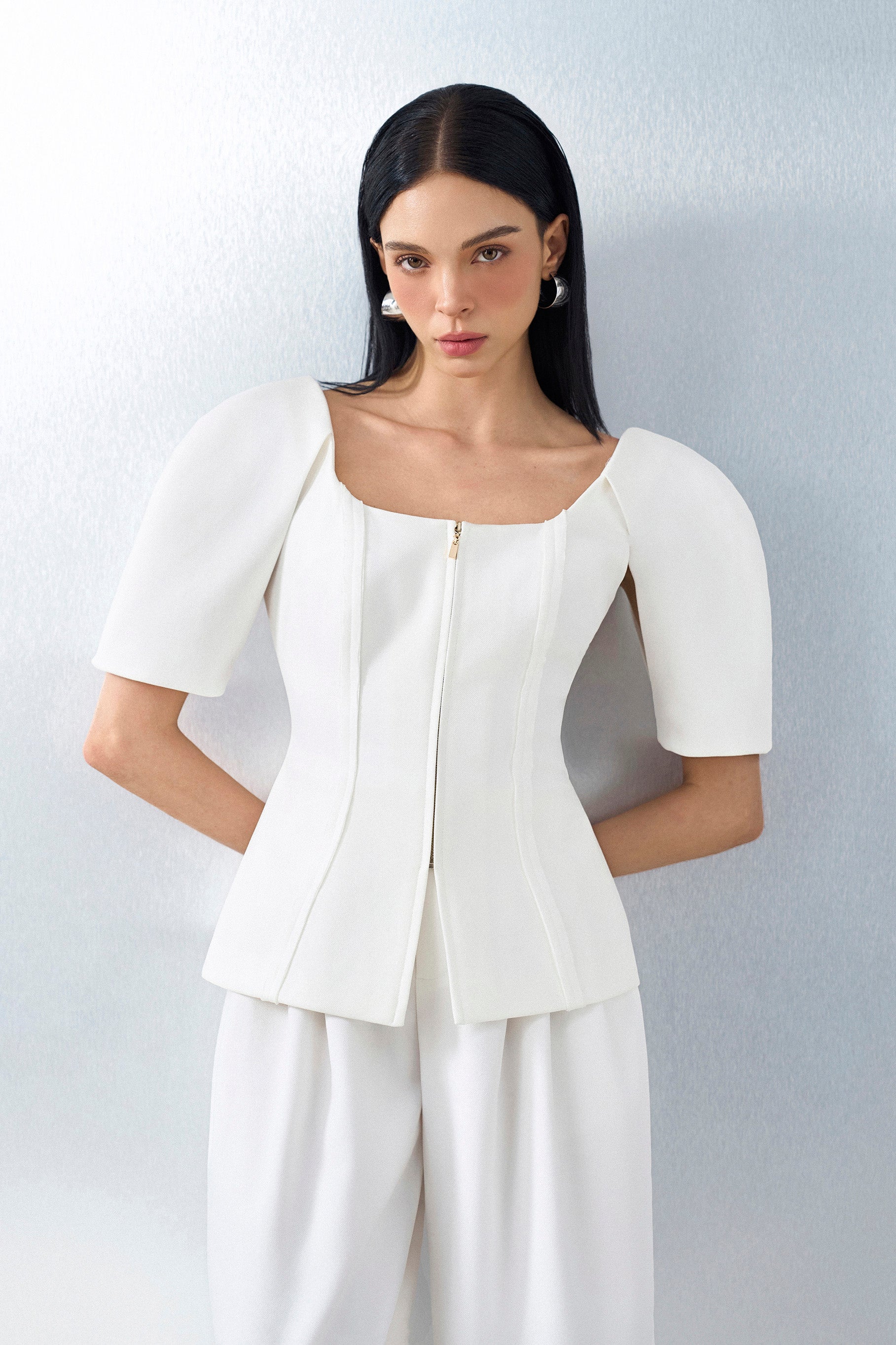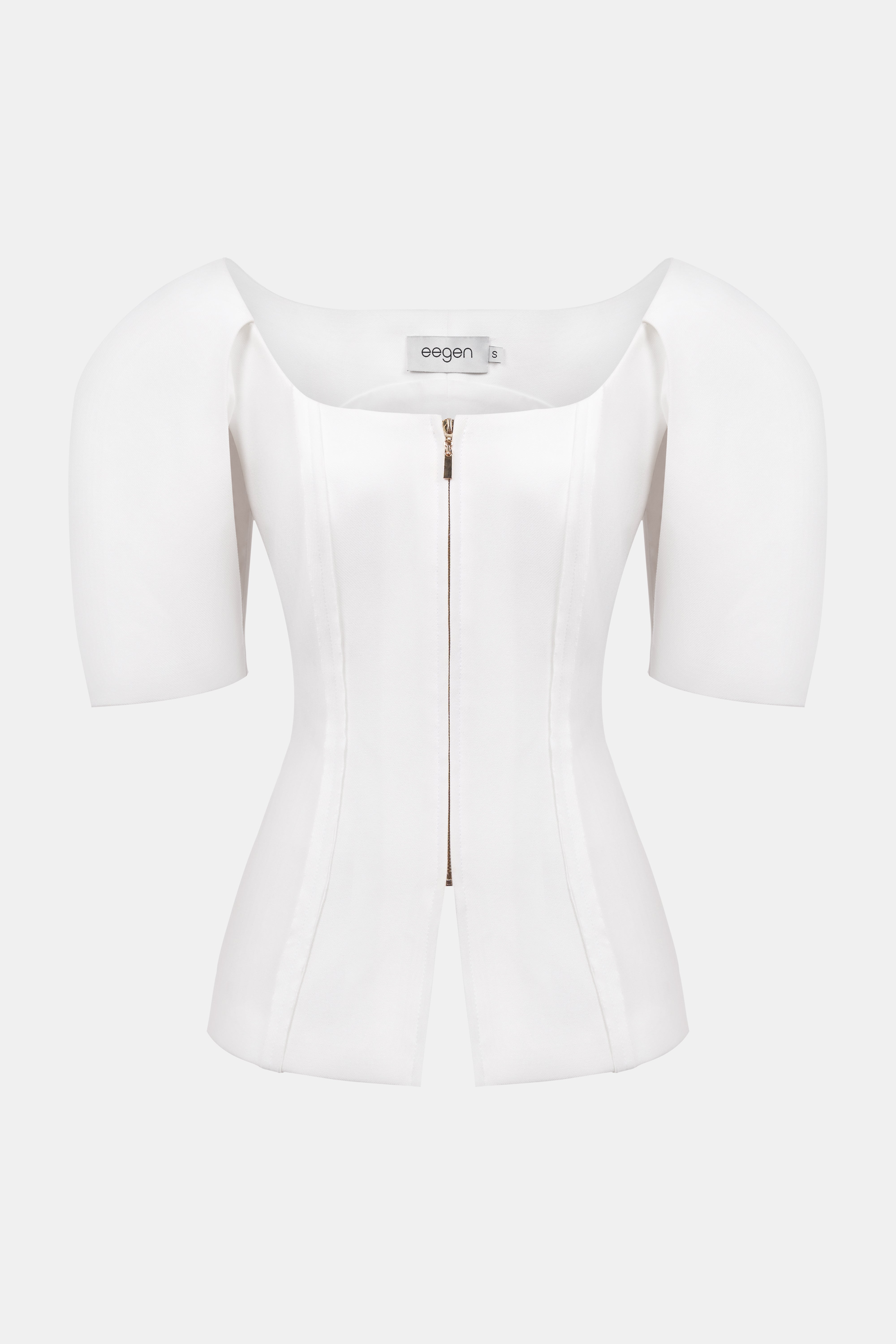 Short-sleeve top with a U-neckline and a front zipper closure in brass. The fitted waist and flared hips create a slimming effect on the body. The front features vertical pleats.