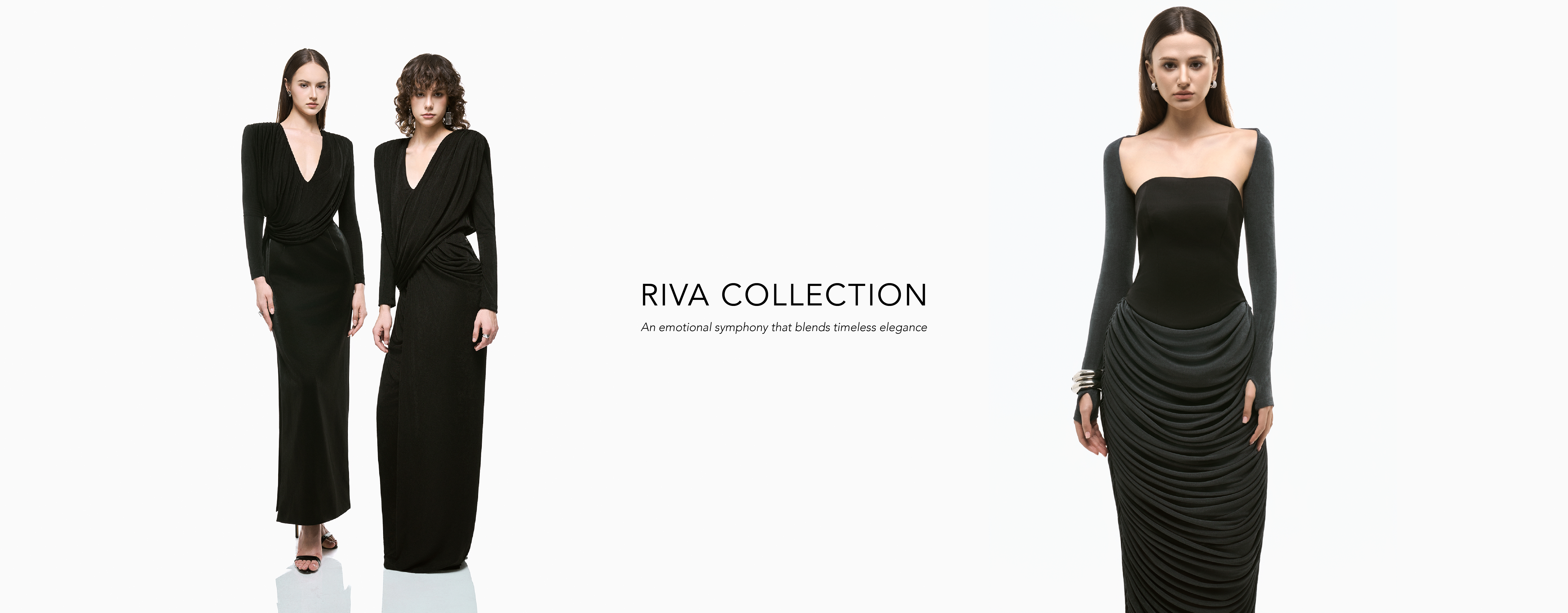 Aveline is cut from twinkle jersey spandex into a softly contoured column silhouette. A draped neckline falls into layered folds across the chest, while elongated fitted sleeves and gathered side panels guide the skirt into a long continuous line. A form that moves in calm...
