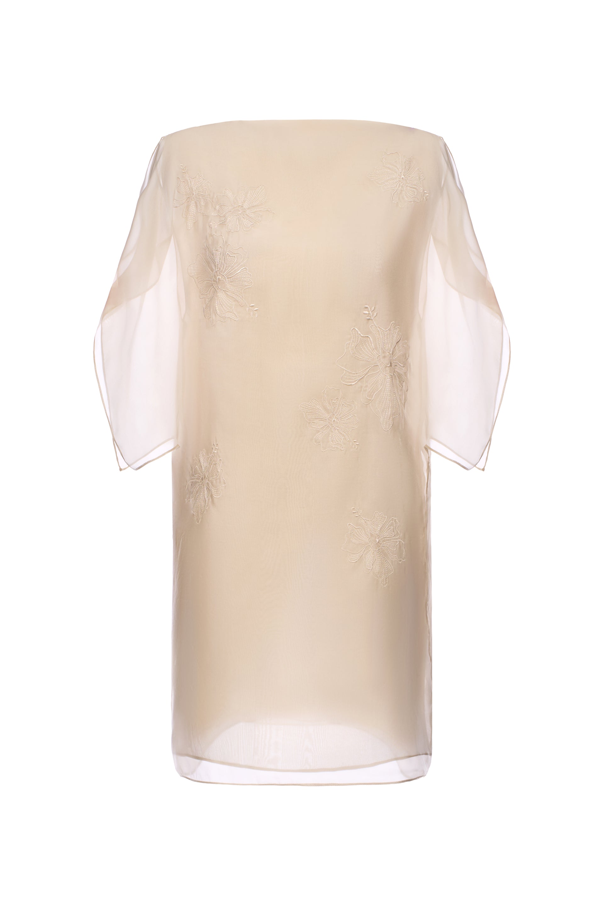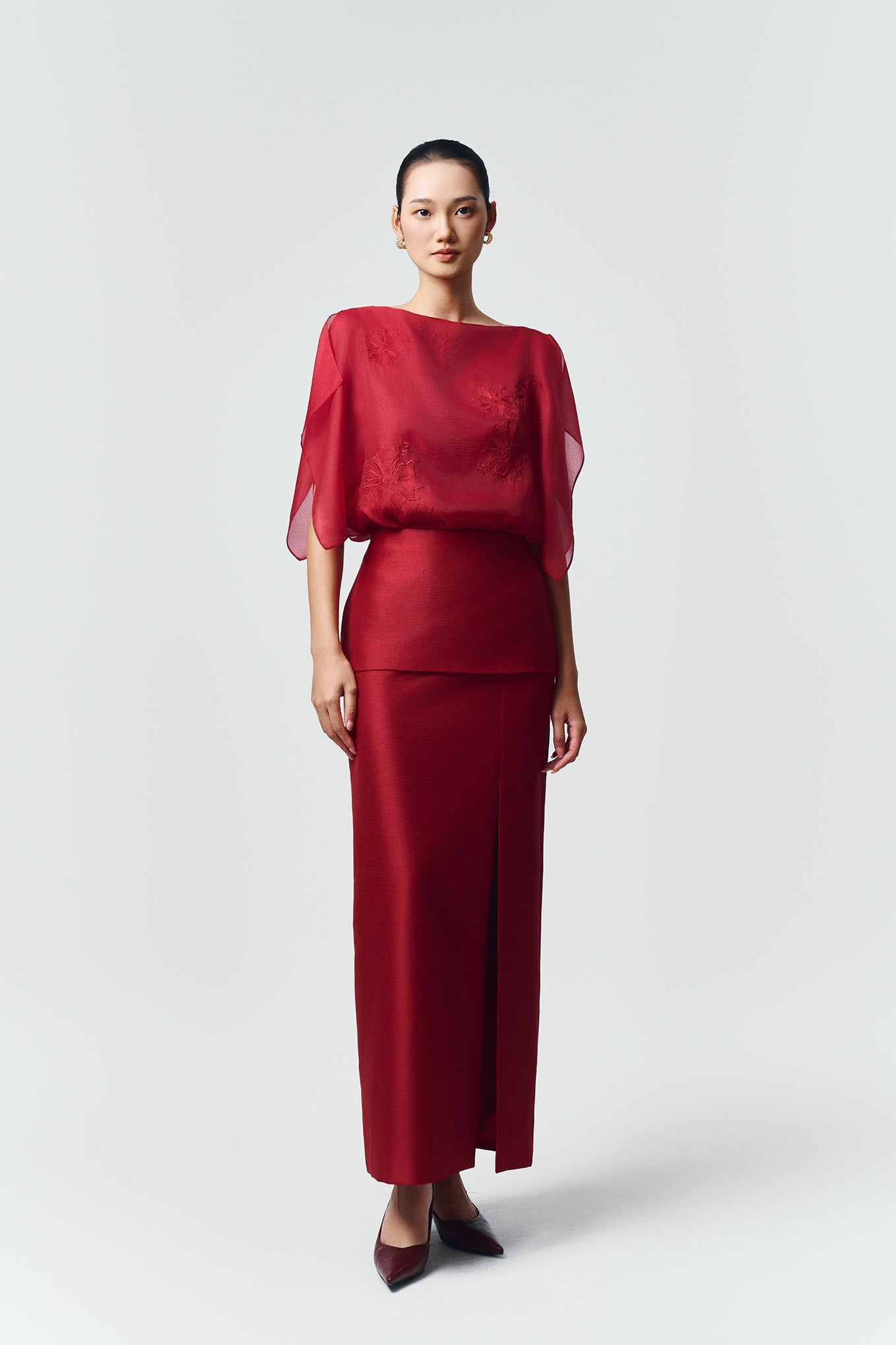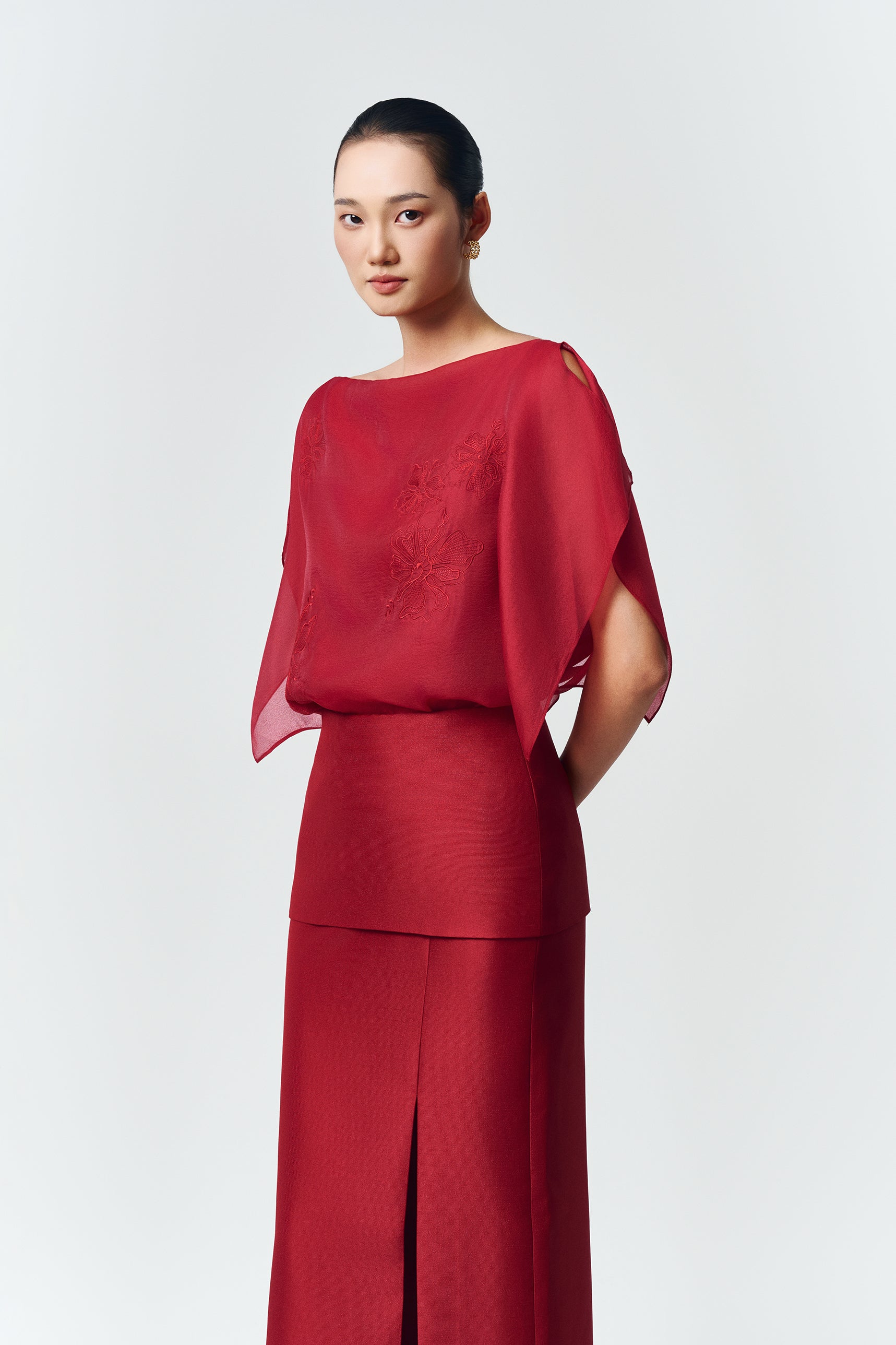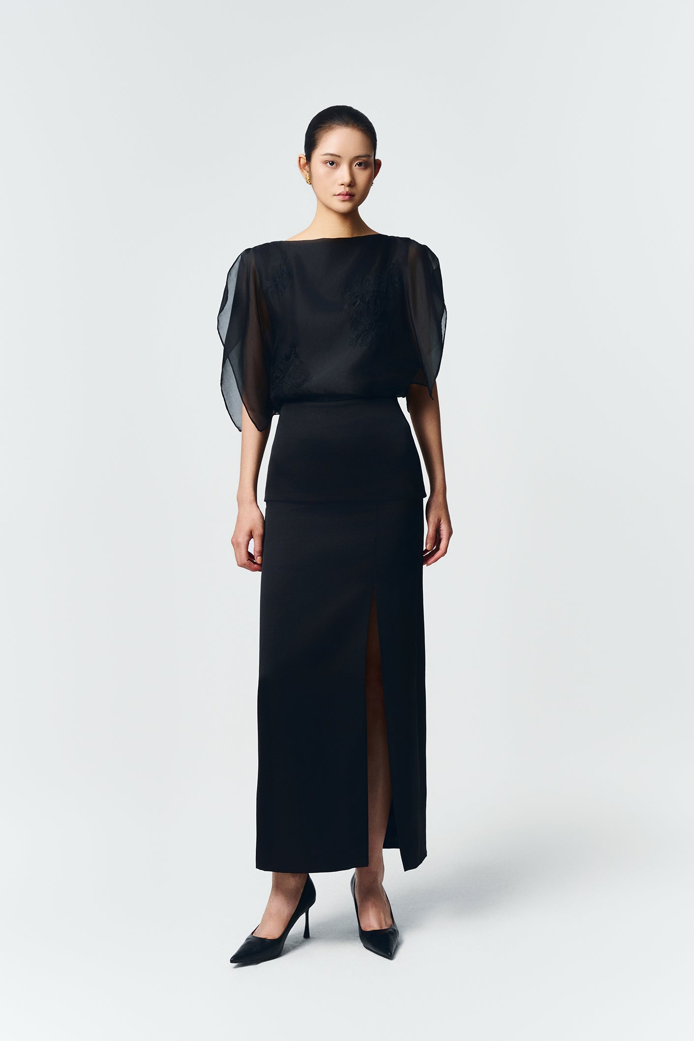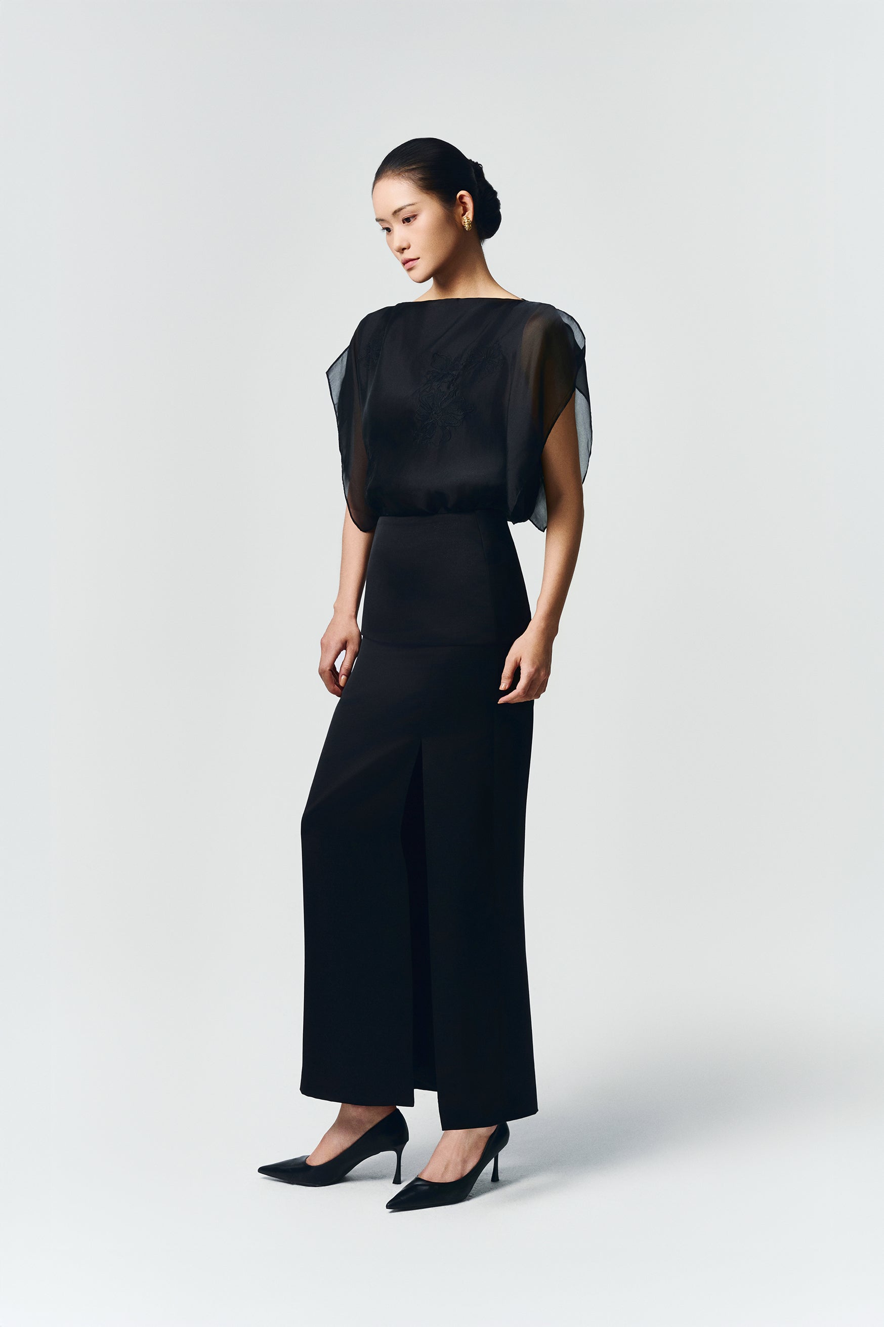 Soft organza blouse with exclusive embroidery for Eegen. Lightweight and finely crafted. Pairs well with skirts or pants for an elegant look.
