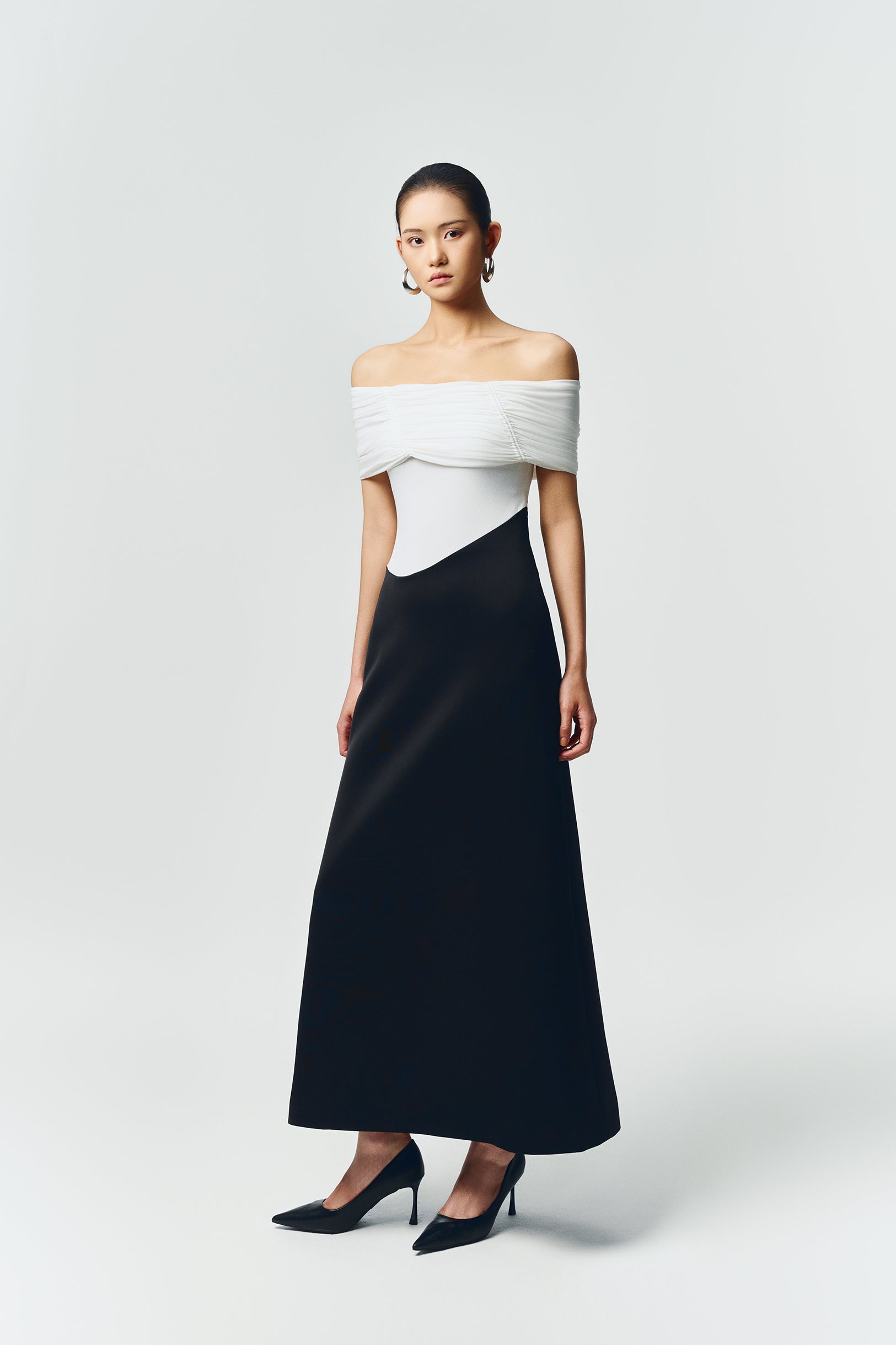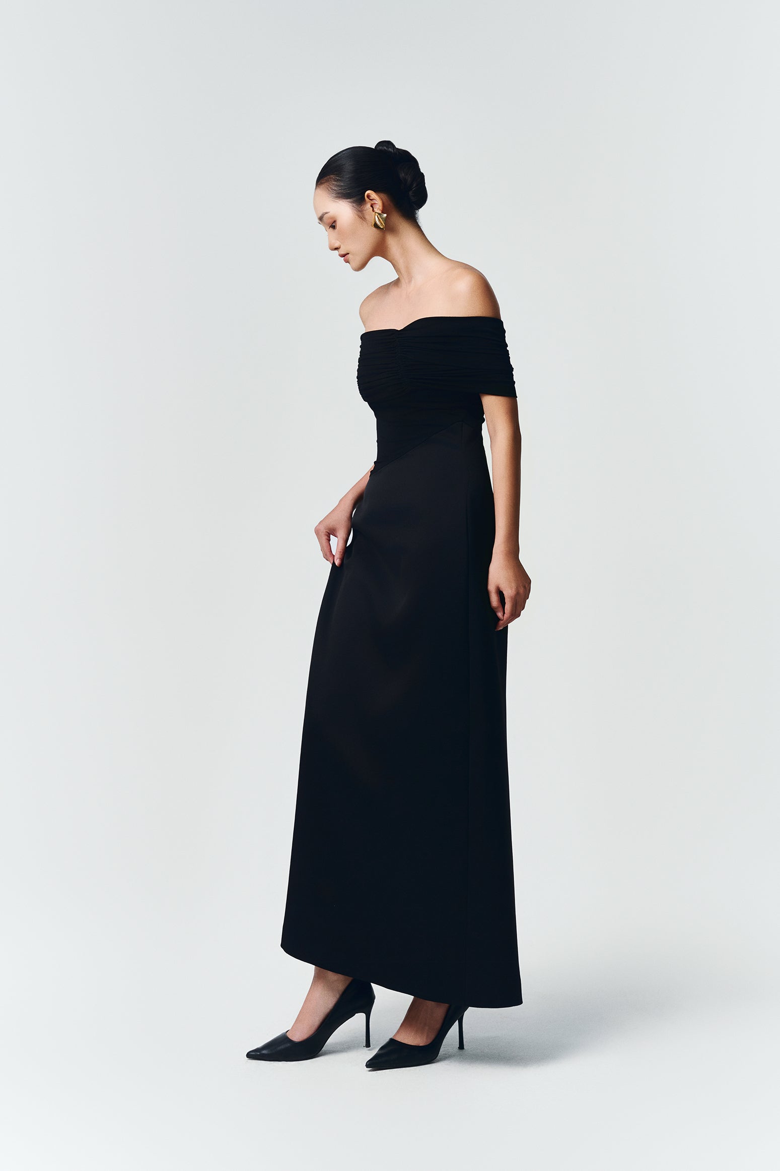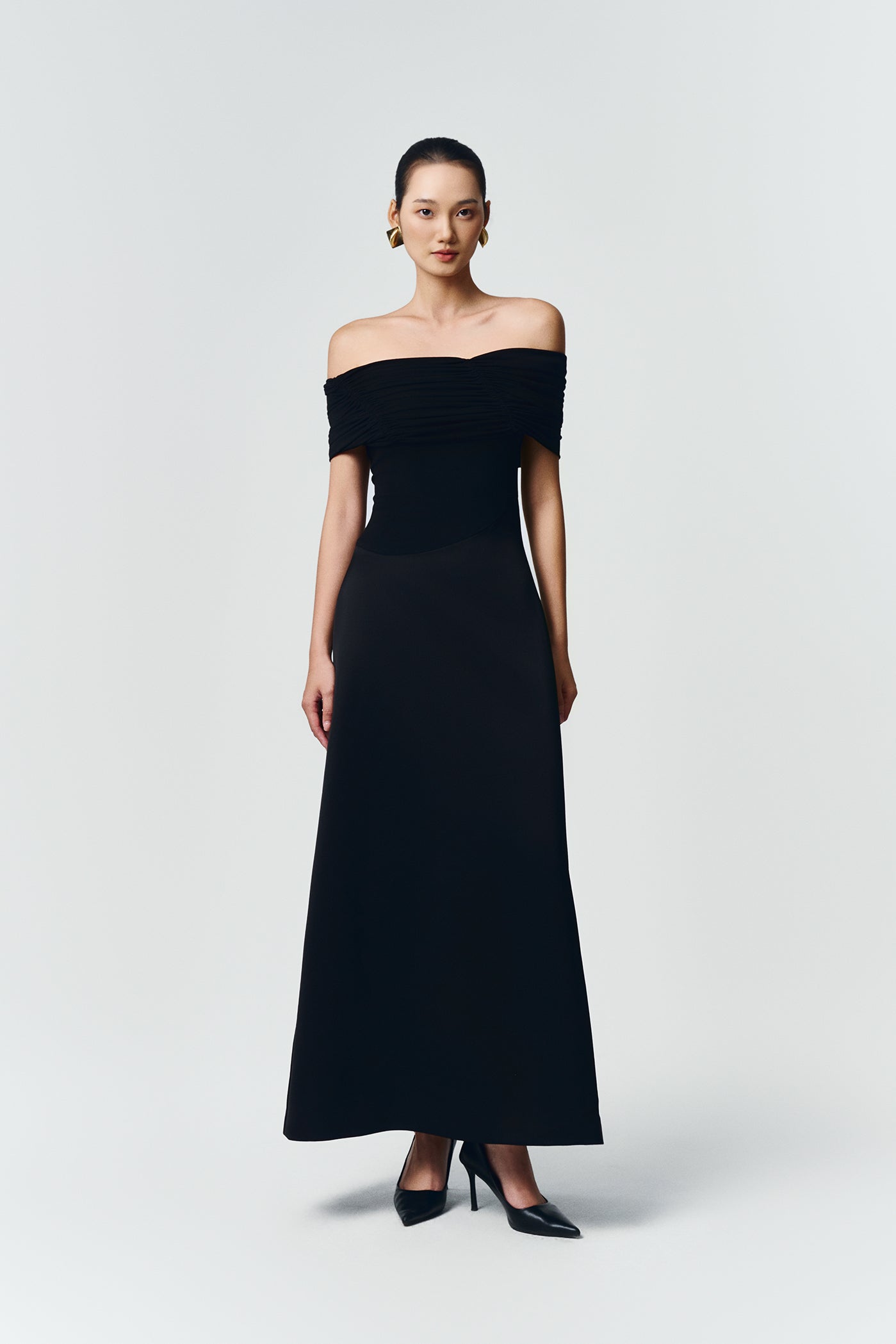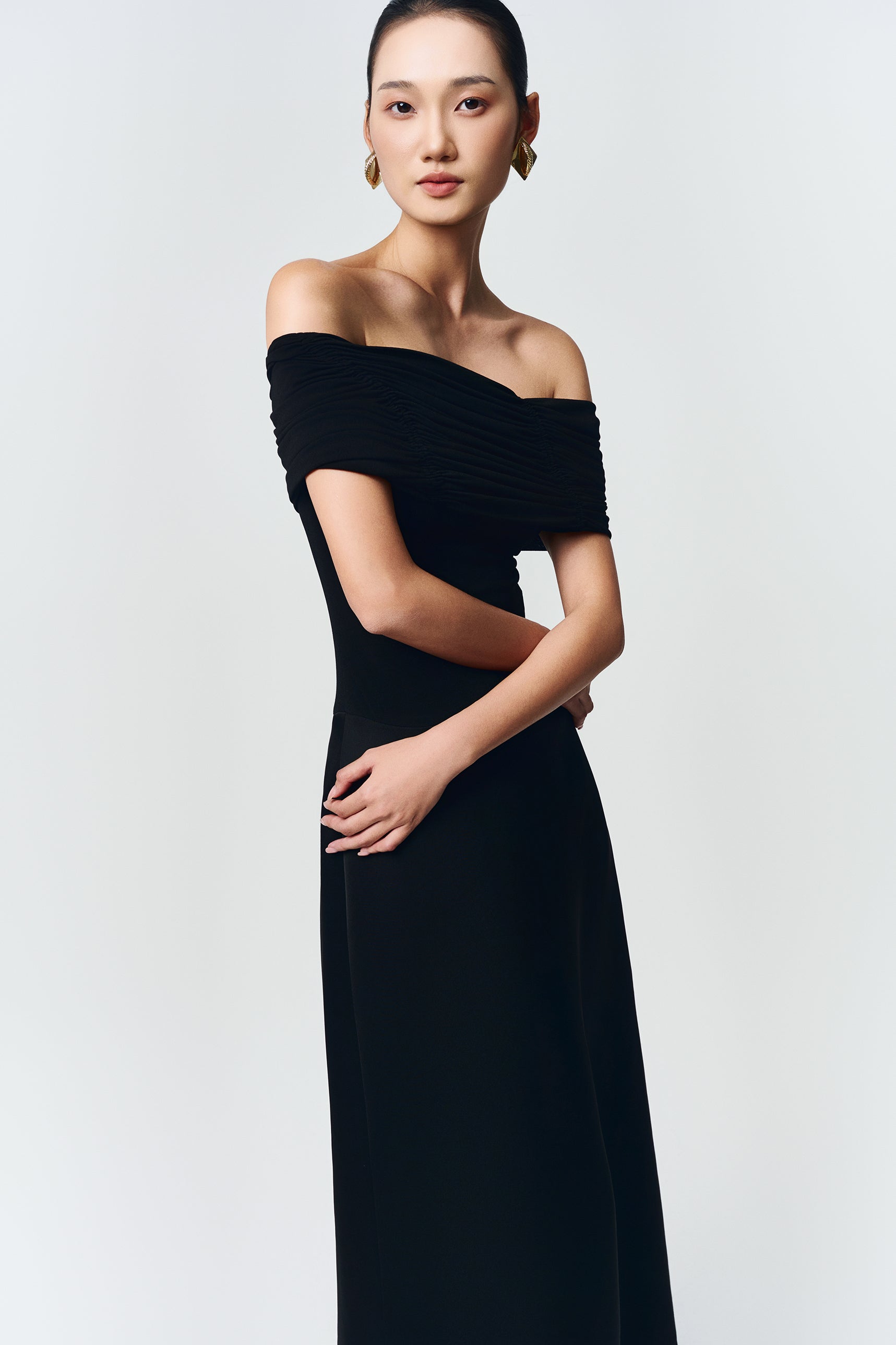 Off-shoulder A-line dress. Fitted stretchy jersey top for comfort. Highlight with gathered shoulder overlay. Bottom made of light shiny taffeta with volume, creating a hip-enhancing silhouette. Fully lined with silk and back zipper.