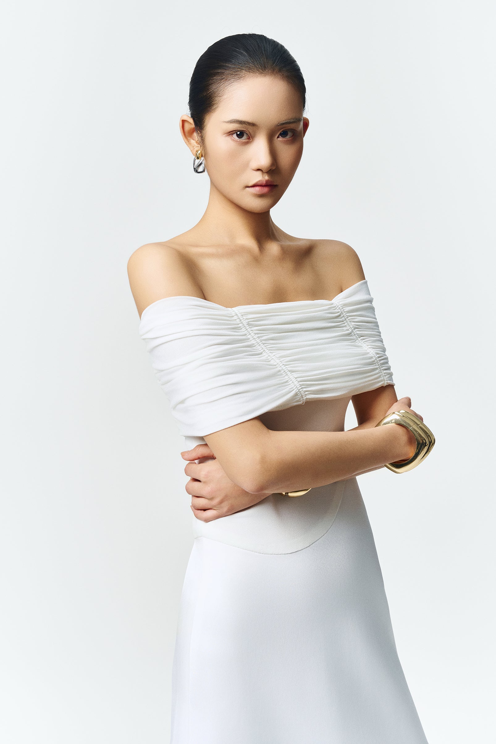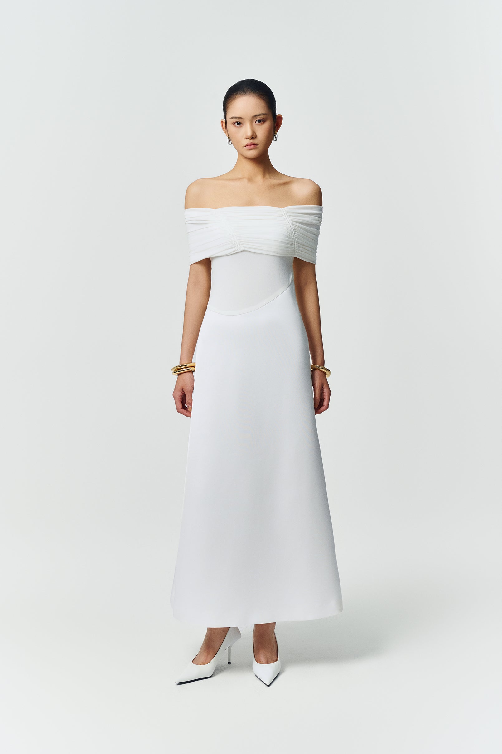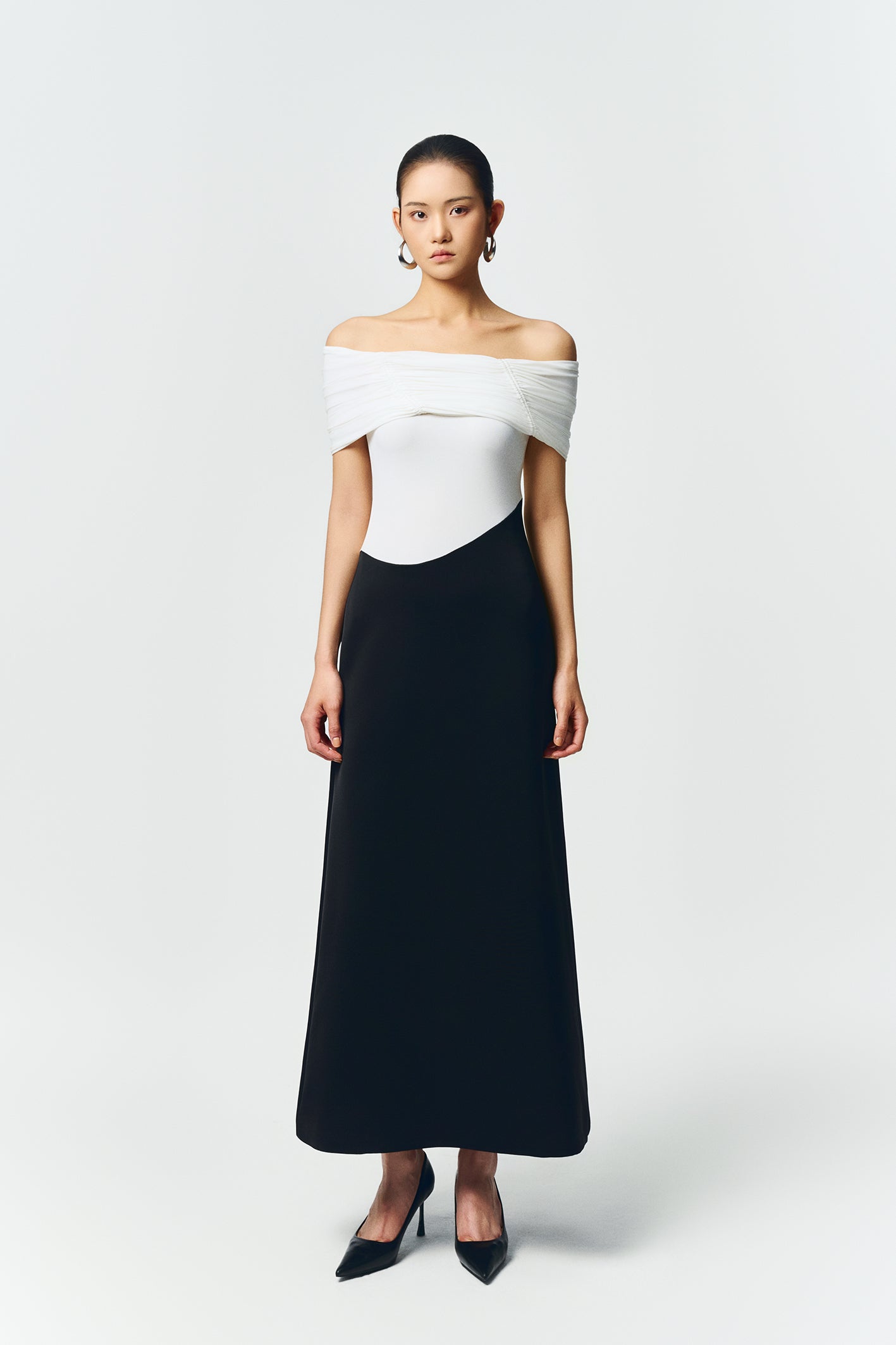 Off-shoulder A-line dress. Fitted stretchy jersey top for comfort. Highlight with gathered shoulder overlay. Bottom made of light shiny taffeta with volume, creating a hip-enhancing silhouette. Fully lined with silk and back zipper.