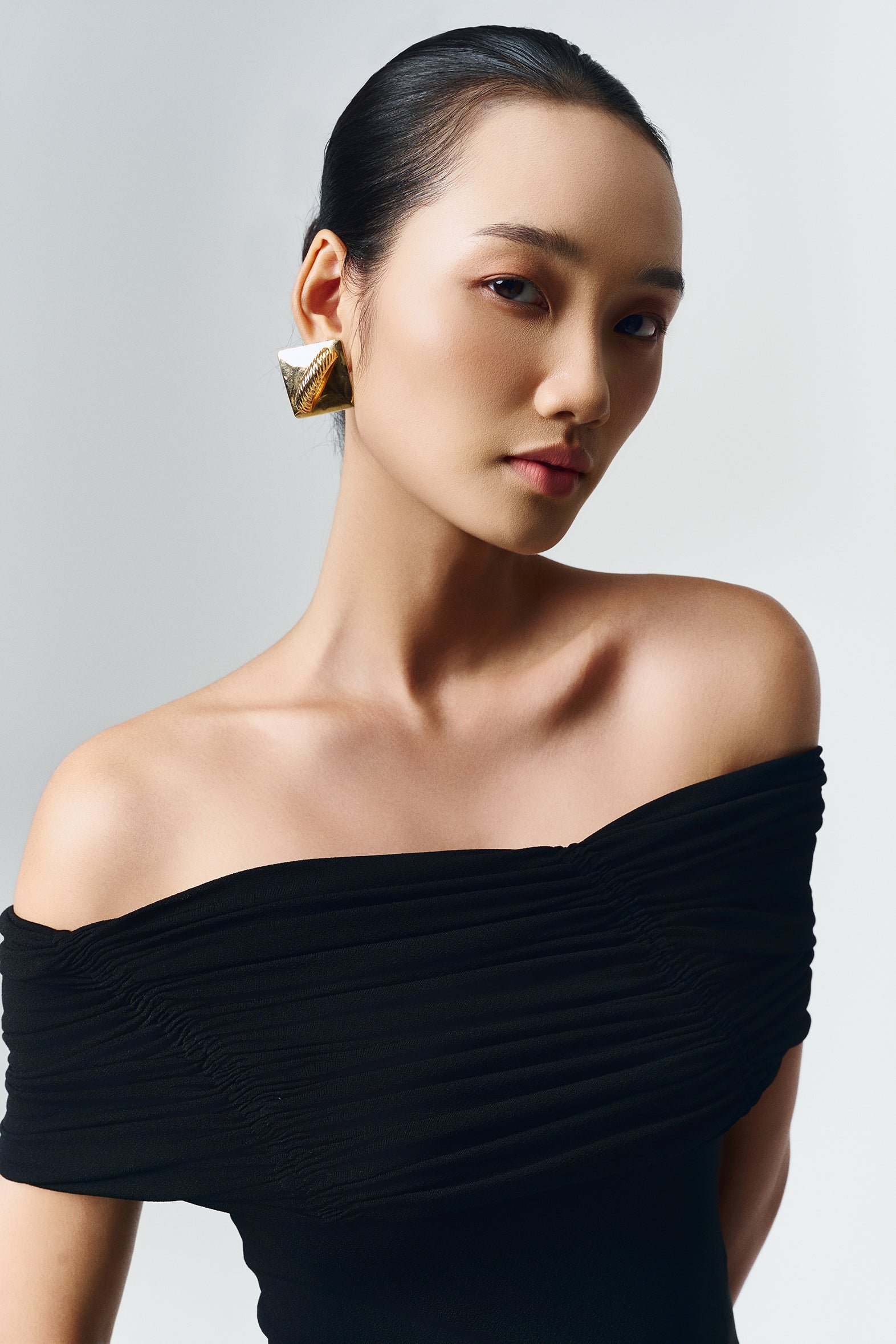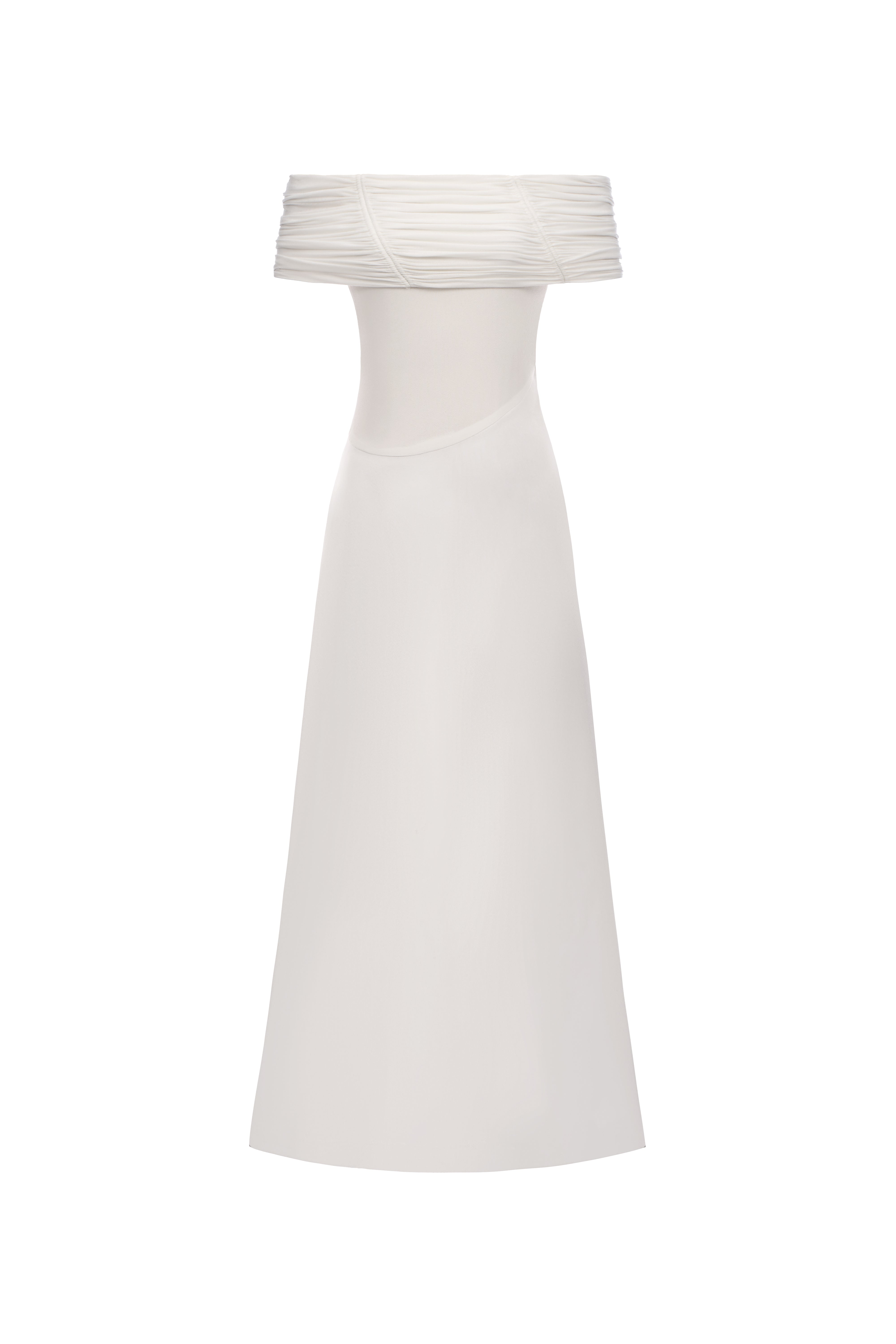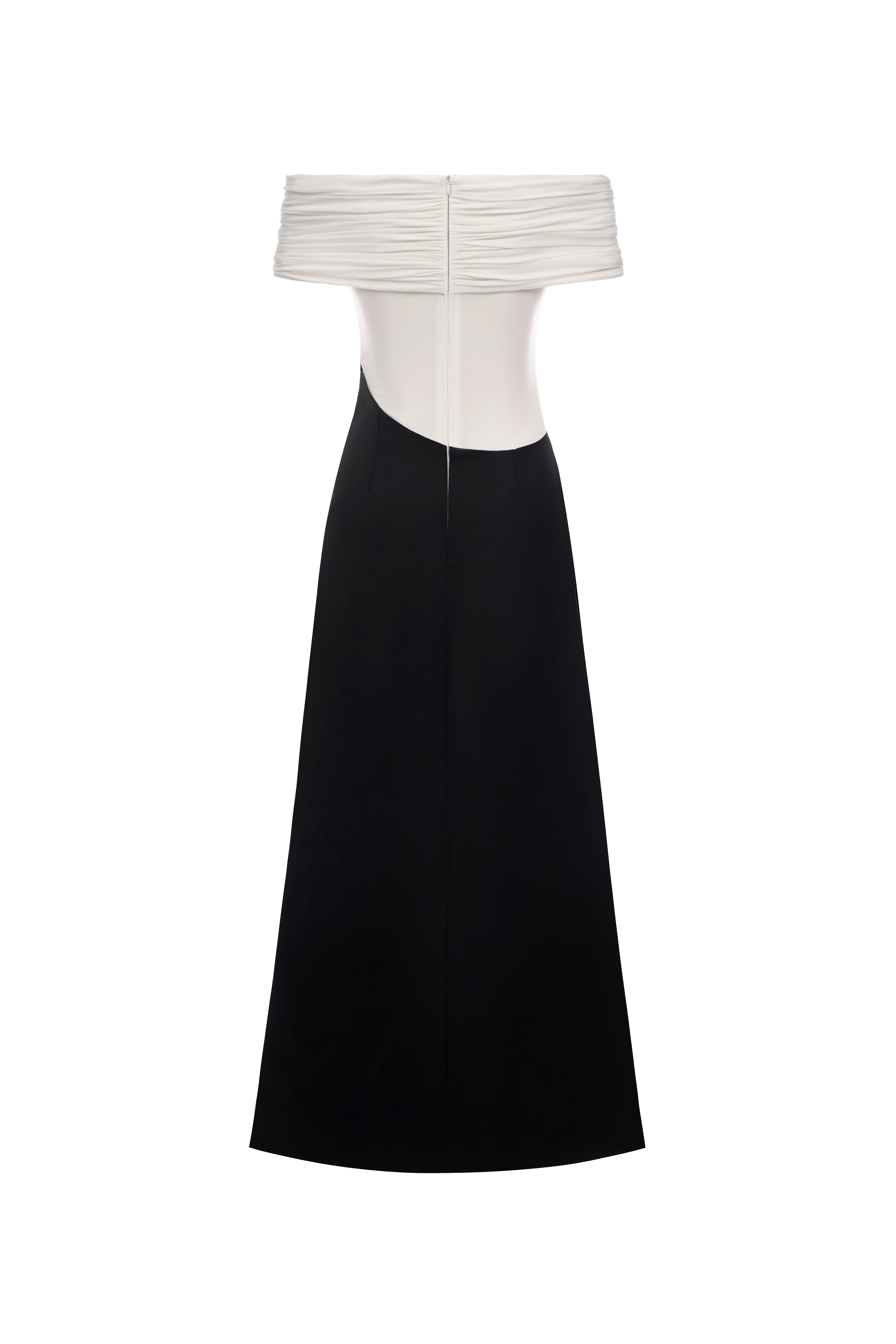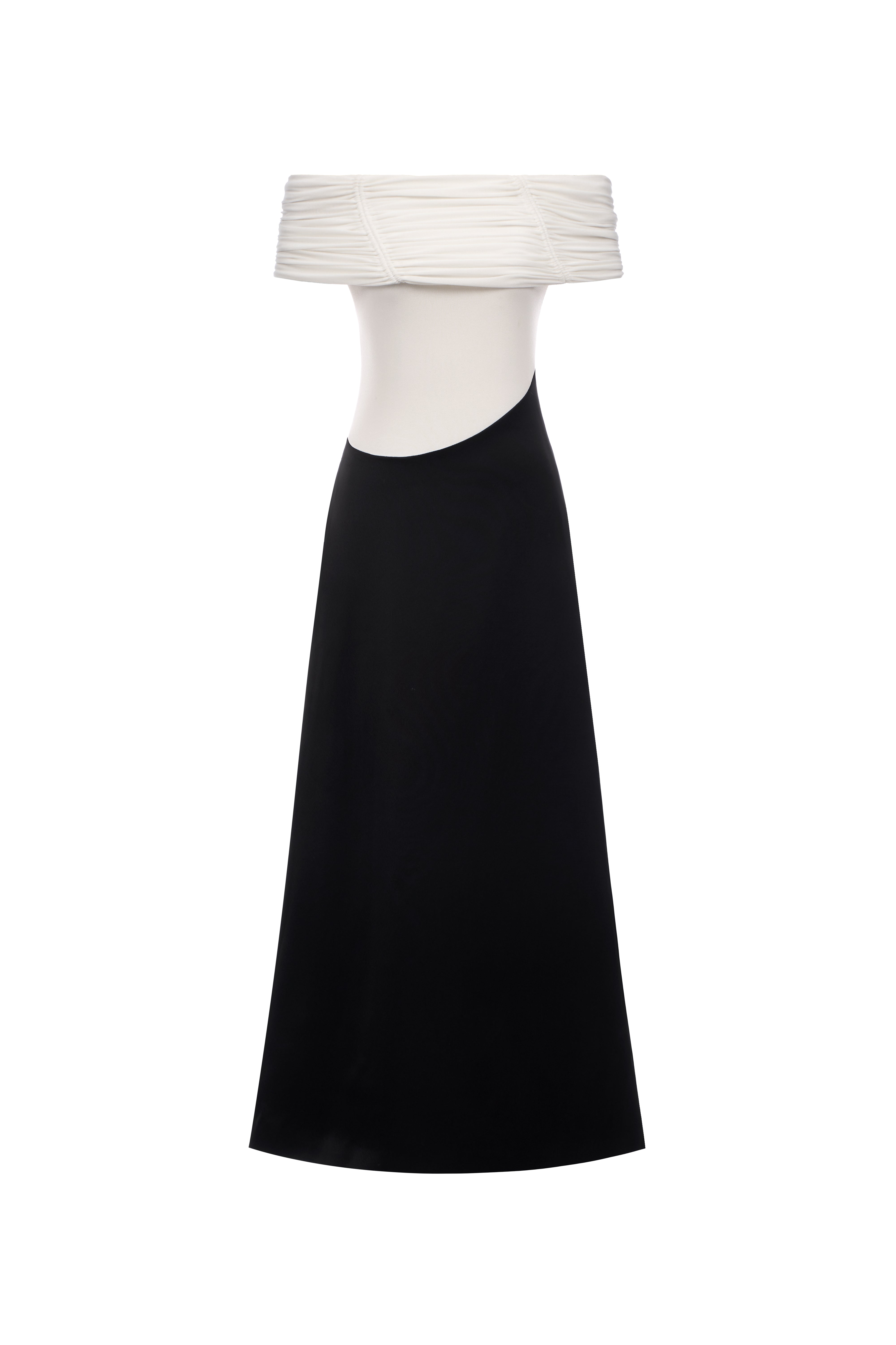 Off-shoulder A-line dress. Fitted stretchy jersey top for comfort. Highlight with gathered shoulder overlay. Bottom made of light shiny taffeta with volume, creating a hip-enhancing silhouette. Fully lined with silk and back zipper.