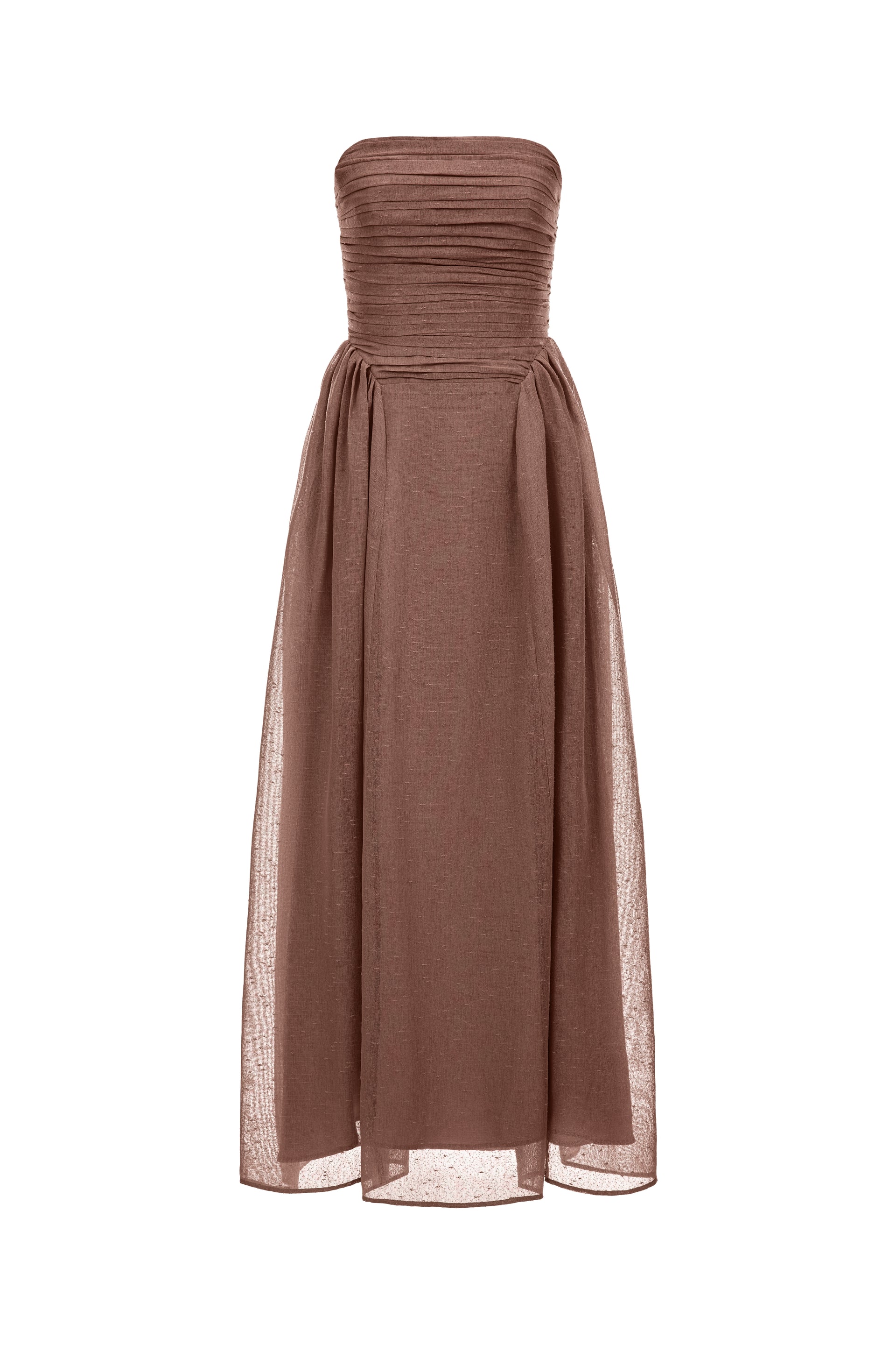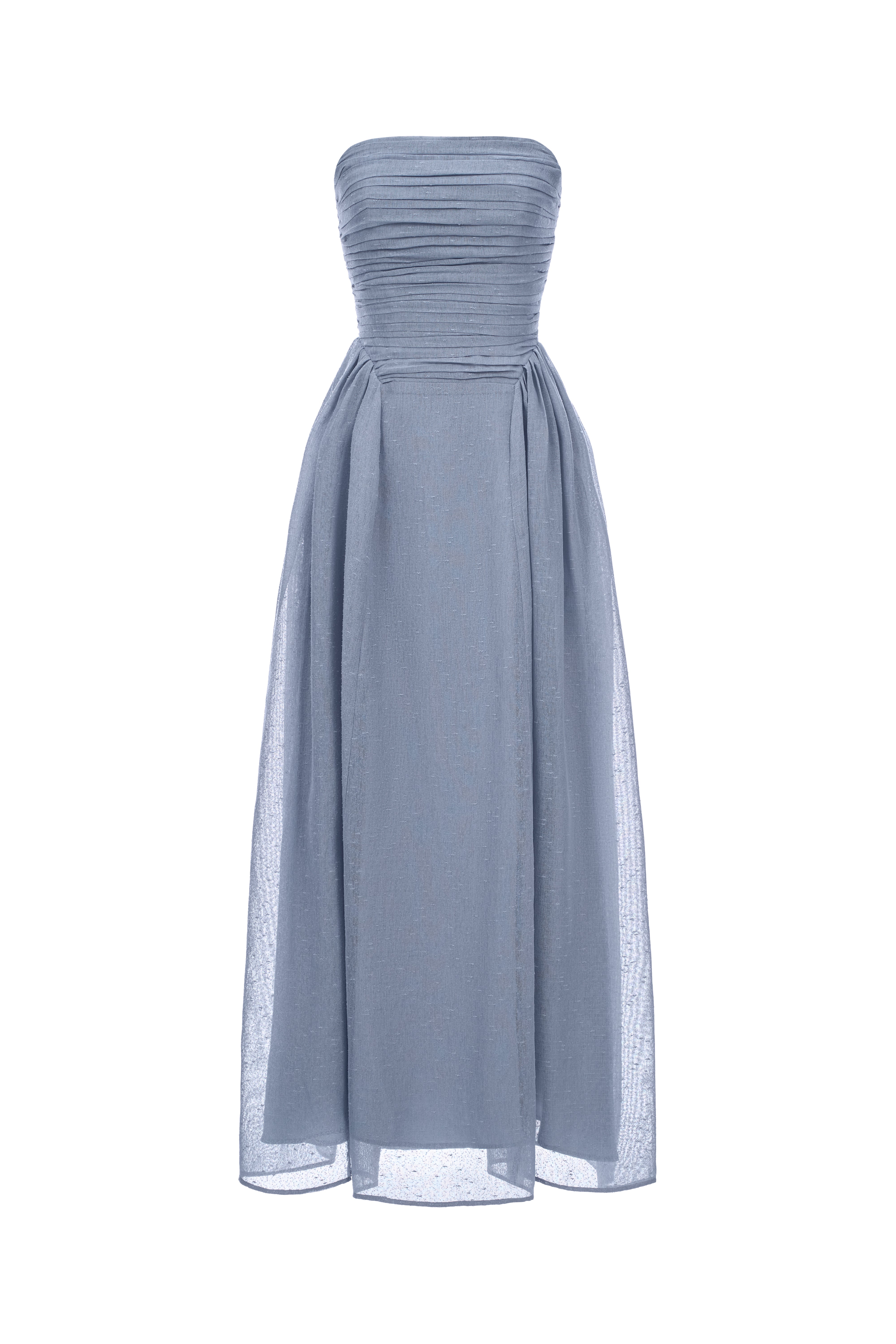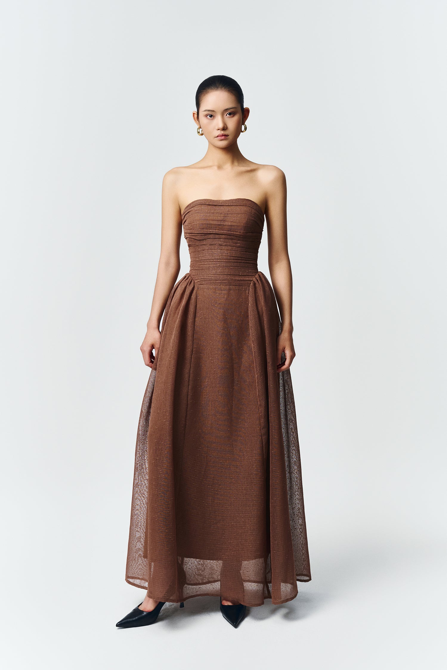 Strapless A-line flared dress in linen organza. Hand-pleated top with 3D draping for a precise fit. Bottom flared with hip volume effect, enhancing waist-hip contrast. Fully lined with soft silk and back zipper.