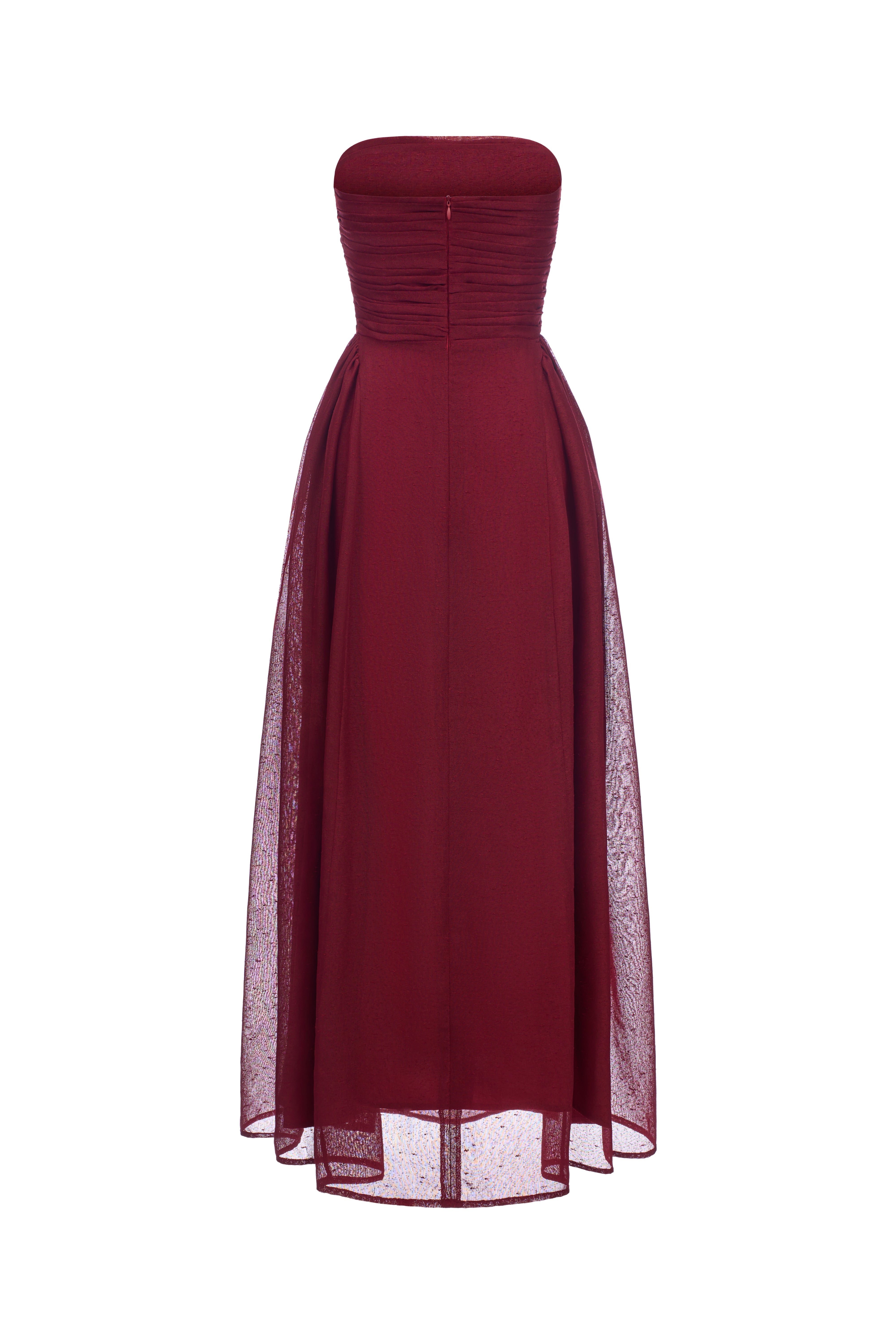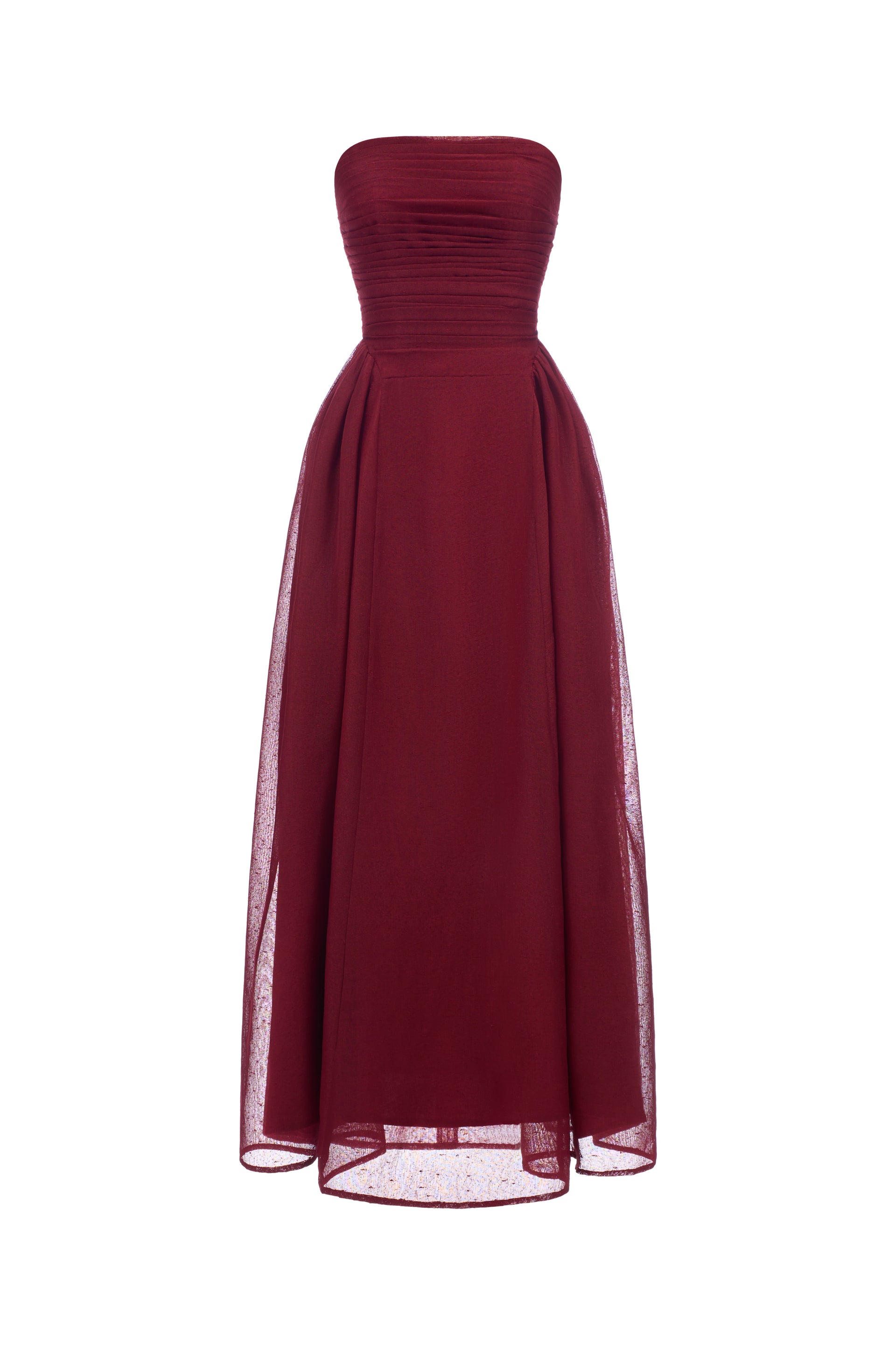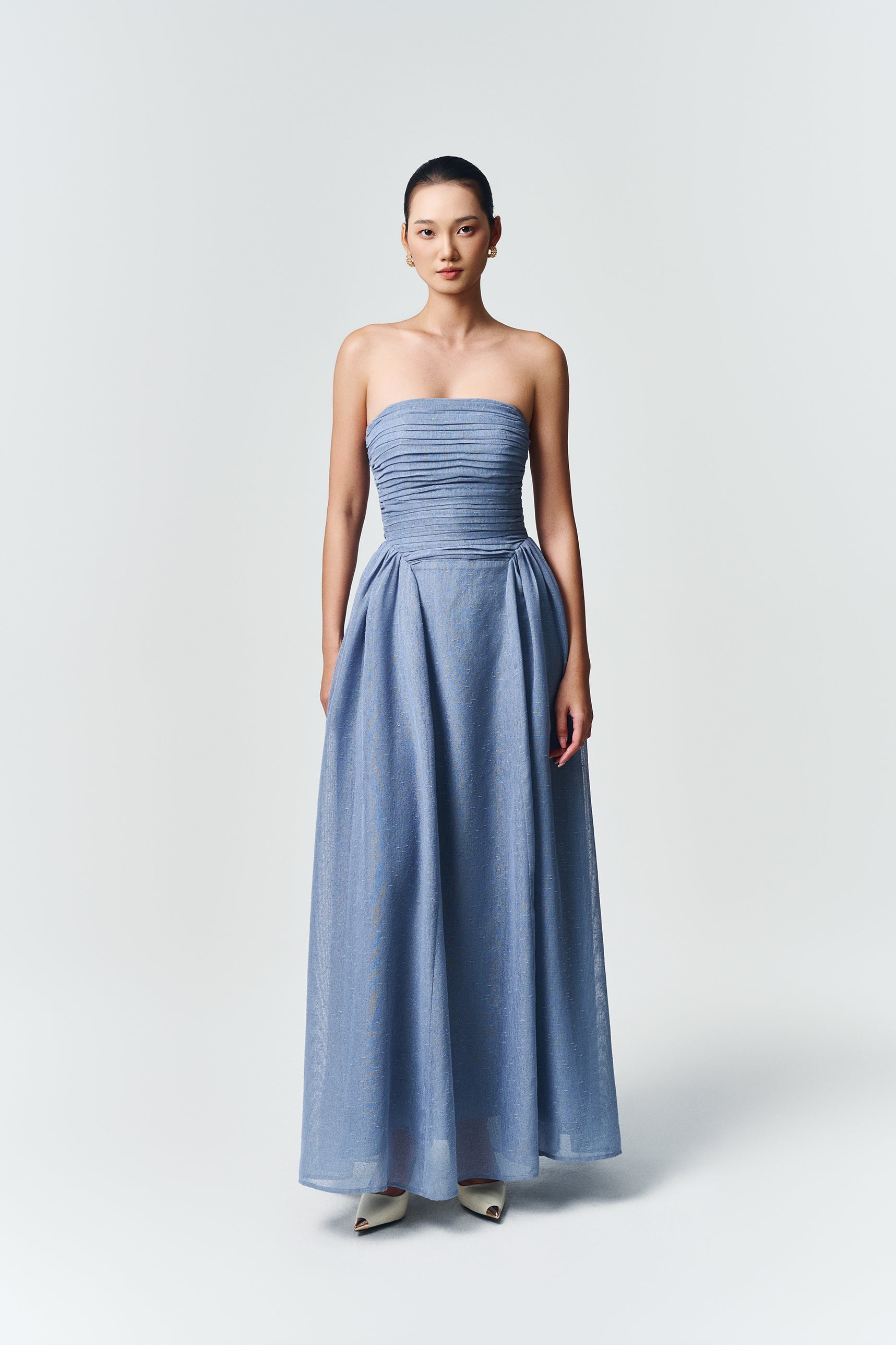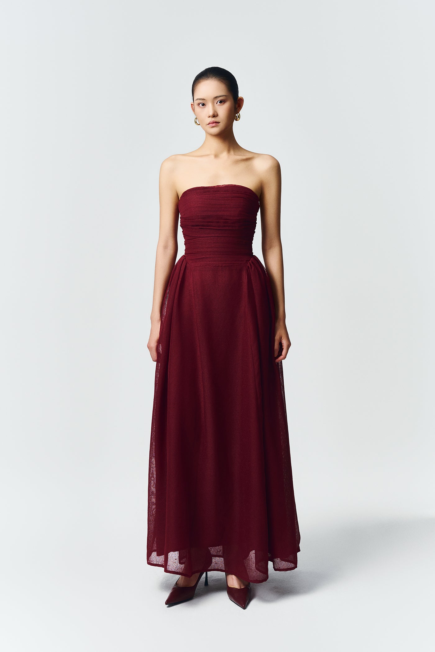 Strapless A-line flared dress in linen organza. Hand-pleated top with 3D draping for a precise fit. Bottom flared with hip volume effect, enhancing waist-hip contrast. Fully lined with soft silk and back zipper.