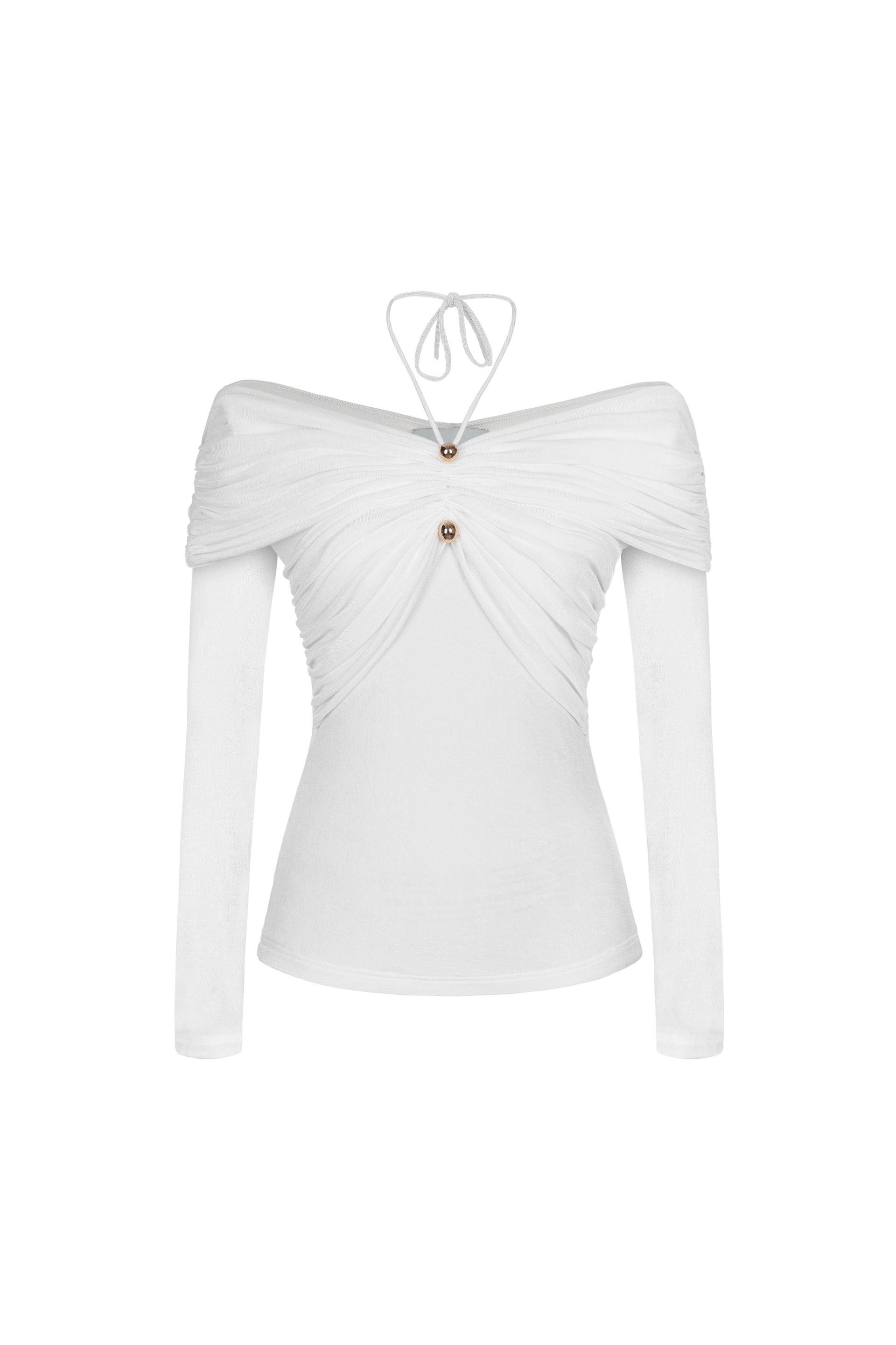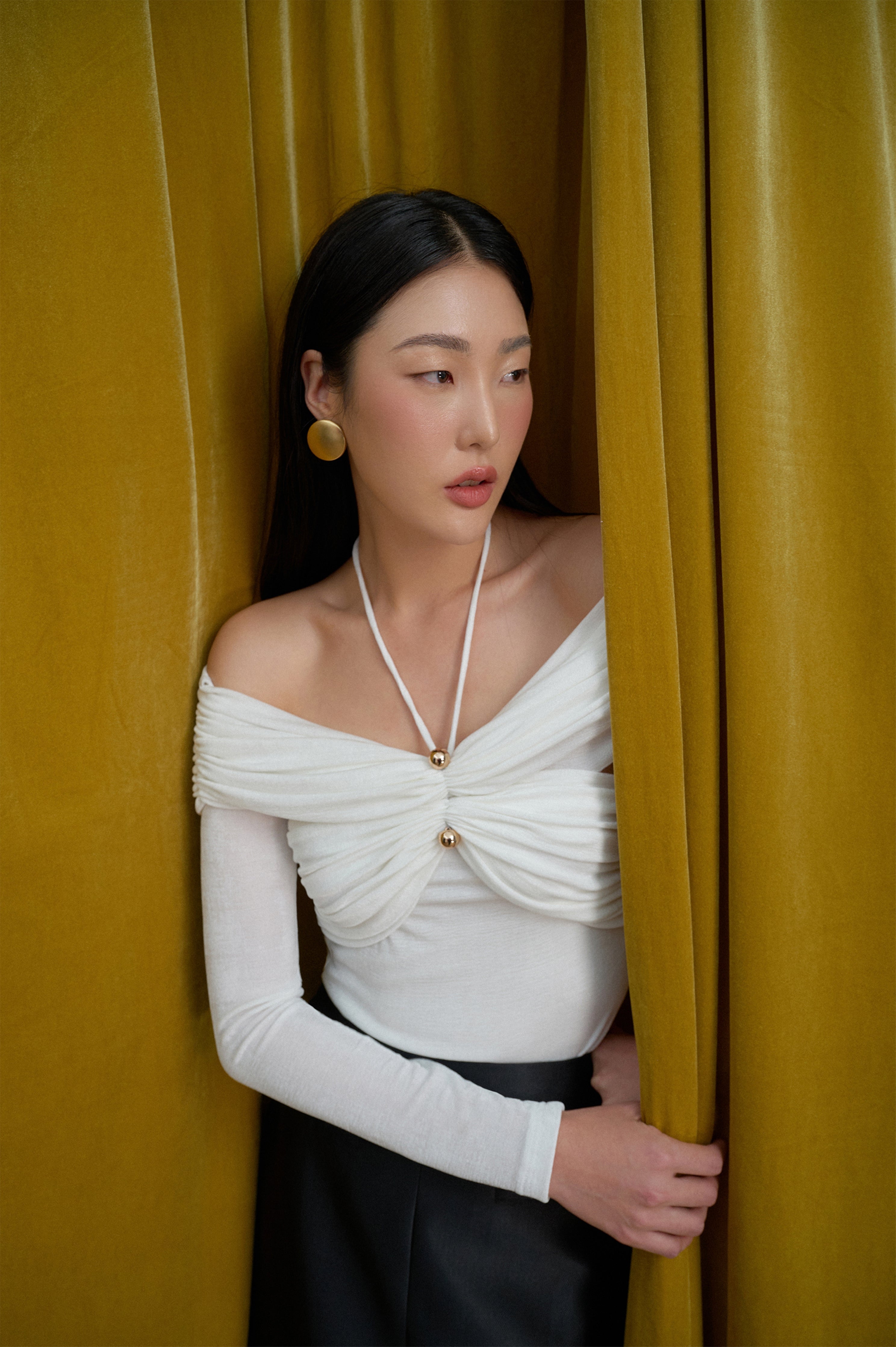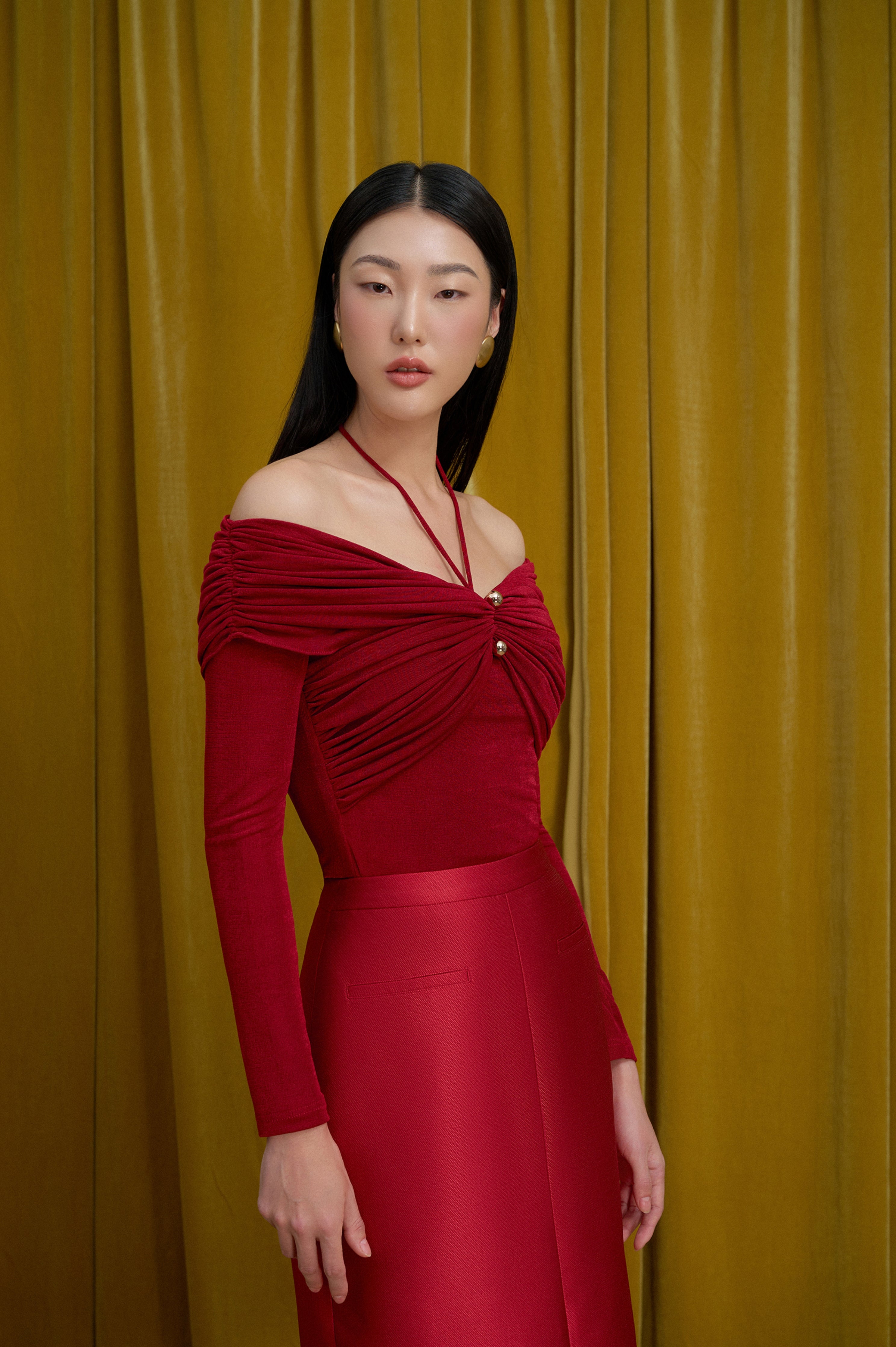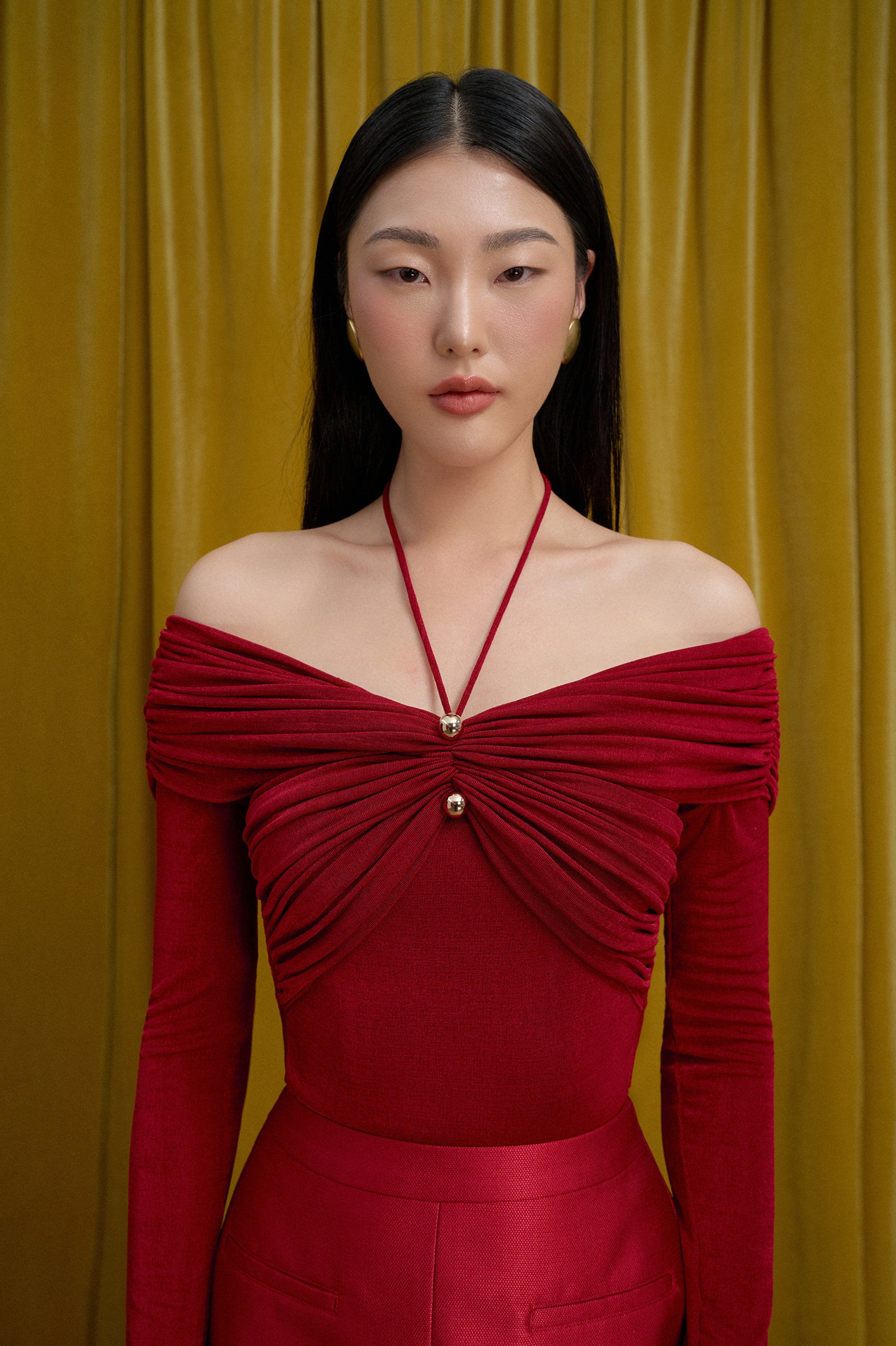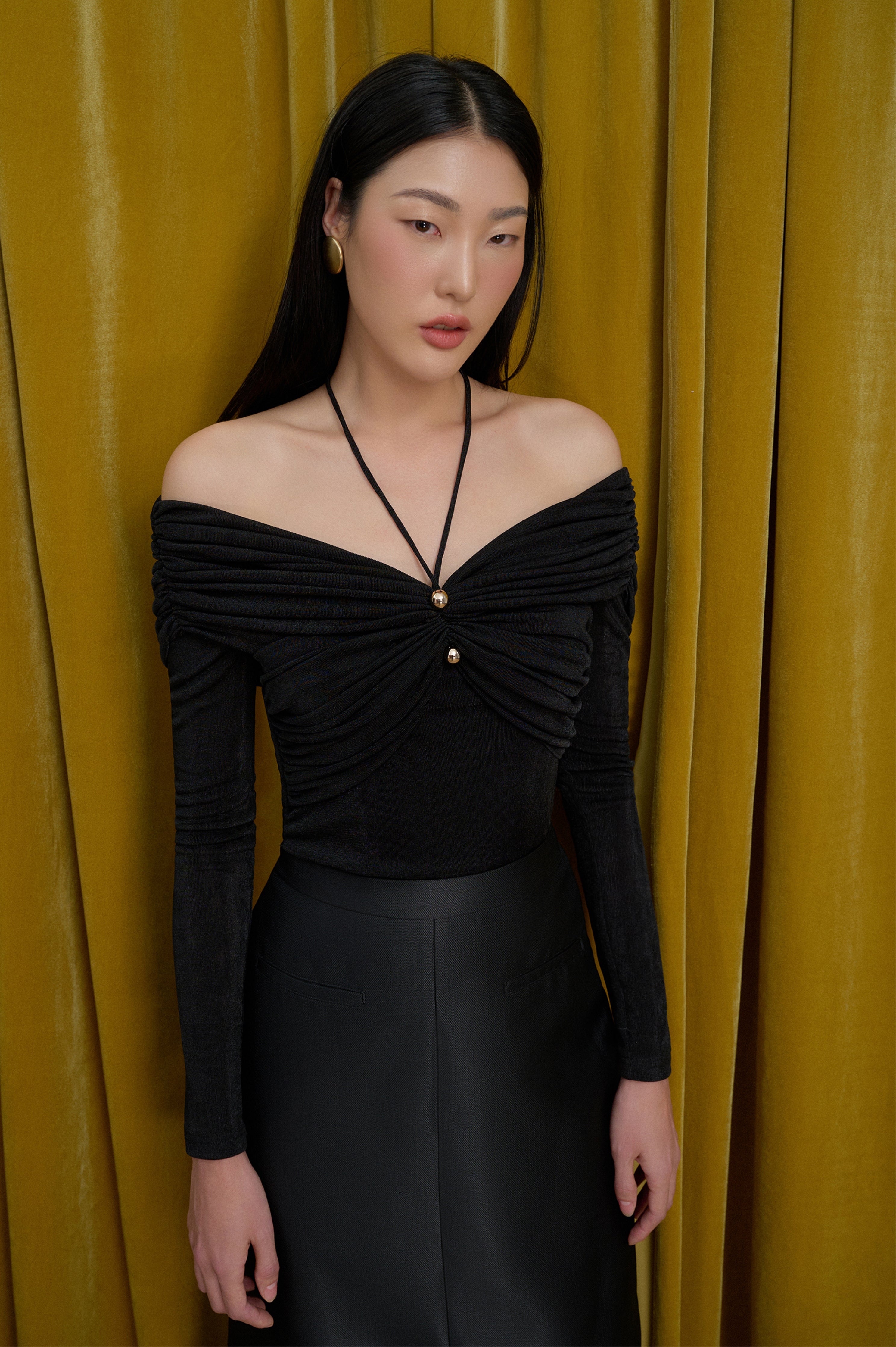 Look stylish and sophisticated with our body-hugging top featuring a tied collar with a golden button and pleated chest and shoulders that add a chic gathered effect. Perfect for both casual and formal occasions. Β  Note:*The product is ready to ship, shipping time varies from 5-15 days.**The product can be customized based on the measurement of 3 circumferences (bust, waist, hip) with an additional cost of 10-25%, and the customization time takes 1-3 days. Please contact us via email support@eegenstudio.com or Eegen fanpage for further assistance. Product details Body-hugging top with a tied collar, adorned with a golden button, pleated...