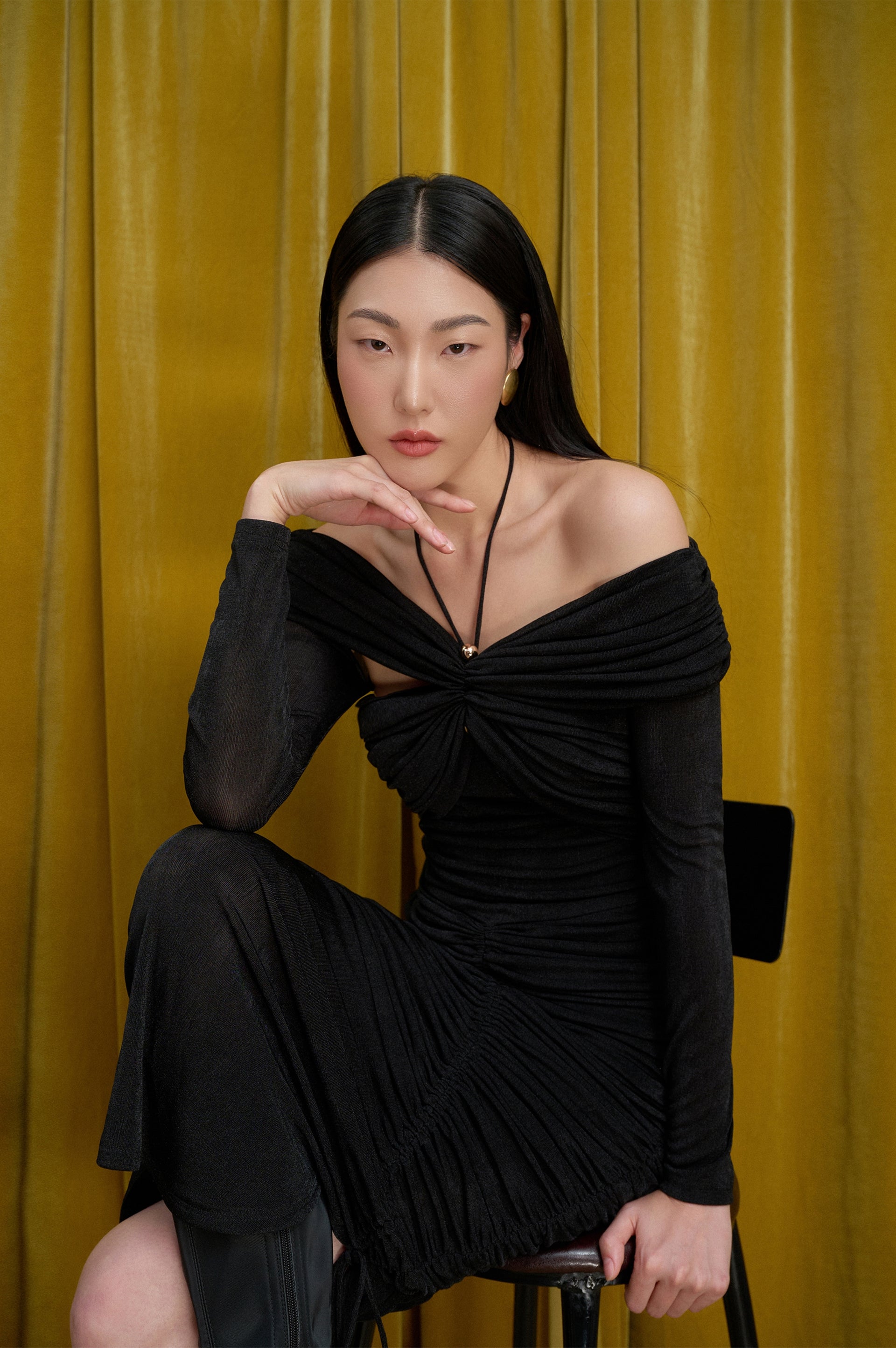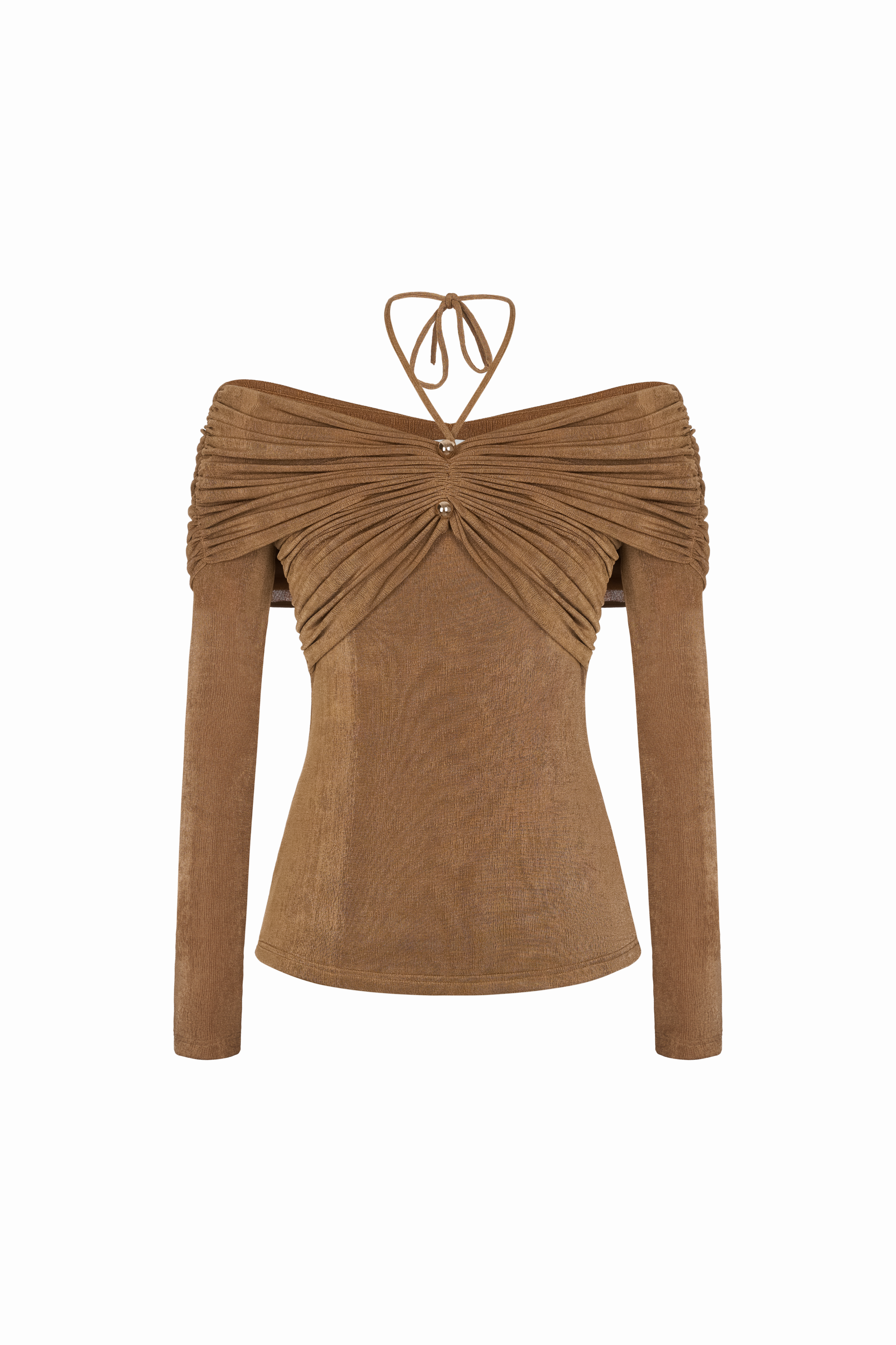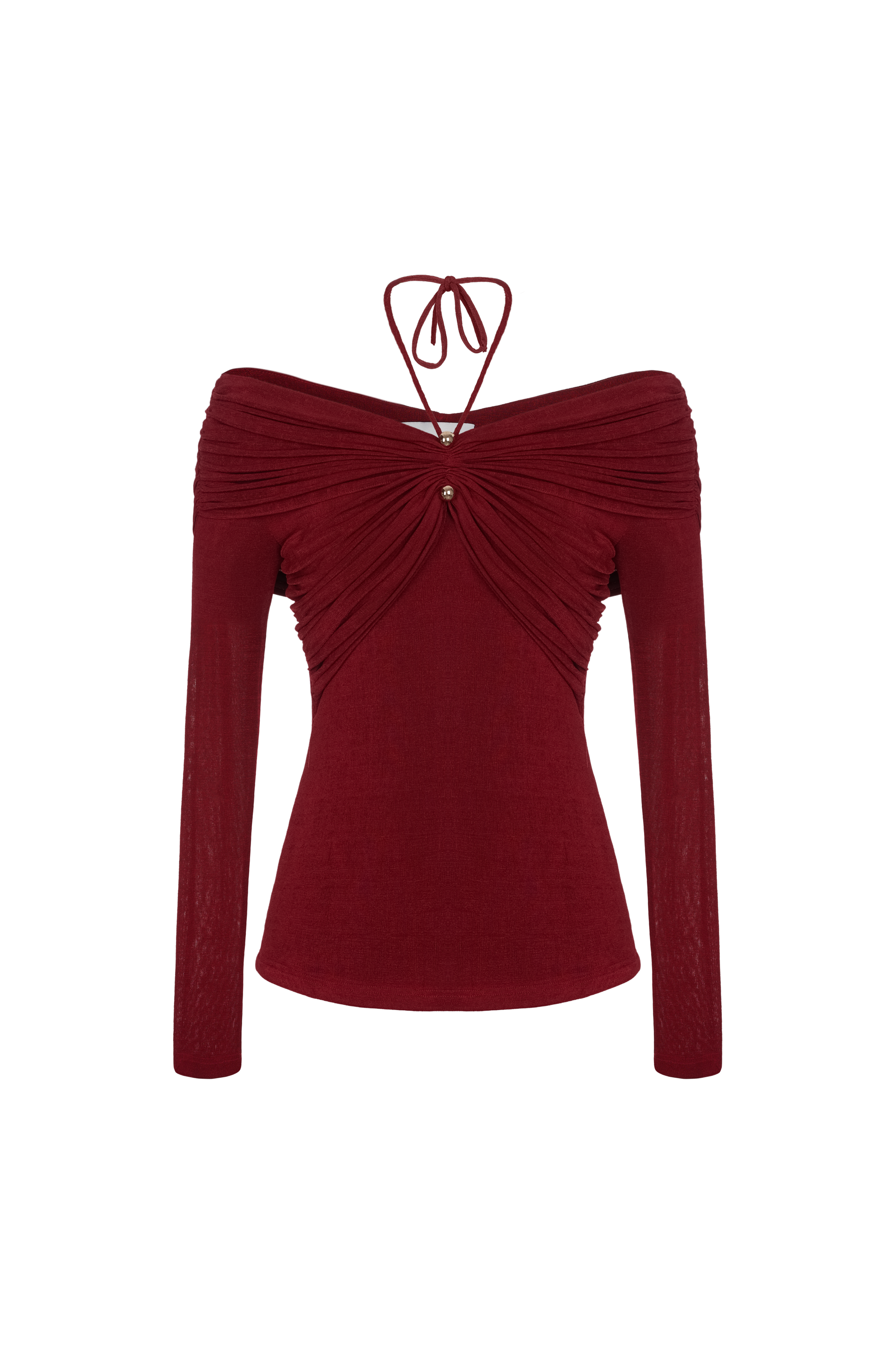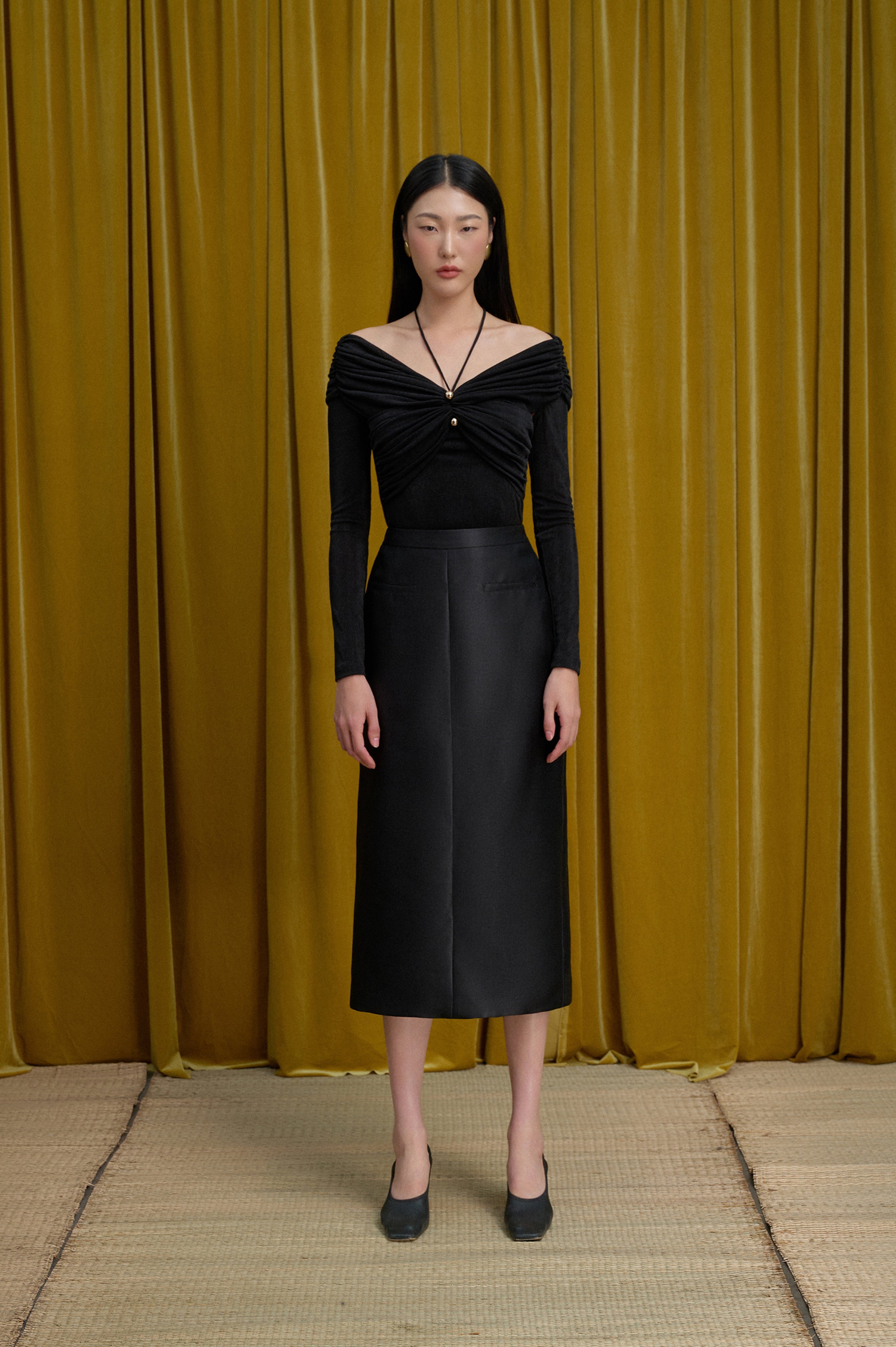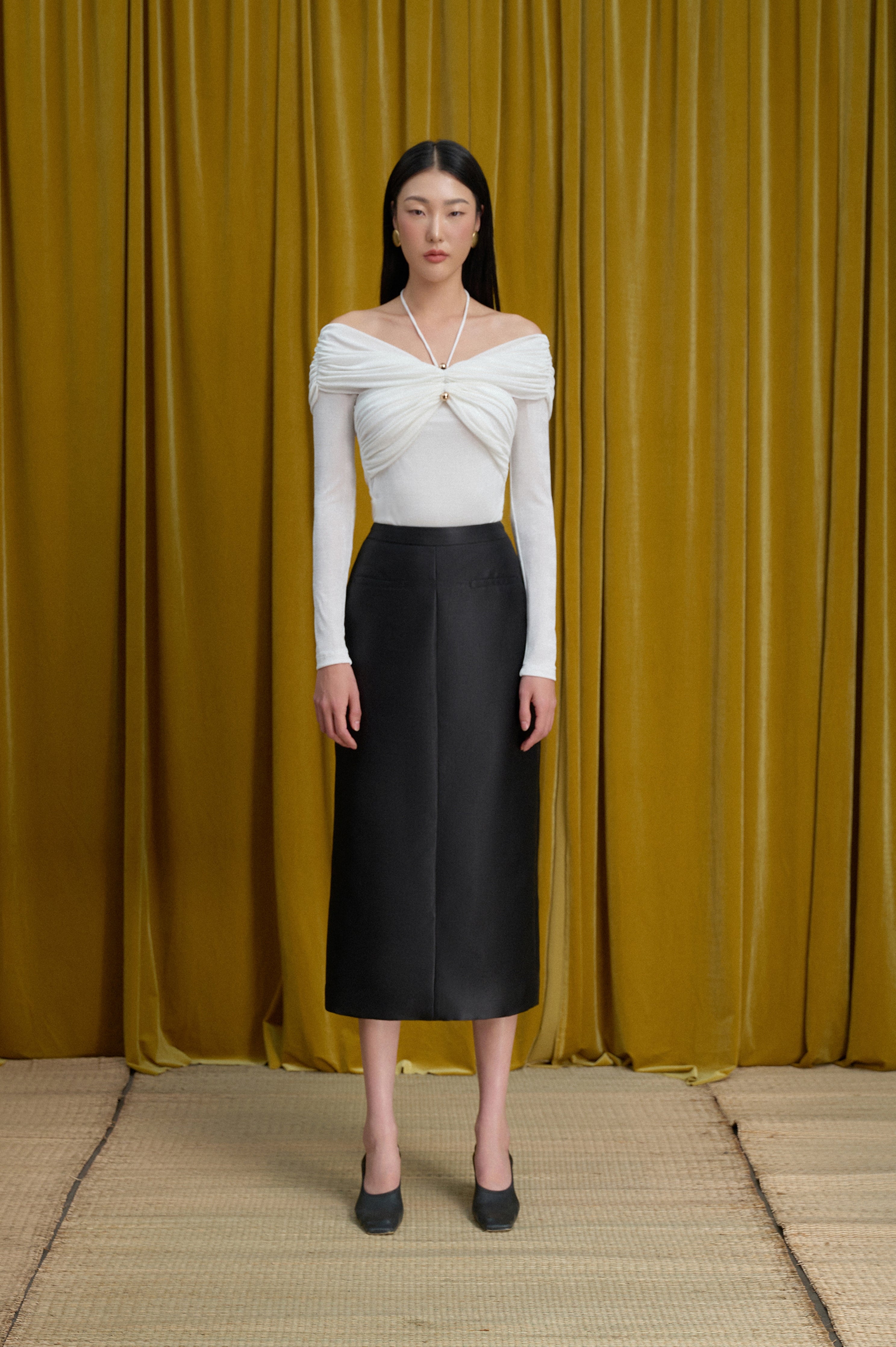 Look stylish and sophisticated with our body-hugging top featuring a tied collar with a golden button and pleated chest and shoulders that add a chic gathered effect. Perfect for both casual and formal occasions. Β  Note:*The product is ready to ship, shipping time varies from 5-15 days.**The product can be customized based on the measurement of 3 circumferences (bust, waist, hip) with an additional cost of 10-25%, and the customization time takes 1-3 days. Please contact us via email support@eegenstudio.com or Eegen fanpage for further assistance. Product details Body-hugging top with a tied collar, adorned with a golden button, pleated...