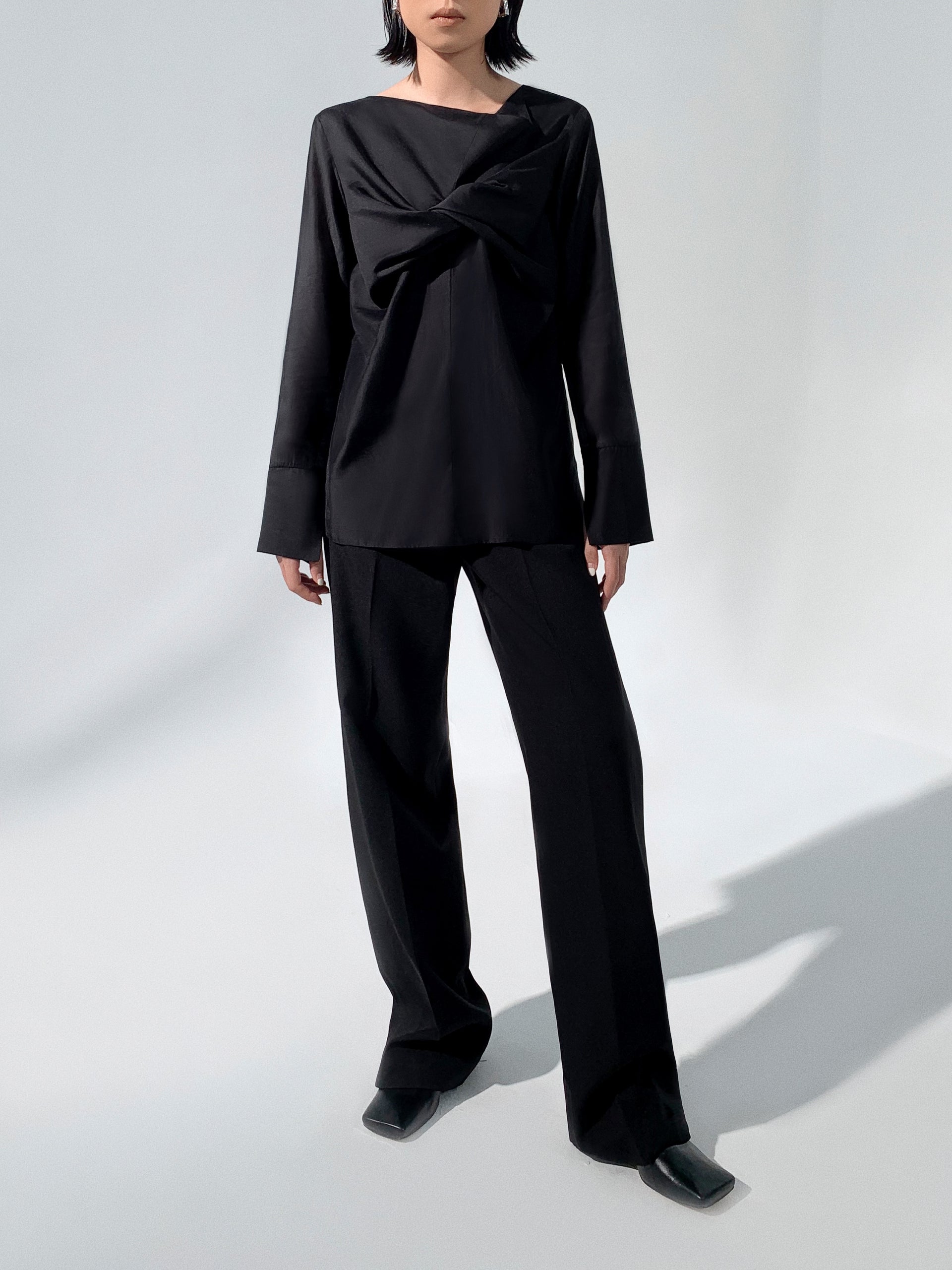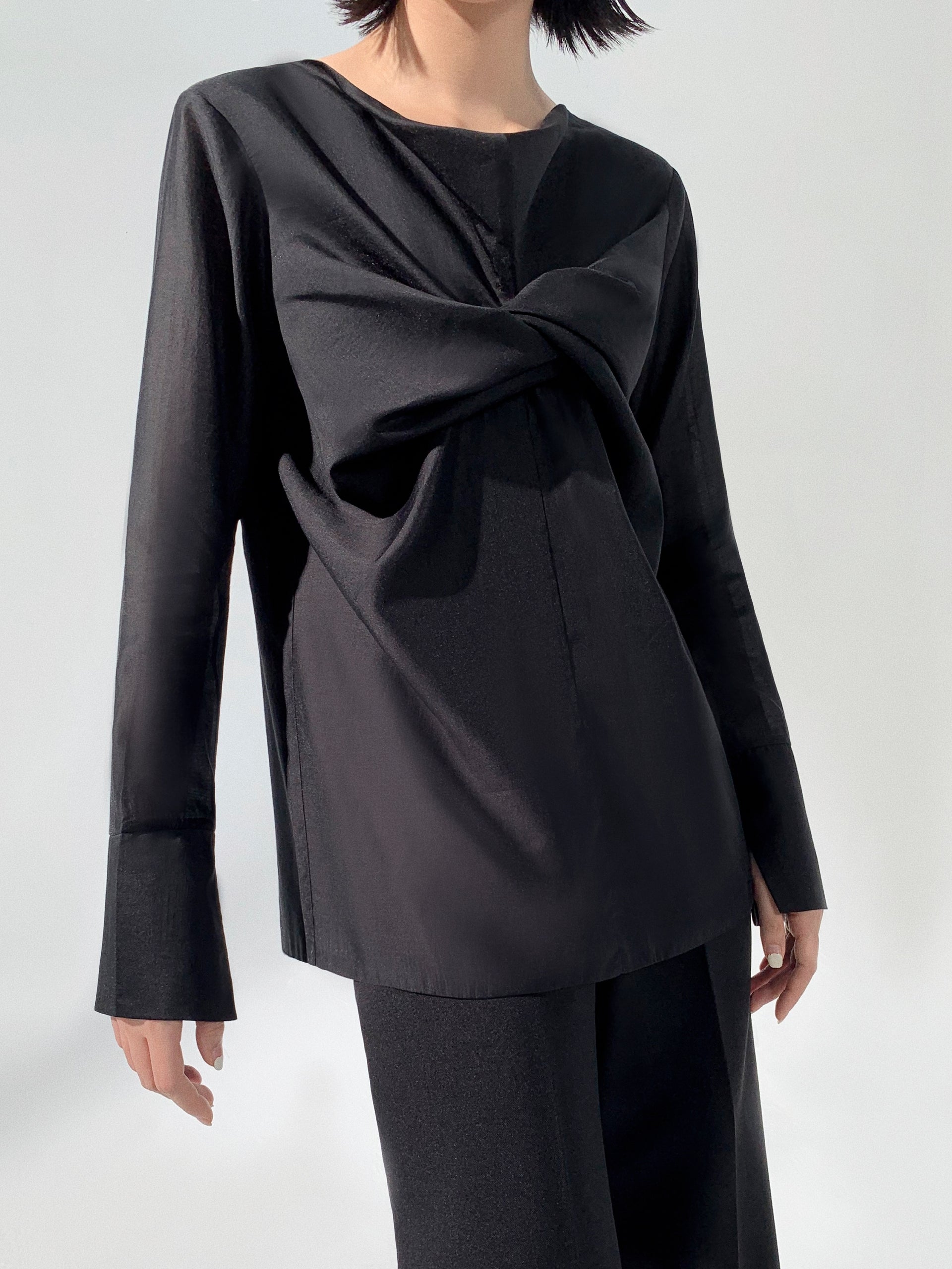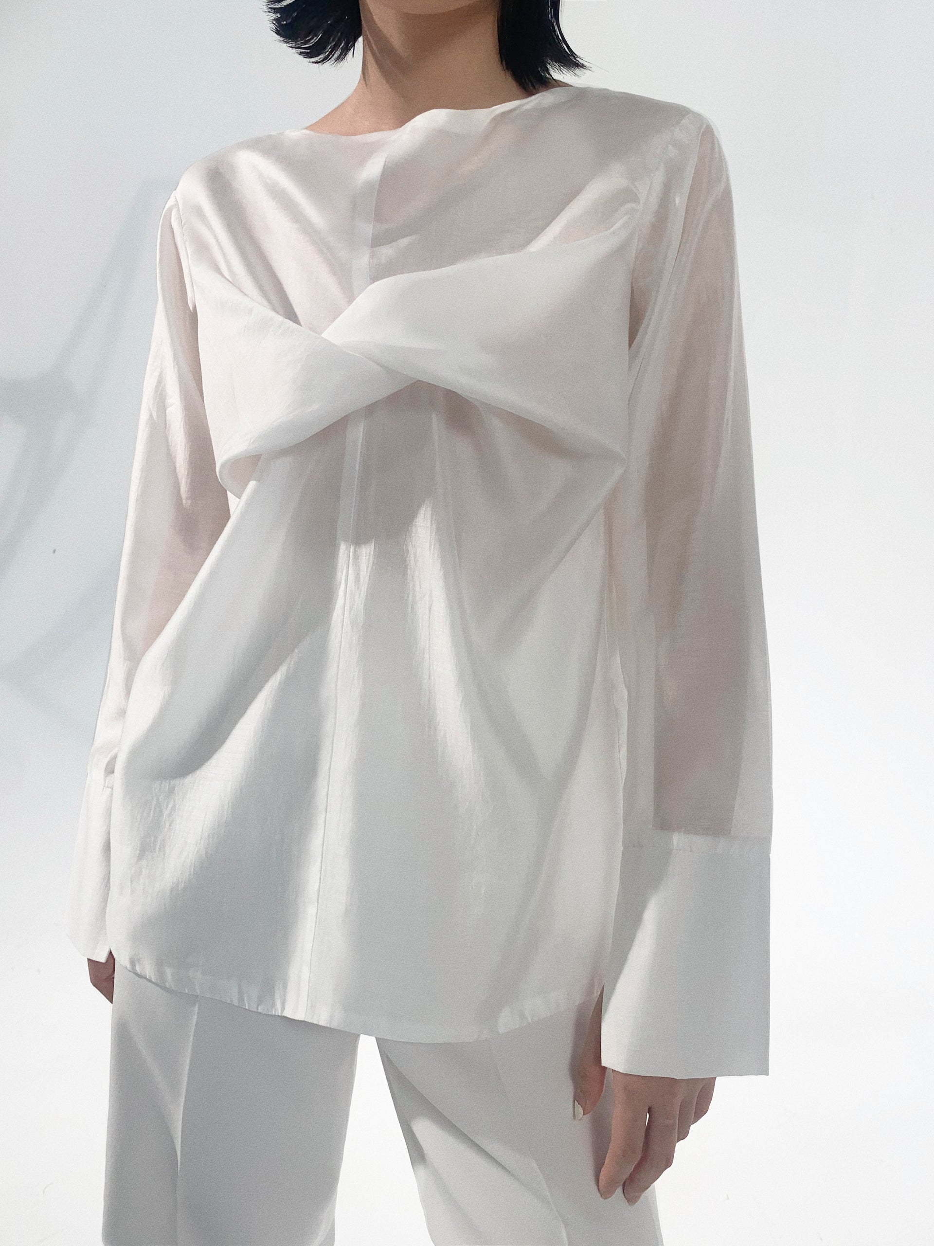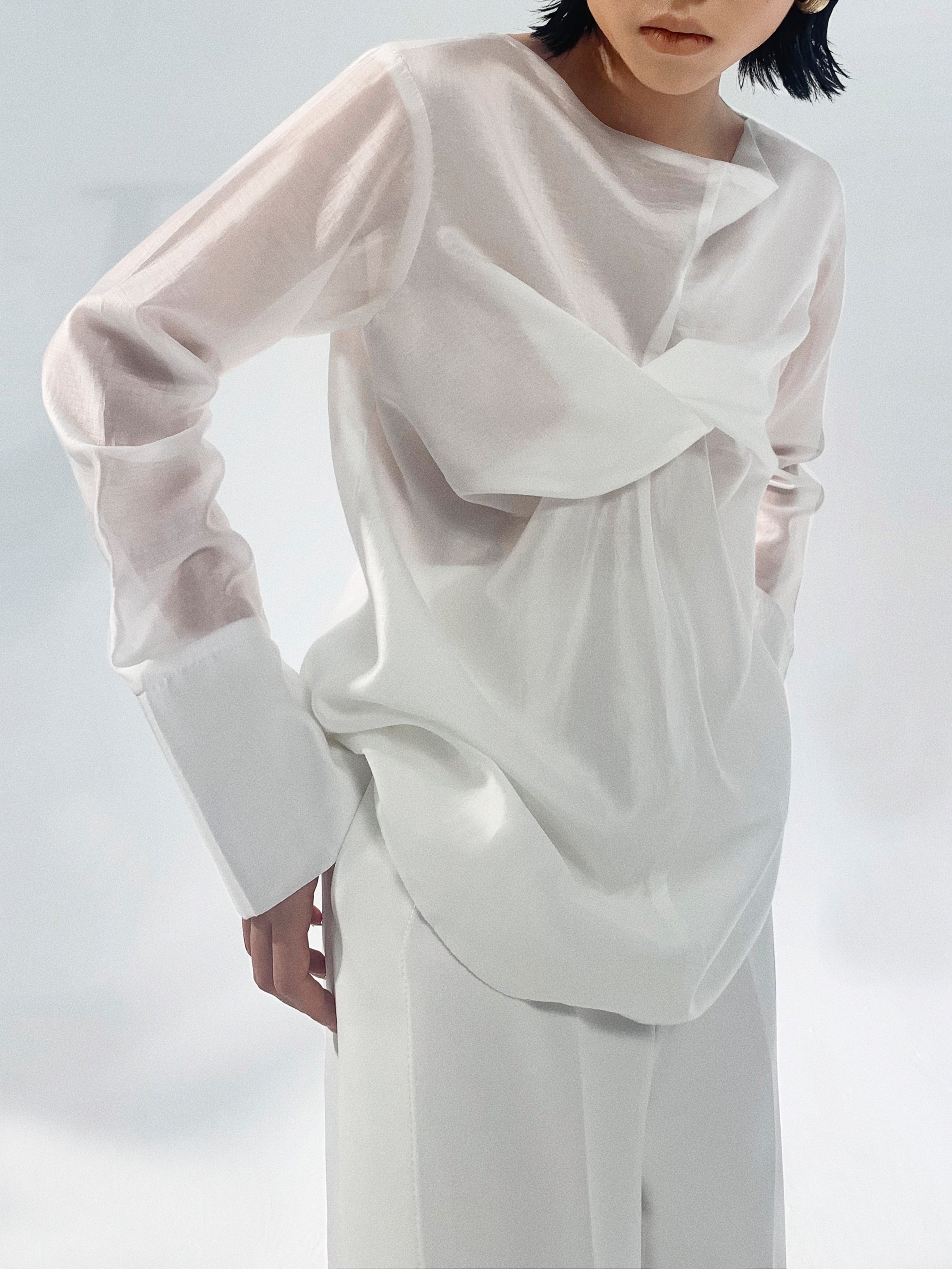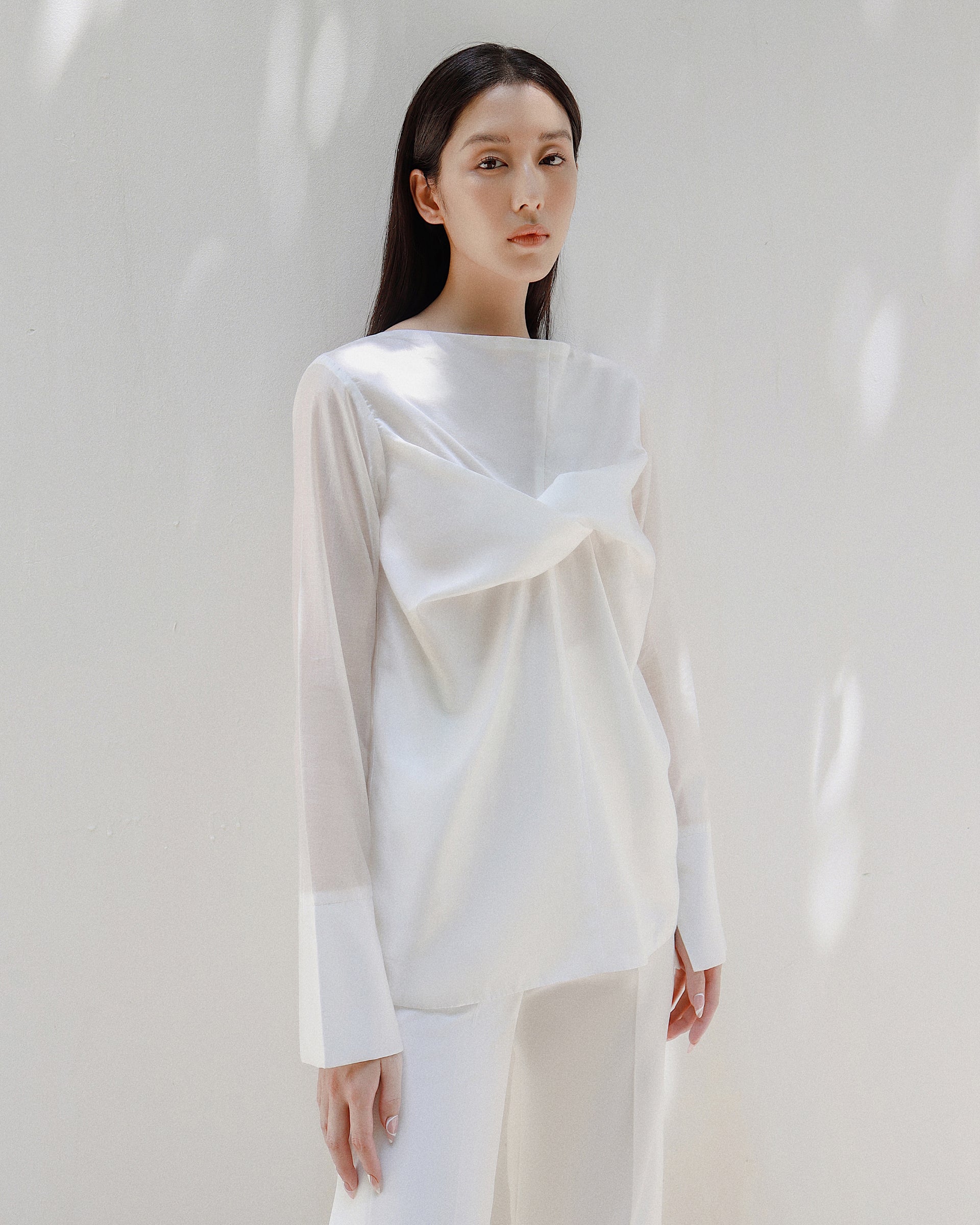 Discover effortless elegance with our long-sleeve shirt, crafted from luxurious Japanese silk fabric. Featuring a delicate neckline, twisted pleats on the chest, and a double layer front body, this shirt is a timeless addition to your wardrobe. Note:*The product is ready to ship, shipping time varies from 5-15 days.**The product can be customized based on the measurement of 3 circumferences (bust, waist, hip) with an additional cost of 10-25%, and the customization time takes 1-3 days. Please contact us via email support@eegenstudio.com or Eegen fanpage for further assistance. Product details Long-sleeve shirt, Japanese silk fabric, light neckline, twisted pleats on...