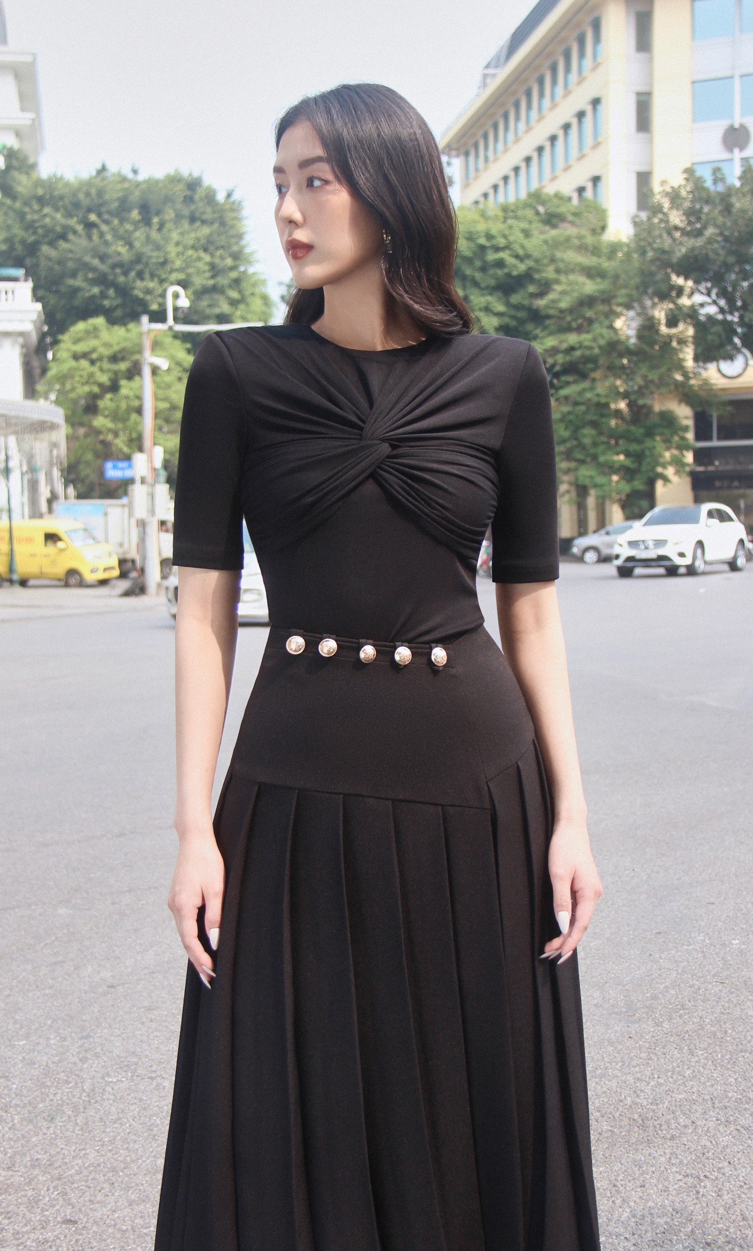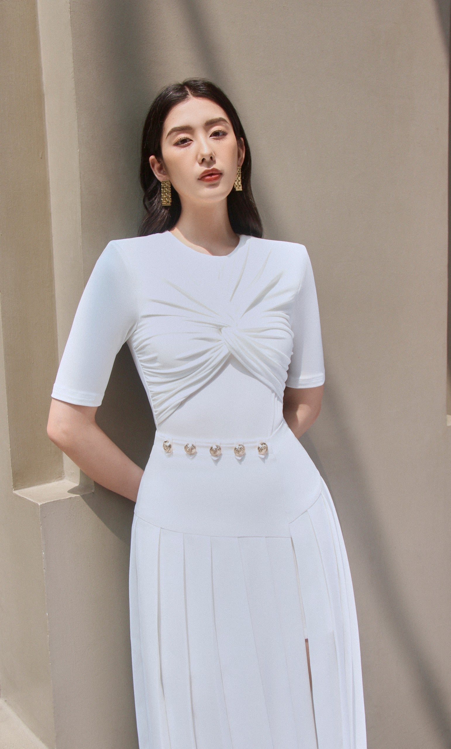 Β Show off your curves in our body-hugging top adorned with a twist bow, featuring shoulder padding and a stylish back button. Crafted from thin rib knit for a chic and comfortable look Β