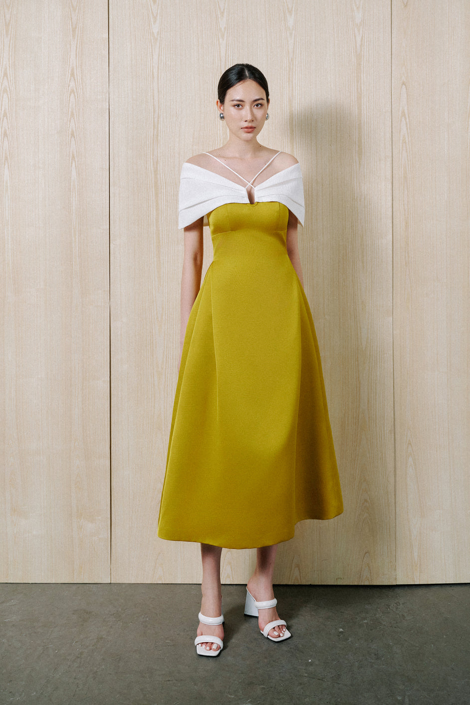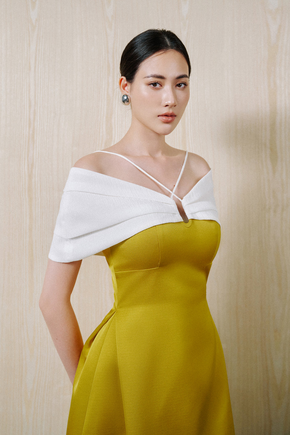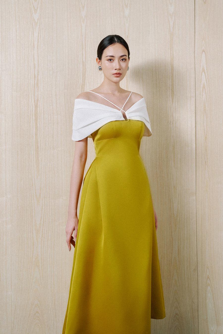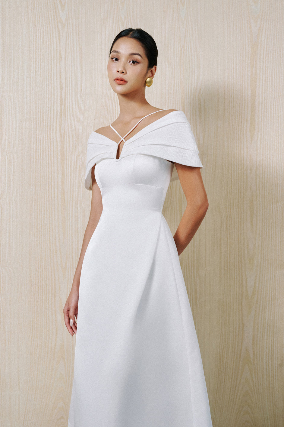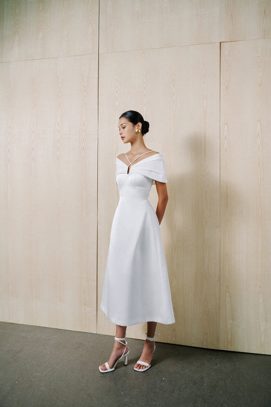 Elevate your wardrobe with this sophisticated Off-shoulder dress with cross-strap front chest.Β Complete with lining and a convenient back zipper. Β  Β