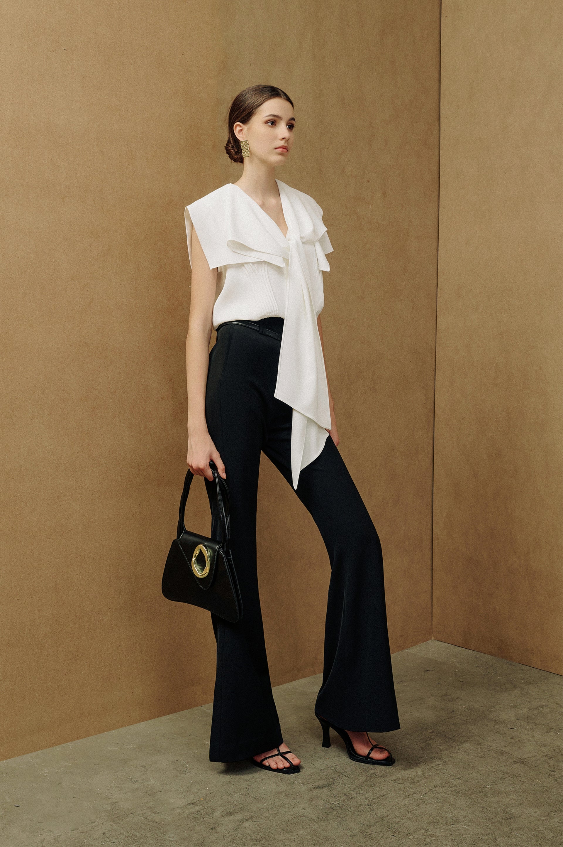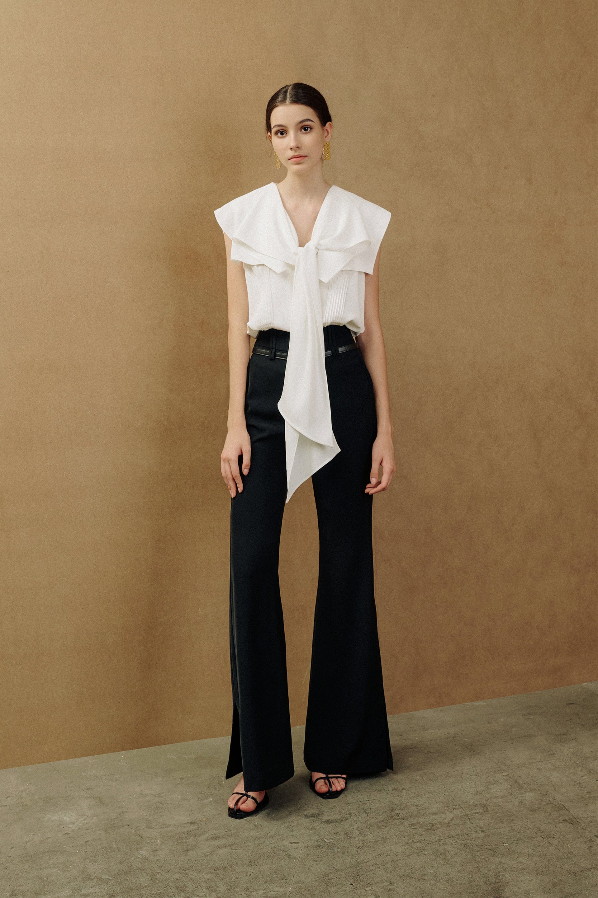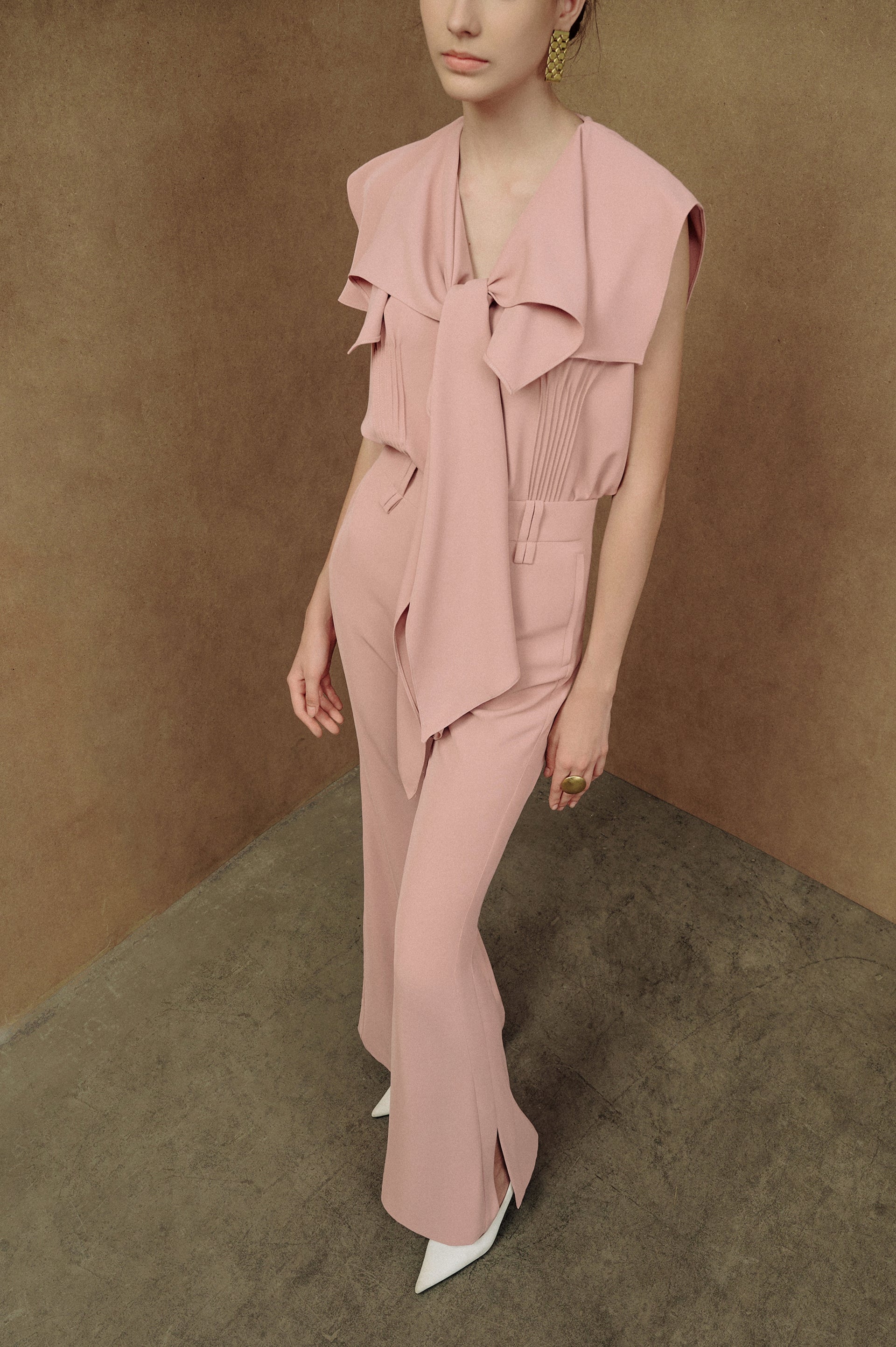 Elevate your style with our sleeveless V-neck shirt featuring a sailor-style collar and a long tie for a touch of elegance. Small seams on both sides of the waist add subtle detailing to complete the look