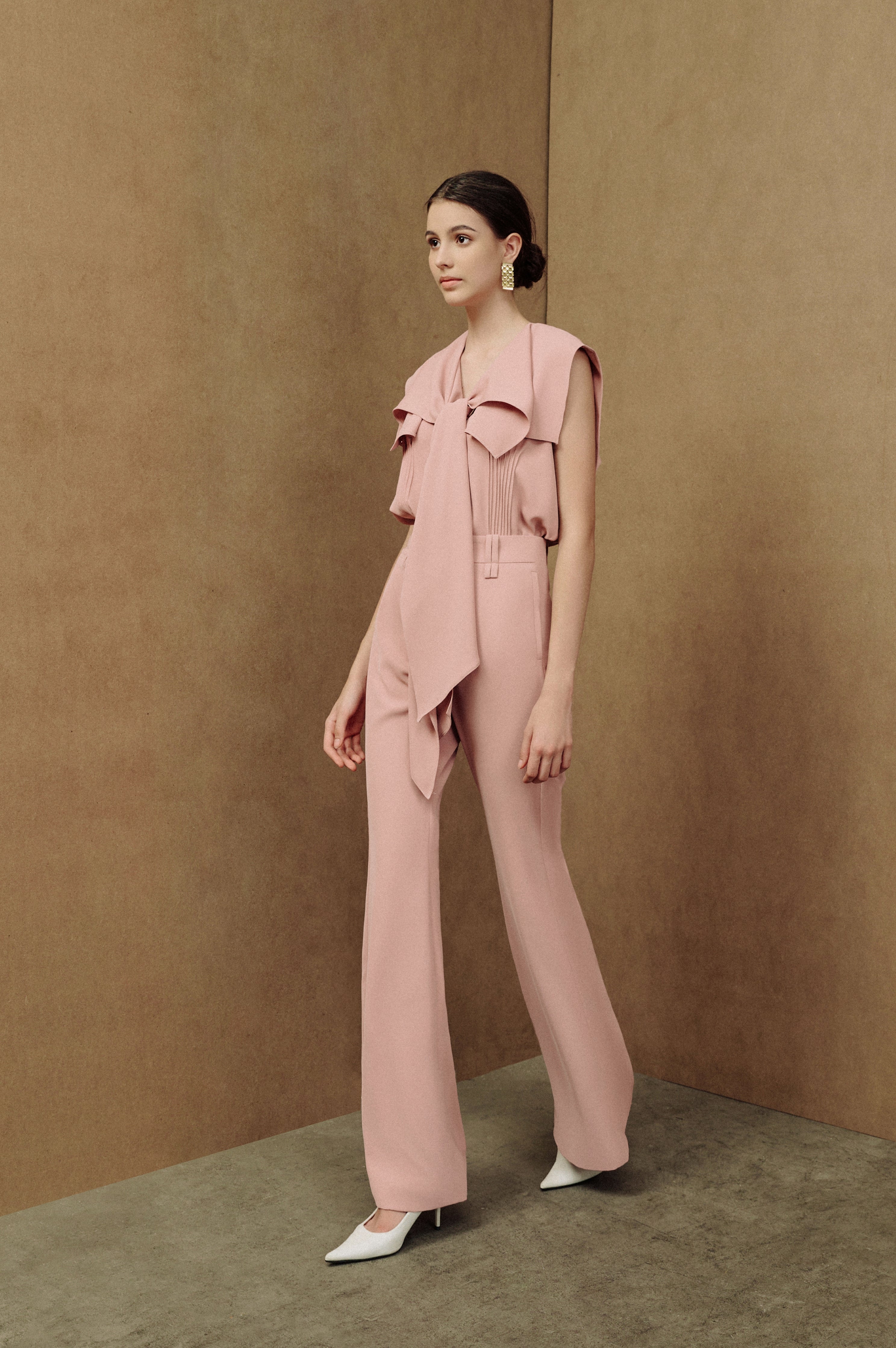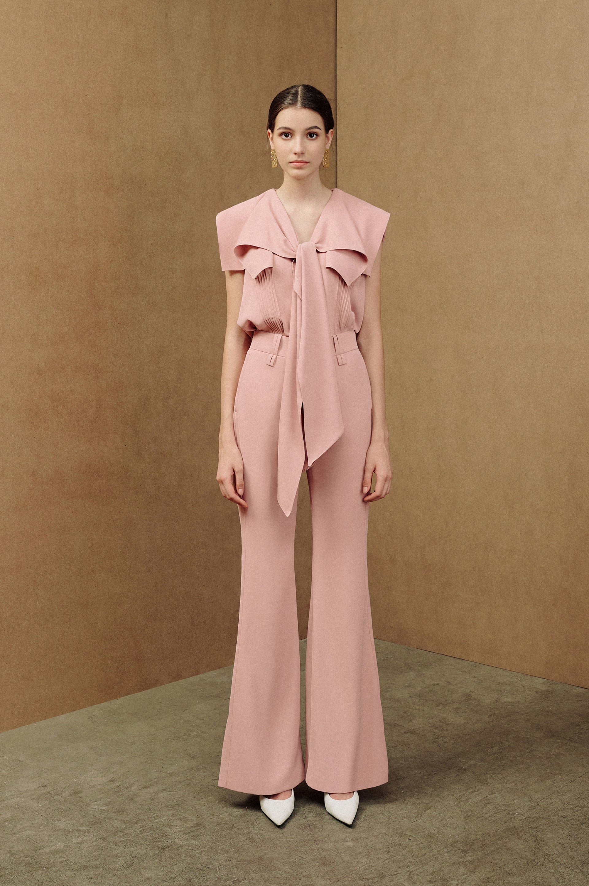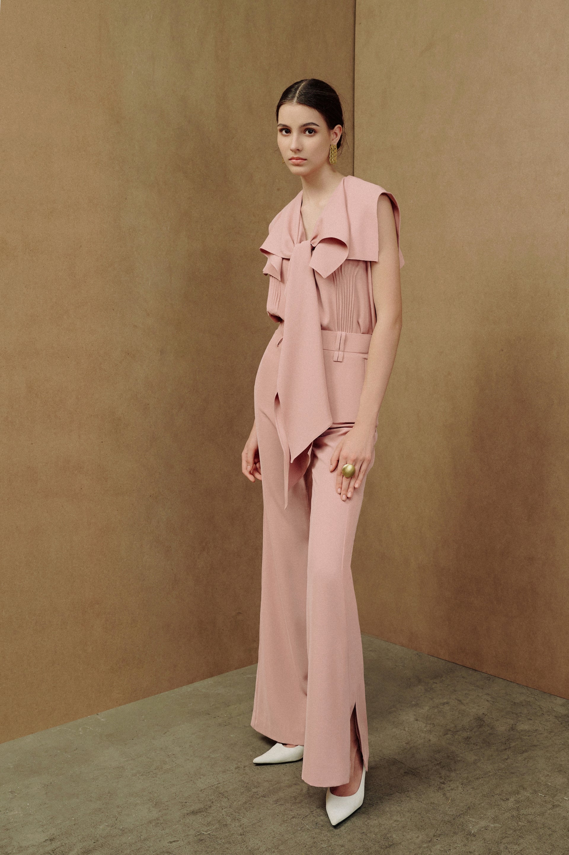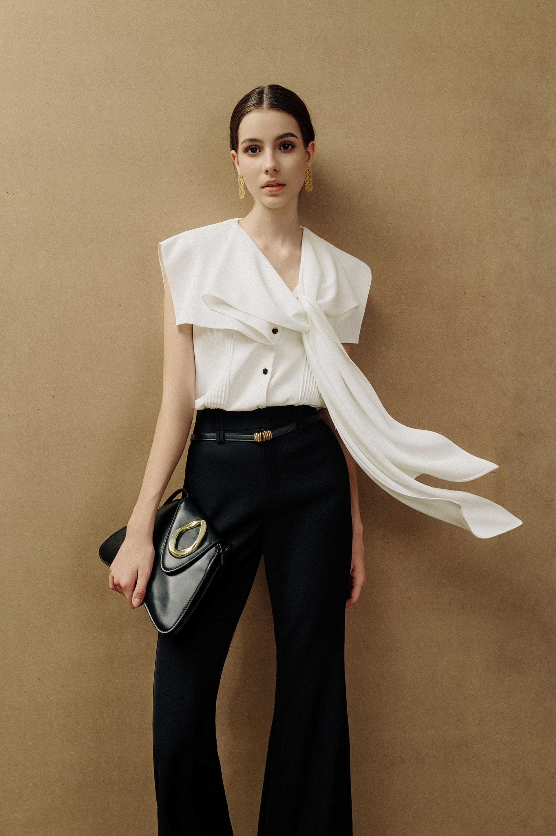 Elevate your style with our sleeveless V-neck shirt featuring a sailor-style collar and a long tie for a touch of elegance. Small seams on both sides of the waist add subtle detailing to complete the look