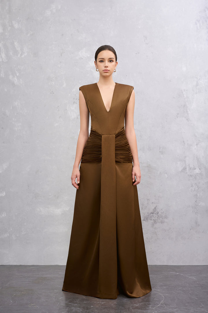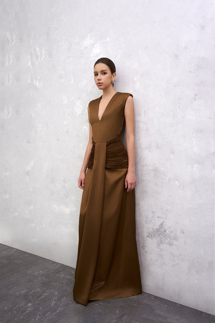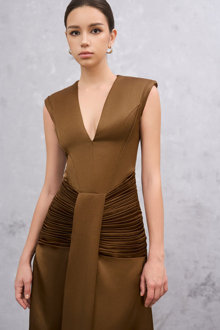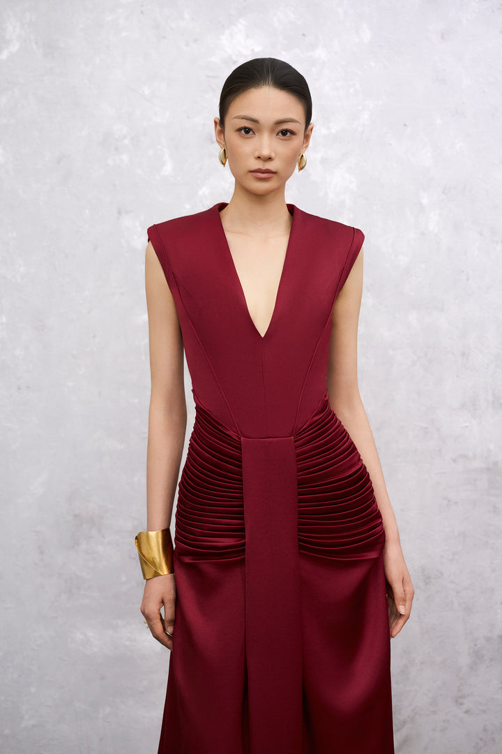 Structured pleats frame the waist with sculptural precision, guiding the eye along a clean vertical line. A deep neckline and tailored shoulders bring quiet strength, while the flowing column silhouette moves with subtle ease. The Aira Dress balances form and flow — designed for presence that speaks in stillness.