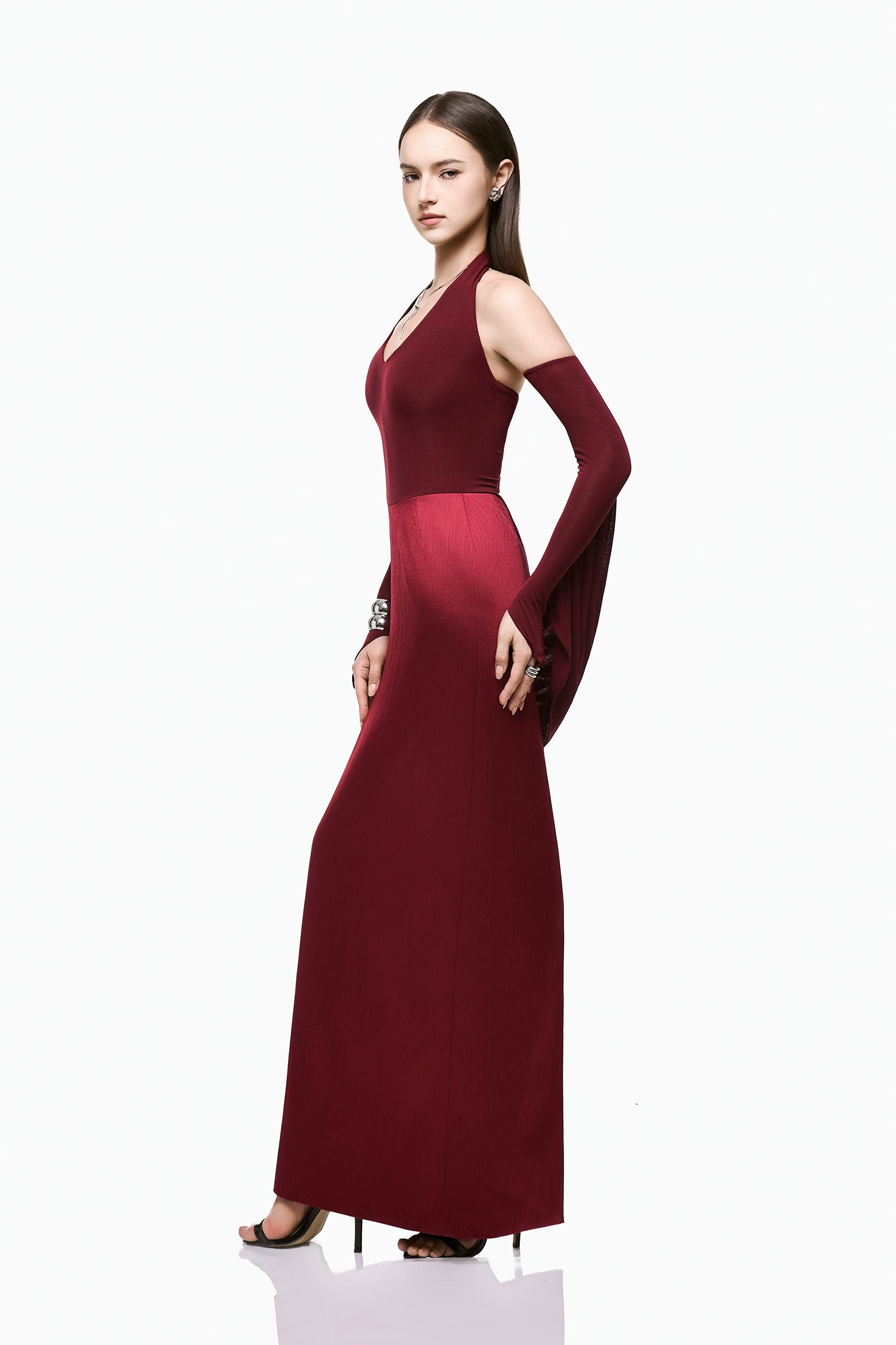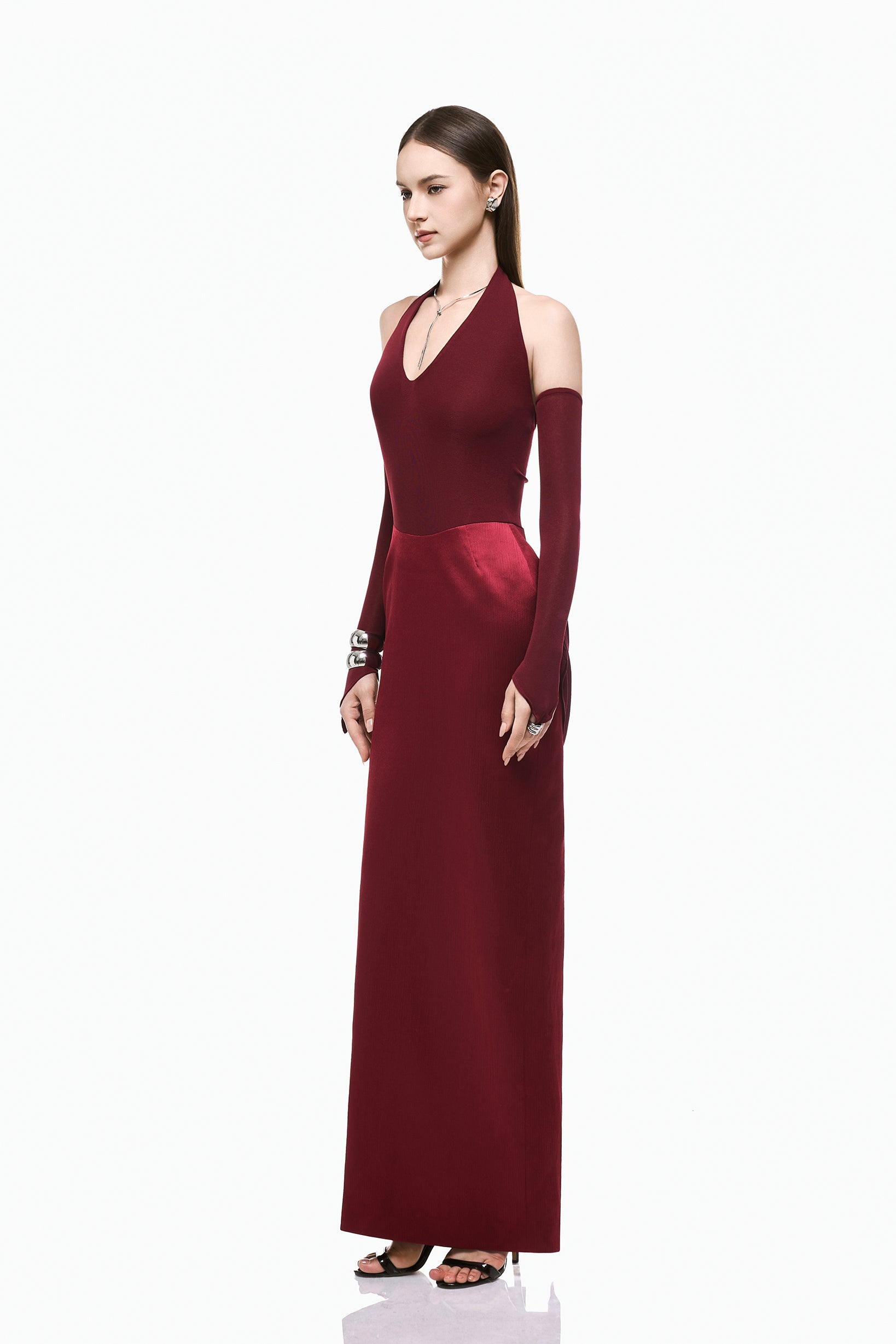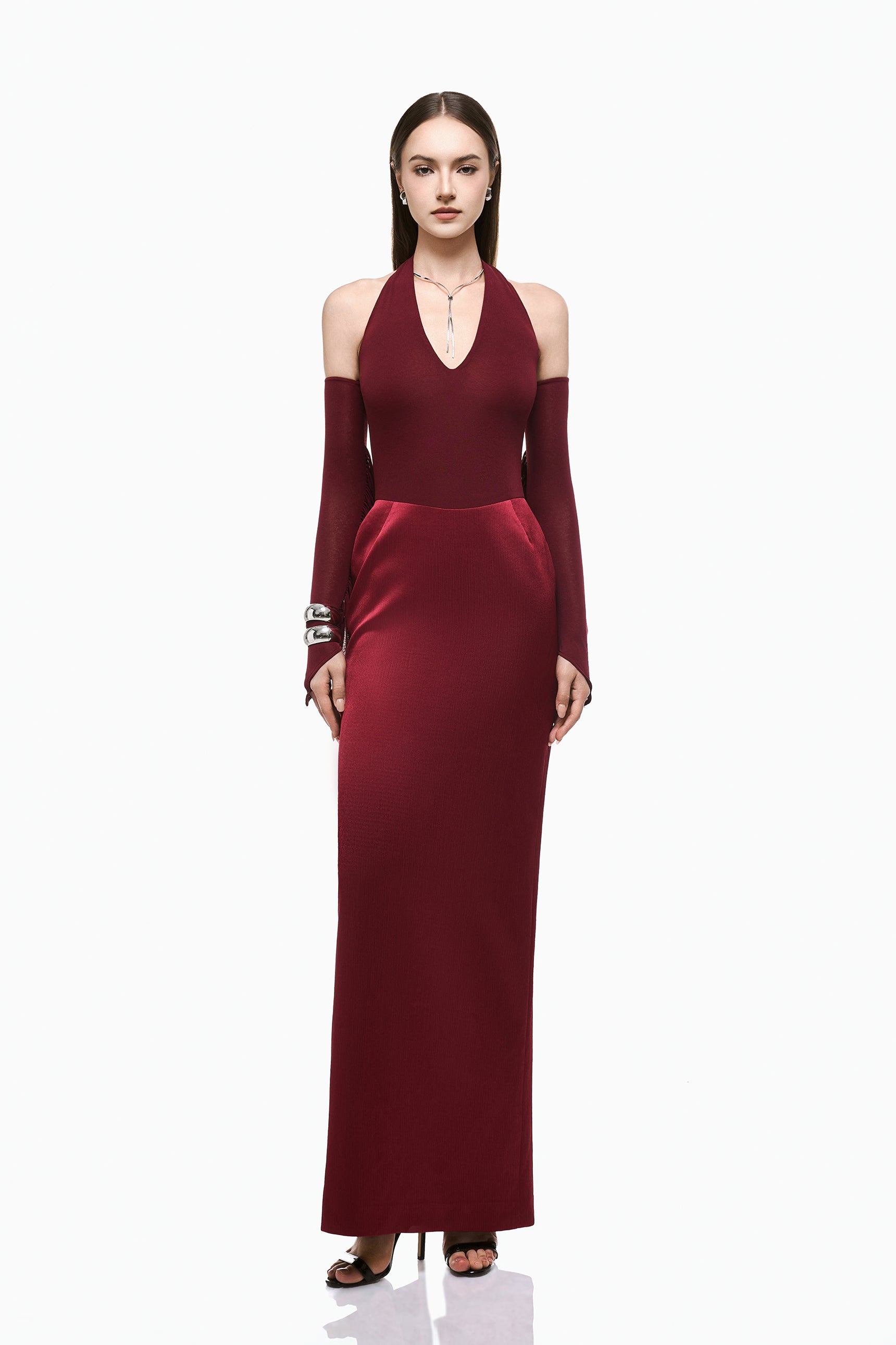 The Alie Dress features a clean halter neckline with detached long sleeves and a softly draped back panel. Crafted in spandex jersey knit with jacquard taffeta accents, it falls into a straight column silhouette with a calm, refined drape.