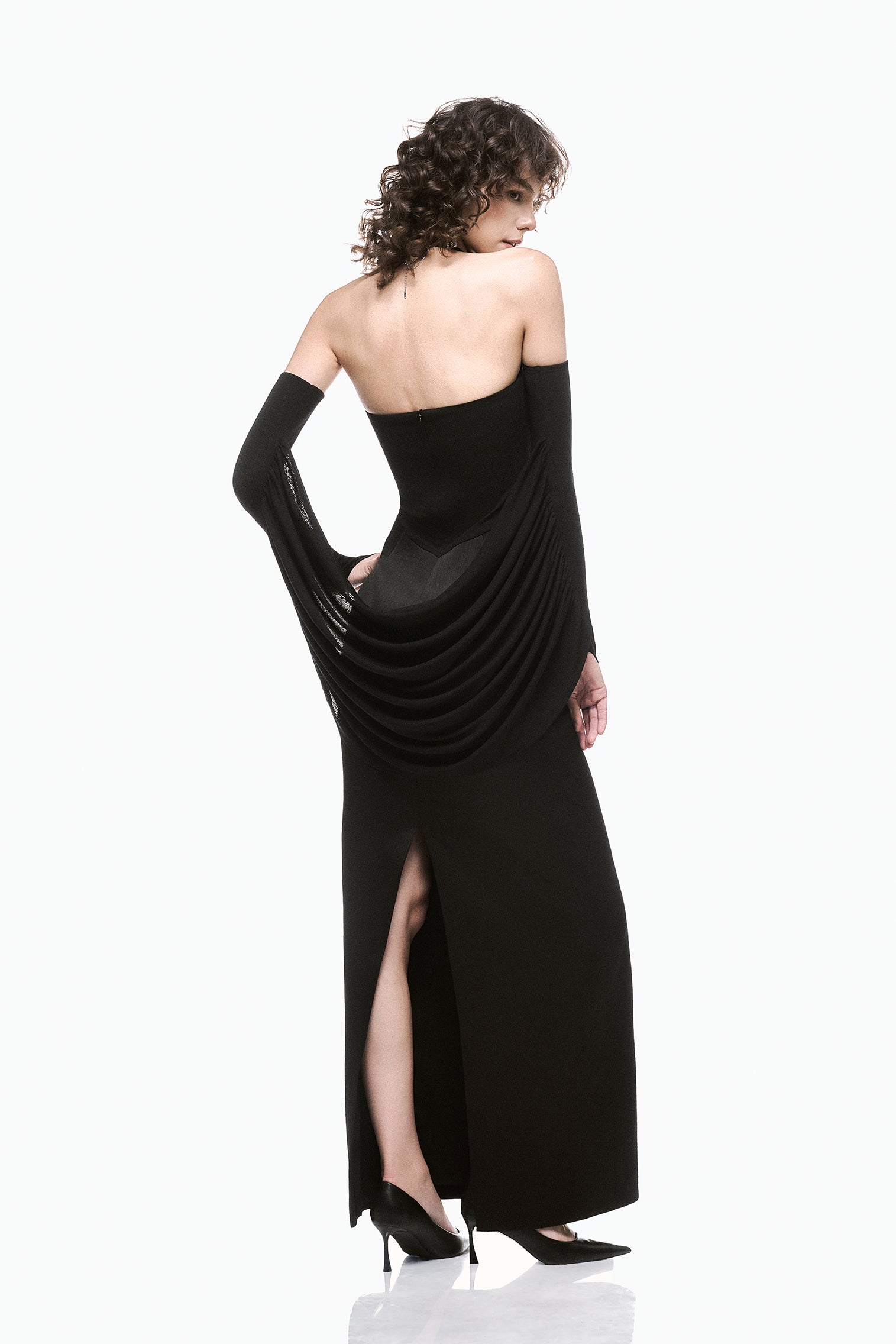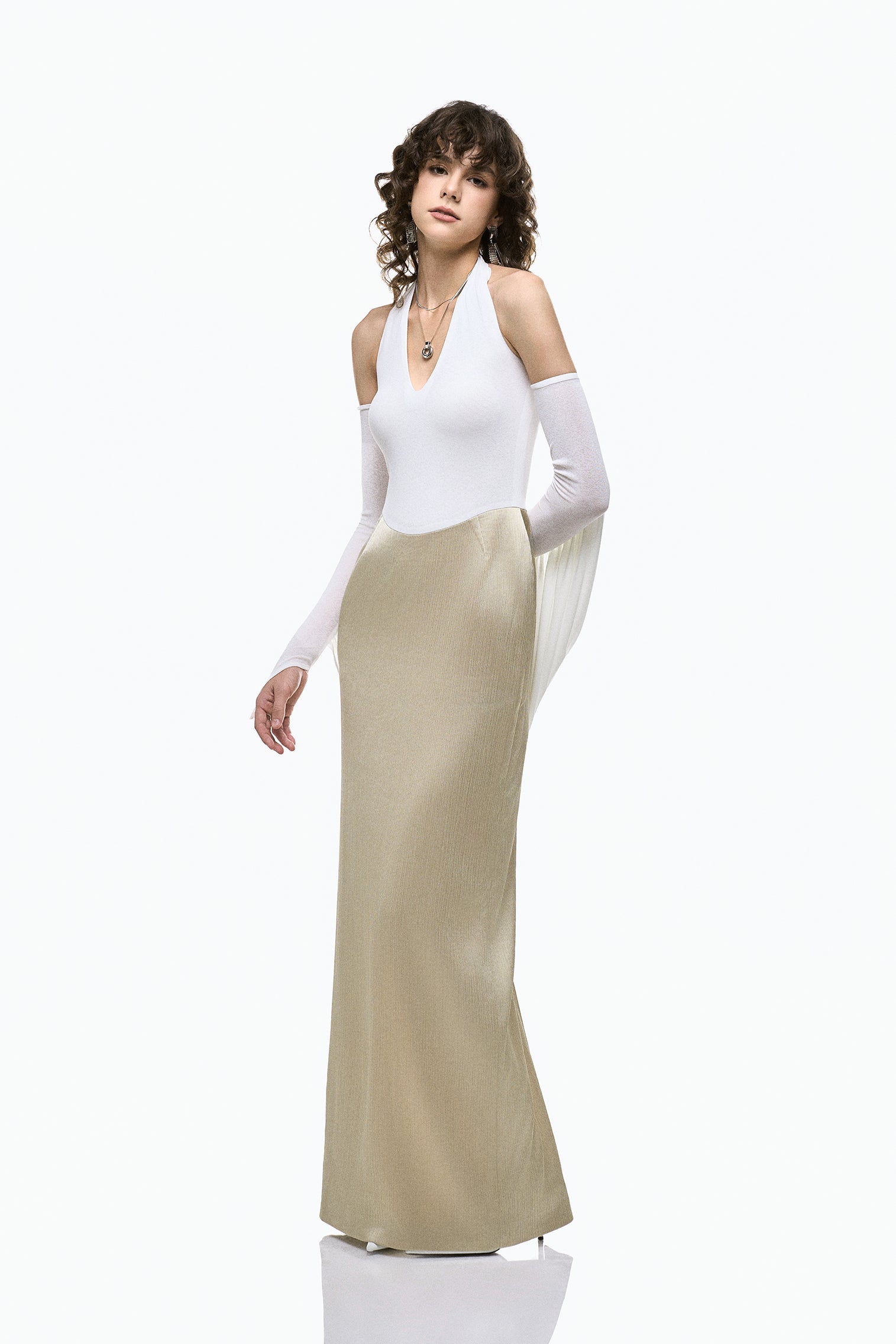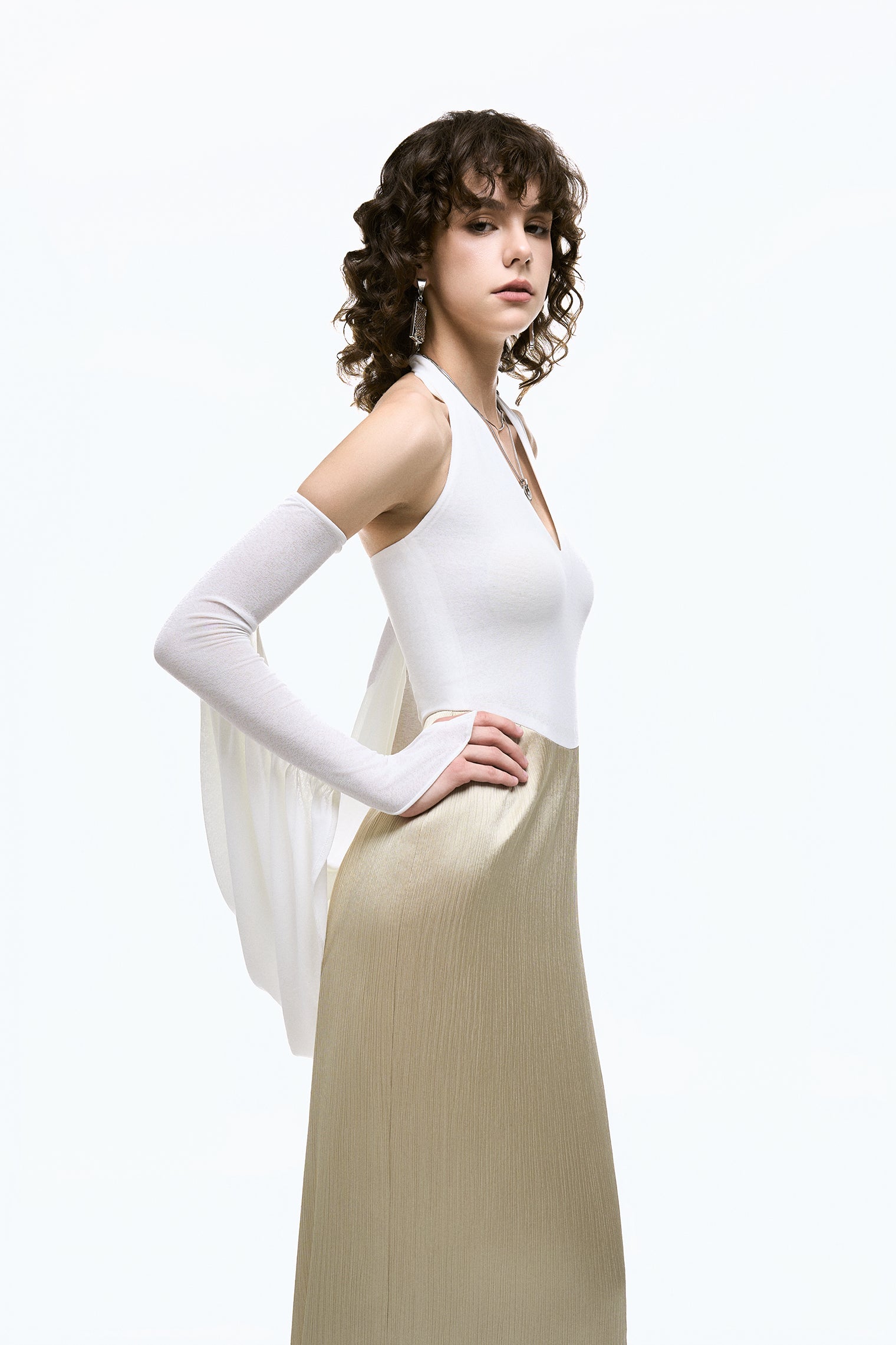 The Alie Dress features a clean halter neckline with detached long sleeves and a softly draped back panel. Crafted in spandex jersey knit with jacquard taffeta accents, it falls into a straight column silhouette with a calm, refined drape.