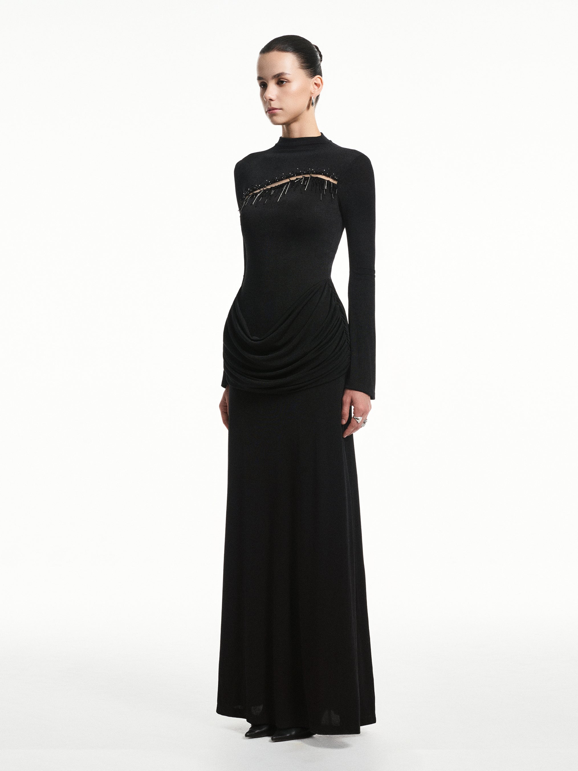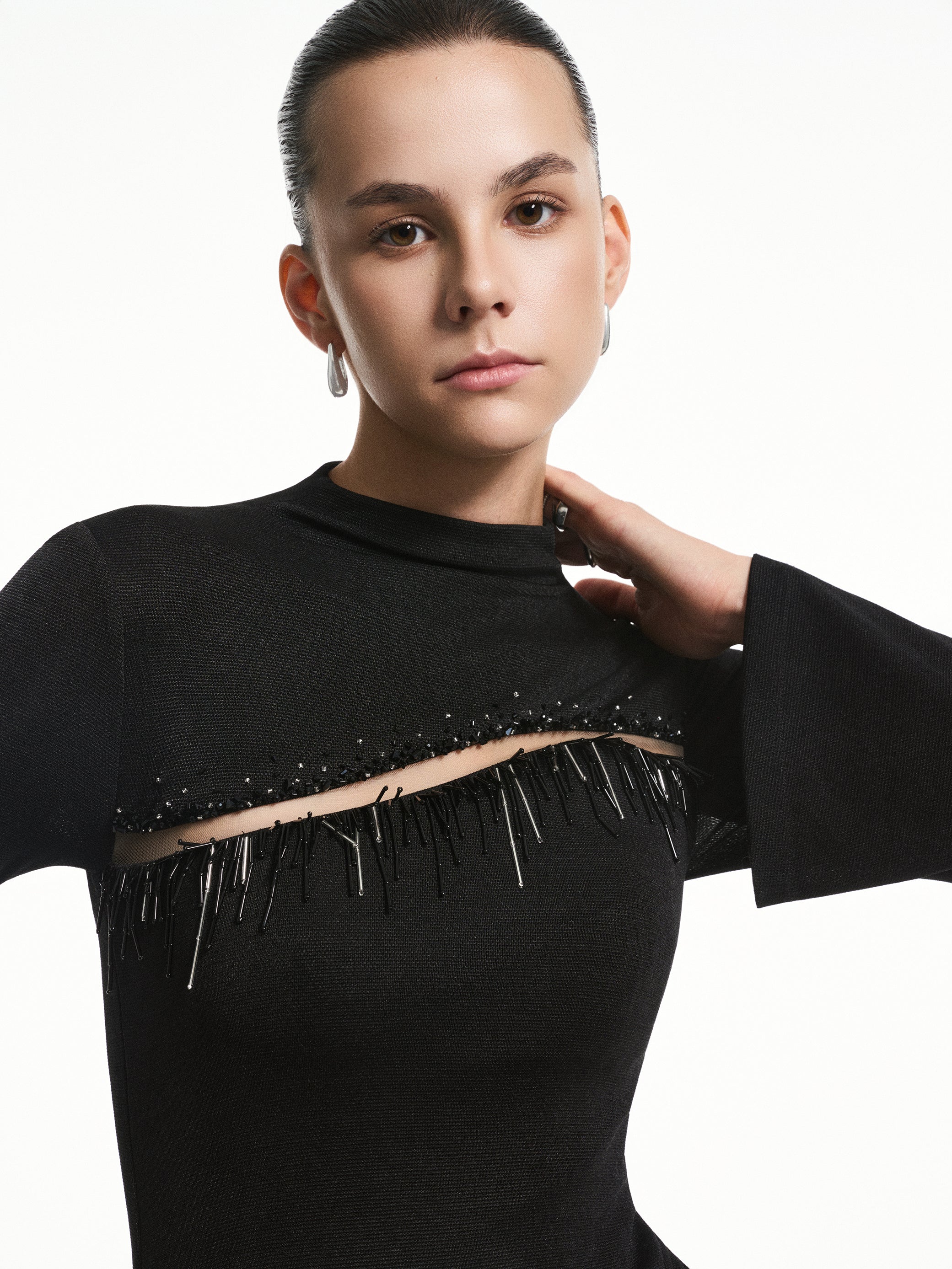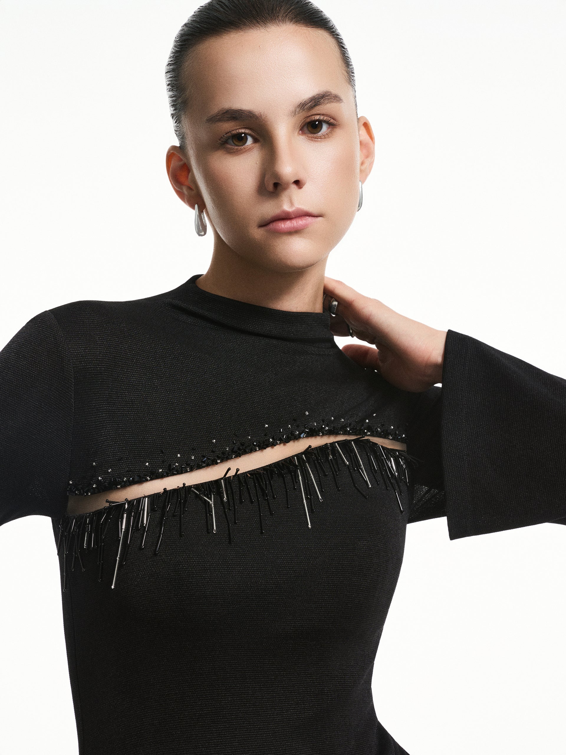 Aster strikes a bold note with a sleek high neckline, defined by a linear cut-out edged in beaded fringe. Twinkle jersey spandex sculpts the body, while soft draping at the hips balances structure with flow.