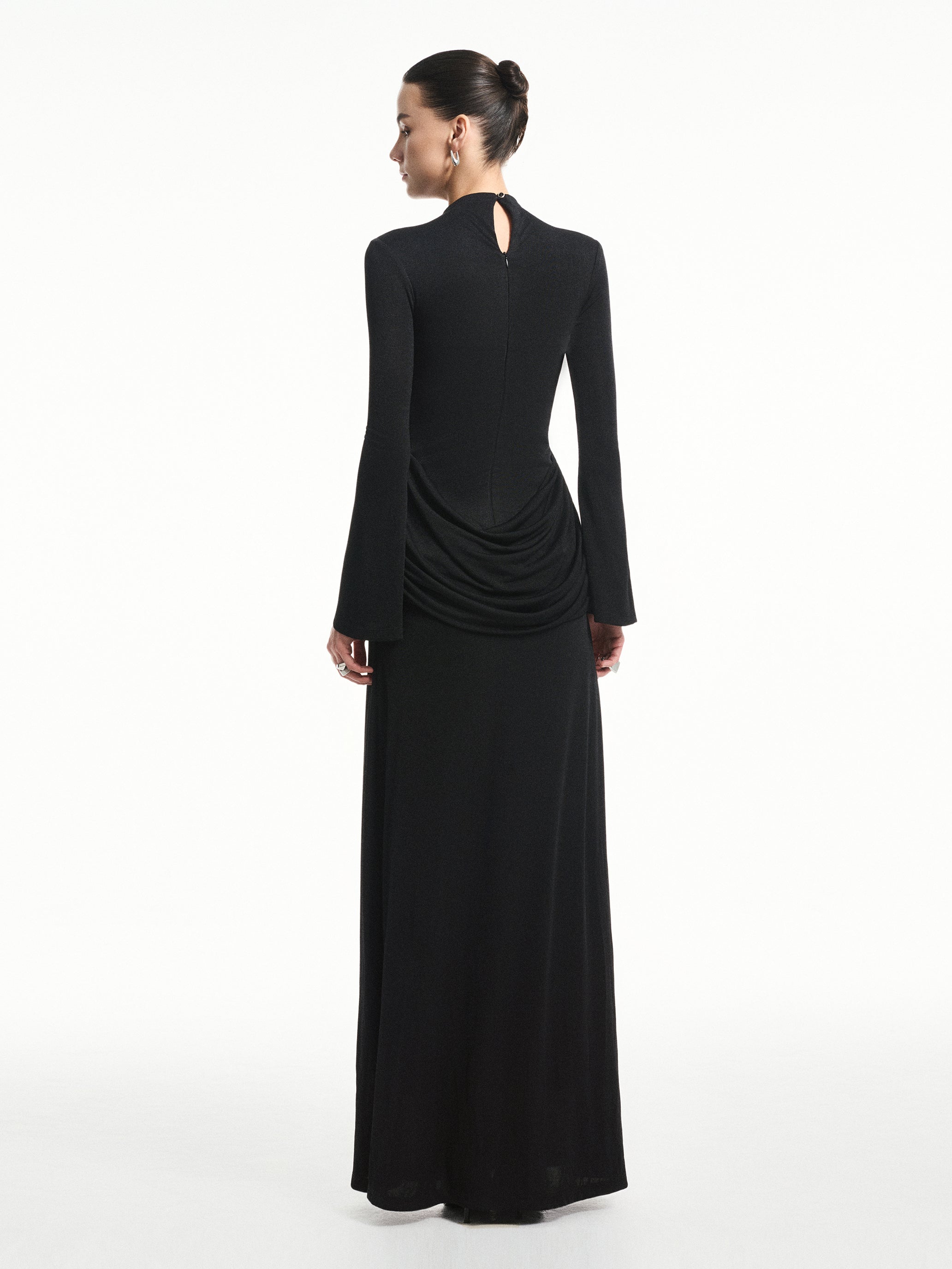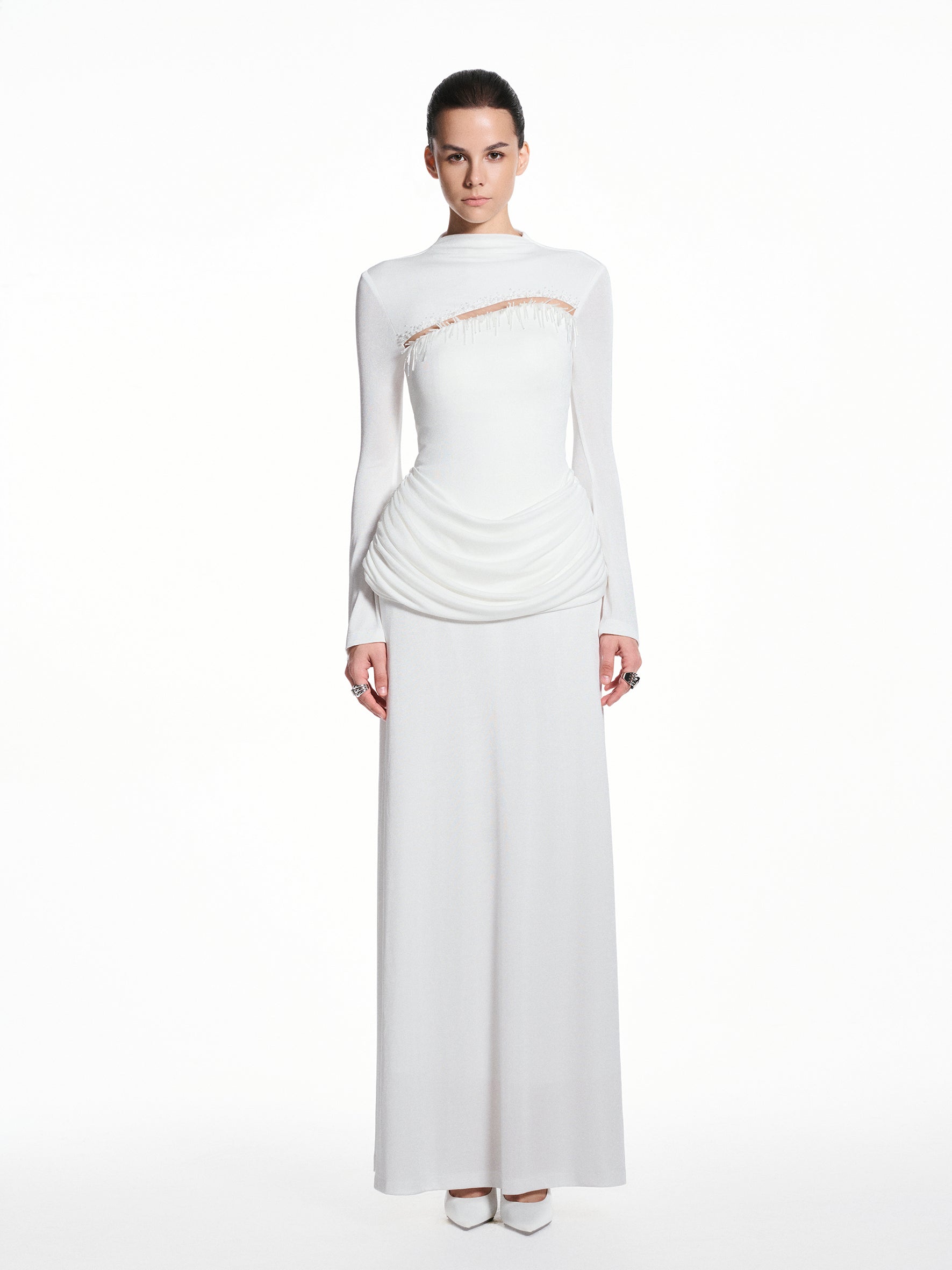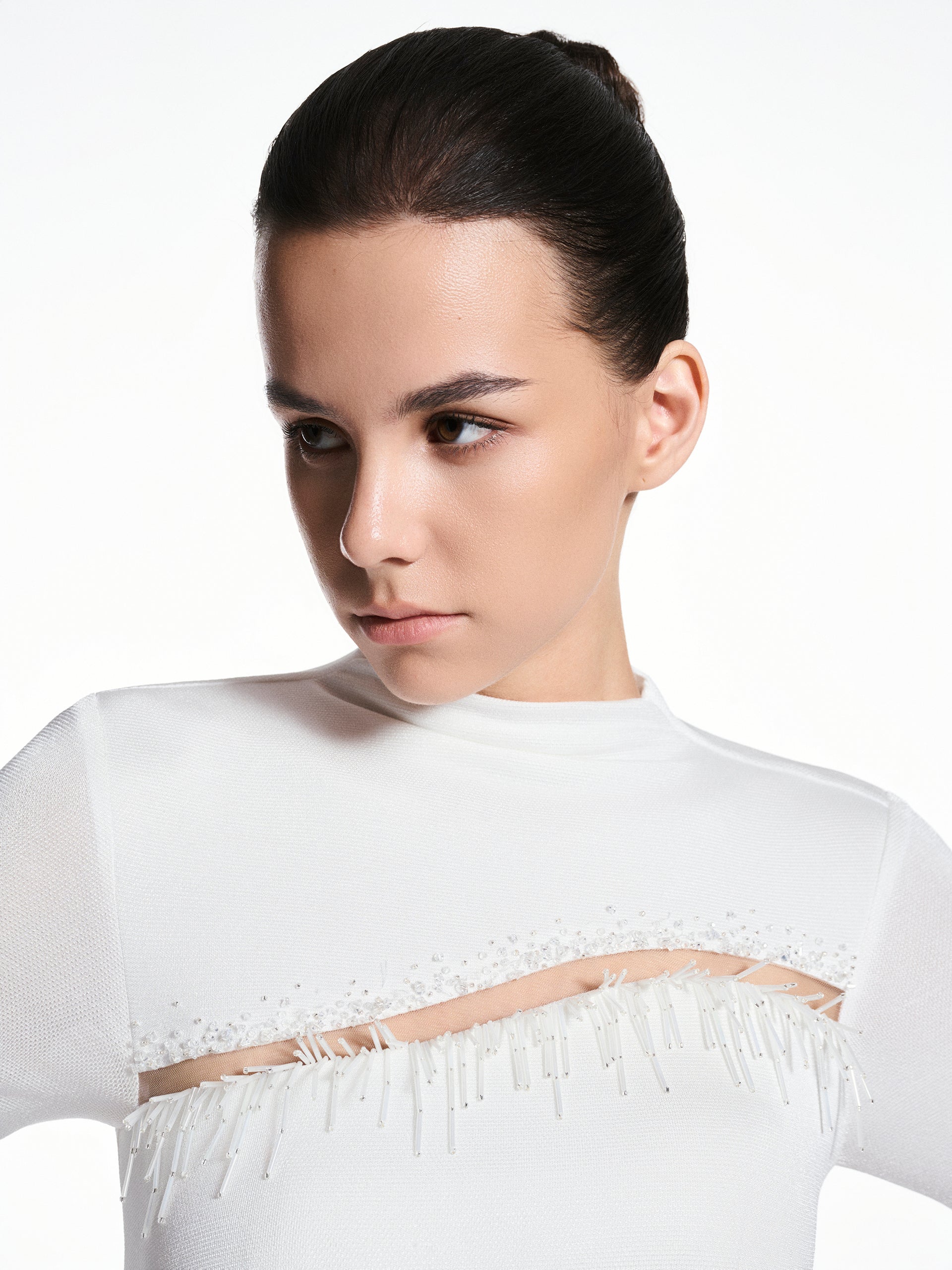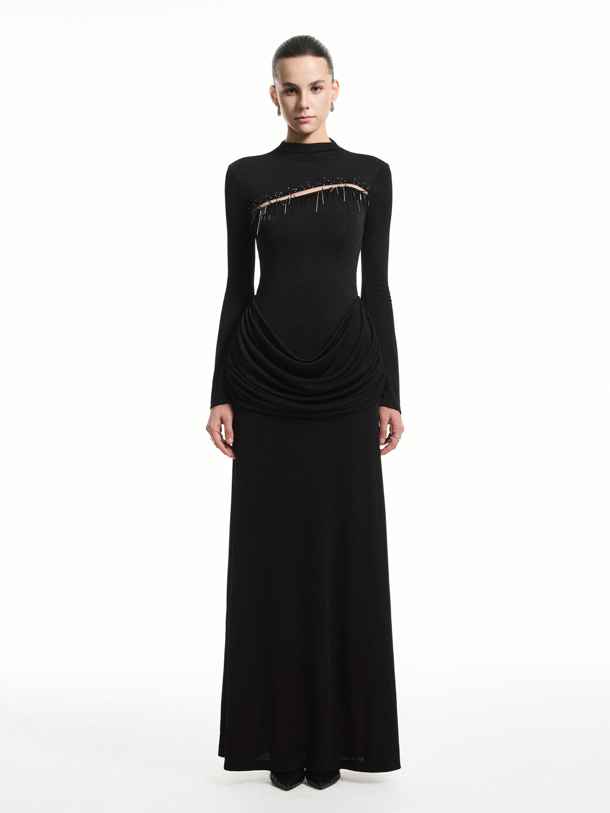 Aster strikes a bold note with a sleek high neckline, defined by a linear cut-out edged in beaded fringe. Twinkle jersey spandex sculpts the body, while soft draping at the hips balances structure with flow.