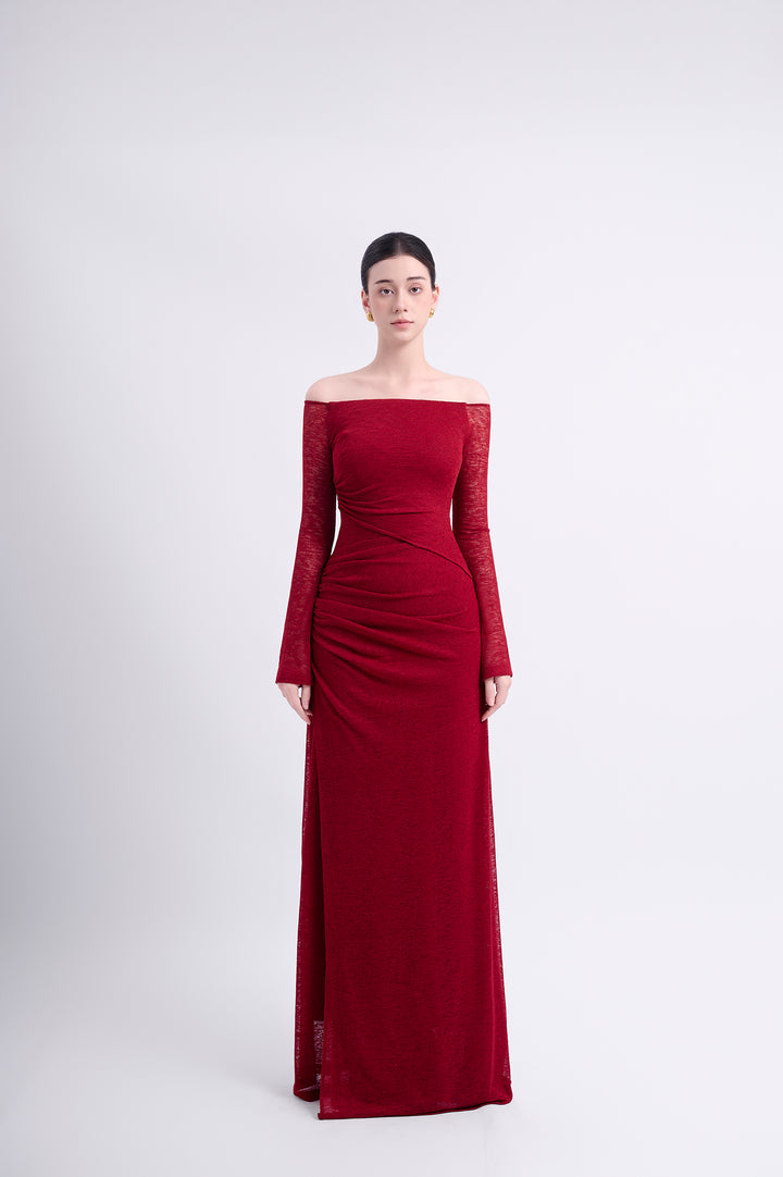 Off-shoulder long-sleeve dress with a straight silhouette. Double-layered, with an outer asymmetric overlapping panel and a high-low hemline for a youthful aesthetic. The shoulder drape can be styled to cover the shoulders or worn off-the-shoulder.
