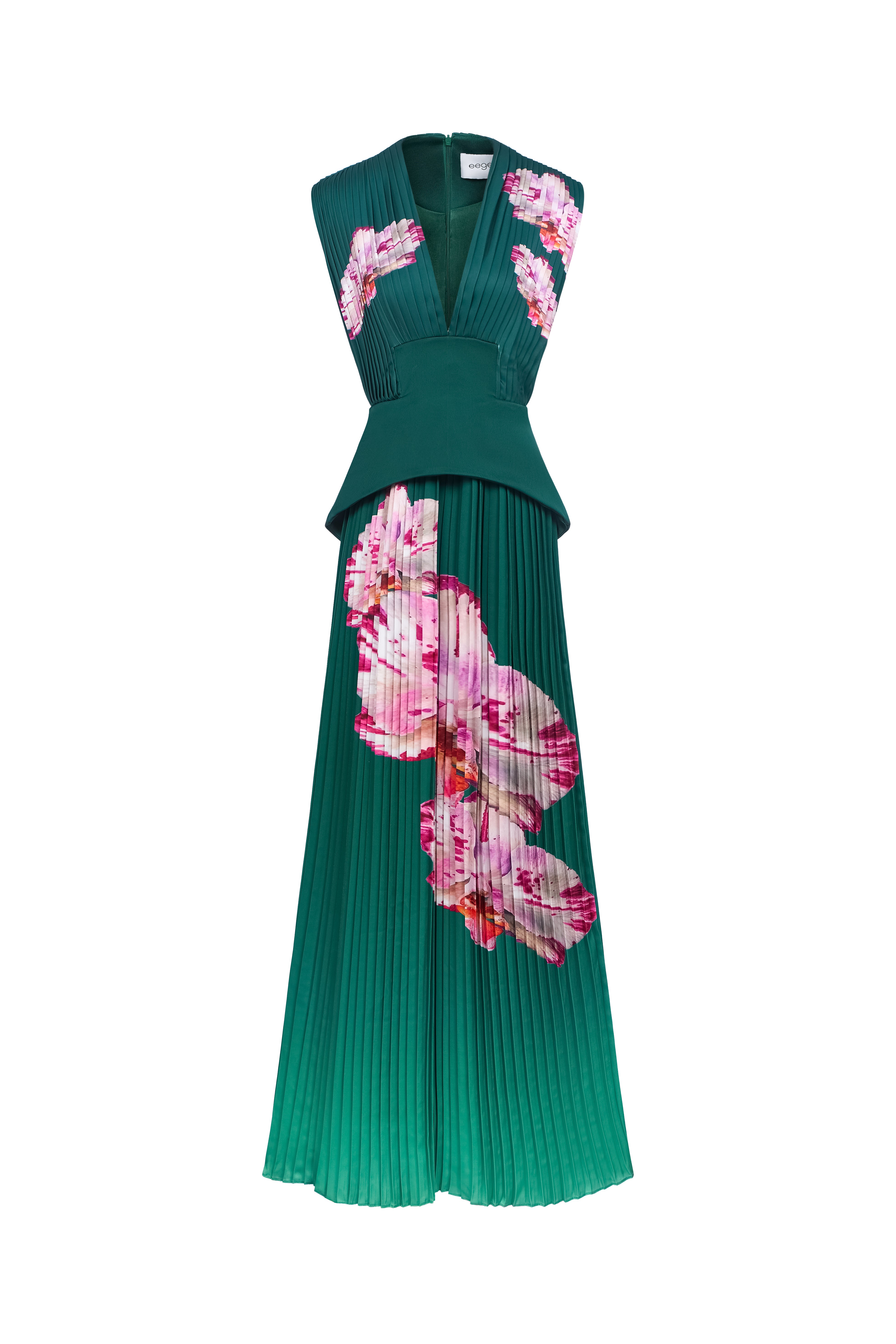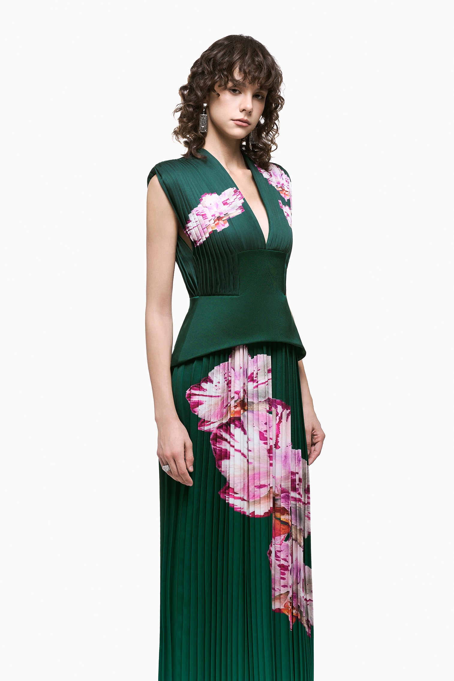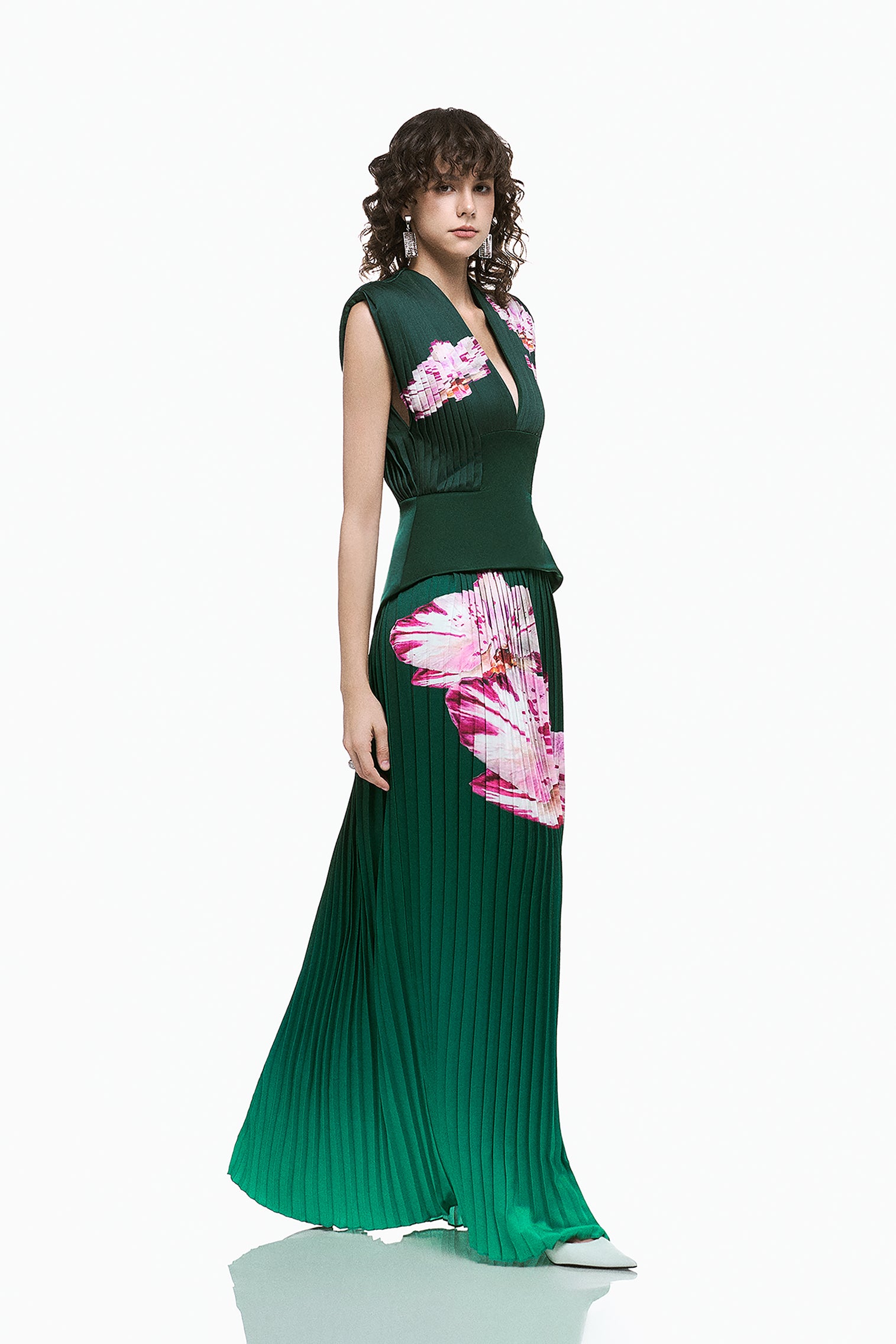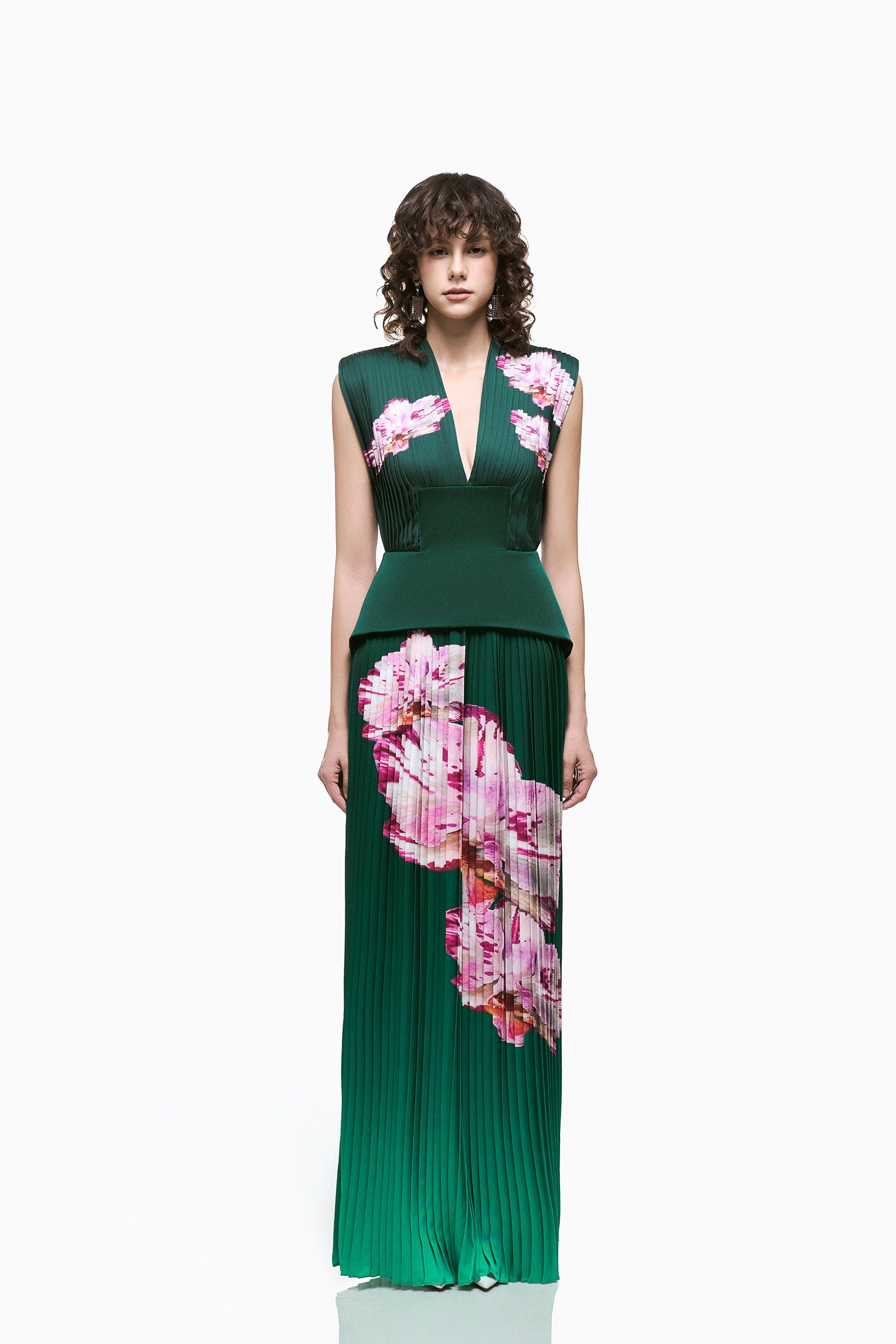 Camellia is cut from twinkle jersey spandex with a sculpted sleeveless bodice shaped by fine vertical pleating and a deep V neckline. A defined waist panel releases into a long pleated skirt that moves in clean rhythmic lines. A silhouette that feels quietly expressive.